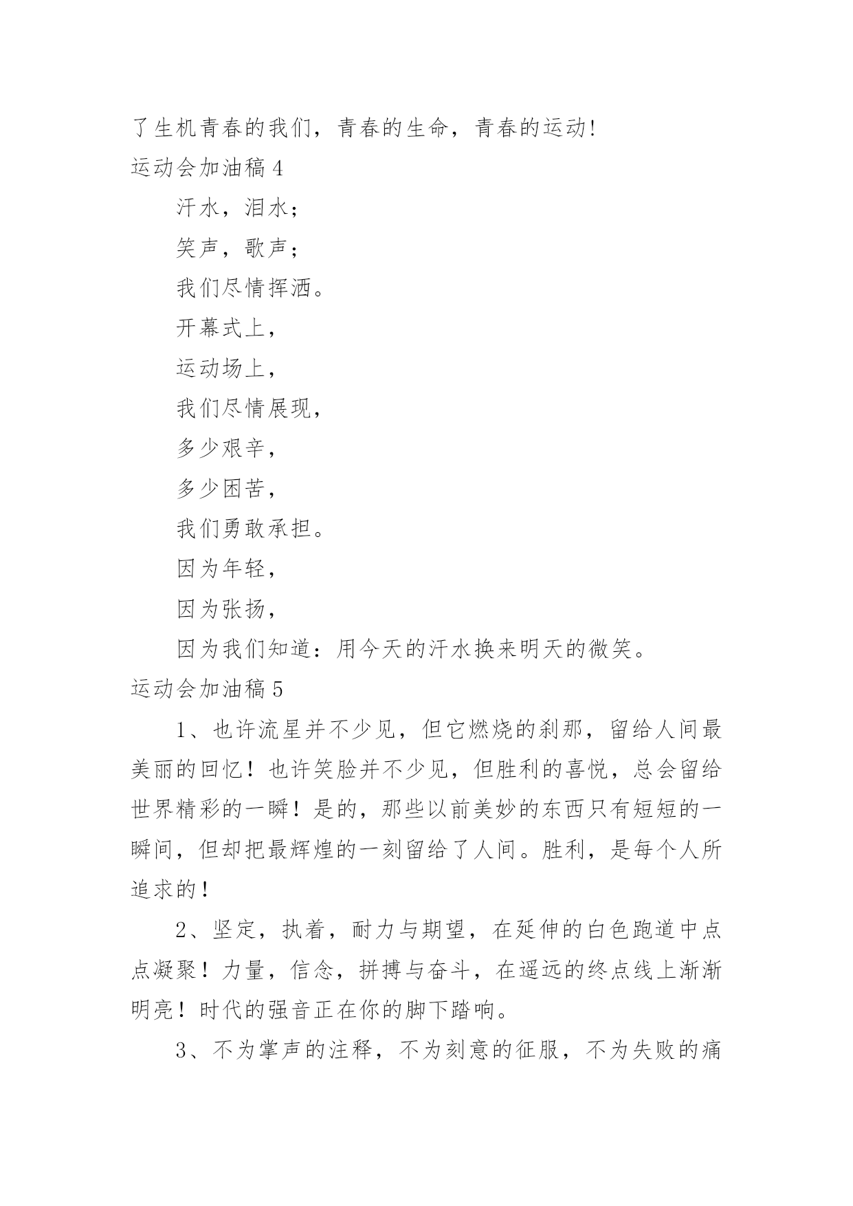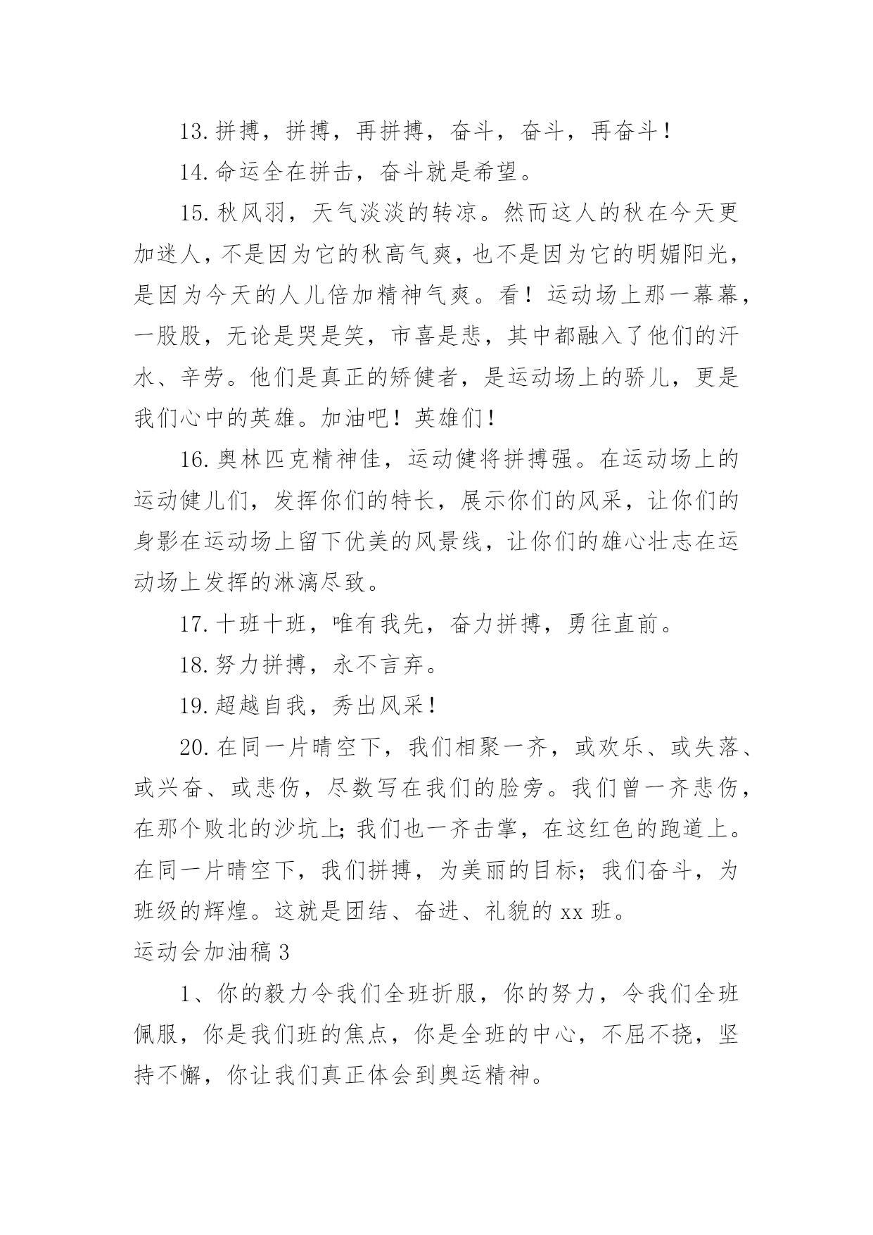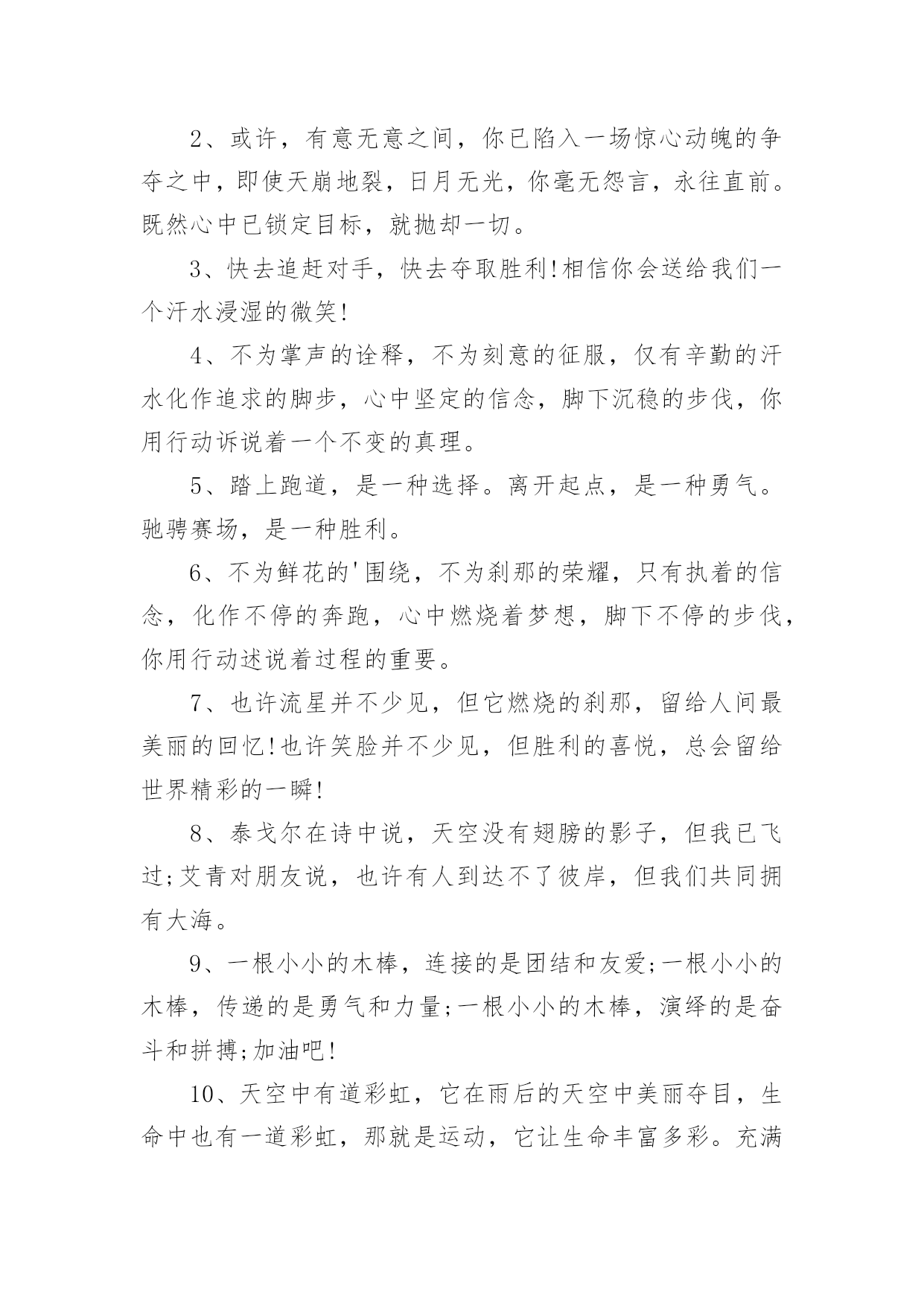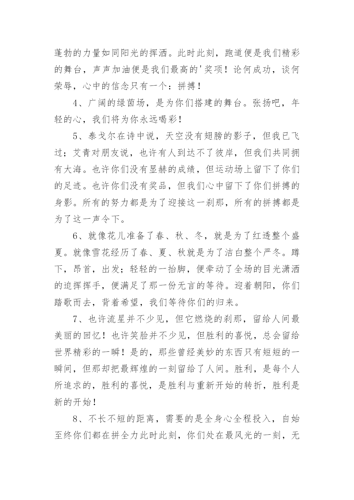 运动会加油稿运动会加油稿随着社会一步步向前发展,我们使用上加油稿的情况与日俱增,加油稿是鼓励激励对方的文稿。怎么写加油稿才能避免踩雷呢?以下是小编精心整理的运动会加油稿,仅供参考,欢迎大家阅读。运动会加油稿11、温暖的阳光洒在赛场上,男子乙组标枪的比赛即将开始。赛场上,一道道优美的弧线将轻盈地划过天空。健儿们用手中的标枪向距离的权限发起一轮又一轮的挑战。标枪在空中轻盈的姿态,是健儿们强健的力量和熟练的技巧的结合。谁能在这场激烈的竞争中获胜?让我们拭目以待,让我们为他们呐喊、助威吧!只有将力量与技巧合二为一的人,才能获得胜利的桂冠!2、有多少次挥汗如雨,伤痛曾添满记忆,只因为始终相信,去拼搏才能胜利。总在鼓舞自己,要成功就得努力。热血在赛场沸腾,巨人在赛场升起。相信自己,你将赢得胜利,创造奇迹;相信自己,梦想在你手中,这是你的天地。当一切过去,你们将是第一。相信自己,你们将超越极限,超越自己!相信自己,加油吧,健儿们,相信你自己。3、年轻的我们自信飞扬,青春的气息如同出生的朝阳,蓬勃的力量如同阳光的挥洒。此时此刻,跑道便是我们精彩的舞台,声声加油便是我们最高的'奖项!论何成功,谈何荣辱,心中的信念只有一个:拼搏!4、广阔的绿茵场,是为你们搭建的舞台。张扬吧,年轻的心,我们将为你永远喝彩!5、泰戈尔在诗中说,天空没有翅膀的影子,但我已飞过;艾青对朋友说,也许有人到达不了彼岸,但我们共同拥有大海。也许你们没有显赫的成绩,但运动场上留下了你们的足迹。也许你们没有奖品,但我们心中留下了你们拼搏的身影。所有的努力都是为了迎接这一刹那,所有的拼搏都是为了这一声令下。6、就像花儿准备了春、秋、冬,就是为了红透整个盛夏。就像雪花经历了春、夏、秋就是为了洁白整个严冬。蹲下,昂首,出发;轻轻的一抬脚,便牵动了全场的目光潇洒的迫挥挥手,便满足了那一份无言的等待。迎着朝阳,你们踏歌而去,背着希望,我们等待你们的归来。7、也许流星并不少见,但它燃烧的刹那,留给人间最美丽的回忆!也许笑脸并不少见,但胜利的喜悦,总会留给世界精彩的一瞬!是的,那些曾经美妙的东西只有短短的一瞬间,但那却把最辉煌的一刻留给了人间。胜利,是每个人所追求的,胜利的喜悦,是胜利与重新开始的转折,胜利是新的开始!8、不长不短的距离,需要的是全身心全程投入,自始至终你们都在拼全力此时此刻,你们处在最风光的一刻,无论第几坚持胜利的信心,只要跑下来,你们就是英雄。9、时间在流逝,赛道在延伸,成功在你面前展现心脏的跳动,热血在沸腾,辉煌在你脚下铸就加油吧,健儿们,这是意志的拼搏。这是速度的挑战。胜利在向你们招手,胜利在向你们呼唤。10、今天的你们英姿飒爽,今天的你们朝气蓬勃,今天的你们一马当先。相信自己,你是最棒的!不要放弃,不要气馁。成功永远属于你们。加油啊!11、运动场上有你们的飒爽英姿,运动场上有你们拼搏的身影,面对漫漫的征程,你没有畏惧和退缩,任汗水打湿脊背,任疲惫爬满全身,依然分离追赶,只有一个目标,只有一个信念,为班级赢得荣誉,拼搏吧,我为你们呐喊,加油!12、你用行动述说着过城的重要,没有无尽的终点,没有无法攀登的险峰,希望载着终点在向你微笑,拼搏吧!经历是一种精彩,迸发你全部的能量,成功是你汗水的写照。13、虽然你们在场上的时间很短暂,但你们的身影依然停留在人们的脑海里,因为你们是赛场上最可爱的人。14、场上英姿显自豪,脚下步伐在飞奔。你们是骄傲。你们是自豪,跑道因你幻彩,面对红色跑道,你们挥洒自如,不惧一切冲向终点。15、心中坚定的信念,脚下沉稳的步伐,你用行动告诉我们一个不变之理,没有走不完的路,没有过不了的山,成功正在终点冲着你高高的招手,用你那顽强的意志去努力,去迎接终点的鲜花与掌声,相信成功一定是属于你。16、汗水,泪水;笑声,歌声;我们尽情挥洒。开幕式上,运动场上,我们尽情展现,多少艰辛,多少困苦,我们勇敢承担。因为年轻,因为张扬,因为我们知道:用今天的汗水换来明天的微笑。17、坚定,执着,耐力与希望,在延伸的白色跑道中点点凝聚!力量,信念,拼搏与奋斗,在遥远的终点线上渐渐明亮!时代的强音正在你的脚下踏响。18、踏上跑道,是一种选择。离开起点,是一种勇气。驰骋赛场,是一种胜利。19、运动健将们,用你的实力,用你的精神,去开拓出,一片属于你的长跑天地!运动会加油稿21.不卑不亢,奋发向上,生命辉煌,我们开创。2.龙腾虎跃,雷霆万钧,无与伦比,万众一心。3.青春无畏,逐梦扬威!4.沉甸甸的铅球,寄托着你的希望,奋力一抛的瞬间,一道闪亮的弧线划破美丽的长空,希望向前,再向前!你胜利了,望着远方红色的终点线,那是汗水铺成的路,泪水堆成的山,平时的努力与奋战,不就为这一瞬间,于是你们用尽全身力气,冲向那决定命运的红线,你胜利了,耳旁飘来了同学们的欢呼与赞叹。5.每一份辛劳都