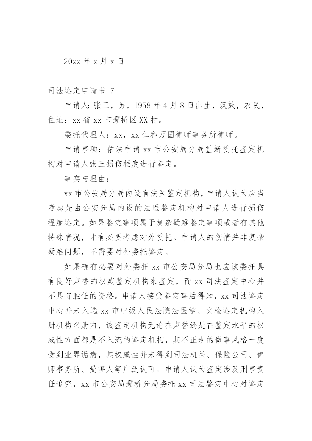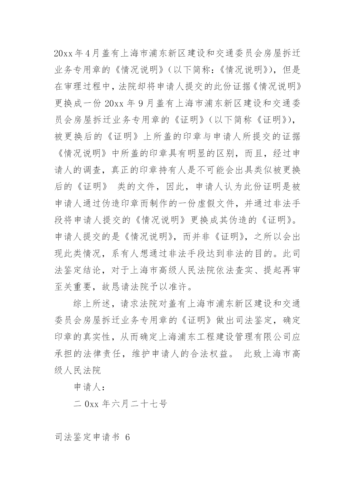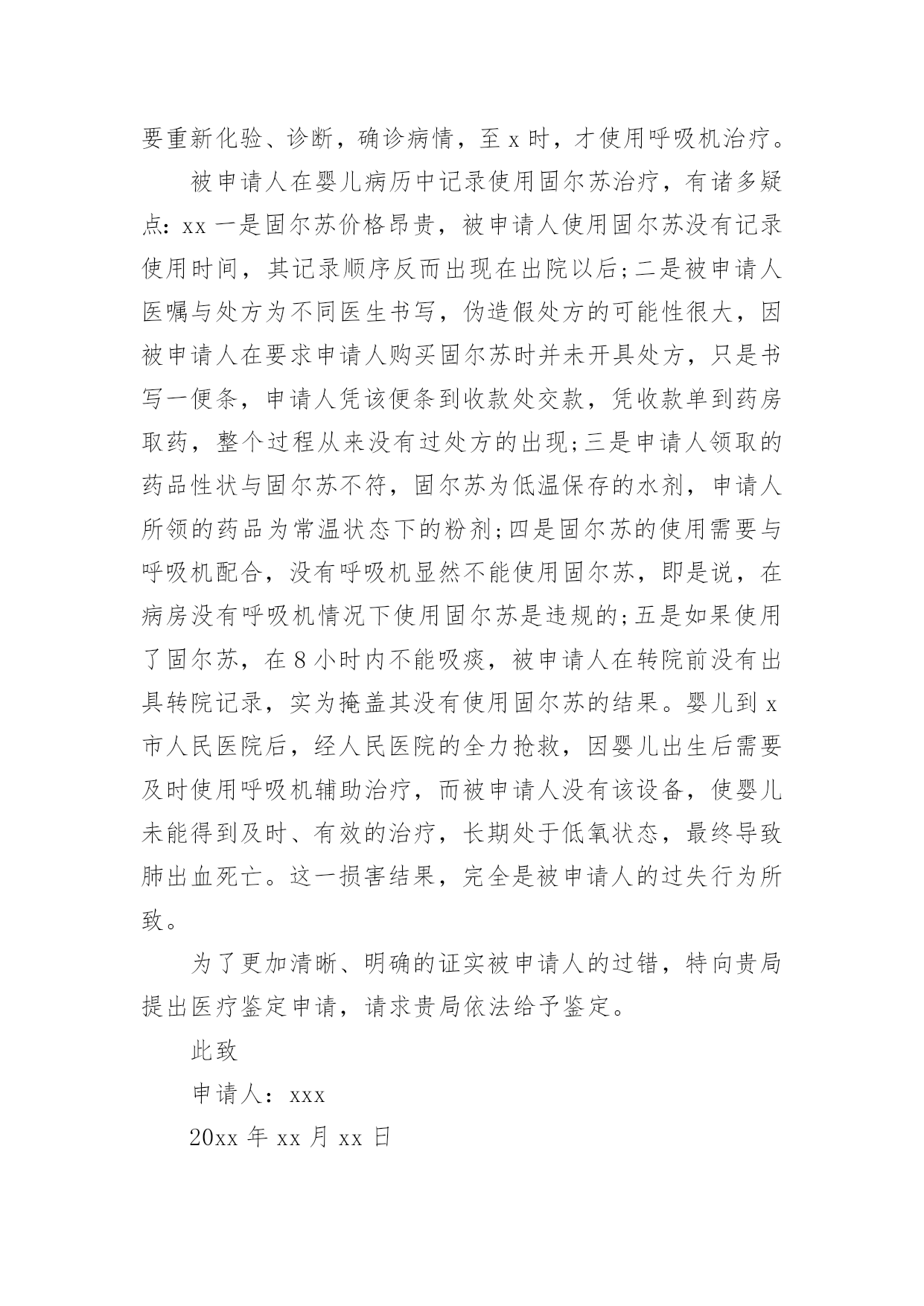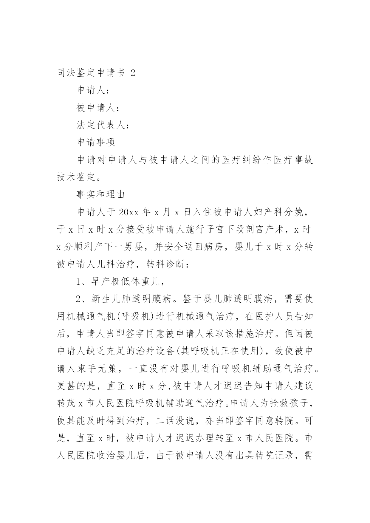 司法鉴定申请书随着时代在进步,申请书起到的作用越来越大,申请书可以使我们的愿望和请求得到合理表达。那么大家知道正规的申请书怎么写吗?下面是小编为大家收集的司法鉴定申请书,仅供参考,欢迎大家阅读。司法鉴定申请书1申请人:xxx申请事项:请求法院委托司法鉴定机构对申请人的伤残级别及护理期、营养期、休息期进行鉴定。事实与理由:xxxx年xx月xx日xx时许,在xxxx路出xxxx路附近,A驾驶B所有的牌号为AAAA的小轿车将驾驶电动自行车的申请人撞倒,造成申请人受伤。上海市公安局宝山分局交通警察支队出具的道路交通事故认定书中认定A负主要责任,申请人负次要责任。现A等拒不赔偿对申请人造成的损失,申请人无奈向贵院起诉,现因申请人受伤,为了进一步明确诉讼请求,现依法申请贵院委托司法鉴定机构对申请人的伤残及三期进行司法鉴定,请批准。此致敬礼!申请人:xxxxxx年xx月xx日司法鉴定申请书2申请人:被申请人:法定代表人:申请事项申请对申请人与被申请人之间的医疗纠纷作医疗事故技术鉴定。事实和理由申请人于20xx年x月x日入住被申请人妇产科分娩,于x日x时x分接受被申请人施行子宫下段剖宫产术,x时x分顺利产下一男婴,并安全返回病房,婴儿于x时x分转被申请人儿科治疗,转科诊断:1、早产极低体重儿,2、新生儿肺透明膜病。鉴于婴儿肺透明膜病,需要使用机械通气机(呼吸机)进行机械通气治疗,在医护人员告知后,申请人当即签字同意被申请人采取该措施治疗。但因被申请人缺乏充足的治疗设备(其呼吸机正在使用),致使被申请人束手无策,一直没有对婴儿进行呼吸机辅助通气治疗。更甚的是,直至x时x分,被申请人才迟迟告知申请人建议转茂x市人民医院呼吸机辅助通气治疗。申请人为抢救孩子,使其能及时得到治疗,二话没说,亦当即签字同意转院。可是,直至x时,被申请人才迟迟办理转至x市人民医院。市人民医院收治婴儿后,由于被申请人没有出具转院记录,需要重新化验、诊断,确诊病情,至x时,才使用呼吸机治疗。被申请人在婴儿病历中记录使用固尔苏治疗,有诸多疑点:xx一是固尔苏价格昂贵,被申请人使用固尔苏没有记录使用时间,其记录顺序反而出现在出院以后;二是被申请人医嘱与处方为不同医生书写,伪造假处方的可能性很大,因被申请人在要求申请人购买固尔苏时并未开具处方,只是书写一便条,申请人凭该便条到收款处交款,凭收款单到药房取药,整个过程从来没有过处方的出现;三是申请人领取的药品性状与固尔苏不符,固尔苏为低温保存的水剂,申请人所领的药品为常温状态下的粉剂;四是固尔苏的使用需要与呼吸机配合,没有呼吸机显然不能使用固尔苏,即是说,在病房没有呼吸机情况下使用固尔苏是违规的;五是如果使用了固尔苏,在8小时内不能吸痰,被申请人在转院前没有出具转院记录,实为掩盖其没有使用固尔苏的结果。婴儿到x市人民医院后,经人民医院的全力抢救,因婴儿出生后需要及时使用呼吸机辅助治疗,而被申请人没有该设备,使婴儿未能得到及时、有效的治疗,长期处于低氧状态,最终导致肺出血死亡。这一损害结果,完全是被申请人的过失行为所致。为了更加清晰、明确的证实被申请人的过错,特向贵局提出医疗鉴定申请,请求贵局依法给予鉴定。此致申请人:xxx20xx年xx月xx日司法鉴定申请书3申请人:XXXXX,XX,汉族,XX年XX月XX日出生住址:XXX省XX市XXX区XXX路XXXX号X幢XXX室;申请事项:申请法院委托鉴定机构对申请人位于XX市XX花园X—X—XXX的房屋装修和财产损失情况经行评估鉴定!申请理由:申请人诉XX市XXXXX有限公司损害赔偿一案已由贵院立案受理,现该房屋由于XX市XXXXXX有限公司疏于管理,导致下水管道的堵塞、水流不畅而被浸泡,屋内狼藉不堪,申请人房屋装修和财物遭受了相当大的损失。因此,特请求贵院委托鉴定机构对申请人的房屋装修损失和财产损失情况进行鉴定,以维护当事人的合法权益。此致XXX市XXX区人民法院申请人:XXX时间:XXXX年XX月XX日司法鉴定申请书4申请人:xxx,男,汉族,XXX出生,地址:XXXx,电话:XXX申请事项:请求贵院依法准予申请人撤销对工程量及增项鉴定的申请事实和理由双方合同约定条款中载有此面积按图纸工程量计算,最终结算按实际发生量核算,申请人计算的工程量为XXX平方米但被告xxx在诉讼中只承认申请人的工程量为XXX平方米(单价为XXX元每平米),与申请人计算的工程量相差共计XXX平方米。但是申请人为了便于本案尽快审理,该案得以早日解决,避免被告的无理缠诉故向贵院提出撤销鉴定申请,望准予。呈XXX人民法院申请人:XXX年XXX月XXX日司法鉴定申请书5申请人:xx申请事项:请求贵院委托相关权威鉴定机构:司法部刑事技术鉴定中心就证据《证明》上加盖的印章“上海市浦东新区建设和交通委员会房屋拆迁拆迁业务专