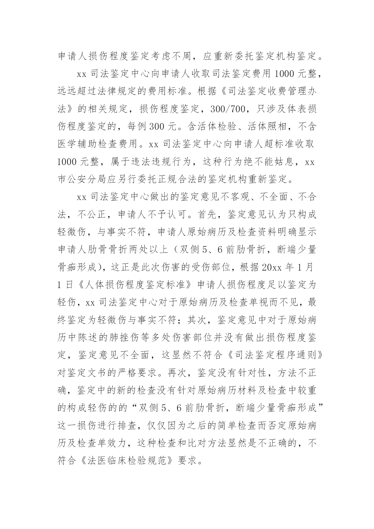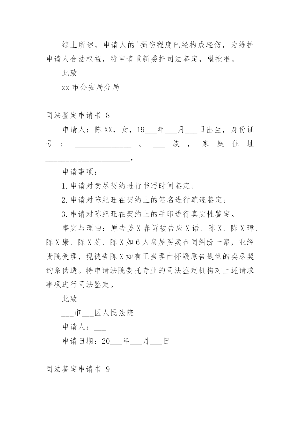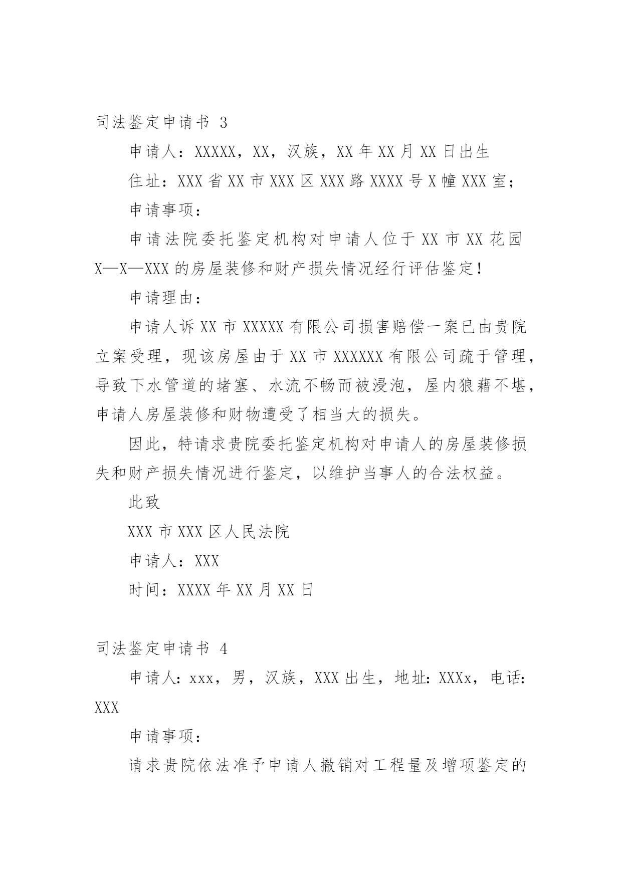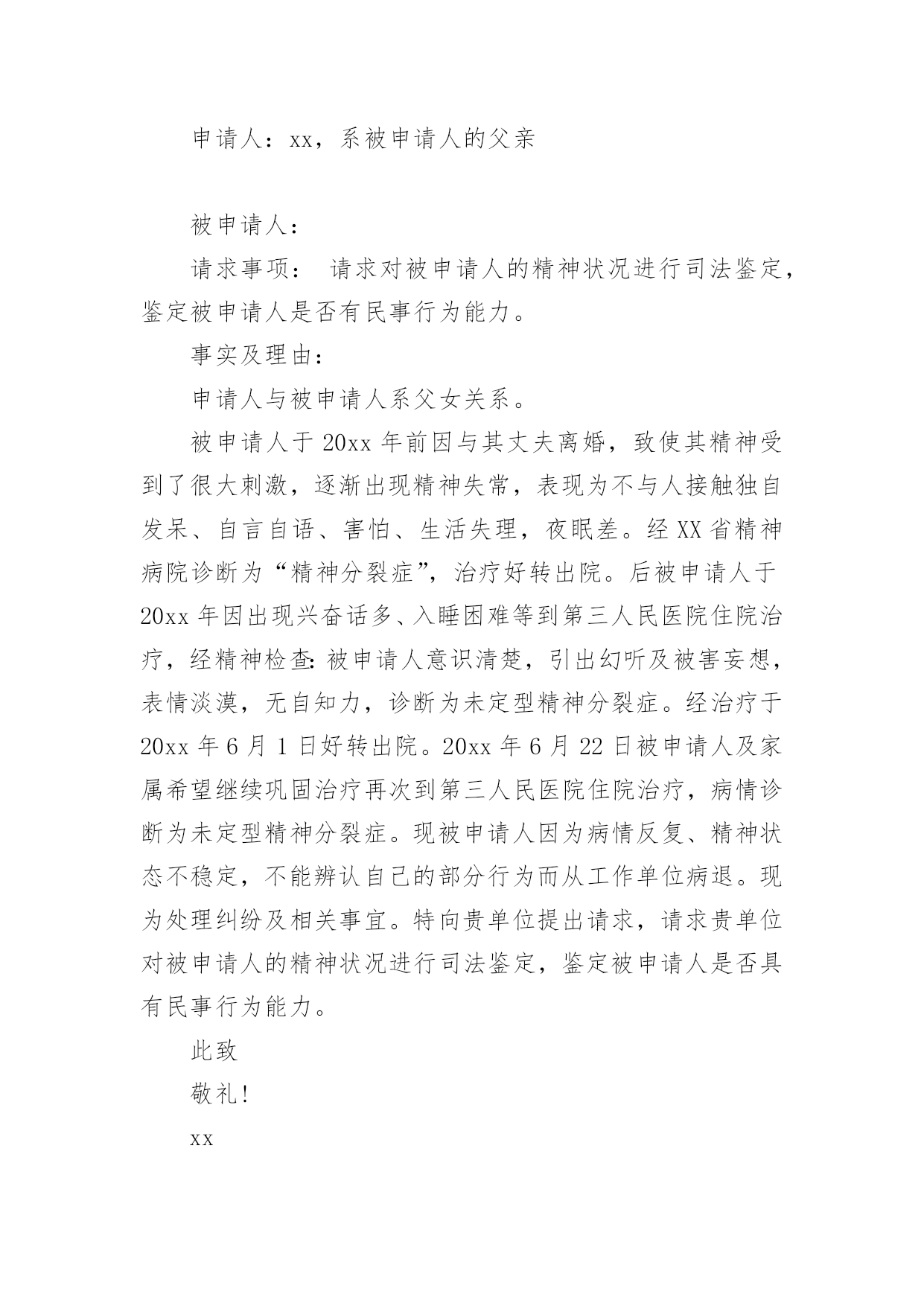 司法鉴定申请书随着时代在进步,申请书起到的作用越来越大,申请书可以使我们的愿望和请求得到合理表达。那么大家知道正规的申请书怎么写吗?下面是小编为大家收集的司法鉴定申请书,仅供参考,欢迎大家阅读。司法鉴定申请书1申请人:xxx申请事项:请求法院委托司法鉴定机构对申请人的伤残级别及护理期、营养期、休息期进行鉴定。事实与理由:xxxx年xx月xx日xx时许,在xxxx路出xxxx路附近,A驾驶B所有的牌号为AAAA的小轿车将驾驶电动自行车的申请人撞倒,造成申请人受伤。上海市公安局宝山分局交通警察支队出具的道路交通事故认定书中认定A负主要责任,申请人负次要责任。现A等拒不赔偿对申请人造成的损失,申请人无奈向贵院起诉,现因申请人受伤,为了进一步明确诉讼请求,现依法申请贵院委托司法鉴定机构对申请人的伤残及三期进行司法鉴定,请批准。此致敬礼!申请人:xxxxxx年xx月xx日司法鉴定申请书2申请人:被申请人:法定代表人:申请事项申请对申请人与被申请人之间的医疗纠纷作医疗事故技术鉴定。事实和理由申请人于20xx年x月x日入住被申请人妇产科分娩,于x日x时x分接受被申请人施行子宫下段剖宫产术,x时x分顺利产下一男婴,并安全返回病房,婴儿于x时x分转被申请人儿科治疗,转科诊断:1、早产极低体重儿,2、新生儿肺透明膜病。鉴于婴儿肺透明膜病,需要使用机械通气机(呼吸机)进行机械通气治疗,在医护人员告知后,申请人当即签字同意被申请人采取该措施治疗。但因被申请人缺乏充足的治疗设备(其呼吸机正在使用),致使被申请人束手无策,一直没有对婴儿进行呼吸机辅助通气治疗。更甚的是,直至x时x分,被申请人才迟迟告知申请人建议转茂x市人民医院呼吸机辅助通气治疗。申请人为抢救孩子,使其能及时得到治疗,二话没说,亦当即签字同意转院。可是,直至x时,被申请人才迟迟办理转至x市人民医院。市人民医院收治婴儿后,由于被申请人没有出具转院记录,需要重新化验、诊断,确诊病情,至x时,才使用呼吸机治疗。被申请人在婴儿病历中记录使用固尔苏治疗,有诸多疑点:xx一是固尔苏价格昂贵,被申请人使用固尔苏没有记录使用时间,其记录顺序反而出现在出院以后;二是被申请人医嘱与处方为不同医生书写,伪造假处方的可能性很大,因被申请人在要求申请人购买固尔苏时并未开具处方,只是书写一便条,申请人凭该便条到收款处交款,凭收款单到药房取药,整个过程从来没有过处方的出现;三是申请人领取的药品性状与固尔苏不符,固尔苏为低温保存的水剂,申请人所领的药品为常温状态下的粉剂;四是固尔苏的使用需要与呼吸机配合,没有呼吸机显然不能使用固尔苏,即是说,在病房没有呼吸机情况下使用固尔苏是违规的;五是如果使用了固尔苏,在8小时内不能吸痰,被申请人在转院前没有出具转院记录,实为掩盖其没有使用固尔苏的结果。婴儿到x市人民医院后,经人民医院的全力抢救,因婴儿出生后需要及时使用呼吸机辅助治疗,而被申请人没有该设备,使婴儿未能得到及时、有效的治疗,长期处于低氧状态,最终导致肺出血死亡。这一损害结果,完全是被申请人的过失行为所致。为了更加清晰、明确的证实被申请人的过错,特向贵局提出医疗鉴定申请,请求贵局依法给予鉴定。此致申请人:xxx20xx年xx月xx日司法鉴定申请书3申请人:XXXXX,XX,汉族,XX年XX月XX日出生住址:XXX省XX市XXX区XXX路XXXX号X幢XXX室;申请事项:申请法院委托鉴定机构对申请人位于XX市XX花园X—X—XXX的房屋装修和财产损失情况经行评估鉴定!申请理由:申请人诉XX市XXXXX有限公司损害赔偿一案已由贵院立案受理,现该房屋由于XX市XXXXXX有限公司疏于管理,导致下水管道的堵塞、水流不畅而被浸泡,屋内狼藉不堪,申请人房屋装修和财物遭受了相当大的损失。因此,特请求贵院委托鉴定机构对申请人的房屋装修损失和财产损失情况进行鉴定,以维护当事人的合法权益。此致XXX市XXX区人民法院申请人:XXX时间:XXXX年XX月XX日司法鉴定申请书4申请人:xxx,男,汉族,XXX出生,地址:XXXx,电话:XXX申请事项:请求贵院依法准予申请人撤销对工程量及增项鉴定的申请事实和理由双方合同约定条款中载有此面积按图纸工程量计算,最终结算按实际发生量核算,申请人计算的工程量为XXX平方米但被告xxx在诉讼中只承认申请人的工程量为XXX平方米(单价为XXX元每平米),与申请人计算的工程量相差共计XXX平方米。但是申请人为了便于本案尽快审理,该案得以早日解决,避免被告的无理缠诉故向贵院提出撤销鉴定申请,望准予。呈XXX人民法院申请人:XXX年XXX月XXX日司法鉴定申请书5申请人:xx申请事项:请求贵院委托相关权威鉴定机构:司法部刑事技术鉴定中心就证据《证明》上加盖的印章“上海市浦东新区建设和交通委员会房屋拆迁拆迁业务专