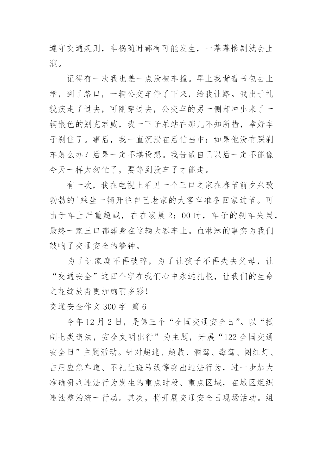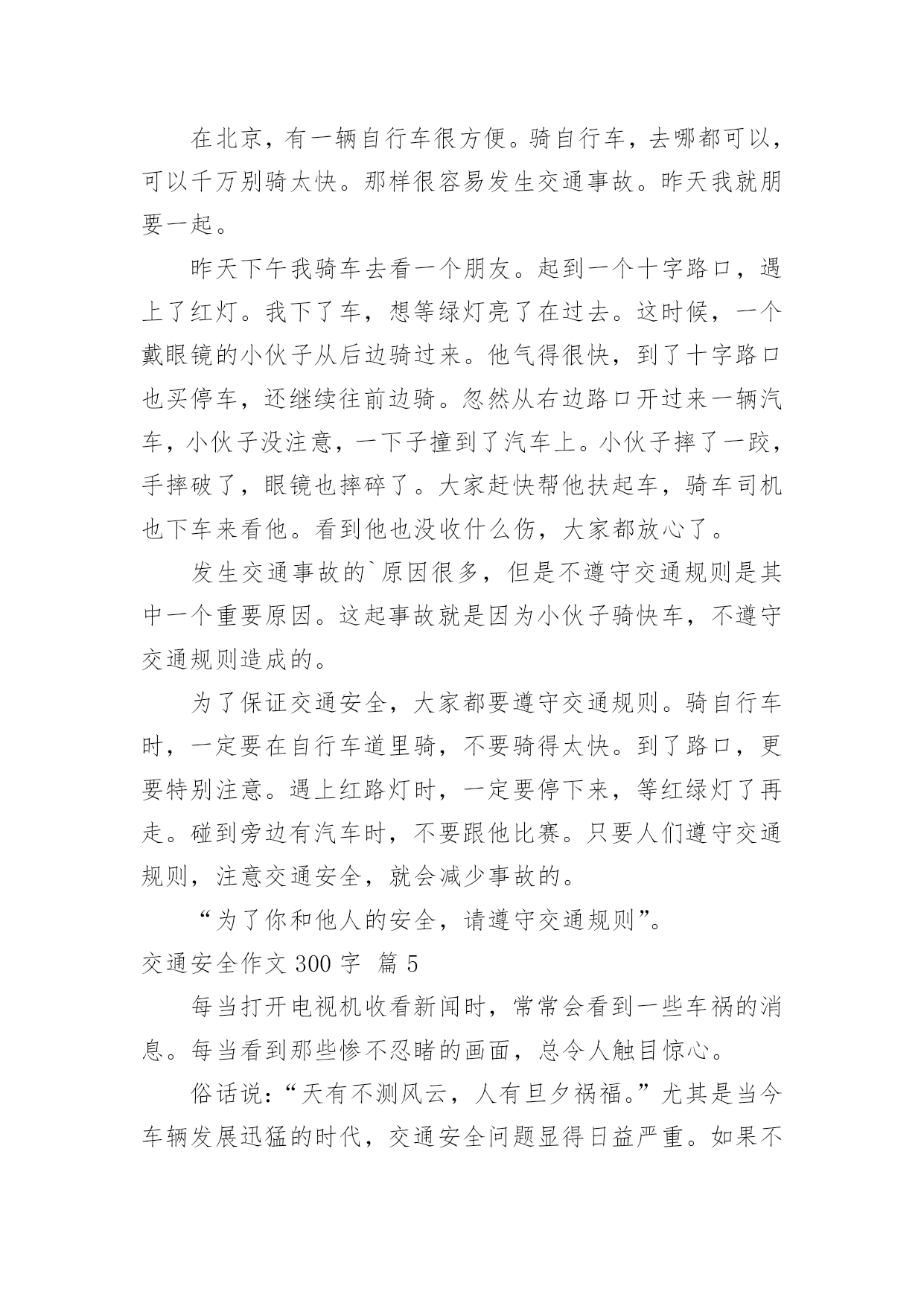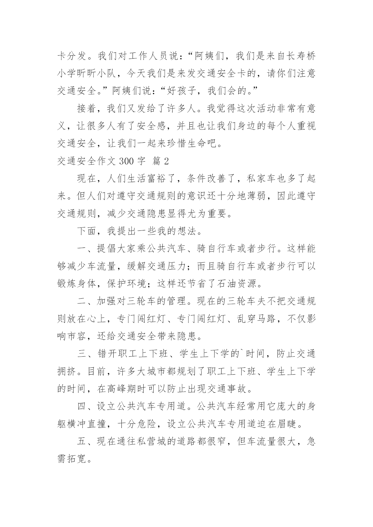 交通安全作文300字实用的交通安全作文300字(必备10篇)无论是身处学校还是步入社会,大家都写过作文吧,作文是一种言语活动,具有高度的综合性和创造性。那么问题来了,到底应如何写一篇优秀的作文呢?下面是小编为大家整理的交通安全作文300字10篇,仅供参考,欢迎大家阅读。交通安全作文300字篇1今天,我们雏鹰假日小队兴高采烈的拿着手中的交通安全卡,走上大街,在分发卡片,同时让人们注意交通安全。我以一名杭州日报小记者的身份,带领着我们队的成员坐在大街上,分发卡片。我们手拿卡片,首先发给了一位阿姨,我们队阿姨说:“阿姨,我们是雏鹰假日小队的成员,我们来发交通安全卡的,希望你注意交通安全。”阿姨的脸上露出了开心的笑容,阿姨说:“谢谢你们,我会的。”于是第一张卡片就顺利发出了。接着,有一位叔叔骑着电动车,我们说:“叔叔,我们是雏鹰假日小队的'成员,我们呢,今天是来发卡片的,叔叔,送你一张,请您注意交通安全,骑车慢一点,注意红绿灯。”叔叔说:“你们真好,这样就上更多的人又了安全感。谢谢。”叔叔的脸上笑容满面,我们还和叔叔合影了呢。然后,我们又去了凤栖百合摄影有限公司。进行了安全卡分发。我们对工作人员说:“阿姨们,我们是来自长寿桥小学昕昕小队,今天我们是来发交通安全卡的,请你们注意交通安全。”阿姨们说:“好孩子,我们会的。”接着,我们又发给了许多人。我觉得这次活动非常有意义,让很多人有了安全感,并且也让我们身边的每个人重视交通安全,让我们一起来珍惜生命吧。交通安全作文300字篇2现在,人们生活富裕了,条件改善了,私家车也多了起来。但人们对遵守交通规则的意识还十分地薄弱,因此遵守交通规则,减少交通隐患显得尤为重要。下面,我提出一些我的想法。一、提倡大家乘公共汽车、骑自行车或者步行。这样能够减少车流量,缓解交通压力;而且骑自行车或者步行可以锻炼身体,保护环境;这样还节省了石油资源。二、加强对三轮车的管理。现在的三轮车夫不把交通规则放在心上,专门闯红灯、专门闯红灯、乱穿马路,不仅影响市容,还给交通安全带来隐患。三、错开职工上下班、学生上下学的`时间,防止交通拥挤。目前,许多大城市都规划了职工上下班、学生上下学的时间,在高峰期时可以防止出现交通事故。四、设立公共汽车专用道。公共汽车经常用它庞大的身躯横冲直撞,十分危险,设立公共汽车专用道迫在眉睫。五、现在通往私营城的道路都很窄,但车流量很大,急需拓宽。六、莫干山火车站前面的十字路口红绿灯坏了,不少居民都直接往前冲,还说:“反正红绿灯都没了,还管他干什么呀!”希望有关政府尽快来修理一下。如果以上的这些建议能够被采纳,我相信我们武康的交通秩序会更加井然,人民的遵守交通规则的意识会更强。交通安全作文300字篇3随着社会的飞速发展,生活、工作节奏也愈来愈快,汽车成了人们的主要的交通工具,它给我们带来了前所未有的方便。在大家感叹社会进步、享受社会进步的同时,它也给我们带来了灾难。我国是一个人口大国,人多车多,使道路显得更加拥挤。据统计,近几年我国每年因车祸死亡人数超过X万人,其中,儿童死亡人数近X亡人,居世界XX。平均每分钟就有X人死于车祸,而不到1小时就有一个孩子葬身车轮。这是多么惊人的数字,在这下触目惊心的.数字背后,有多少个家庭失去欢乐,多少个亲人痛不欲生,多少个生命之花永远凋零。普及交通安全教育,把交通事故降到最低,这是时代的呼唤!因为人的生命只有一次,所以我们必须珍惜,珍惜生命,珍惜美好的生活。学校召集这部分学生家长开会,劝阻他们不让孩子乘坐超载车辆,避免发生交通安全事故,防患于未然。交通安全,从我做起,就让我们共同注意交通安全,远离危险,平安健康,让老师、家长都放心。交通安全作文300字篇4在北京,有一辆自行车很方便。骑自行车,去哪都可以,可以千万别骑太快。那样很容易发生交通事故。昨天我就朋要一起。昨天下午我骑车去看一个朋友。起到一个十字路口,遇上了红灯。我下了车,想等绿灯亮了在过去。这时候,一个戴眼镜的小伙子从后边骑过来。他气得很快,到了十字路口也买停车,还继续往前边骑。忽然从右边路口开过来一辆汽车,小伙子没注意,一下子撞到了汽车上。小伙子摔了一跤,手摔破了,眼镜也摔碎了。大家赶快帮他扶起车,骑车司机也下车来看他。看到他也没收什么伤,大家都放心了。发生交通事故的`原因很多,但是不遵守交通规则是其中一个重要原因。这起事故就是因为小伙子骑快车,不遵守交通规则造成的。为了保证交通安全,大家都要遵守交通规则。骑自行车时,一定要在自行车道里骑,不要骑得太快。到了路口,更要特别注意。遇上红路灯时,一定要停下来,等红绿灯了再走。碰到旁边有汽车时,不要跟他比赛。只要人们遵守交通规则,注意交通安全,就会减少事故的。“为了你和他人的安全,请遵守交通规则”。交通安全作文300字篇5每当打开电视机收看新闻时,常常会