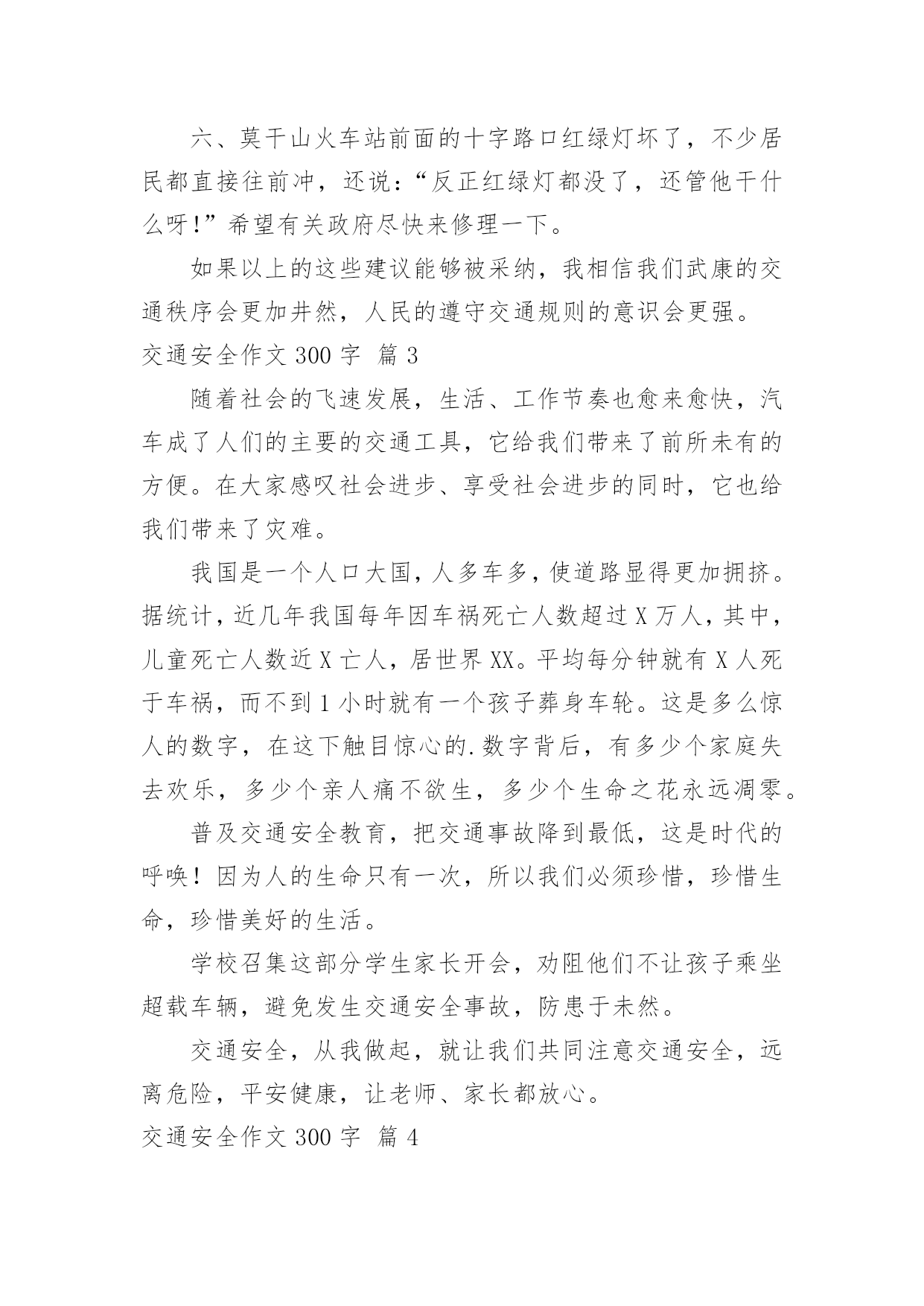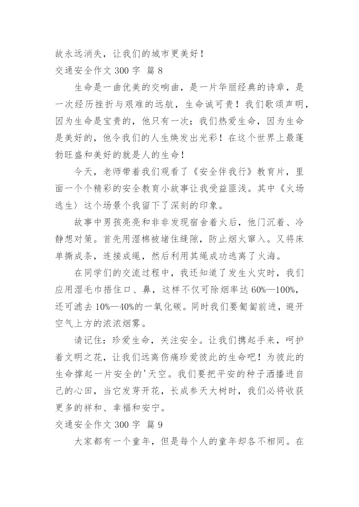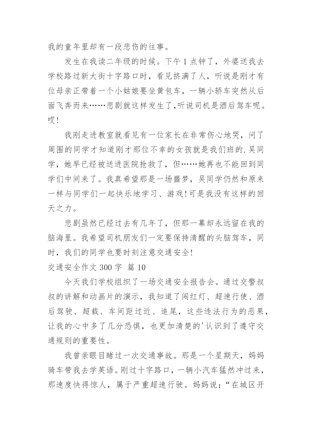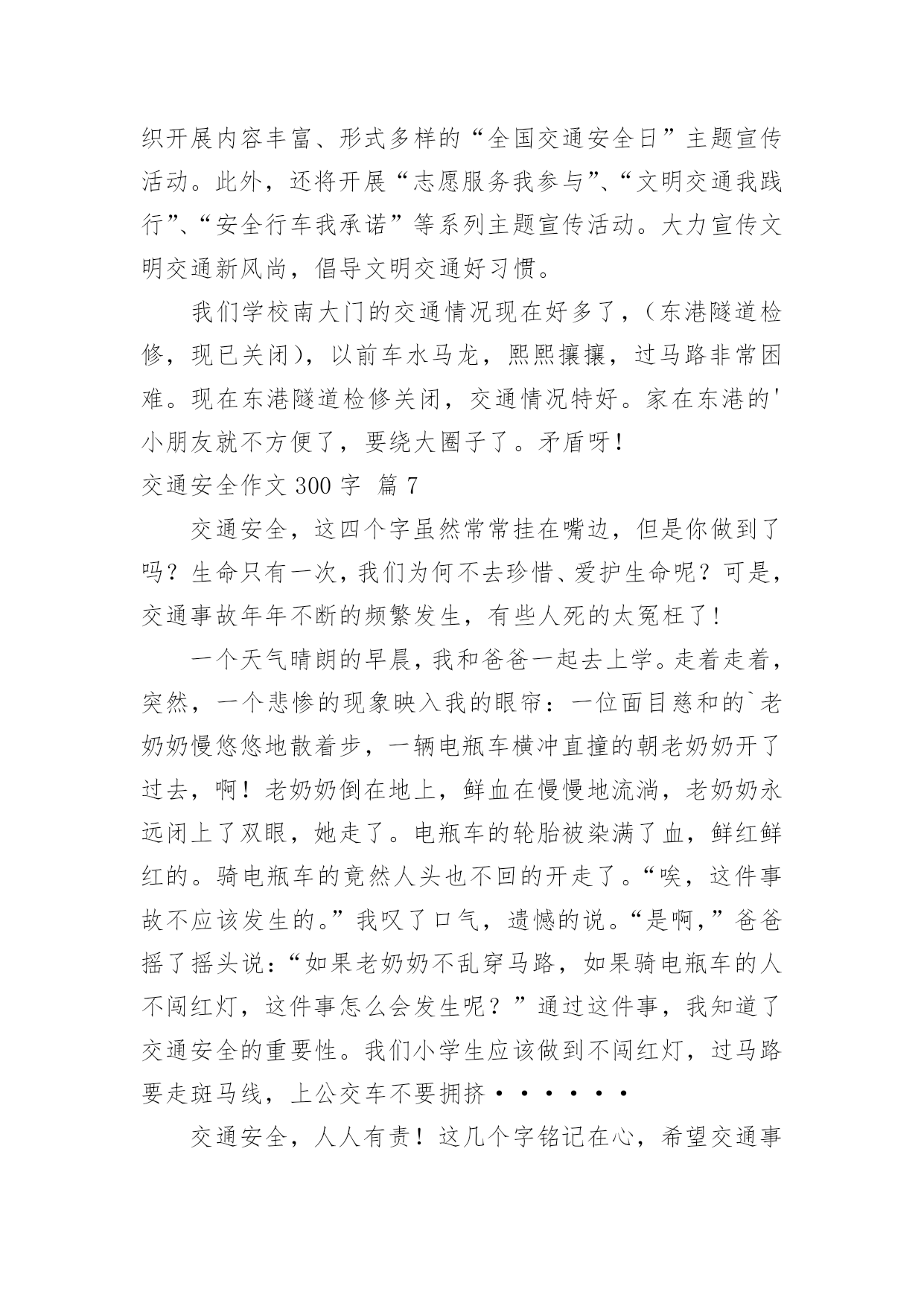 交通安全作文300字实用的交通安全作文300字(必备10篇)无论是身处学校还是步入社会,大家都写过作文吧,作文是一种言语活动,具有高度的综合性和创造性。那么问题来了,到底应如何写一篇优秀的作文呢?下面是小编为大家整理的交通安全作文300字10篇,仅供参考,欢迎大家阅读。交通安全作文300字篇1今天,我们雏鹰假日小队兴高采烈的拿着手中的交通安全卡,走上大街,在分发卡片,同时让人们注意交通安全。我以一名杭州日报小记者的身份,带领着我们队的成员坐在大街上,分发卡片。我们手拿卡片,首先发给了一位阿姨,我们队阿姨说:“阿姨,我们是雏鹰假日小队的成员,我们来发交通安全卡的,希望你注意交通安全。”阿姨的脸上露出了开心的笑容,阿姨说:“谢谢你们,我会的。”于是第一张卡片就顺利发出了。接着,有一位叔叔骑着电动车,我们说:“叔叔,我们是雏鹰假日小队的'成员,我们呢,今天是来发卡片的,叔叔,送你一张,请您注意交通安全,骑车慢一点,注意红绿灯。”叔叔说:“你们真好,这样就上更多的人又了安全感。谢谢。”叔叔的脸上笑容满面,我们还和叔叔合影了呢。然后,我们又去了凤栖百合摄影有限公司。进行了安全卡分发。我们对工作人员说:“阿姨们,我们是来自长寿桥小学昕昕小队,今天我们是来发交通安全卡的,请你们注意交通安全。”阿姨们说:“好孩子,我们会的。”接着,我们又发给了许多人。我觉得这次活动非常有意义,让很多人有了安全感,并且也让我们身边的每个人重视交通安全,让我们一起来珍惜生命吧。交通安全作文300字篇2现在,人们生活富裕了,条件改善了,私家车也多了起来。但人们对遵守交通规则的意识还十分地薄弱,因此遵守交通规则,减少交通隐患显得尤为重要。下面,我提出一些我的想法。一、提倡大家乘公共汽车、骑自行车或者步行。这样能够减少车流量,缓解交通压力;而且骑自行车或者步行可以锻炼身体,保护环境;这样还节省了石油资源。二、加强对三轮车的管理。现在的三轮车夫不把交通规则放在心上,专门闯红灯、专门闯红灯、乱穿马路,不仅影响市容,还给交通安全带来隐患。三、错开职工上下班、学生上下学的`时间,防止交通拥挤。目前,许多大城市都规划了职工上下班、学生上下学的时间,在高峰期时可以防止出现交通事故。四、设立公共汽车专用道。公共汽车经常用它庞大的身躯横冲直撞,十分危险,设立公共汽车专用道迫在眉睫。五、现在通往私营城的道路都很窄,但车流量很大,急需拓宽。六、莫干山火车站前面的十字路口红绿灯坏了,不少居民都直接往前冲,还说:“反正红绿灯都没了,还管他干什么呀!”希望有关政府尽快来修理一下。如果以上的这些建议能够被采纳,我相信我们武康的交通秩序会更加井然,人民的遵守交通规则的意识会更强。交通安全作文300字篇3随着社会的飞速发展,生活、工作节奏也愈来愈快,汽车成了人们的主要的交通工具,它给我们带来了前所未有的方便。在大家感叹社会进步、享受社会进步的同时,它也给我们带来了灾难。我国是一个人口大国,人多车多,使道路显得更加拥挤。据统计,近几年我国每年因车祸死亡人数超过X万人,其中,儿童死亡人数近X亡人,居世界XX。平均每分钟就有X人死于车祸,而不到1小时就有一个孩子葬身车轮。这是多么惊人的数字,在这下触目惊心的.数字背后,有多少个家庭失去欢乐,多少个亲人痛不欲生,多少个生命之花永远凋零。普及交通安全教育,把交通事故降到最低,这是时代的呼唤!因为人的生命只有一次,所以我们必须珍惜,珍惜生命,珍惜美好的生活。学校召集这部分学生家长开会,劝阻他们不让孩子乘坐超载车辆,避免发生交通安全事故,防患于未然。交通安全,从我做起,就让我们共同注意交通安全,远离危险,平安健康,让老师、家长都放心。交通安全作文300字篇4在北京,有一辆自行车很方便。骑自行车,去哪都可以,可以千万别骑太快。那样很容易发生交通事故。昨天我就朋要一起。昨天下午我骑车去看一个朋友。起到一个十字路口,遇上了红灯。我下了车,想等绿灯亮了在过去。这时候,一个戴眼镜的小伙子从后边骑过来。他气得很快,到了十字路口也买停车,还继续往前边骑。忽然从右边路口开过来一辆汽车,小伙子没注意,一下子撞到了汽车上。小伙子摔了一跤,手摔破了,眼镜也摔碎了。大家赶快帮他扶起车,骑车司机也下车来看他。看到他也没收什么伤,大家都放心了。发生交通事故的`原因很多,但是不遵守交通规则是其中一个重要原因。这起事故就是因为小伙子骑快车,不遵守交通规则造成的。为了保证交通安全,大家都要遵守交通规则。骑自行车时,一定要在自行车道里骑,不要骑得太快。到了路口,更要特别注意。遇上红路灯时,一定要停下来,等红绿灯了再走。碰到旁边有汽车时,不要跟他比赛。只要人们遵守交通规则,注意交通安全,就会减少事故的。“为了你和他人的安全,请遵守交通规则”。交通安全作文300字篇5每当打开电视机收看新闻时,常常会