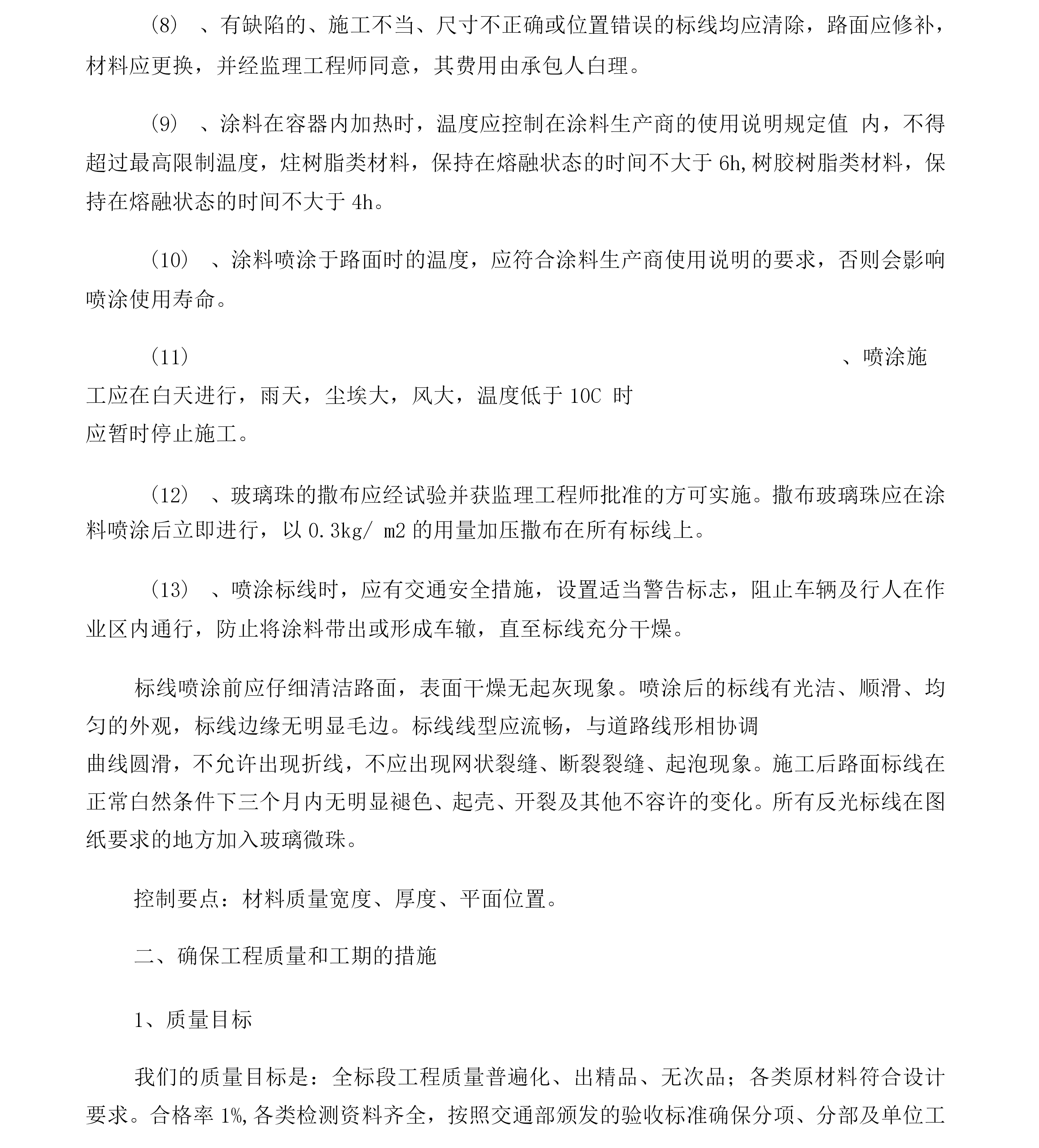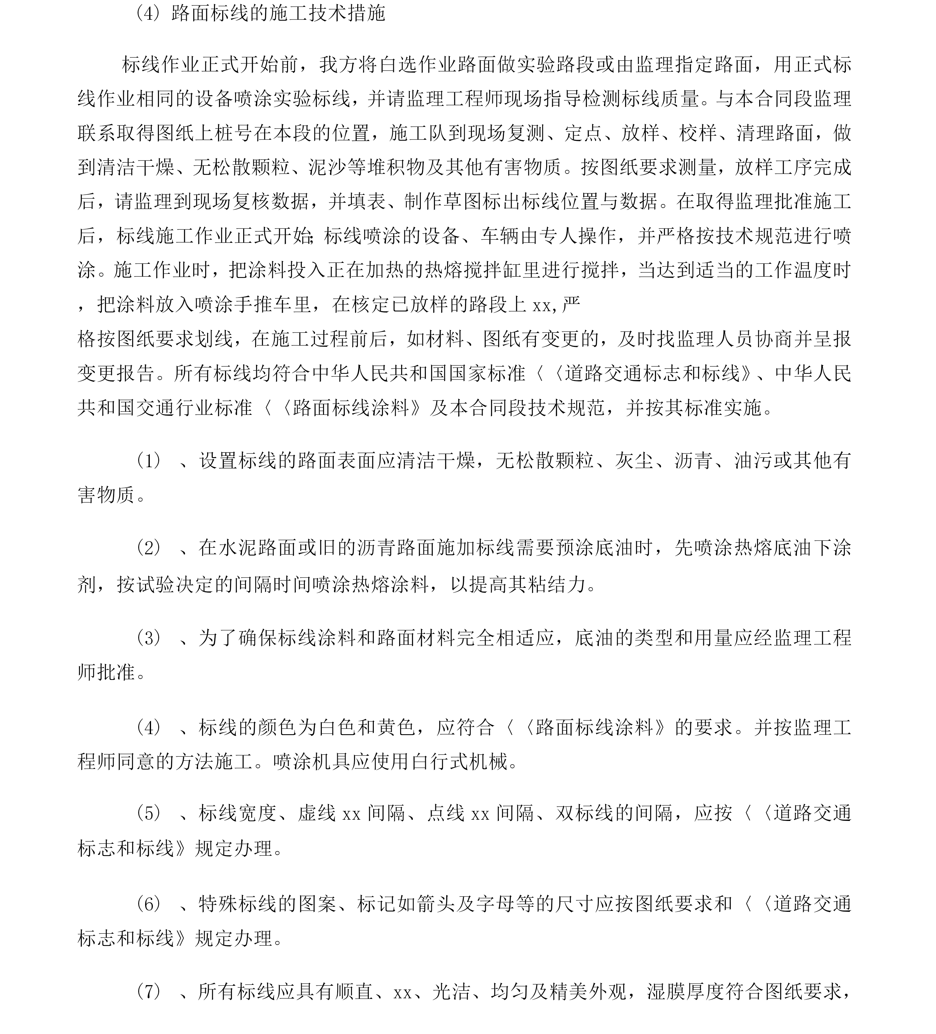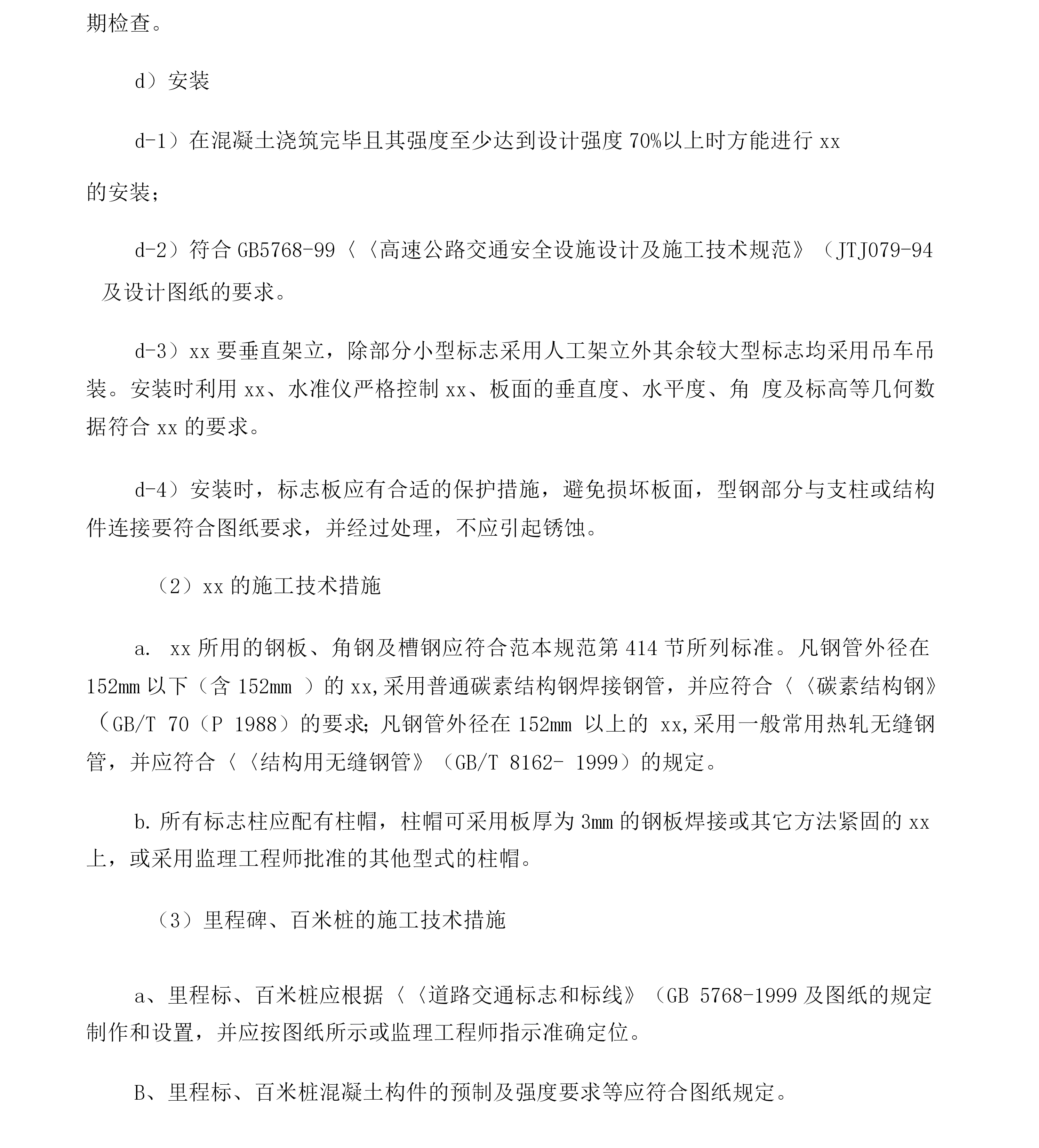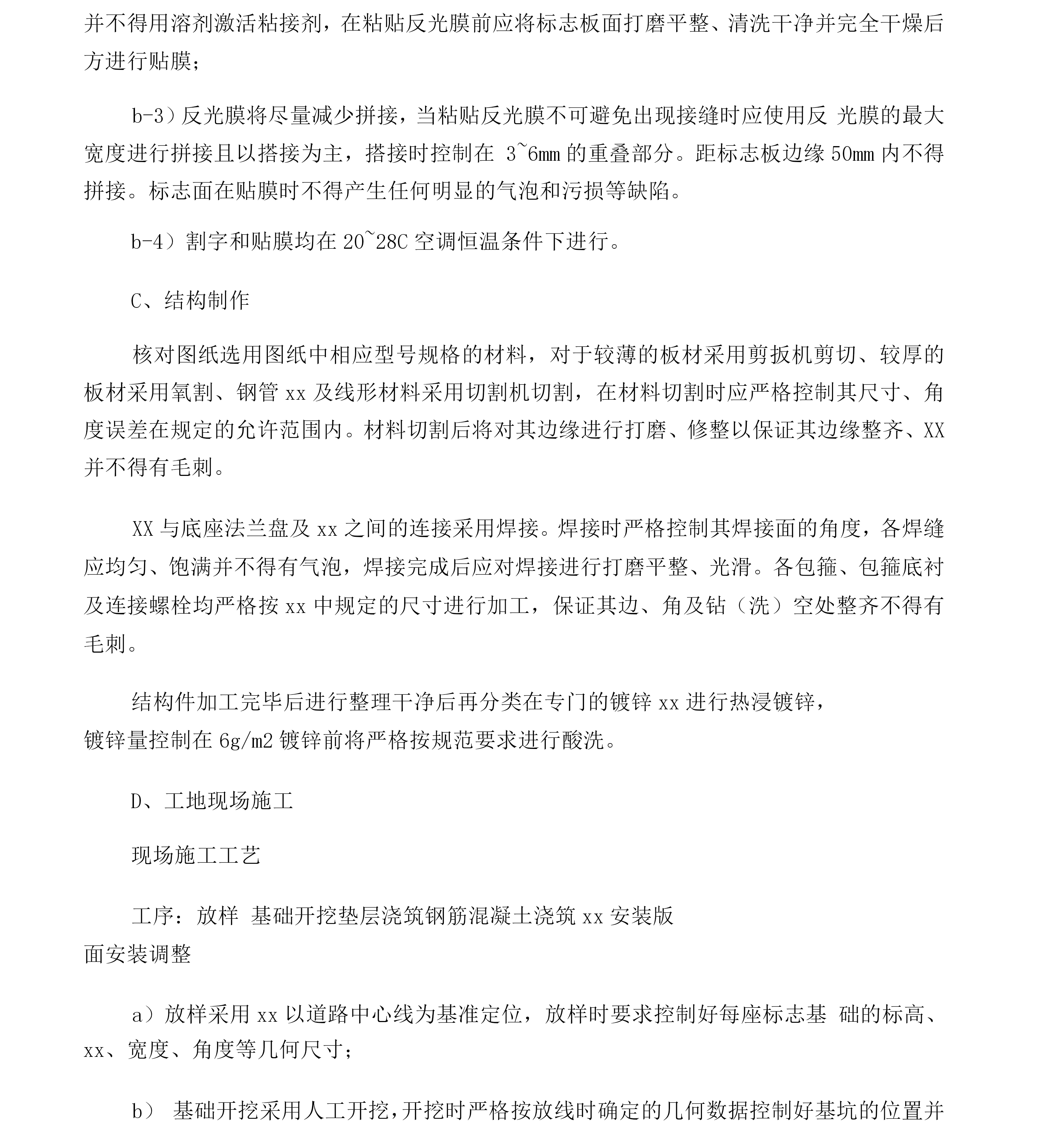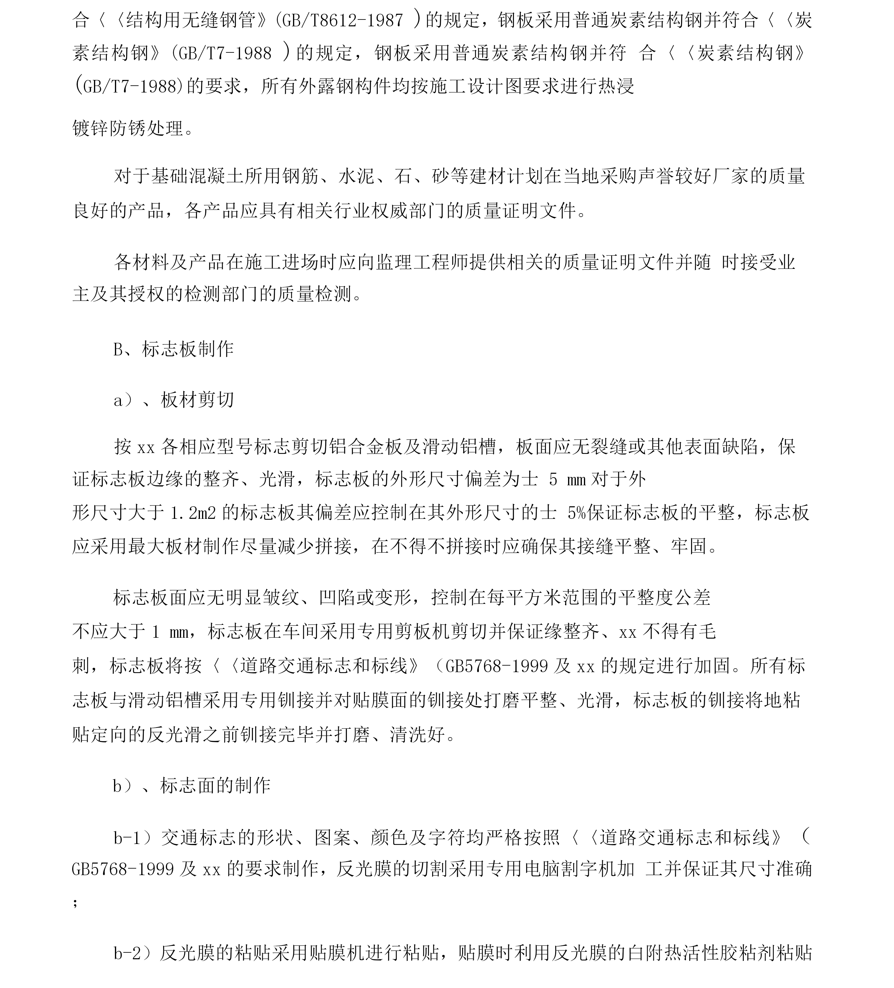 交通安全设施施工方案一、交通安全设施方案1、材料准备在接到中标XX后,我公司材料部将选用投标文件中规定的厂商的材料(产品)并选用符合设计文件质量要求或采用业主指定、推荐的材料。对每一批原材料进行抽检并对各成品或构件的加工进行全程的监督、检查,成品出厂前,由总公司实验站进行检测,对于特殊材料因本公司无实力检测的材料(产品)将委托交通部交通工程检测中心或相关的权威部门进行检测,确保到达工地的材料(产品)1%合格。成品到工地在安装前,由工地质检员检测并提交监理工程师抽样,检测合格后并经监理工程师同意后方能进行安装。如不符合要求的产品,坚决不能XX。安装完成后,按要求进行检测,对发生的问题坚决返工,确保工程达到优良。水泥、砂、石料等铺助材料采用合格产品,并委托指挥部指定的检测单位进行检测,确保材质合格,并选择合格的保管场地堆放。2、施工标志工程的施工技术措施A材料反光膜全部采用xx级反光膜,铝合金材料采用防锈的专用铝合金板材及滑槽,施工时将严格选材:铝合金板面应符合〈〈铝及铝合金板材的尺寸及允许偏差》(CB/T3194-1998和〈〈铝及铝合金板材》(CB/T3880-199/)的规定,滑动铝槽应符合<〈工业铝及铝合金热挤压型材》(GB/T6892-1986)的规定,铝合金板及滑动铝槽的规格将根据xx的规定按相应型号的标志进行选材。结构采用大型钢厂型材进行加工,凡钢管外径在152mm以下(含152mm)的xx采用普通炭素结构钢焊接钢管并符合〈〈炭素结构钢》(GB/T7-1988)的要求,钢管外径在152mm以上的xx采用一般常用热扎无缝钢管并符合〈〈结构用无缝钢管》(GB/T8612-1987)的规定,钢板采用普通炭素结构钢并符合〈〈炭素结构钢》(GB/T7-1988)的规定,钢板采用普通炭素结构钢并符合〈〈炭素结构钢》(GB/T7-1988)的要求,所有外露钢构件均按施工设计图要求进行热浸镀锌防锈处理。对于基础混凝土所用钢筋、水泥、石、砂等建材计划在当地采购声誉较好厂家的质量良好的产品,各产品应具有相关行业权威部门的质量证明文件。各材料及产品在施工进场时应向监理工程师提供相关的质量证明文件并随时接受业主及其授权的检测部门的质量检测。B、标志板制作a)、板材剪切按xx各相应型号标志剪切铝合金板及滑动铝槽,板面应无裂缝或其他表面缺陷,保证标志板边缘的整齐、光滑,标志板的外形尺寸偏差为士5mm对于外形尺寸大于1.2m2的标志板其偏差应控制在其外形尺寸的士5%保证标志板的平整,标志板应采用最大板材制作尽量减少拼接,在不得不拼接时应确保其接缝平整、牢固。标志板面应无明显皱纹、凹陷或变形,控制在每平方米范围的平整度公差不应大于1mm,标志板在车间采用专用剪板机剪切并保证缘整齐、xx不得有毛刺,标志板将按〈〈道路交通标志和标线》(GB5768-1999及xx的规定进行加固。所有标志板与滑动铝槽采用专用钏接并对贴膜面的钏接处打磨平整、光滑,标志板的钏接将地粘贴定向的反光滑之前钏接完毕并打磨、清洗好。b)、标志面的制作b-1)交通标志的形状、图案、颜色及字符均严格按照〈〈道路交通标志和标线》(GB5768-1999及xx的要求制作,反光膜的切割采用专用电脑割字机加工并保证其尺寸准确;b-2)反光膜的粘贴采用贴膜机进行粘贴,贴膜时利用反光膜的白附热活性胶粘剂粘贴并不得用溶剂激活粘接剂,在粘贴反光膜前应将标志板面打磨平整、清洗干净并完全干燥后方进行贴膜;b-3)反光膜将尽量减少拼接,当粘贴反光膜不可避免出现接缝时应使用反光膜的最大宽度进行拼接且以搭接为主,搭接时控制在3~6mm的重叠部分。距标志板边缘50mm内不得拼接。标志面在贴膜时不得产生任何明显的气泡和污损等缺陷。b-4)割字和贴膜均在20~28C空调恒温条件下进行。C、结构制作核对图纸选用图纸中相应型号规格的材料,对于较薄的板材采用剪扳机剪切、较厚的板材采用氧割、钢管xx及线形材料采用切割机切割,在材料切割时应严格控制其尺寸、角度误差在规定的允许范围内。材料切割后将对其边缘进行打磨、修整以保证其边缘整齐、XX并不得有毛刺。XX与底座法兰盘及xx之间的连接采用焊接。焊接时严格控制其焊接面的角度,各焊缝应均匀、饱满并不得有气泡,焊接完成后应对焊接进行打磨平整、光滑。各包箍、包箍底衬及连接螺栓均严格按xx中规定的尺寸进行加工,保证其边、角及钻(洗)空处整齐不得有毛刺。结构件加工完毕后进行整理干净后再分类在专门的镀锌xx进行热浸镀锌,镀锌量控制在6g/m2镀锌前将严格按规范要求进行酸洗。D、工地现场施工现场施工工艺工序:放样基础开挖垫层浇筑钢筋混凝土浇筑xx安装版面安装调整a)放样采用xx以道路中心线为基准定位,放样时要求控制好每座