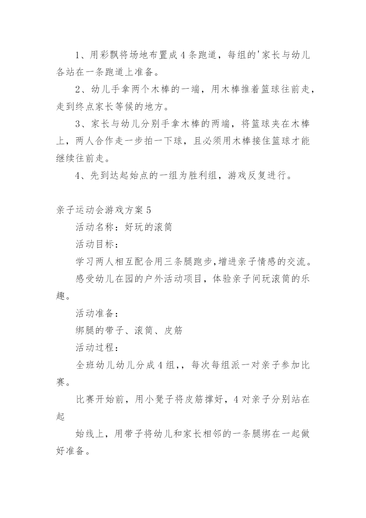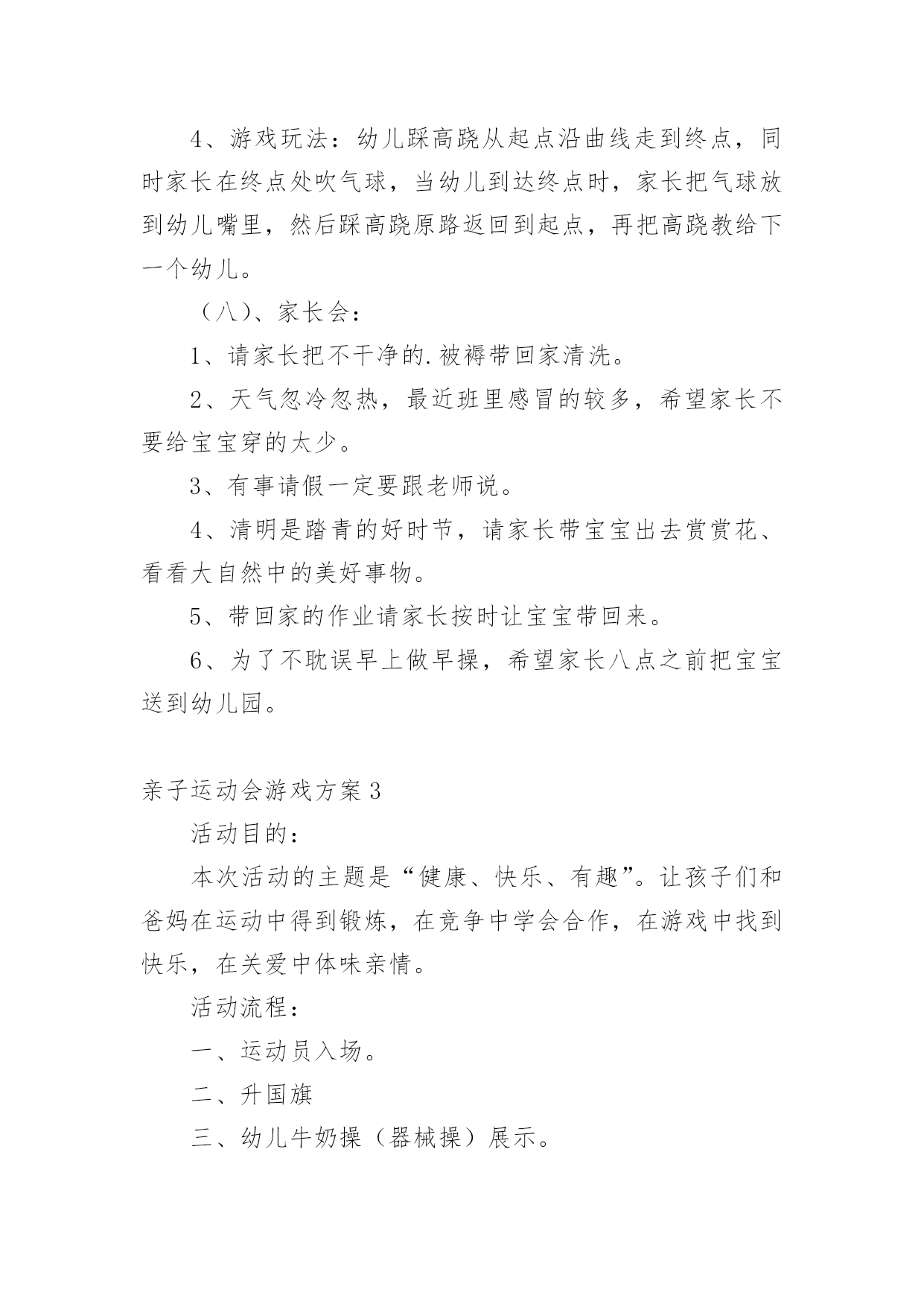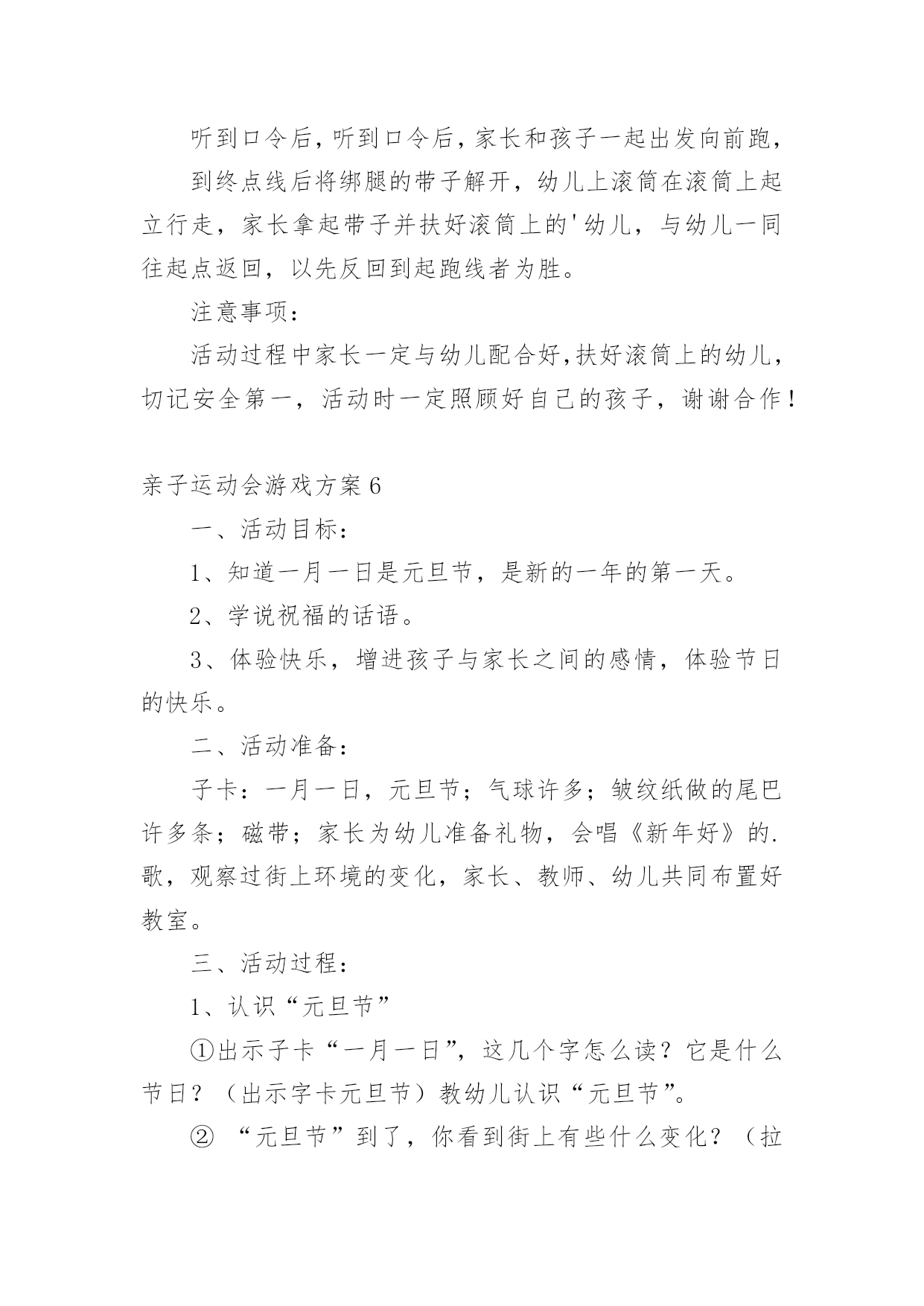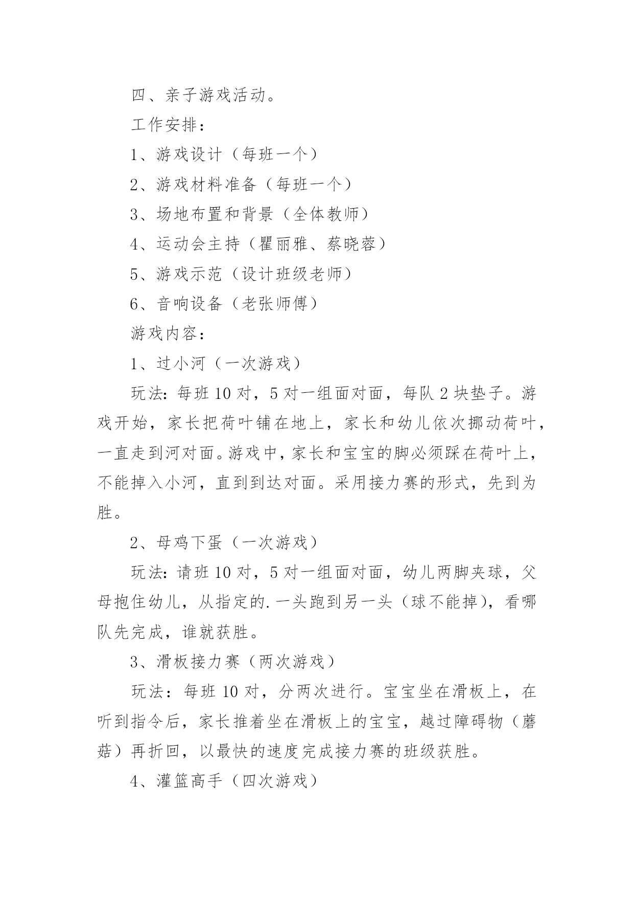 亲子运动会游戏方案为了确保事情或工作科学有序进行,往往需要预先制定好方案,方案是从目的、要求、方式、方法、进度等方面进行安排的书面计划。那么制定方案需要注意哪些问题呢?下面是小编整理的亲子运动会游戏方案,仅供参考,欢迎大家阅读。亲子运动会游戏方案1活动意图:幼儿园一片春意盎然,正是幼儿进行个种体育活动锻炼的好时机,为了增强幼儿对体育活动的兴趣,提高幼儿的身体素质。帮助幼儿懂得在活动中要合作、谦让、遵守规则。敢于克服困难,能体验胜利的愉悦。培养幼儿初步的竞争意识,体现团结协作的竞赛风格。同时还在亲子运动中,为孩子创设一个大胆与人交往的氛围,使家园联系更为紧密,关系更为融洽。增进家长与教师之间的感情;增进家庭之间的情感交流;宣传本幼儿园。时间:20xx年12月28日程序:一、向家长介绍本次活动的安排及注意事项1、每位幼儿和家长参加多项亲子团体比赛。2、遵守比赛规则,服从裁判决定。友谊第一,比赛第二。3、各位家长管理好自己的孩子,注意安全,不在赛场内自由走动或奔跑。二、比赛过程:1、“小小搬运工”活动准备:乒乓球,篮子、小碗、漏斗式器皿活动规则:家长手上粘住漏斗式器皿站在起点,原地旋转两圈,用器皿从旁边的.篮子上装一个兵乓球上来,运往幼儿所在的白线处,幼儿站在白线处,手托住头顶上的碗,接住家长运来的乒乓球,把它送往终点的篮子,游戏反复进行,以一分钟为基准,一分钟时间到了,终点的篮子里乒乓球最多的胜利。2、“车轮滚滚”活动准备:运输带活动规则:我们给大家准备了一个运输带,运输带上站着四个家长和四个孩子,这些家长和幼儿都站在运输带上行走,双脚不可以踩在运输带外面,哪组先达到指定位置,哪组获胜。3、“拔河”活动准备:粗绳一根、哨子一个活动规则:每轮两队家长比赛,以抽签形式定比赛方,每轮决出后再进行复赛、决赛。亲子运动会游戏方案2一、活动时间:20xx年4月4日二、活动地点:广场三、运动会目标:通过开展亲子游戏,加强家长与子女之间的情感交流,增加老师与家长之间的沟通机会。通过体育活动,培养幼儿与父母或同伴共同克服困难夺得胜利的精神。培养幼儿参加体育活动的兴趣,亲身体验体育活动的魅力。四、活动准备:1.通知父母来园参加亲子活动。2.准备游戏需要的材料。3.布置活动场地。五、具体活动方案:活动流程:(一)、幼儿教师致欢迎词(二)、运动员入场仪式(三)、领导讲话(四)、幼儿代表发言(五)、家长代表发言(六)、教师与家长讲注意事项。(1)、请您在活动中看好您的宝宝,以免其受到伤害。(2)、请在活动过程中遵守活动规则。(3)、在活动中请勿拥挤。(4)、在活动中表现棒的小朋友可以获得我们的小礼品哦!(七)、教师介绍亲子活动项目。教师按标志把家长幼儿分为两队:活动一:1、游戏名称:铺地砖(小马过河)2、游戏准备:呼啦圈3、参加人员:幼儿、爸爸或妈妈4、游戏玩法:跑道上准备两个呼啦圈,游戏开始幼儿跳入第一个呼啦圈内,由脚下到头顶把呼啦圈取出交给家长,再跳入第二个呼啦圈,同时家长把前一个呼啦圈放到幼儿前面供其使用,依此类推。由对面家长和孩子继续(接力)活动,哪个班孩子首先完成夺得该项目冠军。活动二:1、游戏名称:夹球赛2、游戏准备:小木棒、篮球3、参加人员:幼儿、爸爸或妈妈4、游戏玩法:家长从起点双腿夹球蹦到终点,再和幼儿用两根小木棒夹球回到起点(用小木棒夹球时不得用小木棒托着球跑)。活动三:1、游戏名称:踩高跷比赛2、游戏准备:高跷、气球3、参加人员:幼儿、爸爸或妈妈4、游戏玩法:幼儿踩高跷从起点沿曲线走到终点,同时家长在终点处吹气球,当幼儿到达终点时,家长把气球放到幼儿嘴里,然后踩高跷原路返回到起点,再把高跷教给下一个幼儿。(八)、家长会:1、请家长把不干净的.被褥带回家清洗。2、天气忽冷忽热,最近班里感冒的较多,希望家长不要给宝宝穿的太少。3、有事请假一定要跟老师说。4、清明是踏青的好时节,请家长带宝宝出去赏赏花、看看大自然中的美好事物。5、带回家的作业请家长按时让宝宝带回来。6、为了不耽误早上做早操,希望家长八点之前把宝宝送到幼儿园。亲子运动会游戏方案3活动目的:本次活动的主题是“健康、快乐、有趣”。让孩子们和爸妈在运动中得到锻炼,在竞争中学会合作,在游戏中找到快乐,在关爱中体味亲情。活动流程:一、运动员入场。二、升国旗三、幼儿牛奶操(器械操)展示。四、亲子游戏活动。工作安排:1、游戏设计(每班一个)2、游戏材料准备(每班一个)3、场地布置和背景(全体教师)4、运动会主持(瞿丽雅、蔡晓蓉)5、游戏示范(设计班级老师)6、音响设备(老张师傅)游戏内容:1、过小河(一次游戏)玩法:每班10对,5对一组面对面,每队2块垫子。游戏开始,家长把荷叶铺在地上,家长和幼儿依次挪动荷叶,一直走到河对面。游戏中,家长和宝宝的脚必须踩在荷叶上,不能掉入小河,直到到达