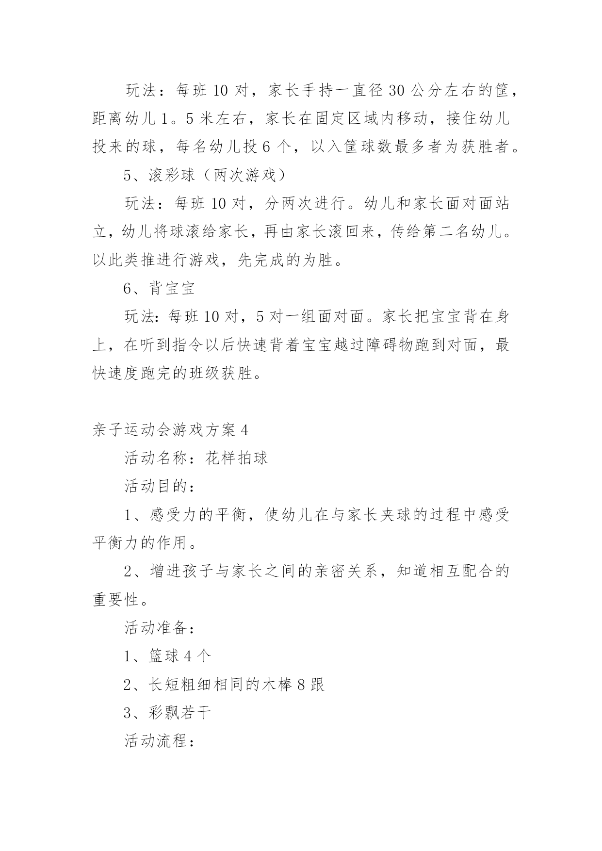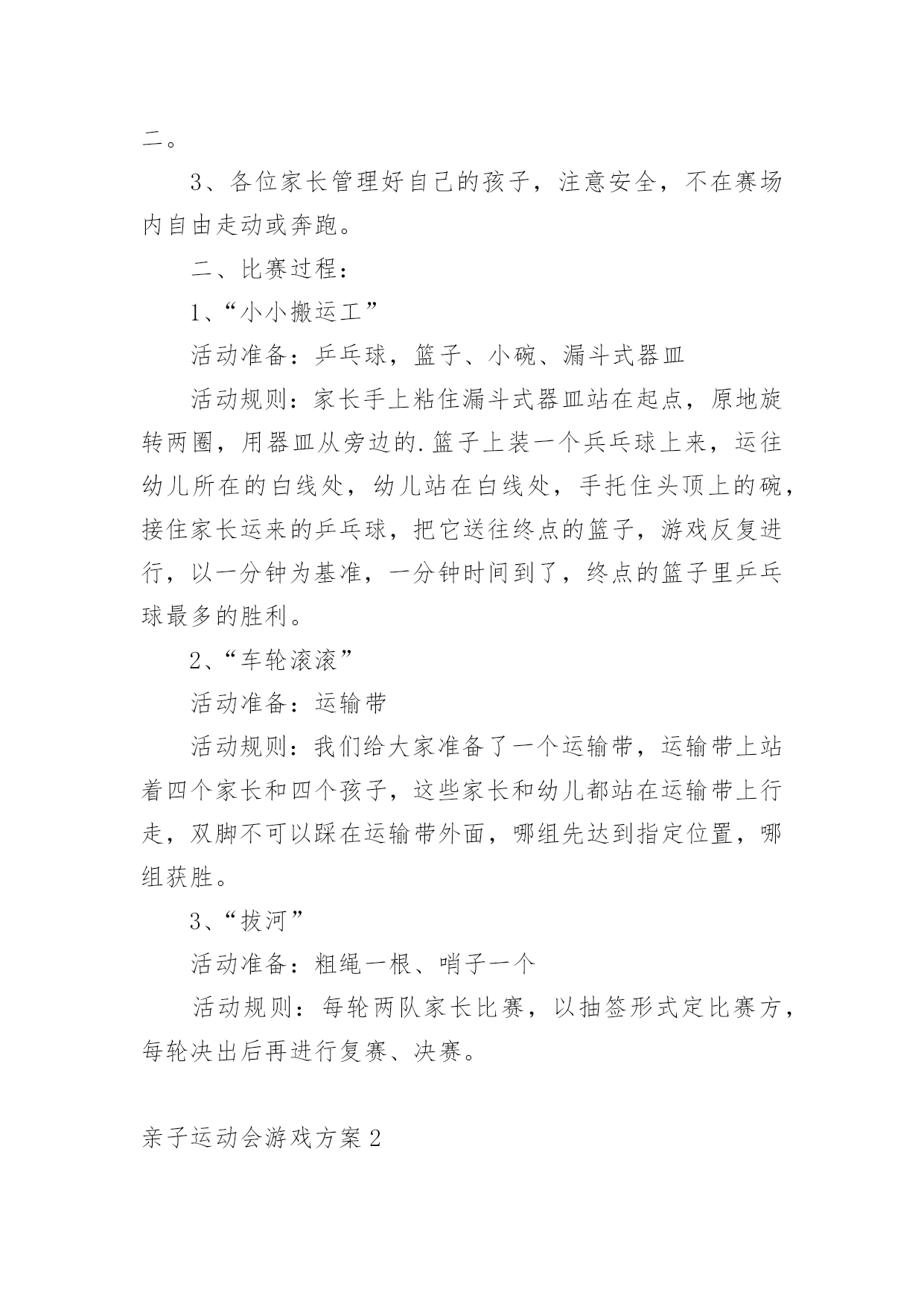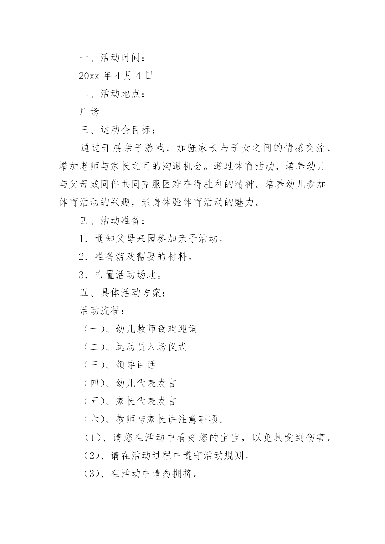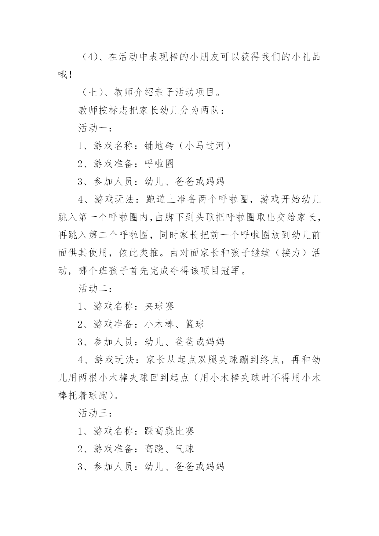 亲子运动会游戏方案为了确保事情或工作科学有序进行,往往需要预先制定好方案,方案是从目的、要求、方式、方法、进度等方面进行安排的书面计划。那么制定方案需要注意哪些问题呢?下面是小编整理的亲子运动会游戏方案,仅供参考,欢迎大家阅读。亲子运动会游戏方案1活动意图:幼儿园一片春意盎然,正是幼儿进行个种体育活动锻炼的好时机,为了增强幼儿对体育活动的兴趣,提高幼儿的身体素质。帮助幼儿懂得在活动中要合作、谦让、遵守规则。敢于克服困难,能体验胜利的愉悦。培养幼儿初步的竞争意识,体现团结协作的竞赛风格。同时还在亲子运动中,为孩子创设一个大胆与人交往的氛围,使家园联系更为紧密,关系更为融洽。增进家长与教师之间的感情;增进家庭之间的情感交流;宣传本幼儿园。时间:20xx年12月28日程序:一、向家长介绍本次活动的安排及注意事项1、每位幼儿和家长参加多项亲子团体比赛。2、遵守比赛规则,服从裁判决定。友谊第一,比赛第二。3、各位家长管理好自己的孩子,注意安全,不在赛场内自由走动或奔跑。二、比赛过程:1、“小小搬运工”活动准备:乒乓球,篮子、小碗、漏斗式器皿活动规则:家长手上粘住漏斗式器皿站在起点,原地旋转两圈,用器皿从旁边的.篮子上装一个兵乓球上来,运往幼儿所在的白线处,幼儿站在白线处,手托住头顶上的碗,接住家长运来的乒乓球,把它送往终点的篮子,游戏反复进行,以一分钟为基准,一分钟时间到了,终点的篮子里乒乓球最多的胜利。2、“车轮滚滚”活动准备:运输带活动规则:我们给大家准备了一个运输带,运输带上站着四个家长和四个孩子,这些家长和幼儿都站在运输带上行走,双脚不可以踩在运输带外面,哪组先达到指定位置,哪组获胜。3、“拔河”活动准备:粗绳一根、哨子一个活动规则:每轮两队家长比赛,以抽签形式定比赛方,每轮决出后再进行复赛、决赛。亲子运动会游戏方案2一、活动时间:20xx年4月4日二、活动地点:广场三、运动会目标:通过开展亲子游戏,加强家长与子女之间的情感交流,增加老师与家长之间的沟通机会。通过体育活动,培养幼儿与父母或同伴共同克服困难夺得胜利的精神。培养幼儿参加体育活动的兴趣,亲身体验体育活动的魅力。四、活动准备:1.通知父母来园参加亲子活动。2.准备游戏需要的材料。3.布置活动场地。五、具体活动方案:活动流程:(一)、幼儿教师致欢迎词(二)、运动员入场仪式(三)、领导讲话(四)、幼儿代表发言(五)、家长代表发言(六)、教师与家长讲注意事项。(1)、请您在活动中看好您的宝宝,以免其受到伤害。(2)、请在活动过程中遵守活动规则。(3)、在活动中请勿拥挤。(4)、在活动中表现棒的小朋友可以获得我们的小礼品哦!(七)、教师介绍亲子活动项目。教师按标志把家长幼儿分为两队:活动一:1、游戏名称:铺地砖(小马过河)2、游戏准备:呼啦圈3、参加人员:幼儿、爸爸或妈妈4、游戏玩法:跑道上准备两个呼啦圈,游戏开始幼儿跳入第一个呼啦圈内,由脚下到头顶把呼啦圈取出交给家长,再跳入第二个呼啦圈,同时家长把前一个呼啦圈放到幼儿前面供其使用,依此类推。由对面家长和孩子继续(接力)活动,哪个班孩子首先完成夺得该项目冠军。活动二:1、游戏名称:夹球赛2、游戏准备:小木棒、篮球3、参加人员:幼儿、爸爸或妈妈4、游戏玩法:家长从起点双腿夹球蹦到终点,再和幼儿用两根小木棒夹球回到起点(用小木棒夹球时不得用小木棒托着球跑)。活动三:1、游戏名称:踩高跷比赛2、游戏准备:高跷、气球3、参加人员:幼儿、爸爸或妈妈4、游戏玩法:幼儿踩高跷从起点沿曲线走到终点,同时家长在终点处吹气球,当幼儿到达终点时,家长把气球放到幼儿嘴里,然后踩高跷原路返回到起点,再把高跷教给下一个幼儿。(八)、家长会:1、请家长把不干净的.被褥带回家清洗。2、天气忽冷忽热,最近班里感冒的较多,希望家长不要给宝宝穿的太少。3、有事请假一定要跟老师说。4、清明是踏青的好时节,请家长带宝宝出去赏赏花、看看大自然中的美好事物。5、带回家的作业请家长按时让宝宝带回来。6、为了不耽误早上做早操,希望家长八点之前把宝宝送到幼儿园。亲子运动会游戏方案3活动目的:本次活动的主题是“健康、快乐、有趣”。让孩子们和爸妈在运动中得到锻炼,在竞争中学会合作,在游戏中找到快乐,在关爱中体味亲情。活动流程:一、运动员入场。二、升国旗三、幼儿牛奶操(器械操)展示。四、亲子游戏活动。工作安排:1、游戏设计(每班一个)2、游戏材料准备(每班一个)3、场地布置和背景(全体教师)4、运动会主持(瞿丽雅、蔡晓蓉)5、游戏示范(设计班级老师)6、音响设备(老张师傅)游戏内容:1、过小河(一次游戏)玩法:每班10对,5对一组面对面,每队2块垫子。游戏开始,家长把荷叶铺在地上,家长和幼儿依次挪动荷叶,一直走到河对面。游戏中,家长和宝宝的脚必须踩在荷叶上,不能掉入小河,直到到达