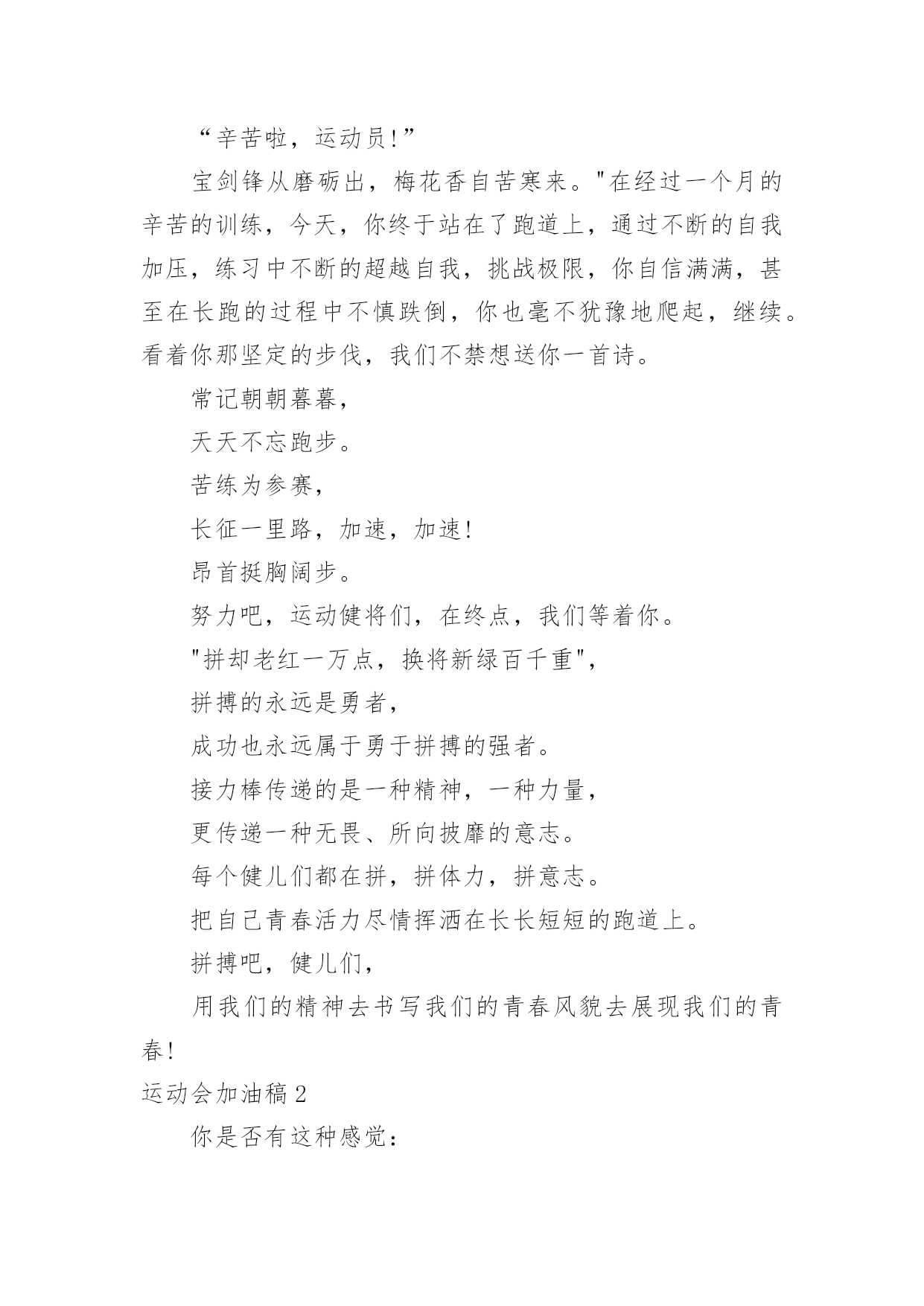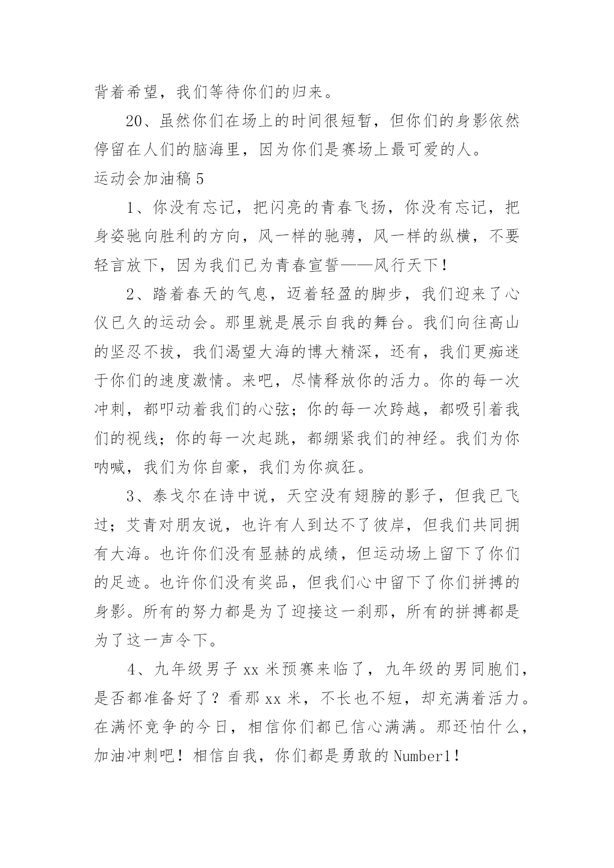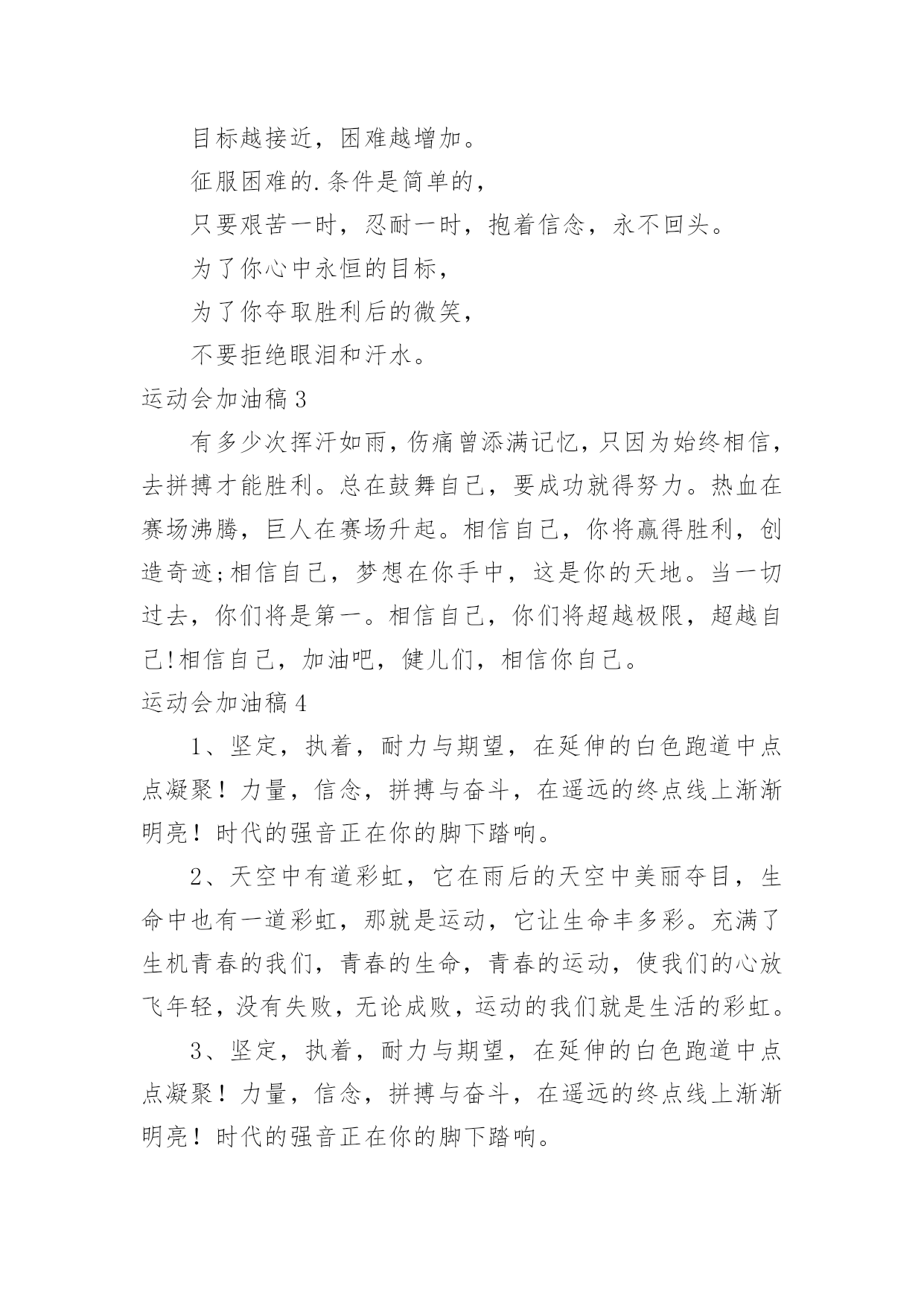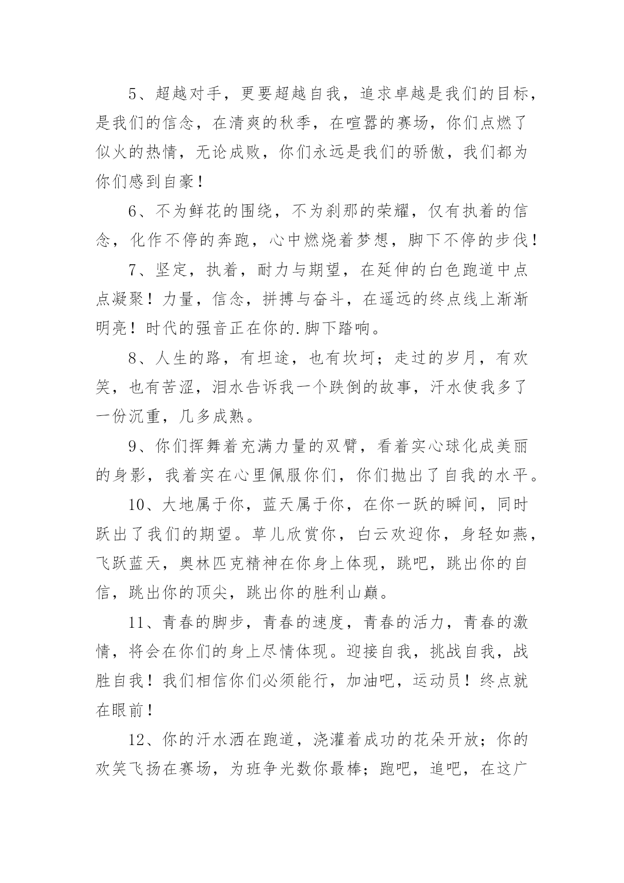 运动会加油稿【精华】运动会加油稿15篇现如今,我们需要用到加油稿的情形越来越多,加油稿是鼓励激励对方的文稿。还是对加油稿一筹莫展吗?下面是小编收集整理的运动会加油稿,仅供参考,欢迎大家阅读。运动会加油稿1朋友,在你走上跑道那一刻,告诉自己,无论成功与否,微笑着跑完全程,只要年轻的心还在不停地跳动,就要大声告诉自己——我无所畏惧。无论成功与否,我们永远铭记这充满奋斗印记的阳光灿烂的日子无论你成功与否,刹那属于你。而你,一定属于永恒!只要你没有遗憾地奋斗了,你就不必失望,你的生命已放出了闪光!成功永远属于每一个勇敢者!我们为你呐喊,力量给你信心给你,因为我们知道那一步步的前进十分勇敢。我们为你呐喊,虽然显得火热,但却希望你能加油。你带来的,是拼搏的精神;你带走的,是悦耳的呐喊;你付出的',是淋漓的汗水;你收获的,是轰鸣的掌声。运动的盛会为你们而召开,观众的掌声为你们而拍响,雄壮的号角为你们而擂起,成功的花朵为你们而芳香!运动会加油稿300字致运动员一个盼望出发,一个盼望到达。烈日骄阳下的奔驰,蓝天白云下的拼搏,总想为你高声呐喊,却怕被天空误解。总想为你放声歌唱,却又怕惊动了白云。把内心最美的祝愿挂在跑道线上,微风中每一次振动是又一次的衷心祝愿。加油吧!胜利源于希望,胜利就在眼前!愿将希望折成一只小船,沿着溪流送到你的身边;愿把鼓励扎成一束清水,满怀微笑地递到你面前;愿将友谊织成一条毛巾,轻轻的拭去你辛苦的汗水;愿让热情燃烧成一片鲜花,献给你,到一声:“辛苦啦,运动员!”宝剑锋从磨砺出,梅花香自苦寒来。"在经过一个月的辛苦的训练,今天,你终于站在了跑道上,通过不断的自我加压,练习中不断的超越自我,挑战极限,你自信满满,甚至在长跑的过程中不慎跌倒,你也毫不犹豫地爬起,继续。看着你那坚定的步伐,我们不禁想送你一首诗。常记朝朝暮暮,天天不忘跑步。苦练为参赛,长征一里路,加速,加速!昂首挺胸阔步。努力吧,运动健将们,在终点,我们等着你。"拼却老红一万点,换将新绿百千重",拼搏的永远是勇者,成功也永远属于勇于拼搏的强者。接力棒传递的是一种精神,一种力量,更传递一种无畏、所向披靡的意志。每个健儿们都在拼,拼体力,拼意志。把自己青春活力尽情挥洒在长长短短的跑道上。拼搏吧,健儿们,用我们的精神去书写我们的青春风貌去展现我们的青春!运动会加油稿2你是否有这种感觉:目标越接近,困难越增加。征服困难的.条件是简单的,只要艰苦一时,忍耐一时,抱着信念,永不回头。为了你心中永恒的目标,为了你夺取胜利后的微笑,不要拒绝眼泪和汗水。运动会加油稿3有多少次挥汗如雨,伤痛曾添满记忆,只因为始终相信,去拼搏才能胜利。总在鼓舞自己,要成功就得努力。热血在赛场沸腾,巨人在赛场升起。相信自己,你将赢得胜利,创造奇迹;相信自己,梦想在你手中,这是你的天地。当一切过去,你们将是第一。相信自己,你们将超越极限,超越自己!相信自己,加油吧,健儿们,相信你自己。运动会加油稿41、坚定,执着,耐力与期望,在延伸的白色跑道中点点凝聚!力量,信念,拼搏与奋斗,在遥远的终点线上渐渐明亮!时代的强音正在你的脚下踏响。2、天空中有道彩虹,它在雨后的天空中美丽夺目,生命中也有一道彩虹,那就是运动,它让生命丰多彩。充满了生机青春的我们,青春的生命,青春的运动,使我们的心放飞年轻,没有失败,无论成败,运动的我们就是生活的彩虹。3、坚定,执着,耐力与期望,在延伸的白色跑道中点点凝聚!力量,信念,拼搏与奋斗,在遥远的终点线上渐渐明亮!时代的强音正在你的脚下踏响。4、一根小小的木棒,连接的是团结和友爱,一根小小的木棒,传递的是勇气和力量,一根小小的木棒,演绎的是奋斗和拼搏。加油吧!让这激动人心的时刻,一直回荡在我们心中!5、漫漫长路,你愿一人独撑,忍受着孤独与寂寞,承受着体力与精神的压迫,只任汗水溶于泪水,可脚步却从不停歇。好样的,纵然得不了桂冠,可坚持的你,定会赢得最终的掌声。6、年轻的我们自信飞扬,青春的气息如同初升的朝阳,蓬勃的力量如同阳光的挥洒。此时此刻,跑道便是我们精彩的舞台,声声加油便是我们的奖项!论何成功,谈何荣辱,心中的信念仅有一个:拼搏!7、此时此刻,虽然脑海里浮想联翩,但我仍然安静地坐在大本营,写着通讯稿,仍然站在场边扯破嗓子地喊"加油"。8、观众席上掌声雷动,热热烈烈划破长空,他们的灵魂在叫,血在烧,都是渴望,有无限的期望,掌声响起来为新的力量喝彩,掌声响起来,每一刻都精彩。9、耳旁传来了啦啦队阵阵催人奋进使人图强的口号鸣笛声,他们不是运动员,却有着比他们更高的活力;他们不是体操队队员,却从训练的一举一动中令人体会出了认真细致;他们不是运动场上的红花,却在绿叶陪衬精神的号召下更加鲜明动人!他们只是青年,有着青年新一代所应具备的朝气蓬勃与奋发向上,有着冬日朝阳不畏严寒冲出冬天的豪迈与