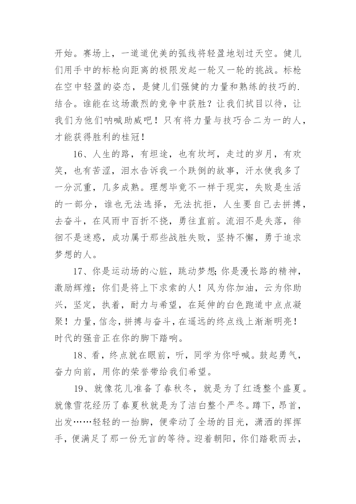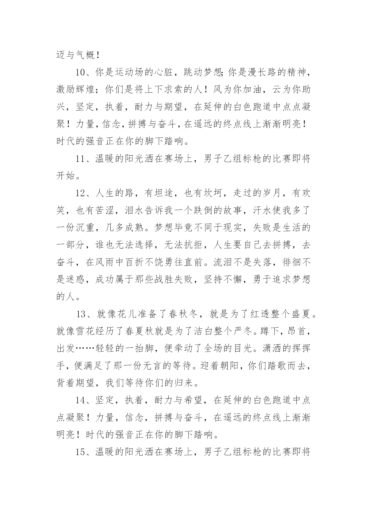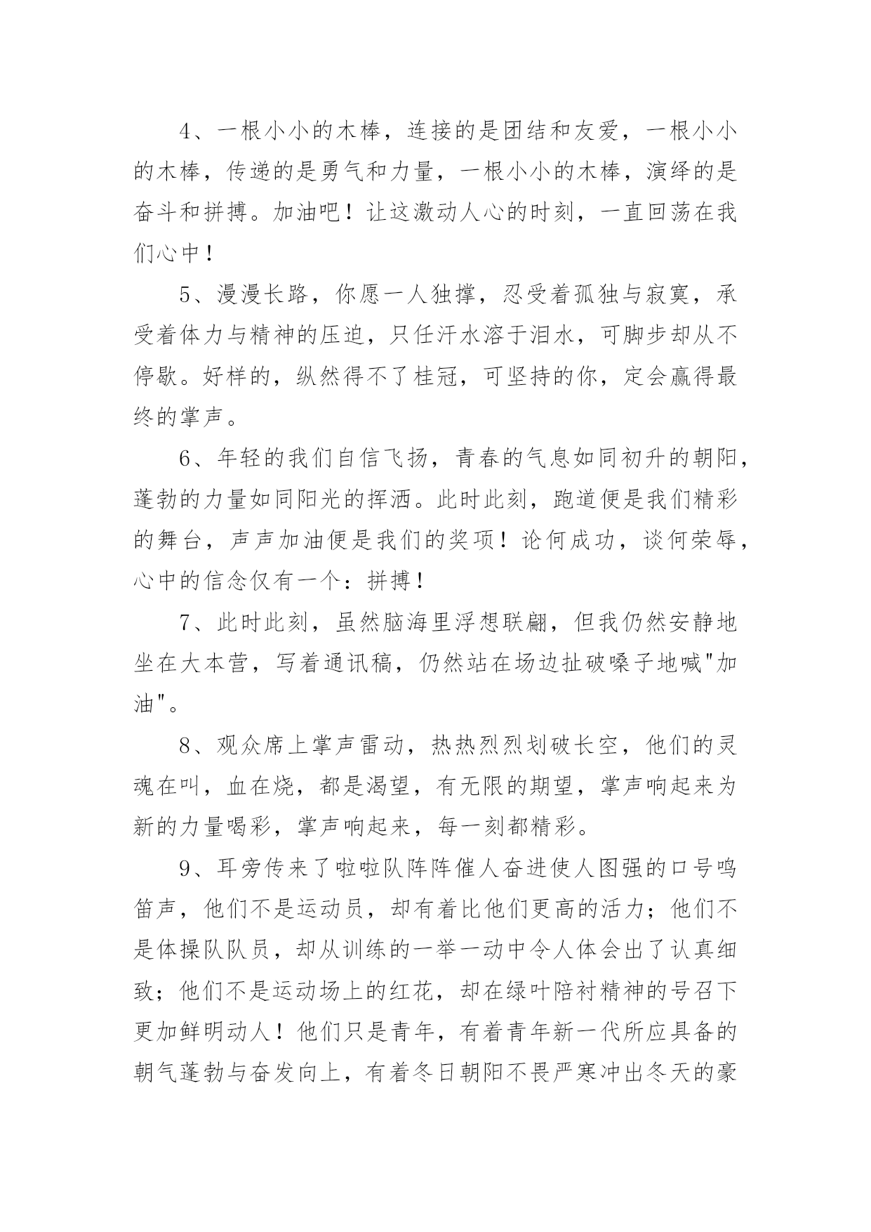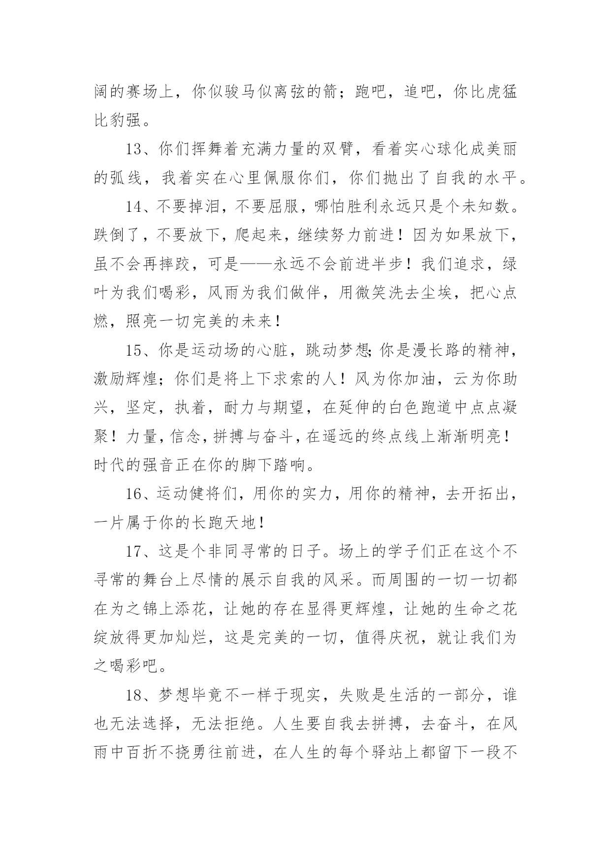 运动会加油稿【精华】运动会加油稿15篇现如今,我们需要用到加油稿的情形越来越多,加油稿是鼓励激励对方的文稿。还是对加油稿一筹莫展吗?下面是小编收集整理的运动会加油稿,仅供参考,欢迎大家阅读。运动会加油稿1朋友,在你走上跑道那一刻,告诉自己,无论成功与否,微笑着跑完全程,只要年轻的心还在不停地跳动,就要大声告诉自己——我无所畏惧。无论成功与否,我们永远铭记这充满奋斗印记的阳光灿烂的日子无论你成功与否,刹那属于你。而你,一定属于永恒!只要你没有遗憾地奋斗了,你就不必失望,你的生命已放出了闪光!成功永远属于每一个勇敢者!我们为你呐喊,力量给你信心给你,因为我们知道那一步步的前进十分勇敢。我们为你呐喊,虽然显得火热,但却希望你能加油。你带来的,是拼搏的精神;你带走的,是悦耳的呐喊;你付出的',是淋漓的汗水;你收获的,是轰鸣的掌声。运动的盛会为你们而召开,观众的掌声为你们而拍响,雄壮的号角为你们而擂起,成功的花朵为你们而芳香!运动会加油稿300字致运动员一个盼望出发,一个盼望到达。烈日骄阳下的奔驰,蓝天白云下的拼搏,总想为你高声呐喊,却怕被天空误解。总想为你放声歌唱,却又怕惊动了白云。把内心最美的祝愿挂在跑道线上,微风中每一次振动是又一次的衷心祝愿。加油吧!胜利源于希望,胜利就在眼前!愿将希望折成一只小船,沿着溪流送到你的身边;愿把鼓励扎成一束清水,满怀微笑地递到你面前;愿将友谊织成一条毛巾,轻轻的拭去你辛苦的汗水;愿让热情燃烧成一片鲜花,献给你,到一声:“辛苦啦,运动员!”宝剑锋从磨砺出,梅花香自苦寒来。"在经过一个月的辛苦的训练,今天,你终于站在了跑道上,通过不断的自我加压,练习中不断的超越自我,挑战极限,你自信满满,甚至在长跑的过程中不慎跌倒,你也毫不犹豫地爬起,继续。看着你那坚定的步伐,我们不禁想送你一首诗。常记朝朝暮暮,天天不忘跑步。苦练为参赛,长征一里路,加速,加速!昂首挺胸阔步。努力吧,运动健将们,在终点,我们等着你。"拼却老红一万点,换将新绿百千重",拼搏的永远是勇者,成功也永远属于勇于拼搏的强者。接力棒传递的是一种精神,一种力量,更传递一种无畏、所向披靡的意志。每个健儿们都在拼,拼体力,拼意志。把自己青春活力尽情挥洒在长长短短的跑道上。拼搏吧,健儿们,用我们的精神去书写我们的青春风貌去展现我们的青春!运动会加油稿2你是否有这种感觉:目标越接近,困难越增加。征服困难的.条件是简单的,只要艰苦一时,忍耐一时,抱着信念,永不回头。为了你心中永恒的目标,为了你夺取胜利后的微笑,不要拒绝眼泪和汗水。运动会加油稿3有多少次挥汗如雨,伤痛曾添满记忆,只因为始终相信,去拼搏才能胜利。总在鼓舞自己,要成功就得努力。热血在赛场沸腾,巨人在赛场升起。相信自己,你将赢得胜利,创造奇迹;相信自己,梦想在你手中,这是你的天地。当一切过去,你们将是第一。相信自己,你们将超越极限,超越自己!相信自己,加油吧,健儿们,相信你自己。运动会加油稿41、坚定,执着,耐力与期望,在延伸的白色跑道中点点凝聚!力量,信念,拼搏与奋斗,在遥远的终点线上渐渐明亮!时代的强音正在你的脚下踏响。2、天空中有道彩虹,它在雨后的天空中美丽夺目,生命中也有一道彩虹,那就是运动,它让生命丰多彩。充满了生机青春的我们,青春的生命,青春的运动,使我们的心放飞年轻,没有失败,无论成败,运动的我们就是生活的彩虹。3、坚定,执着,耐力与期望,在延伸的白色跑道中点点凝聚!力量,信念,拼搏与奋斗,在遥远的终点线上渐渐明亮!时代的强音正在你的脚下踏响。4、一根小小的木棒,连接的是团结和友爱,一根小小的木棒,传递的是勇气和力量,一根小小的木棒,演绎的是奋斗和拼搏。加油吧!让这激动人心的时刻,一直回荡在我们心中!5、漫漫长路,你愿一人独撑,忍受着孤独与寂寞,承受着体力与精神的压迫,只任汗水溶于泪水,可脚步却从不停歇。好样的,纵然得不了桂冠,可坚持的你,定会赢得最终的掌声。6、年轻的我们自信飞扬,青春的气息如同初升的朝阳,蓬勃的力量如同阳光的挥洒。此时此刻,跑道便是我们精彩的舞台,声声加油便是我们的奖项!论何成功,谈何荣辱,心中的信念仅有一个:拼搏!7、此时此刻,虽然脑海里浮想联翩,但我仍然安静地坐在大本营,写着通讯稿,仍然站在场边扯破嗓子地喊"加油"。8、观众席上掌声雷动,热热烈烈划破长空,他们的灵魂在叫,血在烧,都是渴望,有无限的期望,掌声响起来为新的力量喝彩,掌声响起来,每一刻都精彩。9、耳旁传来了啦啦队阵阵催人奋进使人图强的口号鸣笛声,他们不是运动员,却有着比他们更高的活力;他们不是体操队队员,却从训练的一举一动中令人体会出了认真细致;他们不是运动场上的红花,却在绿叶陪衬精神的号召下更加鲜明动人!他们只是青年,有着青年新一代所应具备的朝气蓬勃与奋发向上,有着冬日朝阳不畏严寒冲出冬天的豪迈与