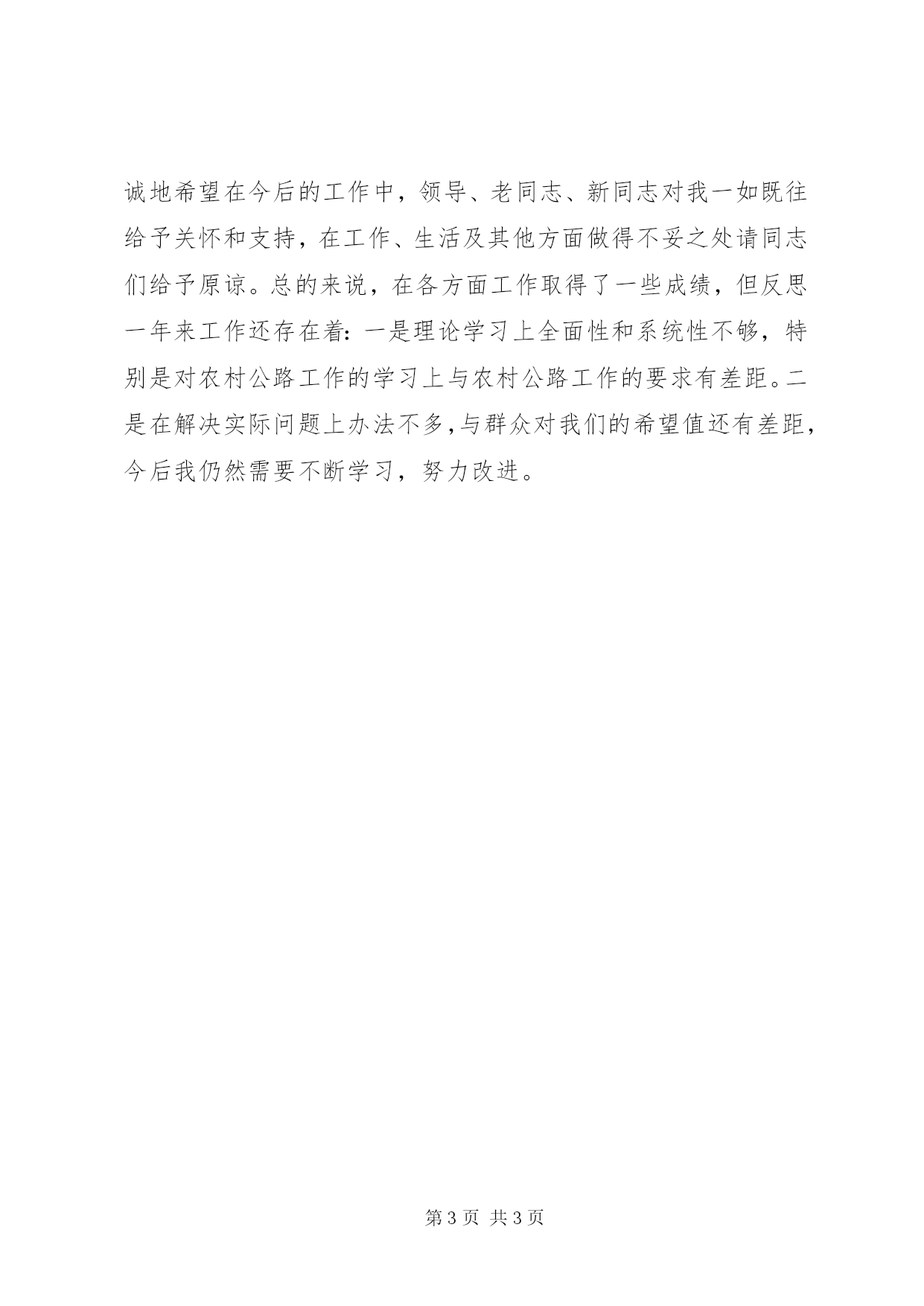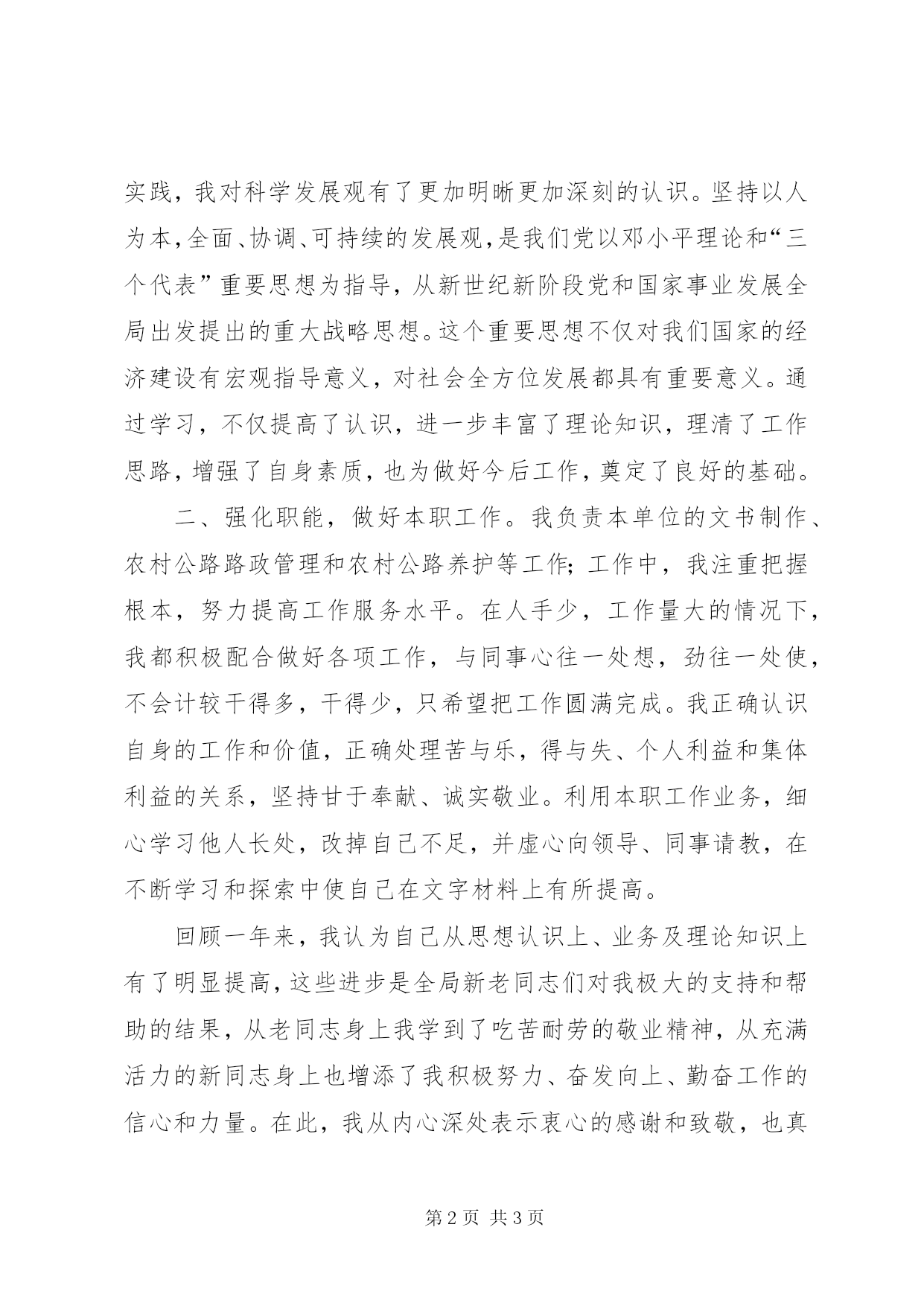 第PAGE\*Arabic\*MERGEFORMAT3页共NUMPAGES\*MERGEFORMAT3页交通局个人工作总结2011年在领导和全体同志的关怀、帮助、支持下,紧紧围绕中心工作,充分发挥岗位职能,不断改进工作方法,提高工作效率,以“服从领导、团结同志、认真学习、扎实工作”为准则,始终坚持高标准、严要求,较好地完成了各项工作任务。我始终把学习放在重要位置,努力在提高自身综合素质上下功夫。在政治学习方面,通过学习邓小平理论及“三个代表”、胡总书记的“科学发展观”的重要思想,尤其是学习十七大精神和十七届三中全会精神,进一步增强了党性,提高了自己政治洞察力,牢固树立了全心全意为人民服务的宗旨和正确的世界观、人生观、价值观。一年来,在局党委政府的正确领导下,在所的支持帮助下,我发挥自身特长,认真做好农村公路工作,积极为民办事,努力在政府和农民间架起贴心的桥梁,取得了一些成绩,经受了基层锻炼,收获良多,感触良多。1年来,我主要的工作职责是配合单位共同来完成全年各项建设工作目标,做好上情下达,将上级及领导指示及会议精神及时传达贯彻,对出现的问题及时整理和上报,完成局党委、本单位需写的文字材料,完成上级部门交办的各项工作和任务。现将一年来的工作情况总结如下:一、抓学习、强自身。针对自已的工作特点,主要学习党的各种全会精神,中央1号文件,政策法规的学习,参加专家辅导专题学习。自觉深入学习实践科学发展观;通过认真学习,深入实践,我对科学发展观有了更加明晰更加深刻的认识。坚持以人为本,全面、协调、可持续的发展观,是我们党以邓小平理论和“三个代表”重要思想为指导,从新世纪新阶段党和国家事业发展全局出发提出的重大战略思想。这个重要思想不仅对我们国家的经济建设有宏观指导意义,对社会全方位发展都具有重要意义。通过学习,不仅提高了认识,进一步丰富了理论知识,理清了工作思路,增强了自身素质,也为做好今后工作,奠定了良好的基础。二、强化职能,做好本职工作。我负责本单位的文书制作、农村公路路政管理和农村公路养护等工作;工作中,我注重把握根本,努力提高工作服务水平。在人手少,工作量大的情况下,我都积极配合做好各项工作,与同事心往一处想,劲往一处使,不会计较干得多,干得少,只希望把工作圆满完成。我正确认识自身的工作和价值,正确处理苦与乐,得与失、个人利益和集体利益的关系,坚持甘于奉献、诚实敬业。利用本职工作业务,细心学习他人长处,改掉自己不足,并虚心向领导、同事请教,在不断学习和探索中使自己在文字材料上有所提高。回顾一年来,我认为自己从思想认识上、业务及理论知识上有了明显提高,这些进步是全局新老同志们对我极大的支持和帮助的结果,从老同志身上我学到了吃苦耐劳的敬业精神,从充满活力的新同志身上也增添了我积极努力、奋发向上、勤奋工作的信心和力量。在此,我从内心深处表示衷心的感谢和致敬,也真诚地希望在今后的工作中,领导、老同志、新同志对我一如既往给予关怀和支持,在工作、生活及其他方面做得不妥之处请同志们给予原谅。总的来说,在各方面工作取得了一些成绩,但反思一年来工作还存在着:一是理论学习上全面性和系统性不够,特别是对农村公路工作的学习上与农村公路工作的要求有差距。二是在解决实际问题上办法不多,与群众对我们的希望值还有差距,今后我仍然需要不断学习,努力改进。