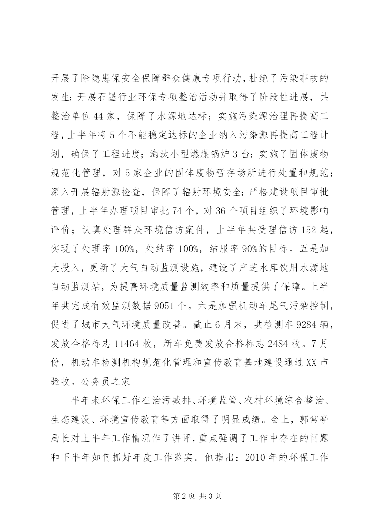 第PAGE\*Arabic\*MERGEFORMAT3页共NUMPAGES\*MERGEFORMAT3页市环保局半年工作汇总7月22日,XX县区环保局召开全局会议,对上半年工作进行了总结,安排部署了下半年工作。会议由郭常亭局长主持,各室、站、队汇报了半年来的工作状态和工作业绩,两名先进个人代表做了表态发言。半年来,该局紧紧围绕生态城市建设,实现率先发展、科学发展、和谐发展这一目标,强化职能,依法行政,环保工作取得了新的进展。一是加大流域治理力度,确保了河流断面水质达标。二是多措并举,稳步推进排污总量削减。(一)抓源头,严格控制污染物排放增量。上半年拒批不符合环保要求的项目6个;(二)抓减排工程建设,削减污染物存量。(三)加强环境监管执法,确保了污染减排效果。目前为止,排污总量削减目标、措施落实到位,减排工程进展顺利。三是加强农村环境保护,环境创建工作取得新进展。先后完成李权庄、南墅两个镇2010年度中央农村环保专项资金的申报工作;落实了秸秆禁烧工作措施和强制性清洁生产计划方案;持续开展环境环境优美镇创建工作,上半年三个镇通过了省级环境优美镇验收;继续深化环境友好创建工作,经济开发区、李权庄泰光小学、水集中心小学分别获得省绿色社区和绿色学校命名。四是管治并举,污染控制工作取得新成效。加强污染源监督监察,开展了除隐患保安全保障群众健康专项行动,杜绝了污染事故的发生;开展石墨行业环保专项整治活动并取得了阶段性进展,共整治单位44家,保障了水源地达标;实施污染源治理再提高工程,上半年将5个不能稳定达标的企业纳入污染源再提高工程计划,确保了工程进度;淘汰小型燃煤锅炉3台;实施了固体废物规范化管理,对5家企业的固体废物暂存场所进行处置和规范;深入开展辐射源检查,保障了辐射环境安全;严格建设项目审批管理,上半年办理项目审批74个,对36个项目组织了环境影响评价;认真处理群众环境信访案件,上半年共受理信访152起,实现了处理率100%,处结率100%,结服率90%的目标。五是加大投入,更新了大气自动监测设施,建设了产芝水库饮用水源地自动监测站,为提高环境质量监测效率和质量提供了保障。上半年共完成有效监测数据9051个。六是加强机动车尾气污染控制,促进了城市大气环境质量改善。截止6月末,共检测车9284辆,发放合格标志11464枚,新车免费发放合格标志2484枚。7月份,机动车检测机构规范化管理和宣传教育基地建设通过XX市验收。公务员之家半年来环保工作在治污减排、环境监管、农村环境综合整治、生态建设、环境宣传教育等方面取得了明显成绩。会上,郭常亭局长对上半年工作情况作了讲评,重点强调了工作中存在的问题和下半年如何抓好年度工作落实。他指出:2010年的环保工作在深度和广度上都有了新的成就。在取得成绩的同时,要认识到不足。要继续抓好队伍建设和业务素质提升,抓好重点工作的追踪服务和责任落实。各科室要从全局的角度按照职责分工安排部署好本职工作,力争实现新的突破。