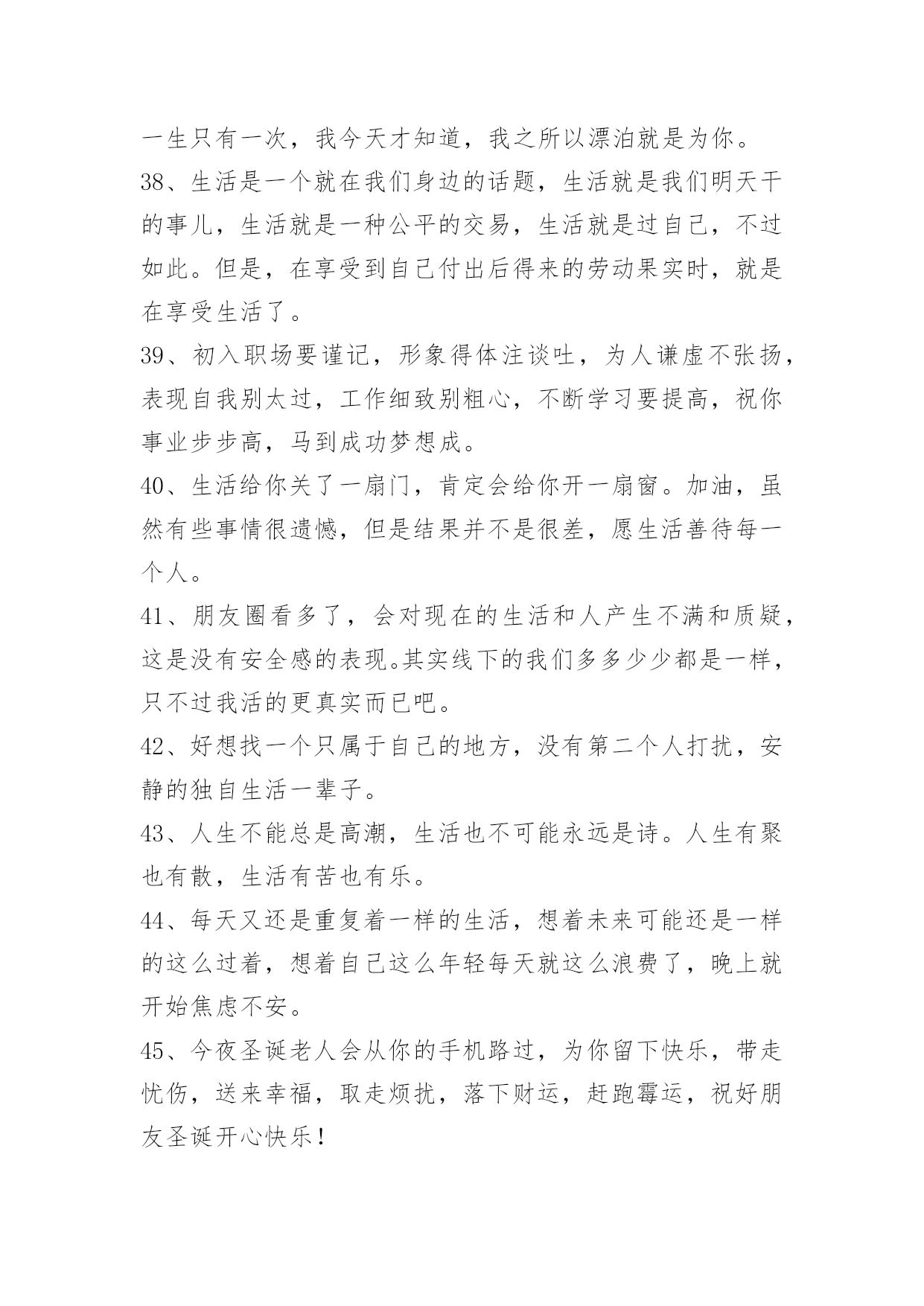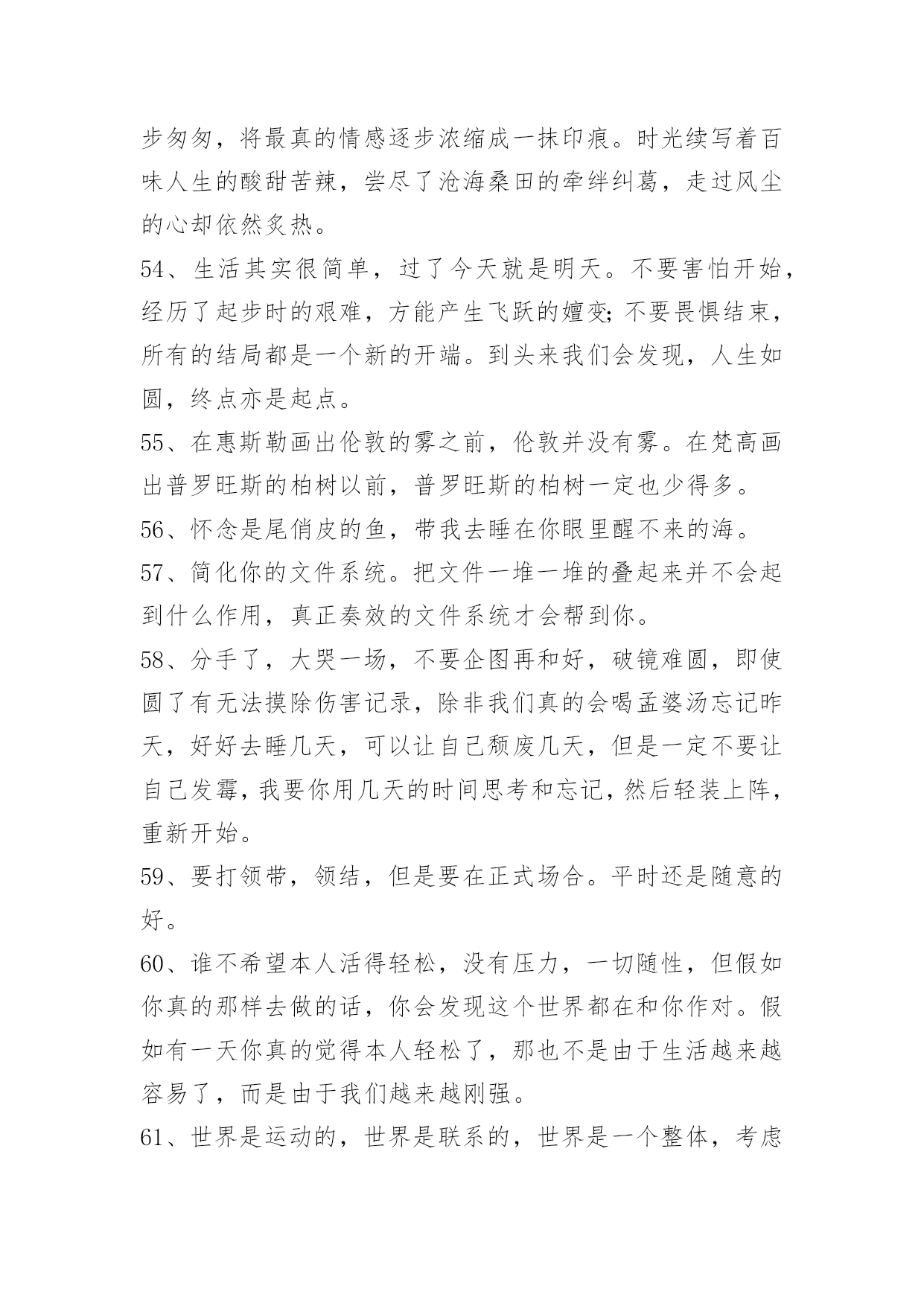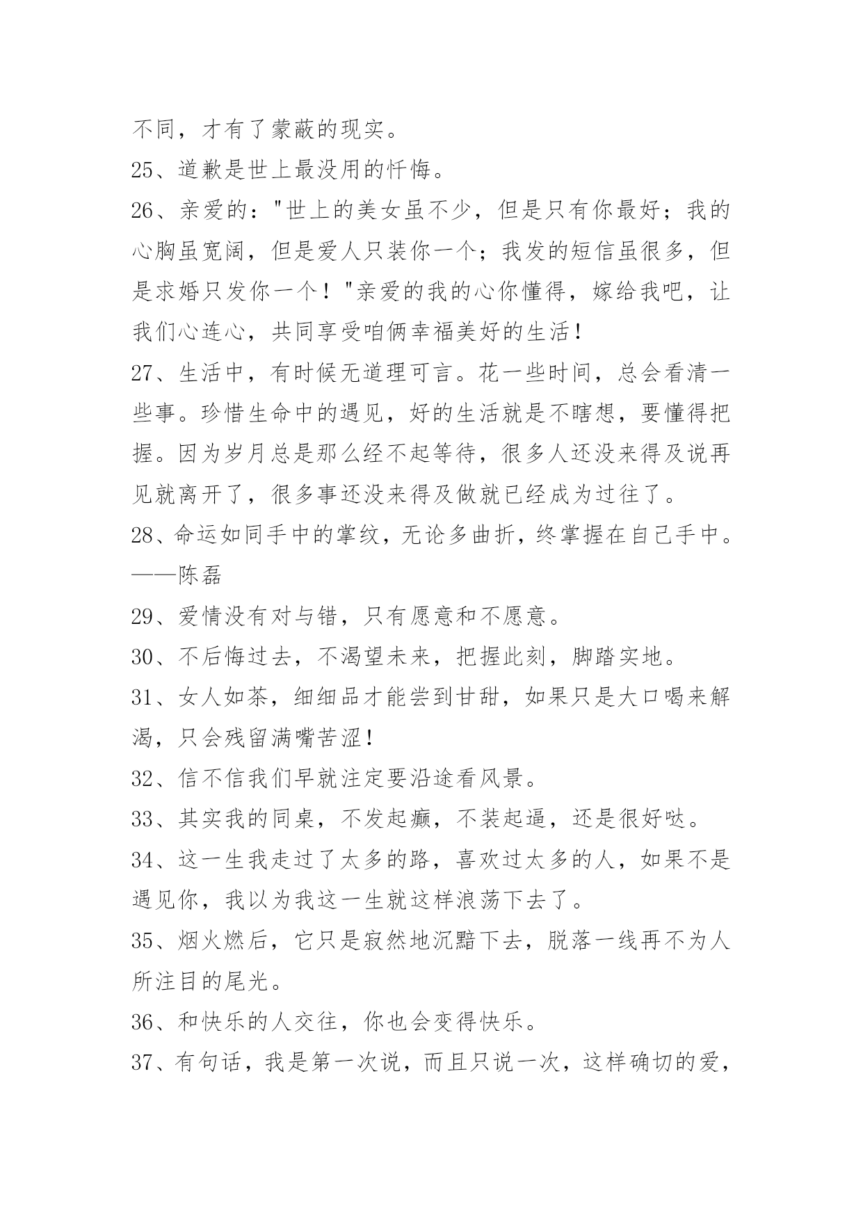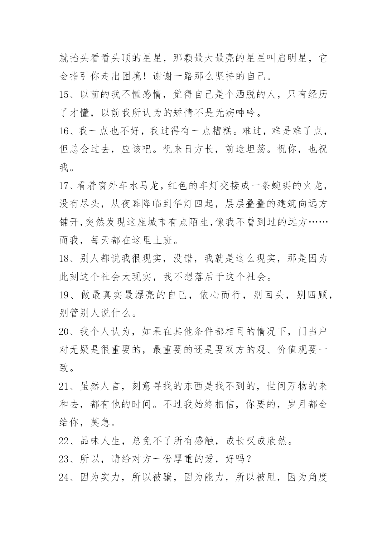 生活说说语录生活说说语录大全(通用110句)人生只要走出来的美丽,没有等出来的辉煌。这篇文章是小编特意为各位读者准备的生活说说语录,感兴趣的一起来看看吧。1、人生不要过于追求浮躁的虚渺,不现实的东西往往都像一缕云烟转瞬即散。生活不要染入太多的戏曲性,我们既没有随时更换的轻粉桃装,也不一定能唱好曼袅的拖腔。生活需要一份面对面的真,一份脚踏实地的纯。给自己一份舒畅的心情,给他人一抹阳光的笑意,也是给予生命的尊重。2、我们在各自的世界改变,与彼此无关。3、总是有一种神秘的力量在推动我们追求更高的理想,这种神秘的力量就是进取心。人生的追求是一条永无止境的长河,进取心这种内在的推动力从不允许我们停下来,它总是激励着我们为了更加美好的明天去努力。4、能遇心爱的人,是多么幸运的事。为何不紧握着他的手呢。一辈子只爱一个人,并不丢人。心里明明知道,除了他外还会有更优秀的人出现,可是一个人不能这么贪心的。一颗心需要另一颗心坦诚相待,这样才可以幸福。5、咱们每个人都生活在各自的过去中,人们会用一分钟的时刻去认识一个人,用一小时的时刻去喜欢一个人,再用一天的时刻去爱上一个人,到最后呢,却要用一辈子的时刻去忘记一个人。6、我再也没有给你留过言,再也没有主动找过你,再也没有给你打过电话,再也没有给你发过短信,看见你只会擦肩而过微微一笑,甚至当作路人笑都不笑,不是我装清高不食人间烟火,而是你错,过了当初认真的我。7、抚一曲丝弦,静静倾听;葱茏岁月,默默感悟,悠然前行。8、生命在时光中流逝,要自在、洒脱地活着。9、生活教会我人终究要向现实低头。10、优雅的人生,淡而有味。我们的生命犹如一柱燃香:过去的都过去了,快乐或痛苦,如烧至尽头的香灰,终会落下。人生无常,人心善变,何必为那些是非恩怨纠结?看淡了,是是非非也就无所谓了;放下了,成败得失也就那么回事了。人间三千事,淡然一笑间。面对人生种种境遇,一笑而过,是一种人生的优雅。11、不要轻视失败者的劝告,她在不应该做什么的问题上是权威。12、一个人也可以很好的也可以不再感觉孤独孤独大概是那些无感的事情躲避而来的吧。13、你说人生来就是孤独,当时不明白,现在懂了。各自寻找吧。总归一个人,我再也不为谁改变了,他会喜欢我的,他会来的。14、只身一人,走在最初一直坚持的路上,这一路走来不管发生什么都一个人默默坚持,只因当初有一人说过,难过了就抬头看看头顶的星星,那颗最大最亮的星星叫启明星,它会指引你走出困境!谢谢一路那么坚持的自己。15、以前的我不懂感情,觉得自己是个洒脱的人,只有经历了才懂,以前我所认为的矫情不是无病呻吟。16、我一点也不好,我过得有一点糟糕。难过,难是难了点,但总会过去,应该吧。祝来日方长,前途坦荡。祝你,也祝我。17、看着窗外车水马龙,红色的车灯交接成一条蜿蜒的火龙,没有尽头,从夜幕降临到华灯四起,层层叠叠的建筑向远方铺开,突然发现这座城市有点陌生,像我不曾到过的远方……而我,每天都在这里上班。18、别人都说我很现实,没错,我就是这么现实,那是因为此刻这个社会太现实,我不想落后于这个社会。19、做最真实最漂亮的自己,依心而行,别回头,别四顾,别管别人说什么。20、我个人认为,如果在其他条件都相同的情况下,门当户对无疑是很重要的,最重要的还是要双方的观、价值观要一致。21、虽然人言,刻意寻找的东西是找不到的,世间万物的来和去,都有他的时间。不过我始终相信,你要的,岁月都会给你,莫急。22、品味人生,总免不了所有感触,或长叹或欣然。23、所以,请给对方一份厚重的爱,好吗?24、因为实力,所以被骗,因为能力,所以被甩,因为角度不同,才有了蒙蔽的现实。25、道歉是世上最没用的忏悔。26、亲爱的:"世上的美女虽不少,但是只有你最好;我的心胸虽宽阔,但是爱人只装你一个;我发的短信虽很多,但是求婚只发你一个!"亲爱的我的心你懂得,嫁给我吧,让我们心连心,共同享受咱俩幸福美好的生活!27、生活中,有时候无道理可言。花一些时间,总会看清一些事。珍惜生命中的遇见,好的生活就是不瞎想,要懂得把握。因为岁月总是那么经不起等待,很多人还没来得及说再见就离开了,很多事还没来得及做就已经成为过往了。28、命运如同手中的掌纹,无论多曲折,终掌握在自己手中。——陈磊29、爱情没有对与错,只有愿意和不愿意。30、不后悔过去,不渴望未来,把握此刻,脚踏实地。31、女人如茶,细细品才能尝到甘甜,如果只是大口喝来解渴,只会残留满嘴苦涩!32、信不信我们早就注定要沿途看风景。33、其实我的同桌,不发起癫,不装起逼,还是很好哒。34、这一生我走过了太多的路,喜欢过太多的人,如果不是遇见你,我以为我这一生就这样浪荡下去了。35、烟火燃后,它只是寂然地沉黯下去,脱落一线再不为人所注目的尾光。36、和快乐的人交往,你也会变得快乐。37、有句话,我