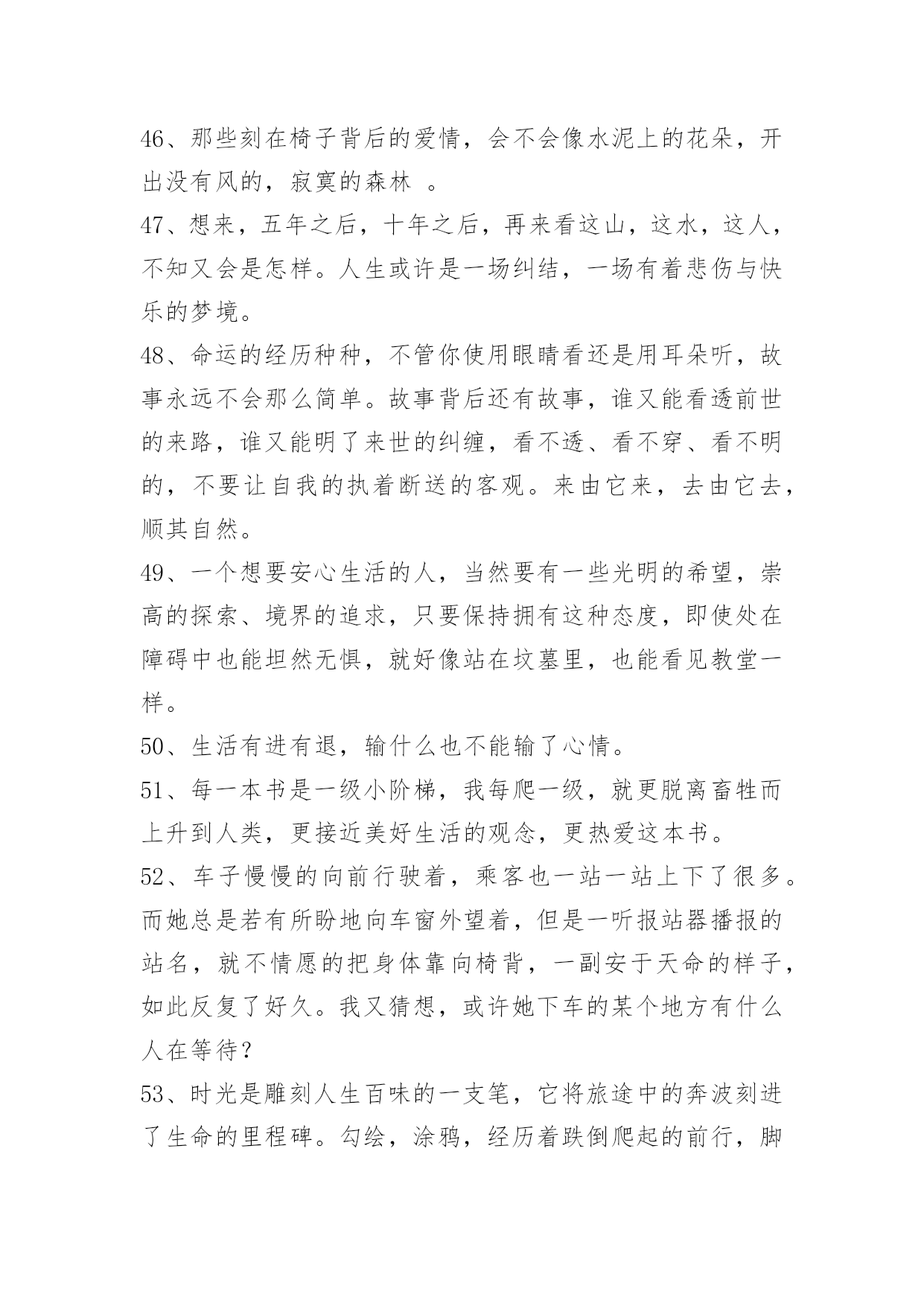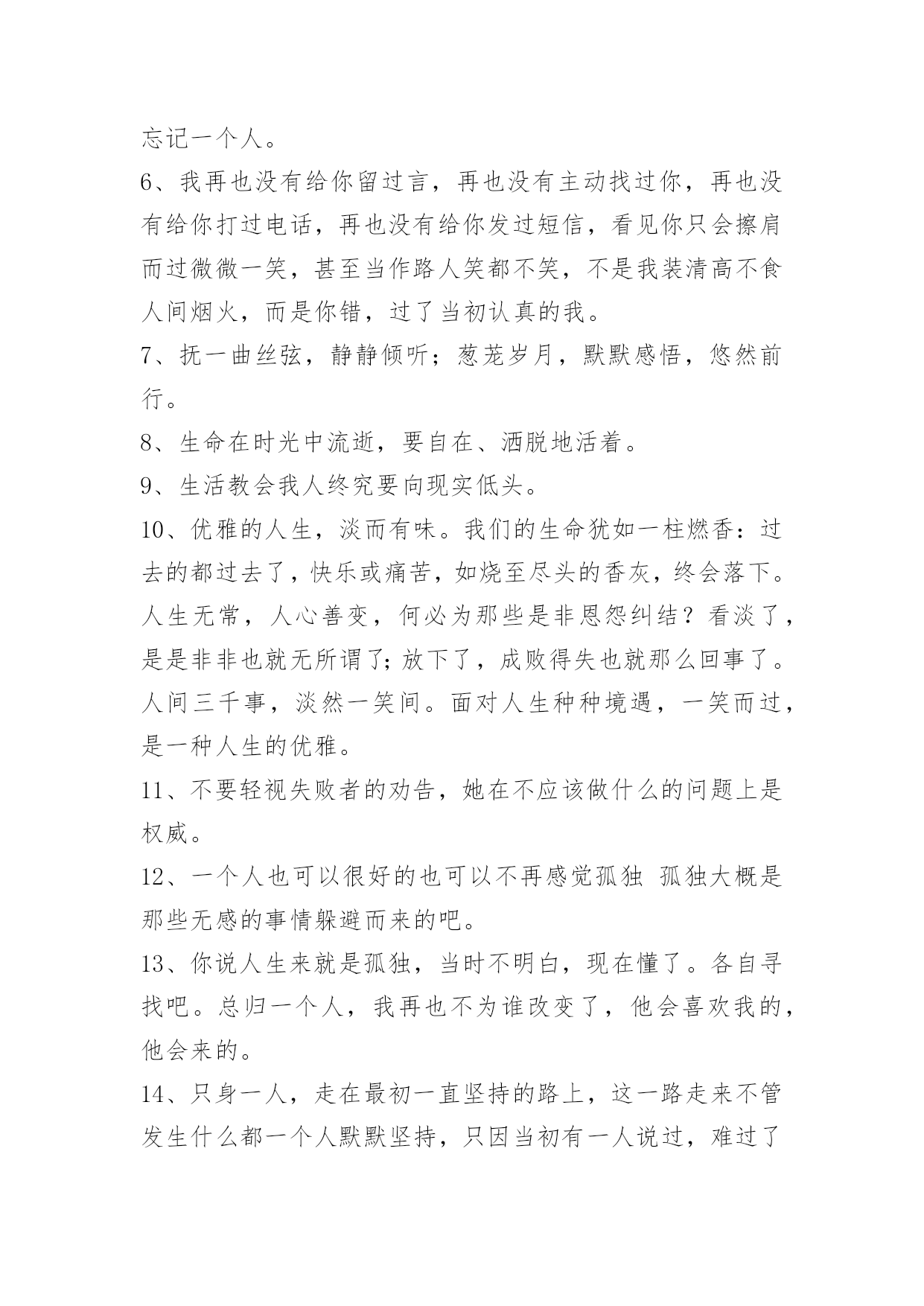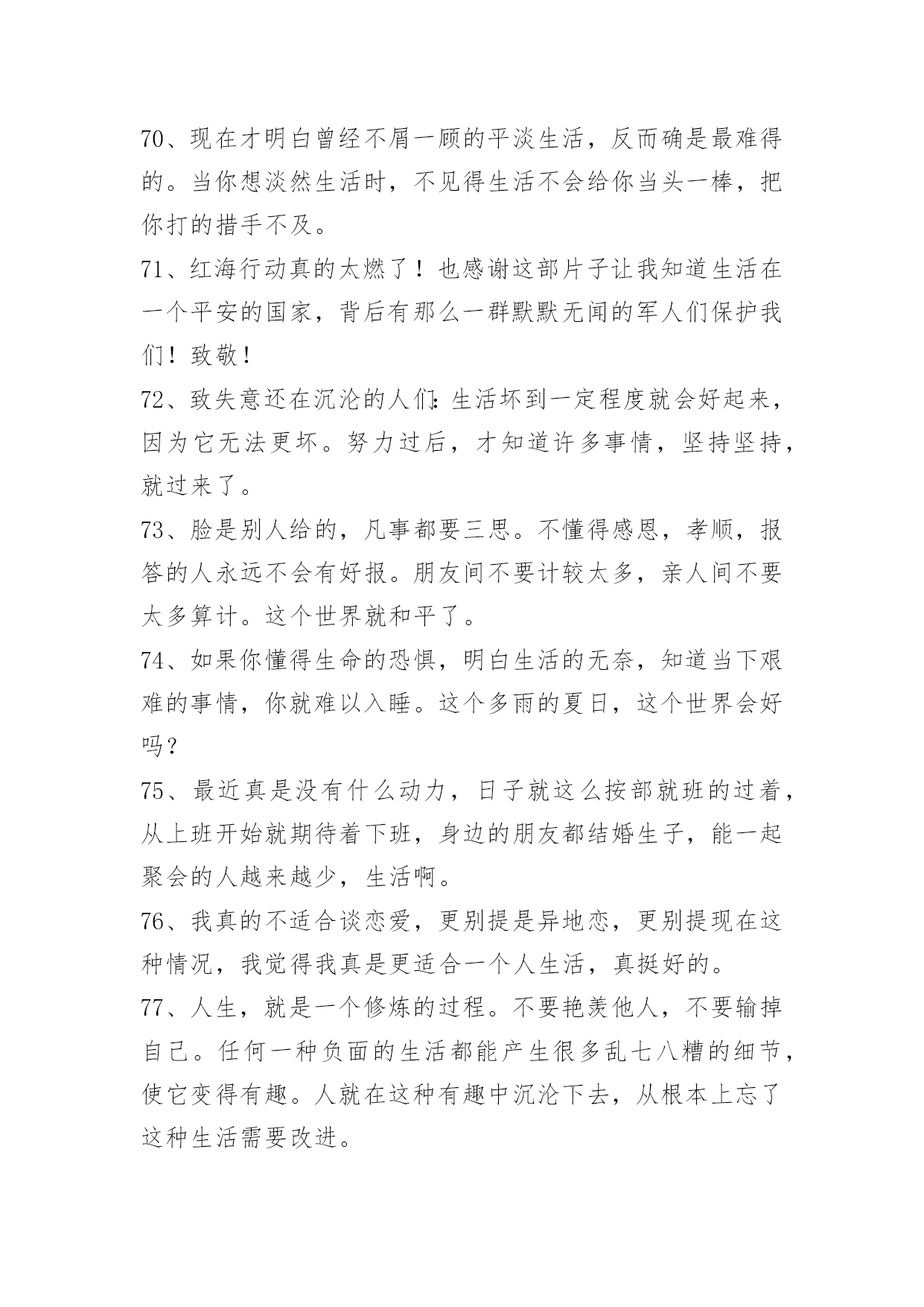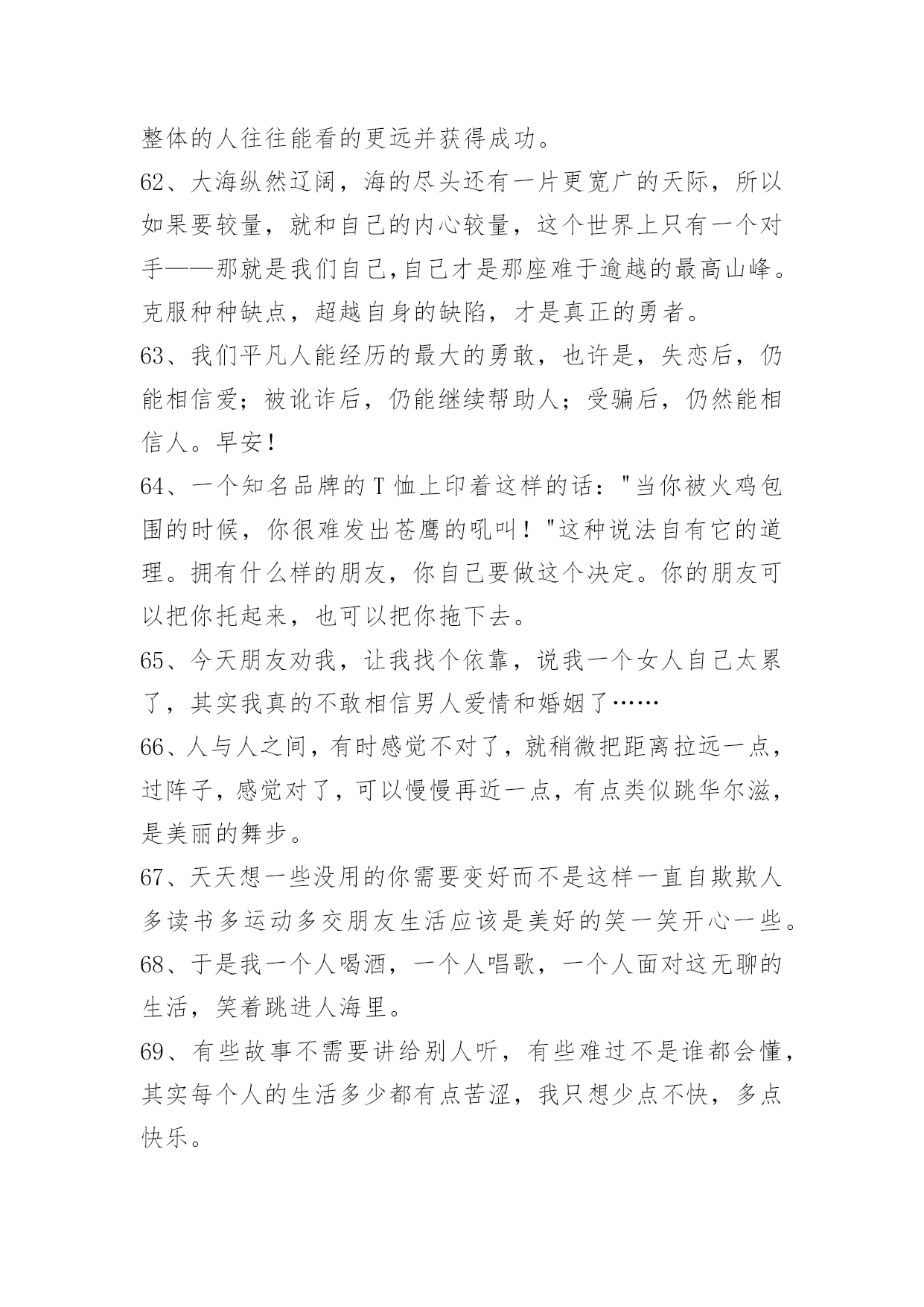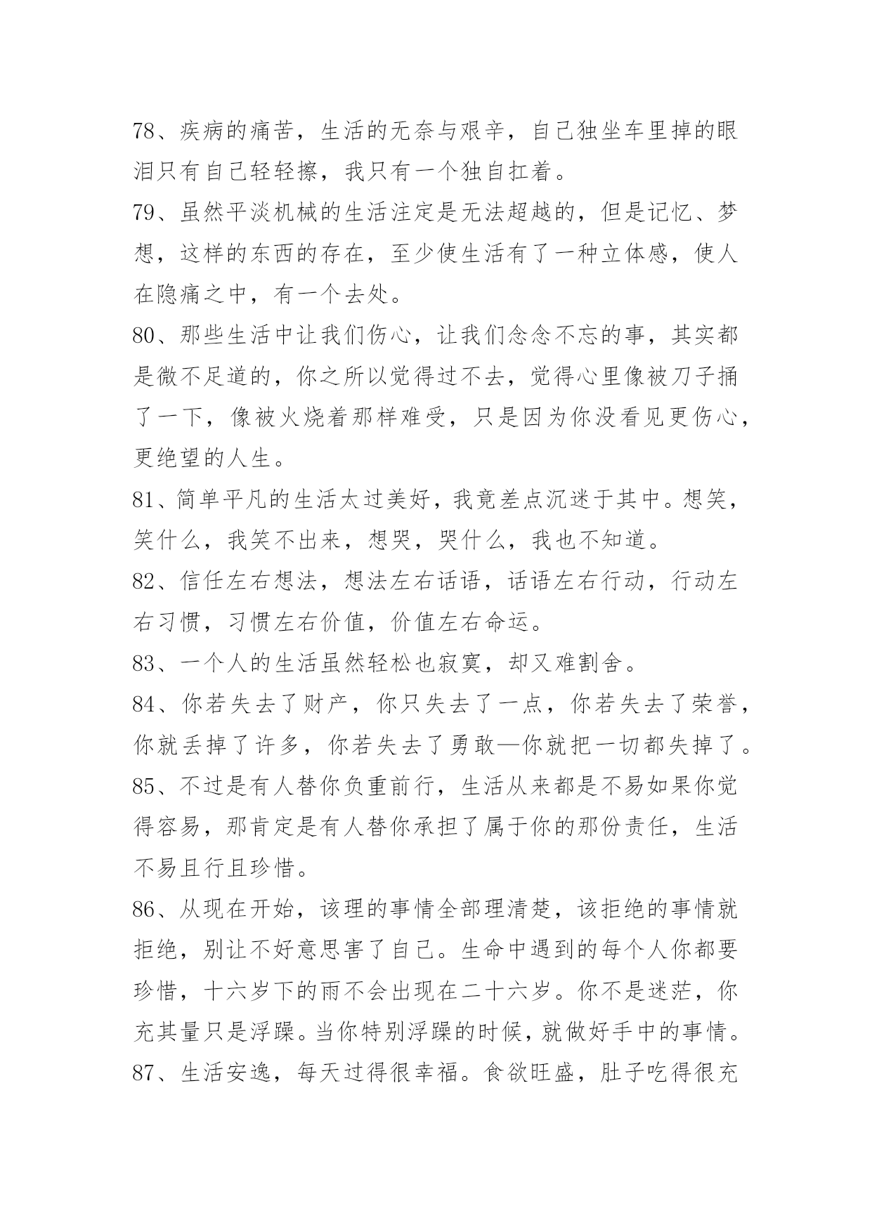 生活说说语录生活说说语录大全(通用110句)人生只要走出来的美丽,没有等出来的辉煌。这篇文章是小编特意为各位读者准备的生活说说语录,感兴趣的一起来看看吧。1、人生不要过于追求浮躁的虚渺,不现实的东西往往都像一缕云烟转瞬即散。生活不要染入太多的戏曲性,我们既没有随时更换的轻粉桃装,也不一定能唱好曼袅的拖腔。生活需要一份面对面的真,一份脚踏实地的纯。给自己一份舒畅的心情,给他人一抹阳光的笑意,也是给予生命的尊重。2、我们在各自的世界改变,与彼此无关。3、总是有一种神秘的力量在推动我们追求更高的理想,这种神秘的力量就是进取心。人生的追求是一条永无止境的长河,进取心这种内在的推动力从不允许我们停下来,它总是激励着我们为了更加美好的明天去努力。4、能遇心爱的人,是多么幸运的事。为何不紧握着他的手呢。一辈子只爱一个人,并不丢人。心里明明知道,除了他外还会有更优秀的人出现,可是一个人不能这么贪心的。一颗心需要另一颗心坦诚相待,这样才可以幸福。5、咱们每个人都生活在各自的过去中,人们会用一分钟的时刻去认识一个人,用一小时的时刻去喜欢一个人,再用一天的时刻去爱上一个人,到最后呢,却要用一辈子的时刻去忘记一个人。6、我再也没有给你留过言,再也没有主动找过你,再也没有给你打过电话,再也没有给你发过短信,看见你只会擦肩而过微微一笑,甚至当作路人笑都不笑,不是我装清高不食人间烟火,而是你错,过了当初认真的我。7、抚一曲丝弦,静静倾听;葱茏岁月,默默感悟,悠然前行。8、生命在时光中流逝,要自在、洒脱地活着。9、生活教会我人终究要向现实低头。10、优雅的人生,淡而有味。我们的生命犹如一柱燃香:过去的都过去了,快乐或痛苦,如烧至尽头的香灰,终会落下。人生无常,人心善变,何必为那些是非恩怨纠结?看淡了,是是非非也就无所谓了;放下了,成败得失也就那么回事了。人间三千事,淡然一笑间。面对人生种种境遇,一笑而过,是一种人生的优雅。11、不要轻视失败者的劝告,她在不应该做什么的问题上是权威。12、一个人也可以很好的也可以不再感觉孤独孤独大概是那些无感的事情躲避而来的吧。13、你说人生来就是孤独,当时不明白,现在懂了。各自寻找吧。总归一个人,我再也不为谁改变了,他会喜欢我的,他会来的。14、只身一人,走在最初一直坚持的路上,这一路走来不管发生什么都一个人默默坚持,只因当初有一人说过,难过了就抬头看看头顶的星星,那颗最大最亮的星星叫启明星,它会指引你走出困境!谢谢一路那么坚持的自己。15、以前的我不懂感情,觉得自己是个洒脱的人,只有经历了才懂,以前我所认为的矫情不是无病呻吟。16、我一点也不好,我过得有一点糟糕。难过,难是难了点,但总会过去,应该吧。祝来日方长,前途坦荡。祝你,也祝我。17、看着窗外车水马龙,红色的车灯交接成一条蜿蜒的火龙,没有尽头,从夜幕降临到华灯四起,层层叠叠的建筑向远方铺开,突然发现这座城市有点陌生,像我不曾到过的远方……而我,每天都在这里上班。18、别人都说我很现实,没错,我就是这么现实,那是因为此刻这个社会太现实,我不想落后于这个社会。19、做最真实最漂亮的自己,依心而行,别回头,别四顾,别管别人说什么。20、我个人认为,如果在其他条件都相同的情况下,门当户对无疑是很重要的,最重要的还是要双方的观、价值观要一致。21、虽然人言,刻意寻找的东西是找不到的,世间万物的来和去,都有他的时间。不过我始终相信,你要的,岁月都会给你,莫急。22、品味人生,总免不了所有感触,或长叹或欣然。23、所以,请给对方一份厚重的爱,好吗?24、因为实力,所以被骗,因为能力,所以被甩,因为角度不同,才有了蒙蔽的现实。25、道歉是世上最没用的忏悔。26、亲爱的:"世上的美女虽不少,但是只有你最好;我的心胸虽宽阔,但是爱人只装你一个;我发的短信虽很多,但是求婚只发你一个!"亲爱的我的心你懂得,嫁给我吧,让我们心连心,共同享受咱俩幸福美好的生活!27、生活中,有时候无道理可言。花一些时间,总会看清一些事。珍惜生命中的遇见,好的生活就是不瞎想,要懂得把握。因为岁月总是那么经不起等待,很多人还没来得及说再见就离开了,很多事还没来得及做就已经成为过往了。28、命运如同手中的掌纹,无论多曲折,终掌握在自己手中。——陈磊29、爱情没有对与错,只有愿意和不愿意。30、不后悔过去,不渴望未来,把握此刻,脚踏实地。31、女人如茶,细细品才能尝到甘甜,如果只是大口喝来解渴,只会残留满嘴苦涩!32、信不信我们早就注定要沿途看风景。33、其实我的同桌,不发起癫,不装起逼,还是很好哒。34、这一生我走过了太多的路,喜欢过太多的人,如果不是遇见你,我以为我这一生就这样浪荡下去了。35、烟火燃后,它只是寂然地沉黯下去,脱落一线再不为人所注目的尾光。36、和快乐的人交往,你也会变得快乐。37、有句话,我