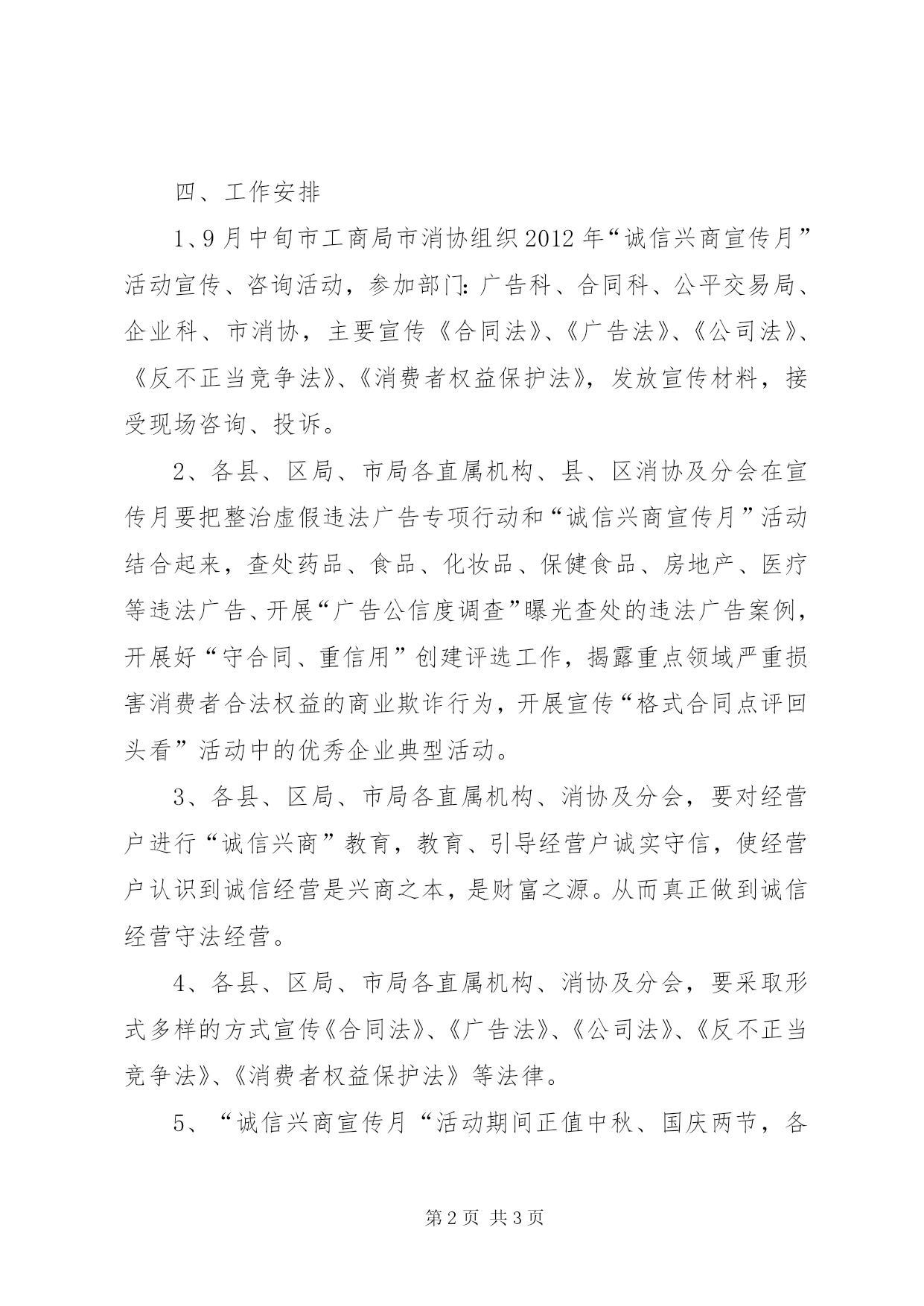 第PAGE\*Arabic\*MERGEFORMAT3页共NUMPAGES\*MERGEFORMAT3页工商局诚信兴商工作方案根据市整顿和规范市场经济秩序领导小组办公室[2012]9号文件的统一部署和要求,定于9月在全系统内开展“诚信兴商宣传月”活动,现将活动方案印发给你们,请各单位认真组织实施。一、活动宗旨深入贯彻落实党中央、国务院关于加强政务诚信、商务诚信、社会诚信建设的精神,按照整顿和规范市场经济秩序的总体要求,在经济领域大力倡导诚信兴商的经营理念,增强经营户的诚实守信意识,推动社会信用体系建设,为经济社会和谐发展提供良好的社会氛围。二、工作要点结合整治虚假违法广告专项行动,认真开展“树诚信、打虚假”、“守合同、重信用”等创建活动,重点宣传《合同法》、《公司法》、《广告法》、《反不正当竞争法》、《消费者权益保护法》等法律、以及新出台的广告监管规章,开展“广告公信度调查”曝光虚假违法广告案例,揭露重点领域损害消费者合法权益的商业欺诈行为,宣传“格式合同点评回头看”活动中的优秀企业典型。三、组织领导为了认真落实市2012年“诚信兴商宣传月”活动,市局成立2012年“诚信兴商宣传月”活动领导小组,组织领导协调推进宣传月活动,领导小组名单如下:四、工作安排1、9月中旬市工商局市消协组织2012年“诚信兴商宣传月”活动宣传、咨询活动,参加部门:广告科、合同科、公平交易局、企业科、市消协,主要宣传《合同法》、《广告法》、《公司法》、《反不正当竞争法》、《消费者权益保护法》,发放宣传材料,接受现场咨询、投诉。2、各县、区局、市局各直属机构、县、区消协及分会在宣传月要把整治虚假违法广告专项行动和“诚信兴商宣传月”活动结合起来,查处药品、食品、化妆品、保健食品、房地产、医疗等违法广告、开展“广告公信度调查”曝光查处的违法广告案例,开展好“守合同、重信用”创建评选工作,揭露重点领域严重损害消费者合法权益的商业欺诈行为,开展宣传“格式合同点评回头看”活动中的优秀企业典型活动。3、各县、区局、市局各直属机构、消协及分会,要对经营户进行“诚信兴商”教育,教育、引导经营户诚实守信,使经营户认识到诚信经营是兴商之本,是财富之源。从而真正做到诚信经营守法经营。4、各县、区局、市局各直属机构、消协及分会,要采取形式多样的方式宣传《合同法》、《广告法》、《公司法》、《反不正当竞争法》、《消费者权益保护法》等法律。5、“诚信兴商宣传月“活动期间正值中秋、国庆两节,各县区局、市局各直属机构要加大市场巡查力度,特别要对食品安全加大监督检查力度,严厉查处经营假冒伪劣产品的不诚信经营户。确保“两节”期间市场安全和食品安全。五、工作要求1、市局相关科室、各县、区局、市局各直属机构、县区消协及分会,要按照方案要求,认真组织好、落实好“诚信兴商宣传月”活动。2、各县、区局、市局各直属机构、县区协会及分会对宣传月活动开展情况要认真总结,认真填写2012年“诚信兴商宣传月”活动统计表,务必于10月6日报市局领导小组办公室,以便汇总,上报市整规办。