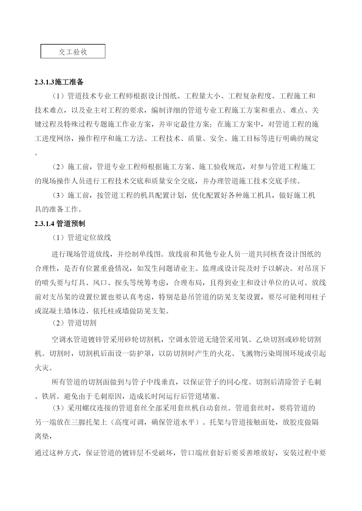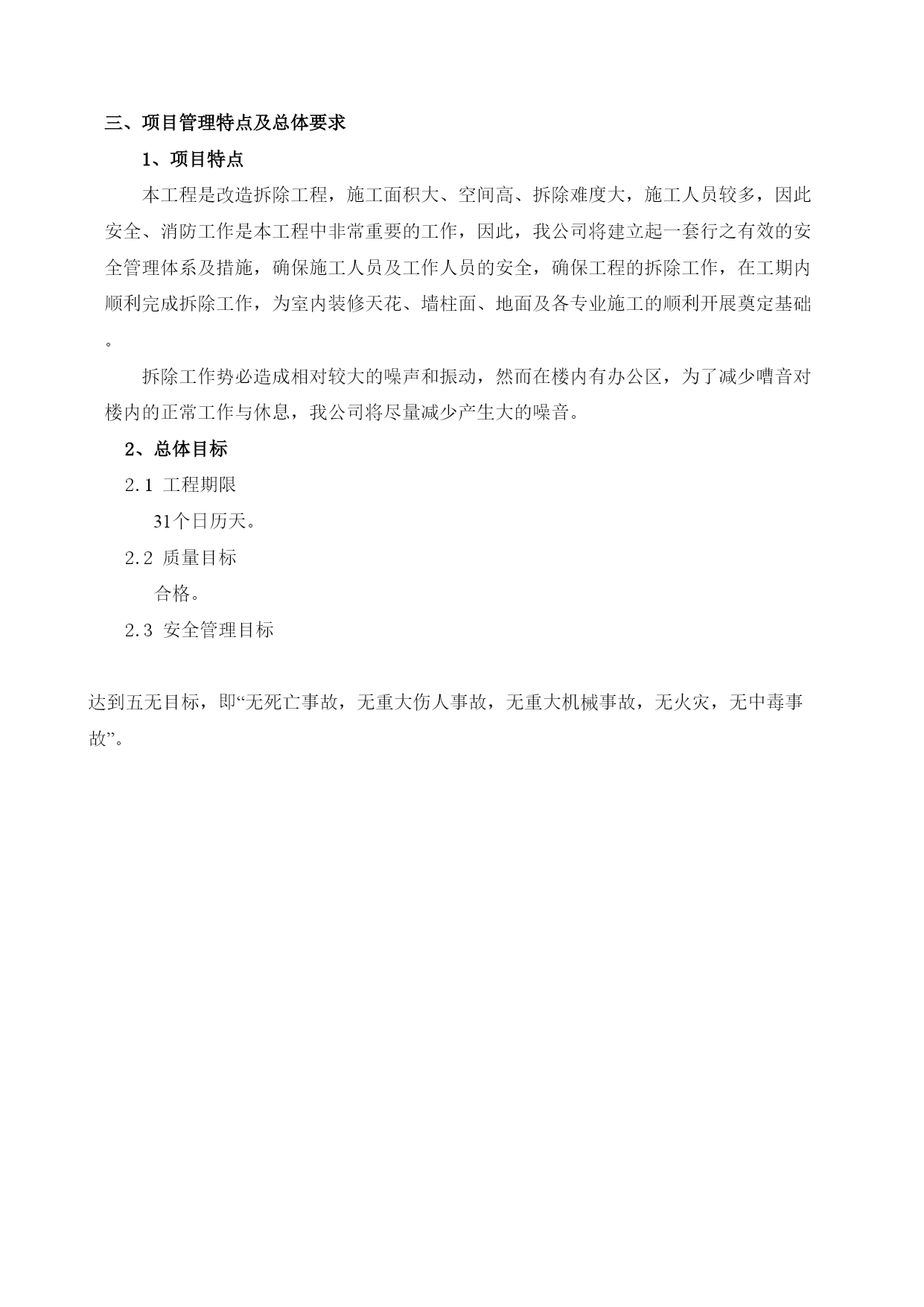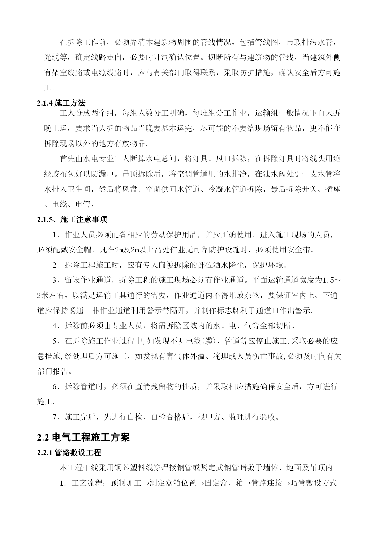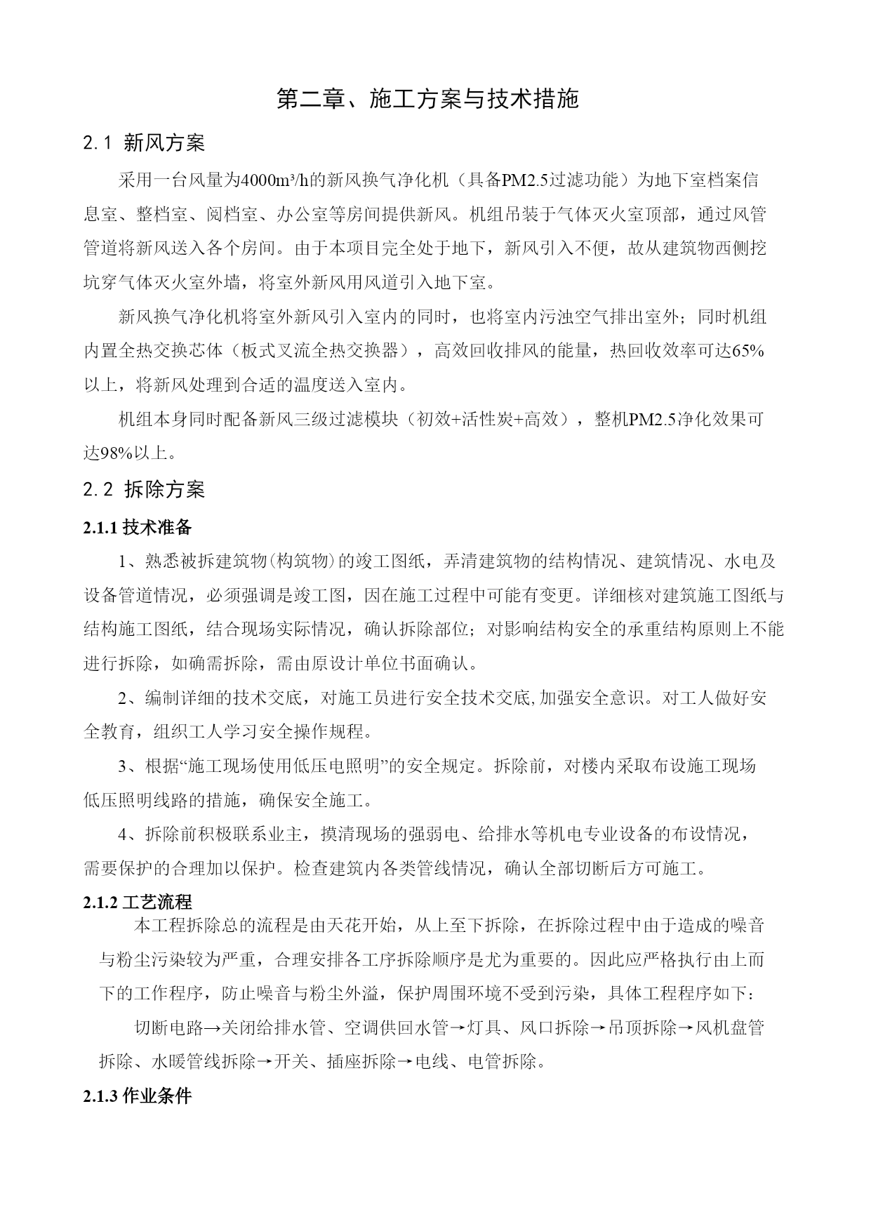 第一章总体概述一、施工组织设计编制说明本施工组织设计编制的目的是从施工全局出发,根据各种具体的施工条件,为磋商阶段提供较为完整的纲领性文件,一旦中标,将在此基础上进行深化,用以指导工程施工与管理,并做好以下工作。二、项目概况1、项目简介1.1项目名称:1.2建设地点:1.3采购人:1.4结构类型:1.5建筑分类及耐火等级:1.6建筑室内防污染控制等级为二级2、设计概况根据甲方要求,本工程为地下室机电工程改造工程,改造内容包括:a.拆除原有照明、弱电、空调管线后新做。b.新增新风系统。3、编制依据主要规范规程及标准:《建筑给水排水设计规范》(GB50015-2003)[2009年版]《建筑电气工程施工质量验收规范》HYPERLINK"http://www.so.com/link?url=http://www.fire114.cn/article-4651.html&q=%E5%BB%BA%E7%AD%91%E7%94%B5%E6%B0%94%E5%B7%A5%E7%A8%8B%E6%96%BD%E5%B7%A5%E8%B4%A8%E9%87%8F%E9%AA%8C%E6%94%B6%E8%A7%84%E8%8C%832015&ts=1476261960&t=261ca33b1ebfb3f10bac1222d1ea0ff&src=haosou"\t"https://www.so.com/_blank"GB50303-2015《HYPERLINK"http://www.so.com/link?url=http://www.shangxueba.com/share/p6261231.html&q=%E9%80%9A%E9%A3%8E%E4%B8%8E%E7%A9%BA%E8%B0%83%E5%B7%A5%E7%A8%8B%E6%96%BD%E5%B7%A5%E8%B4%A8%E9%87%8F%E9%AA%8C%E6%94%B6%E8%A7%84%E8%8C%83%E6%9C%80%E6%96%B0%E7%89%88&ts=1476262192&t=0a7f69ea89555953053faf85b2af139&src=haosou"\t"https://www.so.com/_blank"通风与空调工程施工质量验收规范》GB50243-2002《建筑设计防火规范》(GB50016-2006)《民用建筑设计通则》(GB50352-2005)《办公建筑设计规范》(JGJ67-2006)《建筑内部装修设计防火规范》(GB50222-95)[2001年版]《公共建筑节能设计标准》(DB11/687-2009)采购方提供的设计图纸三、项目管理特点及总体要求1、项目特点本工程是改造拆除工程,施工面积大、空间高、拆除难度大,施工人员较多,因此安全、消防工作是本工程中非常重要的工作,因此,我公司将建立起一套行之有效的安全管理体系及措施,确保施工人员及工作人员的安全,确保工程的拆除工作,在工期内顺利完成拆除工作,为室内装修天花、墙柱面、地面及各专业施工的顺利开展奠定基础。拆除工作势必造成相对较大的噪声和振动,然而在楼内有办公区,为了减少嘈音对楼内的正常工作与休息,我公司将尽量减少产生大的噪音。2、总体目标2.1工程期限31个日历天。2.2质量目标合格。2.3安全管理目标达到五无目标,即“无死亡事故,无重大伤人事故,无重大机械事故,无火灾,无中毒事故”。、施工方案与技术措施2.1新风方案采用一台风量为4000m³/h的新风换气净化机(具备PM2.5过滤功能)为地下室档案信息室、整档室、阅档室、办公室等房间提供新风。机组吊装于气体灭火室顶部,通过风管管道将新风送入各个房间。由于本项目完全处于地下,新风引入不便,故从建筑物西侧挖坑穿气体灭火室外墙,将室外新风用风道引入地下室。新风换气净化机将室外新风引入室内的同时,也将室内污浊空气排出室外;同时机组内置全热交换芯体(板式叉流全热交换器),高效回收排风的能量,热回收效率可达65%以上,将新风处理到合适的温度送入室内。机组本身同时配备新风三级过滤模块(初效+活性炭+高效),整机PM2.5净化效果可达98%以上。2.2拆除方案2.1.1技术准备1、熟悉被拆建筑物(构筑物)的竣工图纸,弄清建筑物的结构情况、建筑情况、水电及设备管道情况,必须强调是竣工图,因在施工过程中可能有变更。详细核对建筑施工图纸与结构施工图纸,结合现场实际情况,确认拆除部位;对影响结构安全的承重结构原则上不能进行拆除,如确需拆除,需由原设计单位书面确认。2、编制详细的技术交底,对施工员进行安全技术交底,加强安全意识。对工人做好安全教育,组织工人学