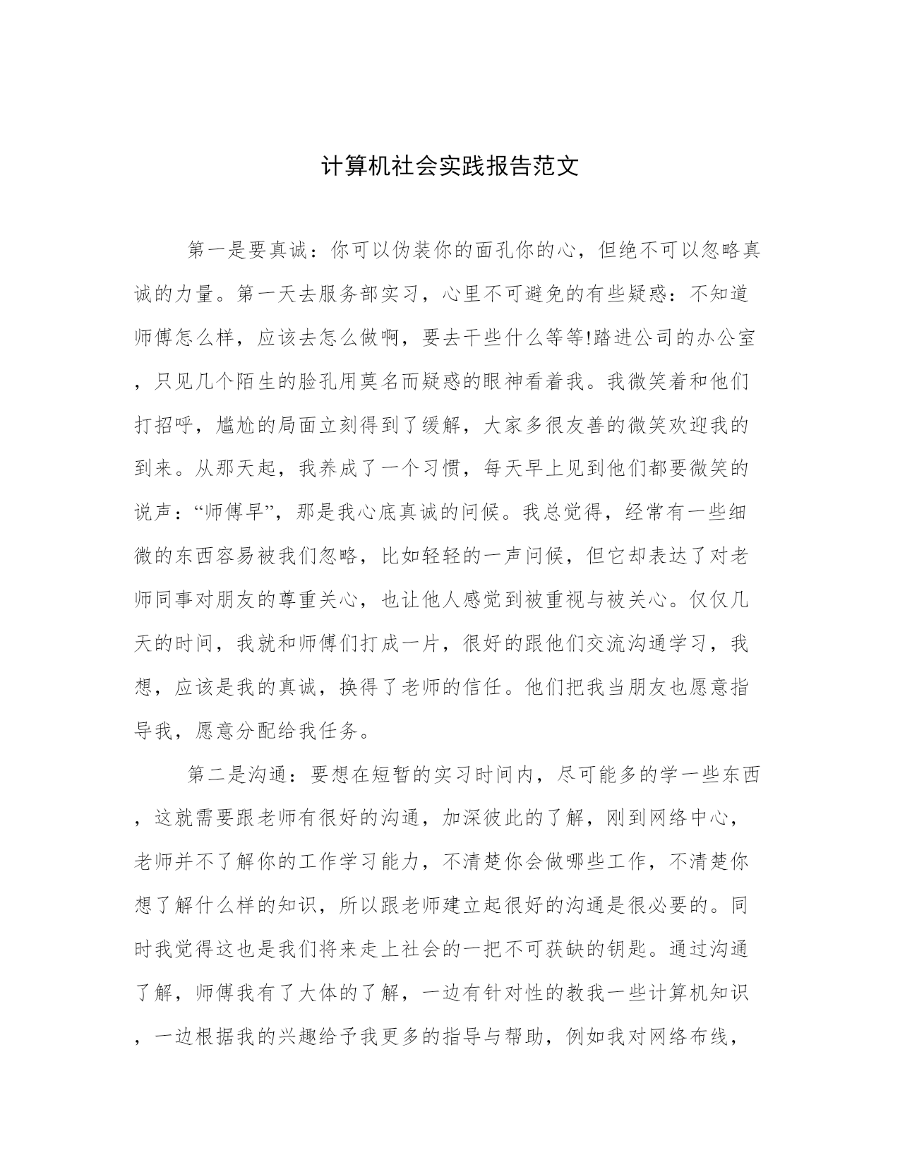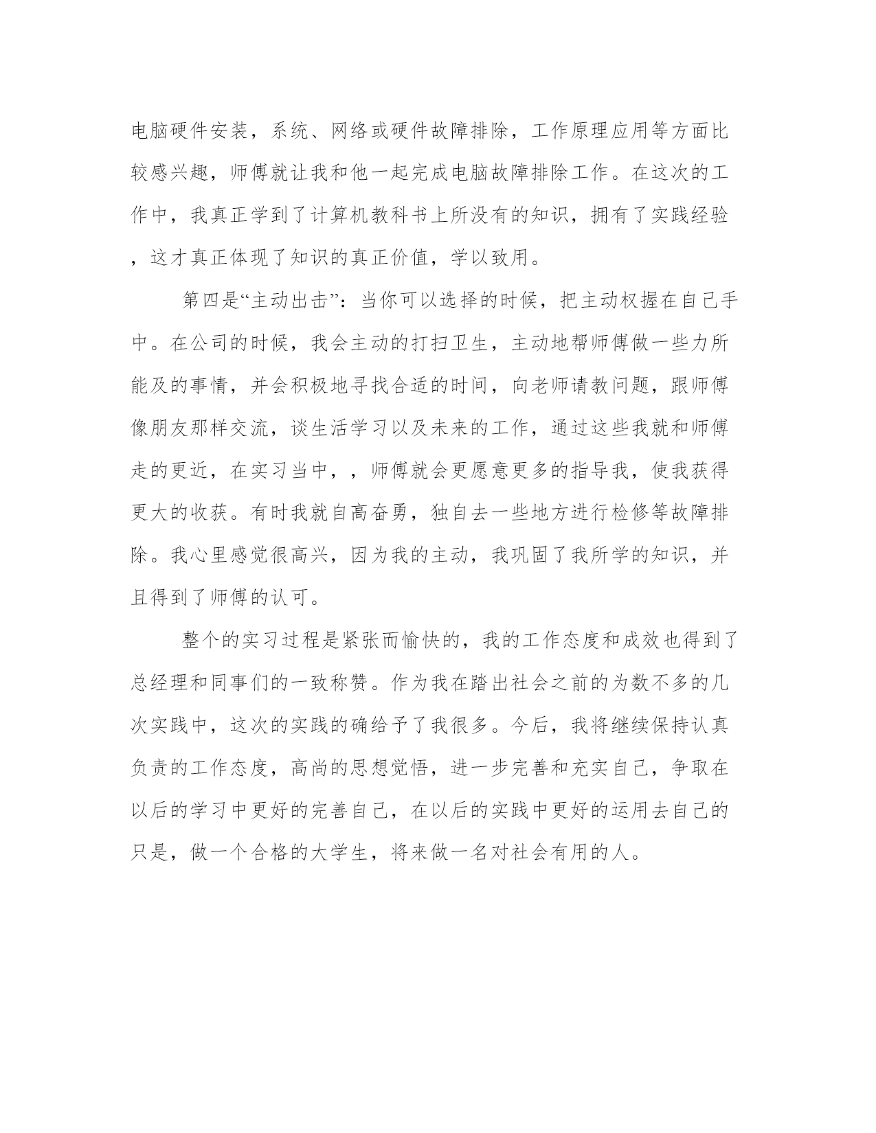 计算机社会实践报告范文第一是要真诚:你可以伪装你的面孔你的心,但绝不可以忽略真诚的力量。第一天去服务部实习,心里不可避免的有些疑惑:不知道师傅怎么样,应该去怎么做啊,要去干些什么等等!踏进公司的办公室,只见几个陌生的脸孔用莫名而疑惑的眼神看着我。我微笑着和他们打招呼,尴尬的局面立刻得到了缓解,大家多很友善的微笑欢迎我的到来。从那天起,我养成了一个习惯,每天早上见到他们都要微笑的说声:“师傅早”,那是我心底真诚的问候。我总觉得,经常有一些细微的东西容易被我们忽略,比如轻轻的一声问候,但它却表达了对老师同事对朋友的尊重关心,也让他人感觉到被重视与被关心。仅仅几天的时间,我就和师傅们打成一片,很好的跟他们交流沟通学习,我想,应该是我的真诚,换得了老师的信任。他们把我当朋友也愿意指导我,愿意分配给我任务。第二是沟通:要想在短暂的实习时间内,尽可能多的学一些东西,这就需要跟老师有很好的沟通,加深彼此的了解,刚到网络中心,老师并不了解你的工作学习能力,不清楚你会做哪些工作,不清楚你想了解什么样的知识,所以跟老师建立起很好的沟通是很必要的。同时我觉得这也是我们将来走上社会的一把不可获缺的钥匙。通过沟通了解,师傅我有了大体的了解,一边有针对性的教我一些计算机知识,一边根据我的兴趣给予我更多的指导与帮助,例如我对网络布线,电脑硬件安装,系统、网络或硬件故障排除,工作原理应用等方面比较感兴趣,师傅就让我和他一起完成电脑故障排除工作。在这次的工作中,我真正学到了计算机教科书上所没有的知识,拥有了实践经验,这才真正体现了知识的真正价值,学以致用。第四是“主动出击”:当你可以选择的时候,把主动权握在自己手中。在公司的时候,我会主动的打扫卫生,主动地帮师傅做一些力所能及的事情,并会积极地寻找合适的时间,向老师请教问题,跟师傅像朋友那样交流,谈生活学习以及未来的工作,通过这些我就和师傅走的更近,在实习当中,,师傅就会更愿意更多的指导我,使我获得更大的收获。有时我就自高奋勇,独自去一些地方进行检修等故障排除。我心里感觉很高兴,因为我的主动,我巩固了我所学的知识,并且得到了师傅的认可。整个的实习过程是紧张而愉快的,我的工作态度和成效也得到了总经理和同事们的一致称赞。作为我在踏出社会之前的为数不多的几次实践中,这次的实践的确给予了我很多。今后,我将继续保持认真负责的工作态度,高尚的思想觉悟,进一步完善和充实自己,争取在以后的学习中更好的完善自己,在以后的实践中更好的运用去自己的只是,做一个合格的大学生,将来做一名对社会有用的人。