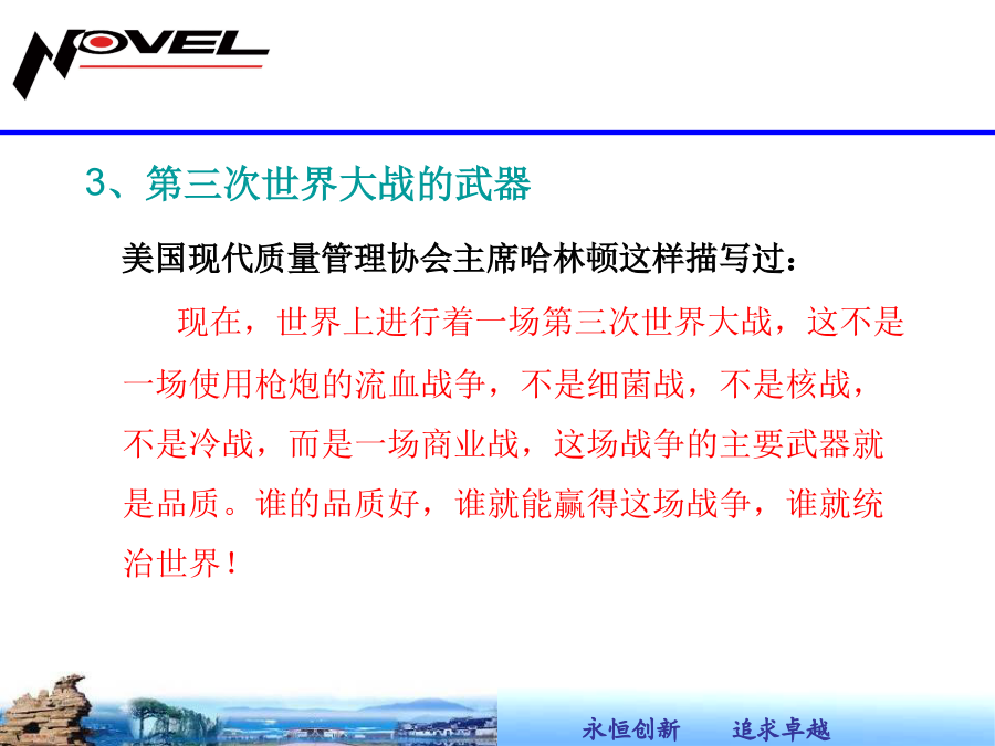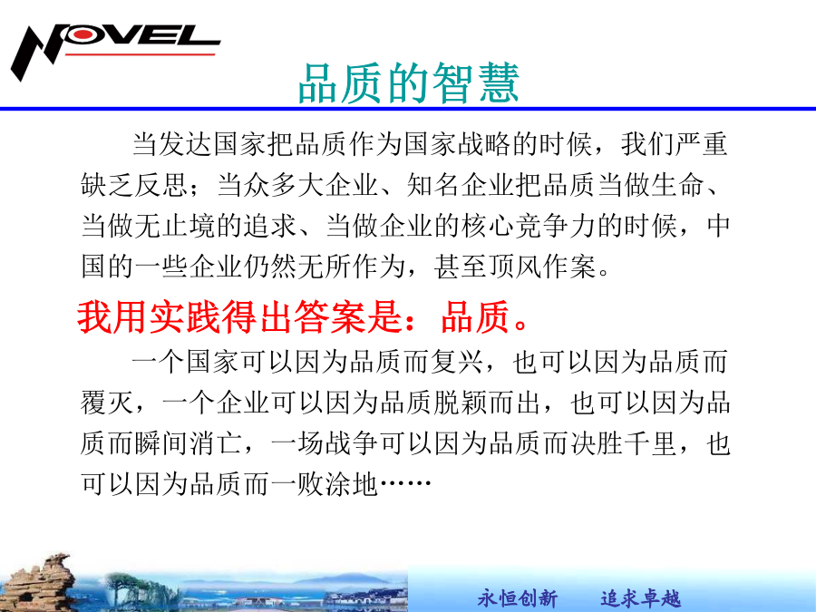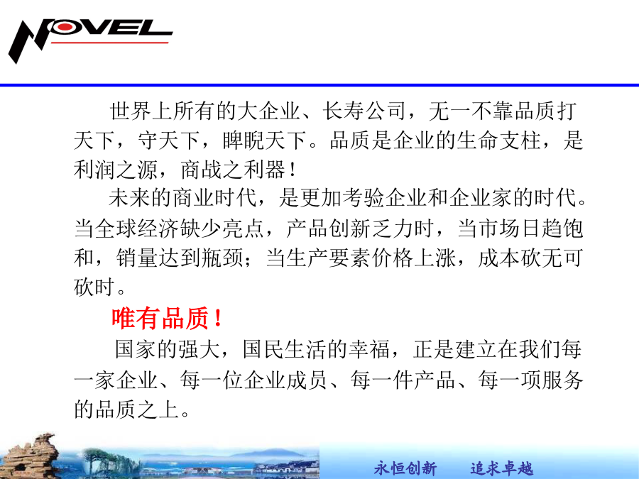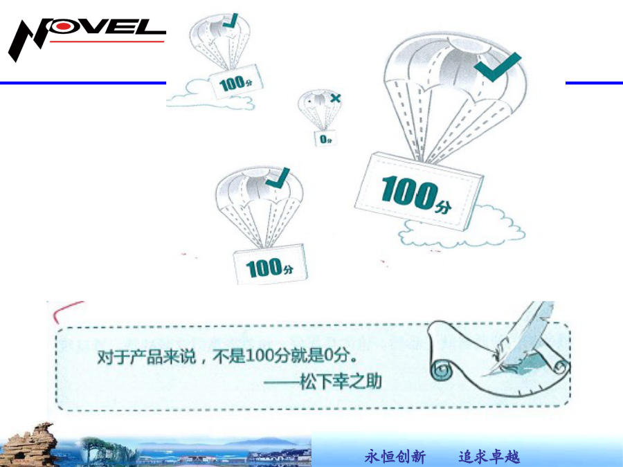 要么品质要么死要么品质要么死品质与人人生死有关品质与企业存亡有关没有品质死路一条品质的智慧世界上所有的大企业、长寿公司,无一不靠品质打天下,守天下,睥睨天下。品质是企业的生命支柱,是利润之源,商战之利器!未来的商业时代,是更加考验企业和企业家的时代。当全球经济缺少亮点,产品创新乏力时,当市场日趋饱和,销量达到瓶颈;当生产要素价格上涨,成本砍无可砍时。唯有品质!国家的强大,国民生活的幸福,正是建立在我们每一家企业、每一位企业成员、每一件产品、每一项服务的品质之上。第一部分品质决定成败第一章品质无故第一节品质复兴一个国家2、100-1=0品质问题是关乎生命的大事,品质可以让一个人生,也可以让一个人死;可以让一群人生,也可以让一群人死。我们的企业,在生产产品过程中,有这样的意识吗?松下幸之助说:“对于产品来说,不是100分就是O分。”生产品质低劣的产品,哪怕只是1%,仍然等于谋财害命!而这样的企业,生命也会马上结束!对于产品来说,不是100分就是0分。——松下幸之助3、第三次世界大战的武器美国现代质量管理协会主席哈林顿这样描写过:现在,世界上进行着一场第三次世界大战,这不是一场使用枪炮的流血战争,不是细菌战,不是核战,不是冷战,而是一场商业战,这场战争的主要武器就是品质。谁的品质好,谁就能赢得这场战争,谁就统治世界!4、品质就是利润在全球最具价格的10大奢侈品品牌中,法国独占6席!路易威登和爱马仕集团分别以197.8亿美元和84.6亿美元的价值名列第一和第二。即使在欧债危机蔓延的2011年,因为奢侈品著行业出口的推动,法国出口额仍然比上年增长8.6%!无可置疑地成为了对法国经济贡献最高的产业之一!品质提升了品位,品质光大了品牌。品质、品位与品牌的共同作用,产生了强大的财富效应,产生了源源不断的利润。第二节蔓延的品质危机2、中国的品质之惑不管是具有国家背景还是行业龙头,不管曾经多么风光无限,不管历史多么悠久,不管品牌多么享誉中外,不管销售渠道多少广,不管产量多么大,无数血的教训证明,如果企业只顾把产品推出去,不顾品质,这家企业的名字不久就会在市场上消失。如今的中国社会,品质危机有继续蔓延的趋势。三聚氰胺奶粉、豆腐渣工程、苏丹红鸭蛋、儿童劣质疫苗、问题胶囊、“楼脆脆”事件┄┄每一次品质危机的爆发,都是对行业乃至整个中国企业界公信力的拷问,牵一发动全身!回首三聚氰胺奶粉一家之祸,让整个国产奶粉都丧失了巨大市场份额,洋奶粉趁虚而入,这样的教训,应该是中国企业的一贴清醒剂。品质是一个国家、一个行业、一个企业的命脉,是一个人工作、生活、学习、健康的源泉┄┄3、令人震撼的差距这就是品质的体现。记得一次,我在路边看到一个醒目的广告牌——“德国品质,绝对放心,日本原装,品质保障。”同行的这个标语牌,从广告专业的角度来说棒极了。然而,这却令我很受触动:我们自己制造的产品,却对自己的标准避而不谈,难道还不值得企业家们反省吗?当然,品质的差距不仅仅表现在质量上和服务上的差距,更是每一个走出国门的中国人都深有感触的。为什么会有如此大的差距,让我们来看看这些国家把品质放在什么位置:日本把品质作为国家战略,美国也是,他们的政府会参与品质管理。而在中国,很多时候品质只有口号、没有执行。中国的企业要想突破,企业、行业和国家都要把品质放到战略层面。必须从品质这一关来突破,提升中国品质迫在眉睫!第二章品质是什么第一节品质是人人都说好第二节品质是企业家的人品第三节品质是五颗“心”第三章管对才会有品质第一节品质管理的6大误区误区1:处处都是“≈”误区2:品质=血拼误区3:品质的战争在前线误区4:销量>品质误区6:失误率≠品质第二节预防重于纠错2、第一次就把事情做对第二部分提升品质的15招杀技第四章4招奠定品质一把手工程品质管理员的困惑所以,提升品质的力度一定要从上到下,叫做扫楼梯!扫楼梯是从上到下的,企业要有面对品质的决心、表率和素质!在品质的“扫楼梯工程”中,企业家首先要打开四扇窗,即提升品质的头四招必杀技。第1招态度:没有任何借口在组织中,要非常明确地规定:任何时候,任何地点,任何情况,任何人,不许说三句话:“不知道”、“不负责”、“不关我事”。如果说了,就是严重违反公司品质管理的要求。这就是态度问题,就要处罚。谁踢皮球,就把谁从这个团队踢出去!品质来自于全员,来自于我们的全流程,来自于每个细节。第2招理念:品质第一成功的企业是相同的,他们把品质第一作为核心理念,使之成为组织的核心文化。在你的企业里,有没有把品质第一作为企业的价值准则呢?有了这个核心文化以后,我们可以用这一点来筛选新员工。新员工入职,先问两点:第一,有没有品质第一的意识?认不认同品质第一的理念?如果有任何一点不符合,