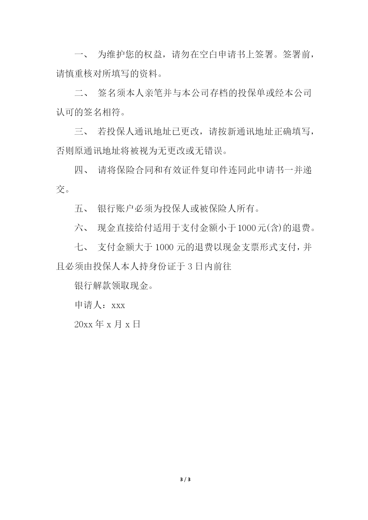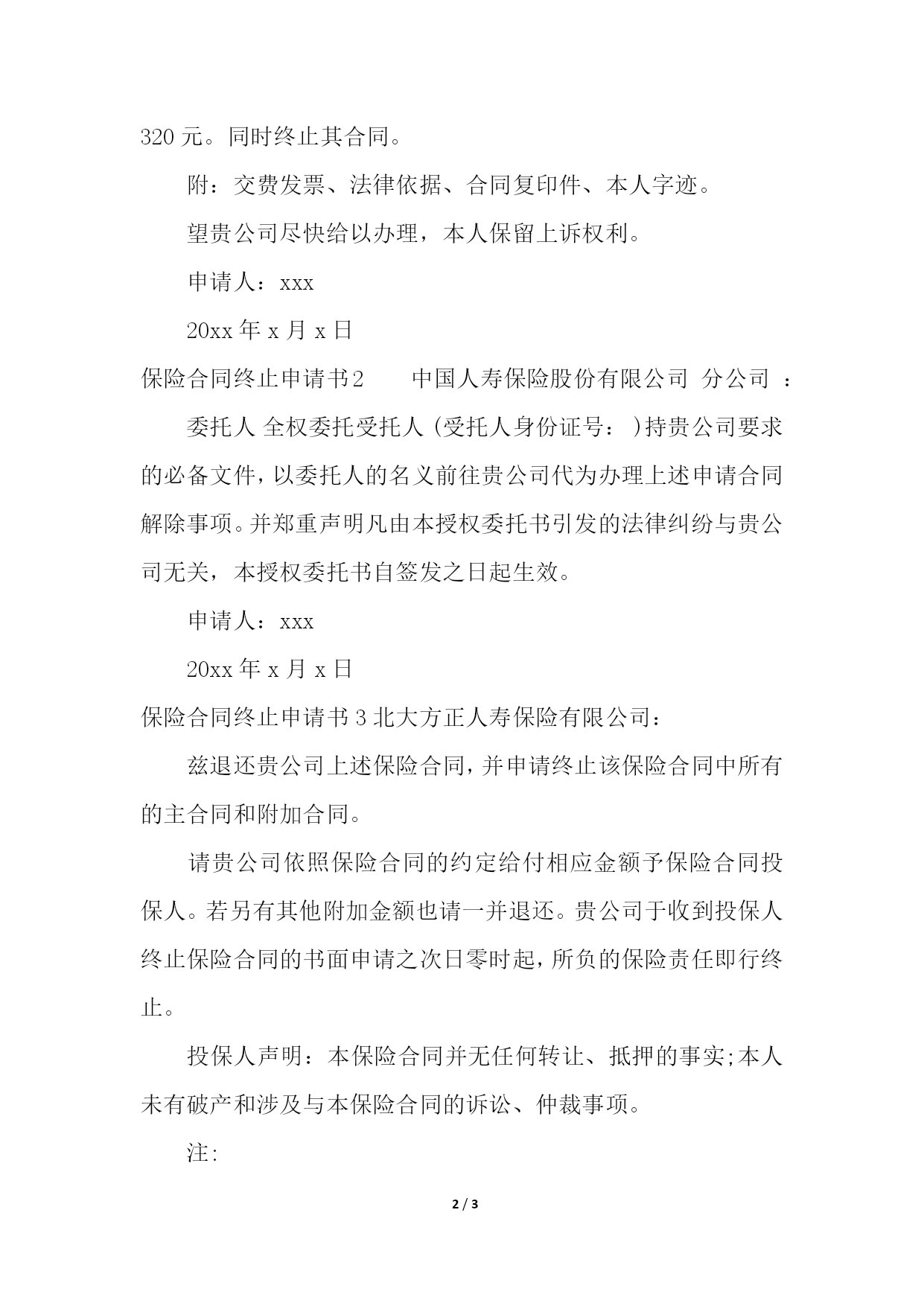 PAGE3/NUMPAGES3保险合同终止申请书参保人:李某某,男。家住雁江区某中学宿舍。身份证号:。保险合同号:xxxxxxxsxxx0000xxxxx(1080.00元/年)和xxxxxxxsxxx00000xxxx(990.00元/年)。退保原因:《终身保险》有些条款中的表述意思含混不清,有一定的欺诈性。如“心脏病(心肌梗塞)”。该公司不守信誉,要投保人打官司才能获得赔付。《终身保险》条款中对心肌梗塞的诊断标准不公平、不合理。是一个糊弄投保人的最为霸道的格式合同。因其产品存在缺陷,现已退出保险市场。本人不愿以后与贵公司进行理论。《终身保险》是我的爱人在其公司业务员的“热情宣传”下,在没有看到合同的`情况下,将钱交了上去,几天后才拿了合同下来,签字一撕两半,就算成交(这种先投保后见合同的行规,是不合法的)。本人一点不知情,也不是本人签的字(该申请上有本人字迹,请鉴定)。它不符合《中华人民共和国保险法》第十一条(保险合同自愿订立)之规定,怕我死后贵公司以《中华人民共和国保险法》第五十六条“以死亡为给付保险金条件的合同,未经被保险人书面同意并认可保险金额的,合同无效。”之规定而拒赔。综上所述:特申请贵公司退还我们所交的所有保费:共计14670元和资金利息330元、退保过程产生的车费、误工费共计320元。同时终止其合同。附:交费发票、法律依据、合同复印件、本人字迹。望贵公司尽快给以办理,本人保留上诉权利。申请人:xxx20xx年x月x日保险合同终止申请书2中国人寿保险股份有限公司分公司:委托人全权委托受托人(受托人身份证号:)持贵公司要求的必备文件,以委托人的名义前往贵公司代为办理上述申请合同解除事项。并郑重声明凡由本授权委托书引发的法律纠纷与贵公司无关,本授权委托书自签发之日起生效。申请人:xxx20xx年x月x日保险合同终止申请书3北大方正人寿保险有限公司:兹退还贵公司上述保险合同,并申请终止该保险合同中所有的主合同和附加合同。请贵公司依照保险合同的约定给付相应金额予保险合同投保人。若另有其他附加金额也请一并退还。贵公司于收到投保人终止保险合同的书面申请之次日零时起,所负的保险责任即行终止。投保人声明:本保险合同并无任何转让、抵押的事实;本人未有破产和涉及与本保险合同的诉讼、仲裁事项。注:一、为维护您的权益,请勿在空白申请书上签署。签署前,请慎重核对所填写的资料。二、签名须本人亲笔并与本公司存档的投保单或经本公司认可的签名相符。三、若投保人通讯地址已更改,请按新通讯地址正确填写,否则原通讯地址将被视为无更改或无错误。四、请将保险合同和有效证件复印件连同此申请书一并递交。五、银行账户必须为投保人或被保险人所有。六、现金直接给付适用于支付金额小于1000元(含)的退费。七、支付金额大于1000元的退费以现金支票形式支付,并且必须由投保人本人持身份证于3日内前往银行解款领取现金。申请人:xxx20xx年x月x日