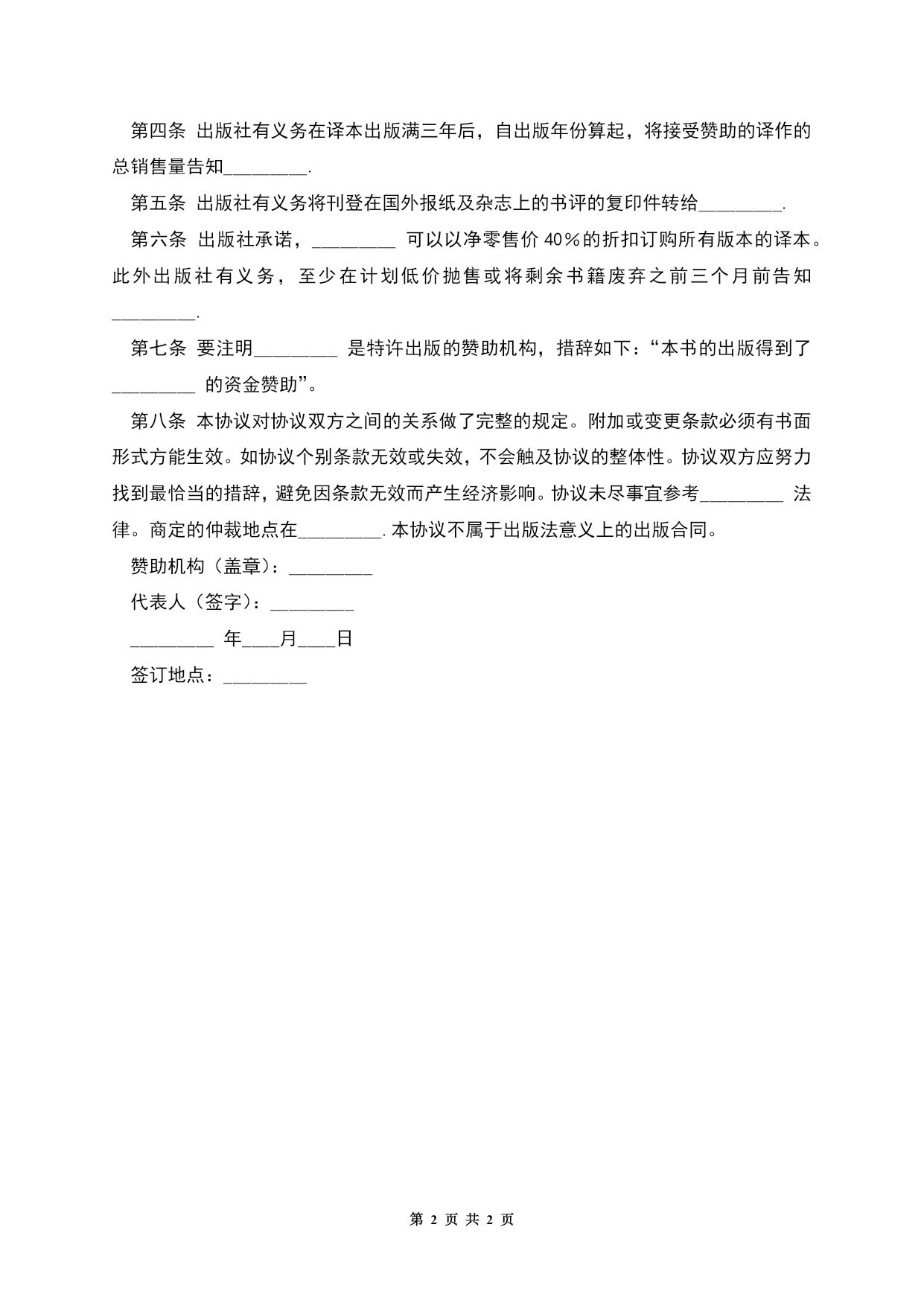 第PAGE\*MERGEFORMAT2页共NUMPAGES\*MERGEFORMAT2页图书出版赞助协议_________,代表_________,以下称作“_________”,与_________代表_________出版社,以下称作“出版社”,签署下述协议:第一条(1)协议赞助_________所著的_________一书出版_________文版。(2)该书印数最少为_________册,_________册精装本,零售价:_________,_________册平装本,零售价:_________.(3)在此,出版社郑重承诺拥有翻译该书所需的一切权利,自此刻起,如有侵犯第三者权益之事发生,则_________不承担一切责任。(4)_________享有在其文化工作范围内直接地、无偿地和不受时间地点限制地使用特许出版权或译作的权利。第二条(1)根据评审委员会_________年_________月_________日的会议决定,为出版1.1条中所述译作,_________在翻译项目范围内特此批准赞助款_________欧元(大写)。(2)赞助款在满足以下条件后支付:(a)出版社须出具译者翻译1.1条中所述译作所得稿筹的原始收据和由译者认证的收据译文。(b)_________收到样书两册。(c)_________收到样书一册。(d)须按第7条所述方式提及_________参与出版本书。第三条(1)批准的赞助有效期至_________年_________月_________日。(2)若至(1)中所述日期译本尚未送达,可以申请自协议签署之日起延期36个月。若协议延长期满仍未按2.2条的(b)和(d)将样书送达_________,则批准的赞助失效。第四条出版社有义务在译本出版满三年后,自出版年份算起,将接受赞助的译作的总销售量告知_________.第五条出版社有义务将刊登在国外报纸及杂志上的书评的复印件转给_________.第六条出版社承诺,_________可以以净零售价40%的折扣订购所有版本的译本。此外出版社有义务,至少在计划低价抛售或将剩余书籍废弃之前三个月前告知_________.第七条要注明_________是特许出版的赞助机构,措辞如下:“本书的出版得到了_________的资金赞助”。第八条本协议对协议双方之间的关系做了完整的规定。附加或变更条款必须有书面形式方能生效。如协议个别条款无效或失效,不会触及协议的整体性。协议双方应努力找到最恰当的措辞,避免因条款无效而产生经济影响。协议未尽事宜参考_________法律。商定的仲裁地点在_________.本协议不属于出版法意义上的出版合同。赞助机构(盖章):_________代表人(签字):__________________年____月____日签订地点:_________
