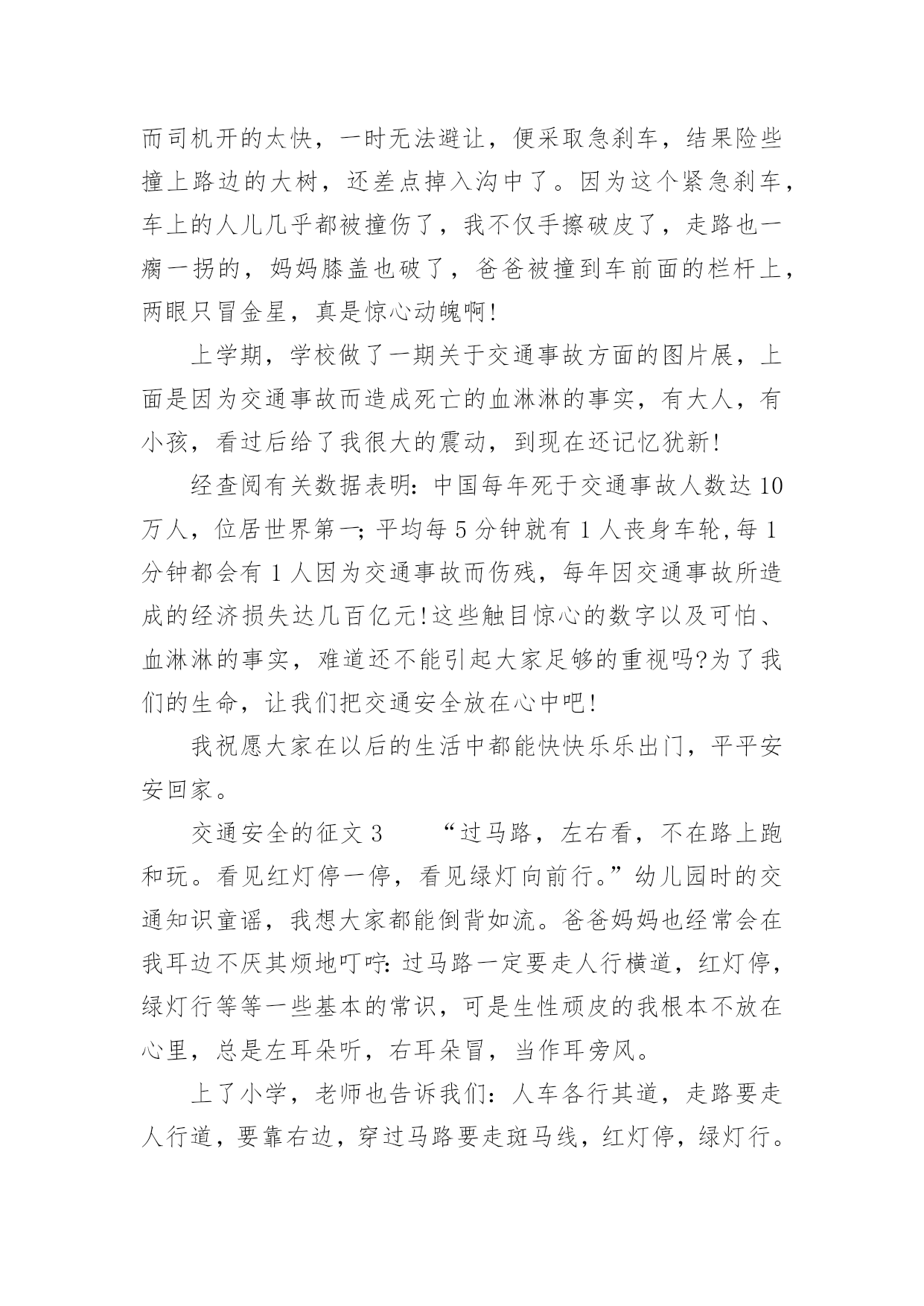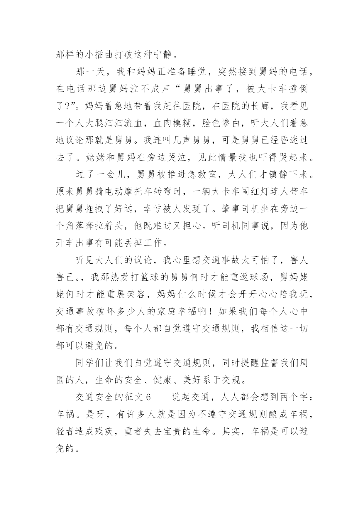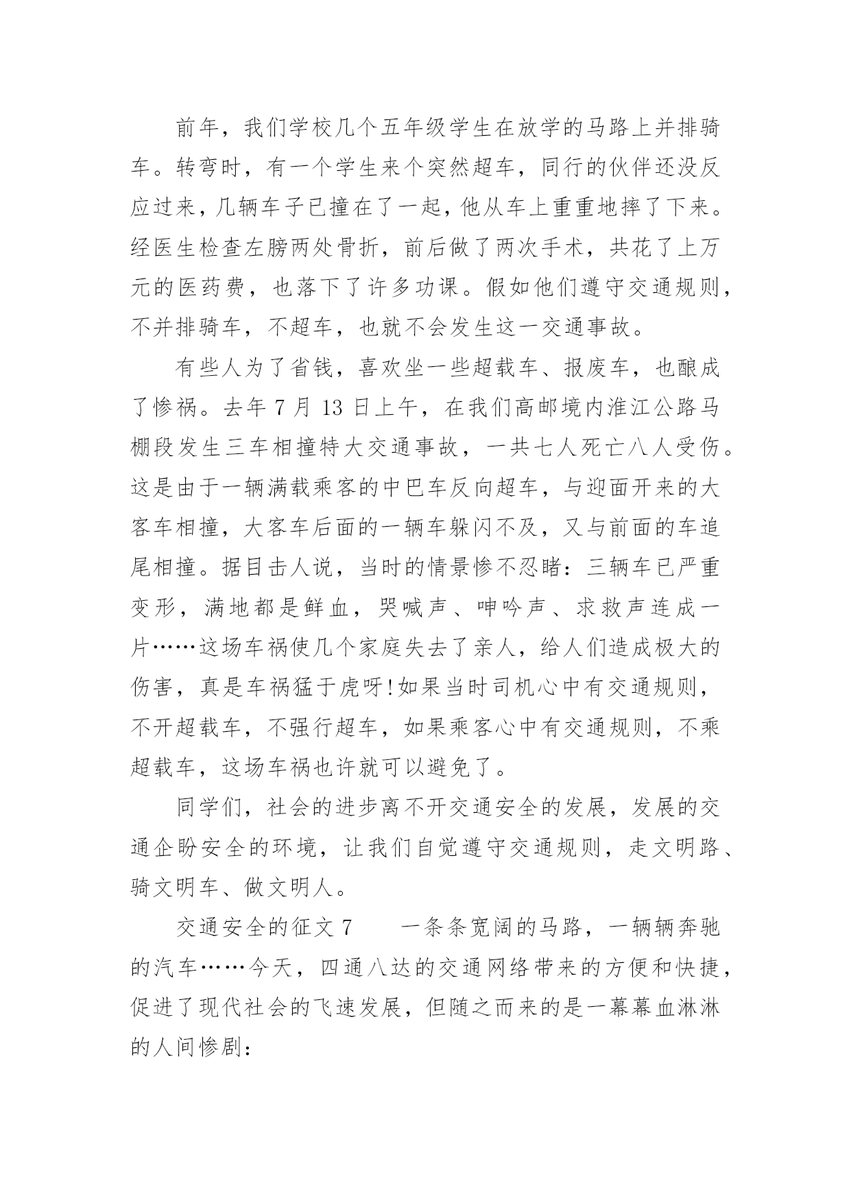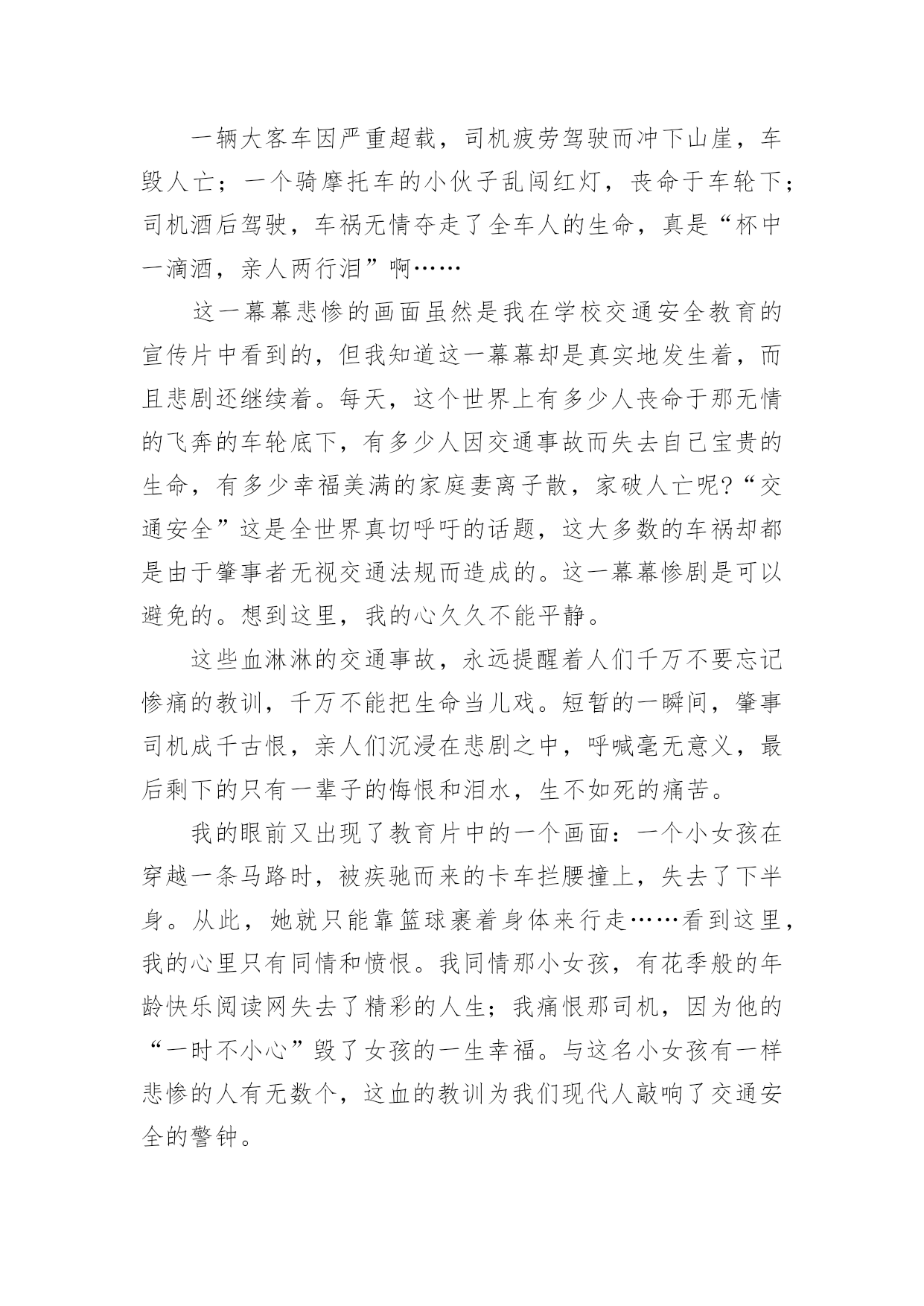交通安全的征文交通安全的征文(精选15篇)在日复一日的学习、工作或生活中,大家都有写征文的经历,对征文很是熟悉吧,征文是某个办事部门为了某个活动公开向社会征集的有关文章。你所见过的征文是什么样的呢?下面是小编收集整理的交通安全的征文(精选15篇),欢迎阅读与收藏。交通安全的征文1在街道上,你是否会经常看见按着喇叭,踩着油门,从你身边呼啸而去的“奔驰”?在雨天里,你是否曾被急驶的汽车溅起的泥水弄湿了衣服?在步行街,你又是否曾被超速行驶的驾驶员破口大骂不长眼睛?有车一族,也是有“脾气”、有“个性”的一族。他们忙着抢道,忙着闯红灯,忙着速度的提升,却无暇顾及车轮下的文明。车轮改变了世界,车轮却同时地享有“特权”。那些争分夺秒的驾驶者,那些在行人面前张狂地按喇叭,横冲直撞的驾驶员,甚至示意行人为车让路的司机,他们作为行车者最基本的文明早已被践踏在车轮下。或许,在这些抛弃了行车文明的人们心里,车不仅仅是他们的一种代步工具,更是他们权力的象征以及炫耀强霸的资本。只是,那些享受着舒适的车的行车者有什么理由和行人争抢呢?曾在书上看到这样一个故事:甲和乙在一个路口等红灯,甲说,这里人少,极目左右根本没有车辆的影子,冲着红灯穿过去不会有任何危险,干吗规规矩矩地等?乙解释道:街道穿行者中,交通事故伤害最大的群落是孩子,为了孩子们,唯一正确的方法就是放弃穿越。这个故事中乙对他人的尊重以及行车文明之规范,让我肃然起敬。这是否也能给那些准备投机取巧的人一丝的压力?行车文明,这是对他人、也是对自己的一种尊重,重要的是,它是对生命的尊重,它需要的是宽厚的人格和文明生态的积定。行车时,我们如果多一个手势,对别人来说就是多一份理解;多一点等待,对别人来说就是多一份关爱;多一点分享,对别人来说就是多一份温暖。我们可以轻而易举地发现,行车文明就在我们身边解手可及的地方。车轮改变了世界,车轮也塑造着人。当我们为过马路的行人让行,当我们问行人投以一掬虔诚的微笑,当我们不再超速抢道时,你会发现,车轮带给我们的不仅是速度上的超越,更是人格的飞跃,文明的开格。也许,现代快节奏的生活也给了行车者们一个“不得不快”的理由,只是,这个理由却需要生命来作为代价……可曾想过,疾驶的车轮也许会碾碎一个个美丽的梦?可曾想过,车飞奔而过的瞬间也许会是一个家庭破碎的过程?又可曾想过,酒后驾车也许会造成自身的悲剧?这些,你可曾想过?如果想过,这些血的教训是否会让你放弃一切投机取巧的行为而文明遵章?如果不曾想过,那些丢失了行车文明的驾驶者,是否该反省自我、收敛自我?石成金曾说过:“无愧于事不如无愧于心。”是的,当你驾驶着车,鸣着响笛,呼啸着从老人、孕妇或是孩童身边疾驶而过时,你是心安理得的吗?当你的车轮溅起的泥浆弄脏了行人白净的衣服,你会感到心里那隐约的歉意吗?当你因超速闯灯而撞倒了行人,你会负起事故的责任吗?做这些的时候,你也许会认为“无愧于事”,但你是否能做到真正地“无愧于心”呢……车轮下的文明,是行车者自身深层修养的体,车轮下的文明,是真正的文明。交通安全的征文2交通安全和我们的生活密切相关,每年都有许多起交通事故,是因为人们对交通法规一知半解,没有交通安全意识,不能主动遵守交通法规。我们都知道红灯停、绿灯行、黄灯要注意,过马路要走人行道,不横穿马路,可事实上却经常违规。有些人只重视行走时的安全,而忽视了骑车和驾车的安全问题;一些未满12岁的小孩就骑自行车上街横冲直撞,险些丧身在车轮下;有的人驾车太快,发现前边有条沟,紧急转弯不小心撞上了大树……这些都是因为没有血的教训。有几次,我在去南京的高速公路上,看见一些车翻的四轮朝天,这也许是因为开的太快,从而一不小心撞上了护栏。这些交通事故都是因为没有遵守交通安全法规造成的后果。有一次,我也碰上了交通事故。那天,我和爸爸、妈妈从乡下回来,坐在车上,我晕晕欲睡,正在我迷迷糊糊的时候,突然我因重心失控而惊醒了,睁眼发现我从第一排冲到了发动机那里,原来是因为前方路中间突然窜出了一只狗,而司机开的太快,一时无法避让,便采取急刹车,结果险些撞上路边的大树,还差点掉入沟中了。因为这个紧急刹车,车上的人儿几乎都被撞伤了,我不仅手擦破皮了,走路也一瘸一拐的,妈妈膝盖也破了,爸爸被撞到车前面的栏杆上,两眼只冒金星,真是惊心动魄啊!上学期,学校做了一期关于交通事故方面的图片展,上面是因为交通事故而造成死亡的血淋淋的事实,有大人,有小孩,看过后给了我很大的震动,到现在还记忆犹新!经查阅有关数据表明:中国每年死于交通事故人数达10万人,位居世界第一;平均每5分钟就有1人丧身车轮,每1分钟都会有1人因为交通事故而伤残,每年因交通事故所造成的经济损失达几百亿元!这些触目惊心的数字以及可怕、血淋淋的事实,难道还不能引起大家足够的重视吗?为了我们的生命,让我们把交通安全放在心