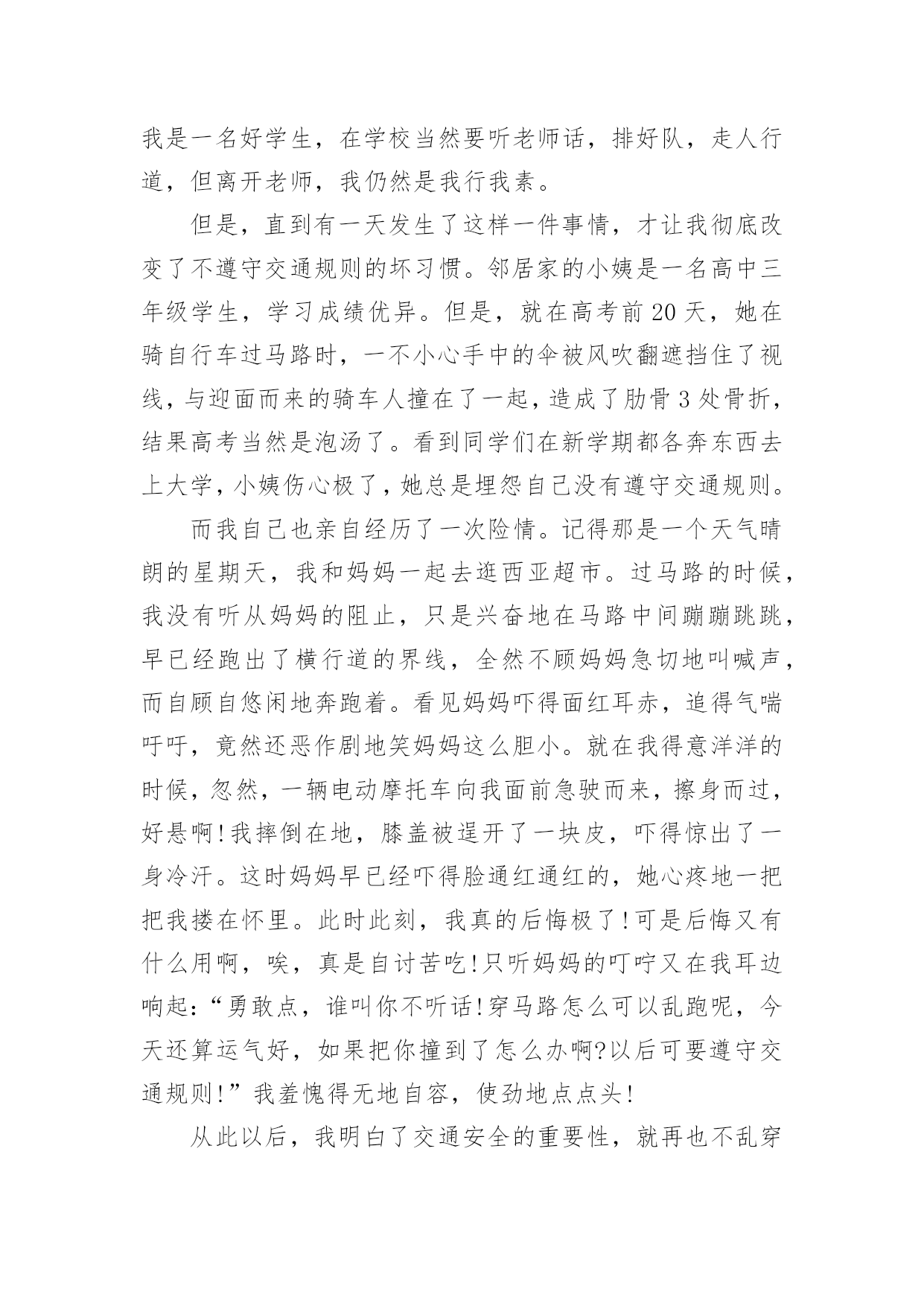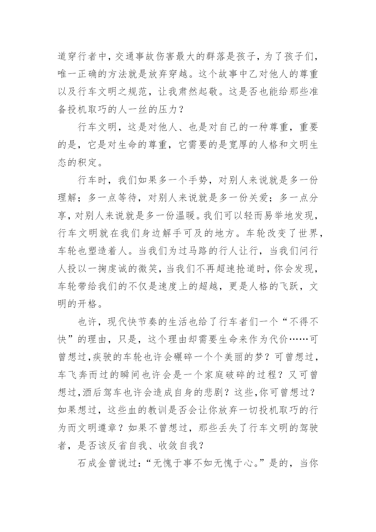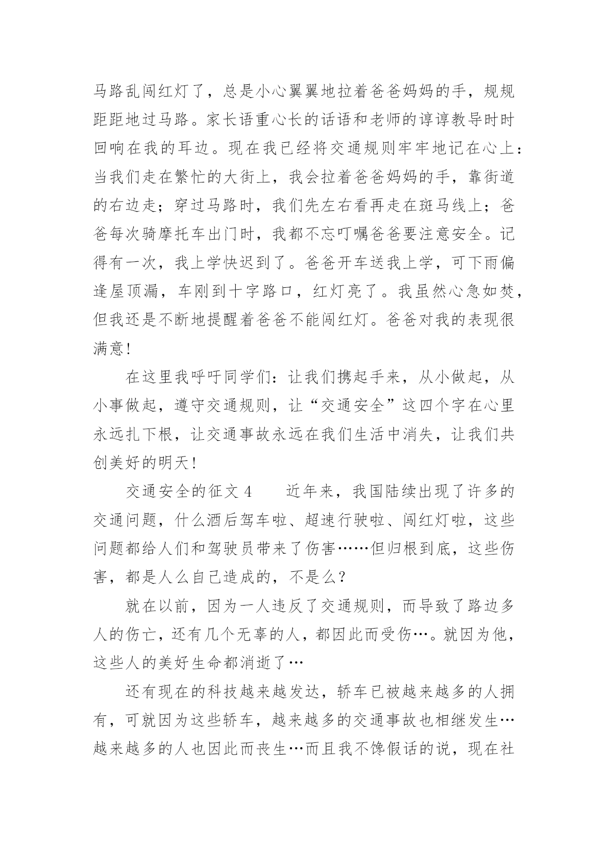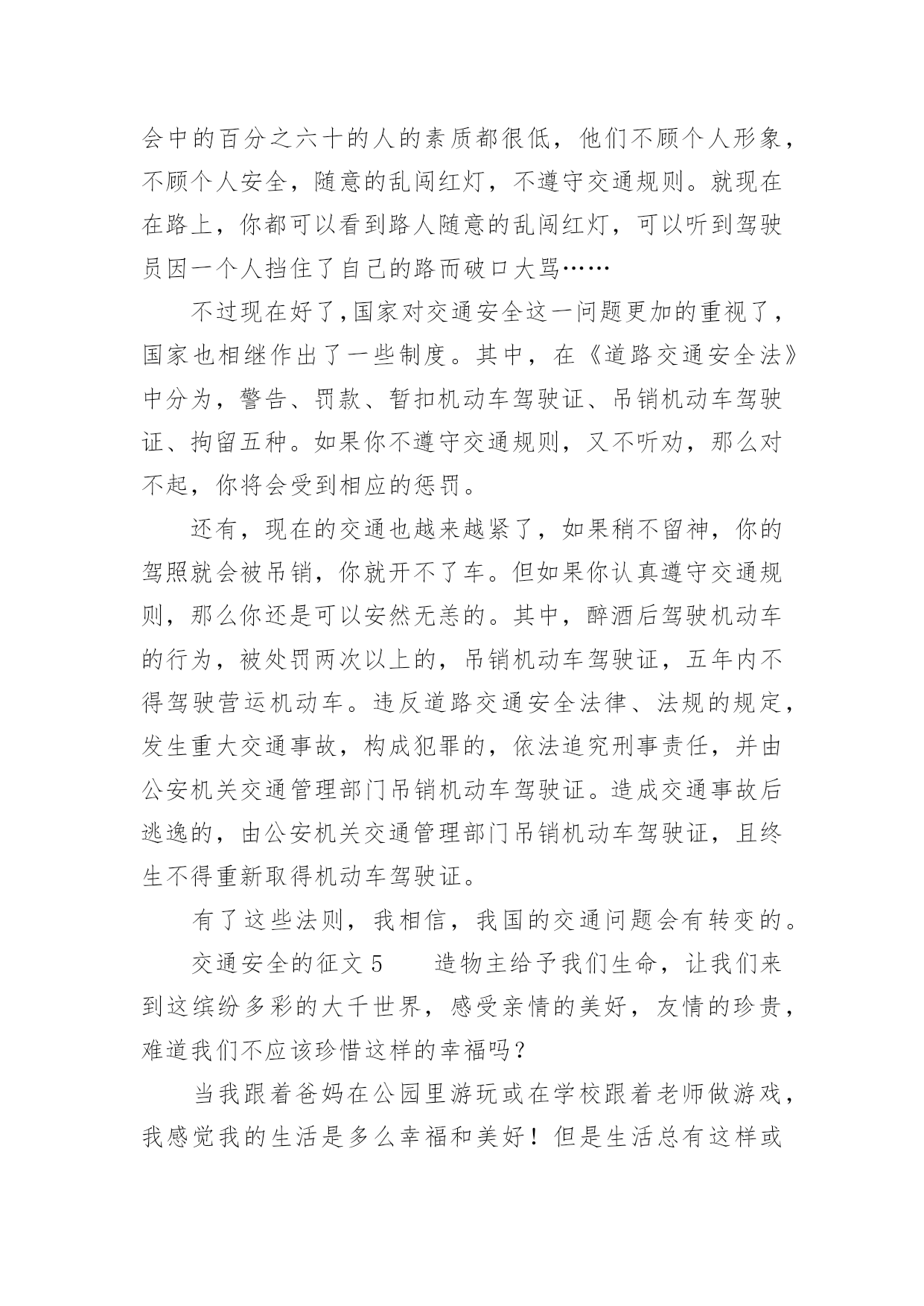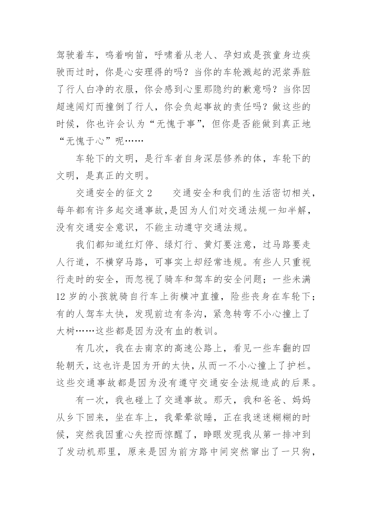交通安全的征文交通安全的征文(精选15篇)在日复一日的学习、工作或生活中,大家都有写征文的经历,对征文很是熟悉吧,征文是某个办事部门为了某个活动公开向社会征集的有关文章。你所见过的征文是什么样的呢?下面是小编收集整理的交通安全的征文(精选15篇),欢迎阅读与收藏。交通安全的征文1在街道上,你是否会经常看见按着喇叭,踩着油门,从你身边呼啸而去的“奔驰”?在雨天里,你是否曾被急驶的汽车溅起的泥水弄湿了衣服?在步行街,你又是否曾被超速行驶的驾驶员破口大骂不长眼睛?有车一族,也是有“脾气”、有“个性”的一族。他们忙着抢道,忙着闯红灯,忙着速度的提升,却无暇顾及车轮下的文明。车轮改变了世界,车轮却同时地享有“特权”。那些争分夺秒的驾驶者,那些在行人面前张狂地按喇叭,横冲直撞的驾驶员,甚至示意行人为车让路的司机,他们作为行车者最基本的文明早已被践踏在车轮下。或许,在这些抛弃了行车文明的人们心里,车不仅仅是他们的一种代步工具,更是他们权力的象征以及炫耀强霸的资本。只是,那些享受着舒适的车的行车者有什么理由和行人争抢呢?曾在书上看到这样一个故事:甲和乙在一个路口等红灯,甲说,这里人少,极目左右根本没有车辆的影子,冲着红灯穿过去不会有任何危险,干吗规规矩矩地等?乙解释道:街道穿行者中,交通事故伤害最大的群落是孩子,为了孩子们,唯一正确的方法就是放弃穿越。这个故事中乙对他人的尊重以及行车文明之规范,让我肃然起敬。这是否也能给那些准备投机取巧的人一丝的压力?行车文明,这是对他人、也是对自己的一种尊重,重要的是,它是对生命的尊重,它需要的是宽厚的人格和文明生态的积定。行车时,我们如果多一个手势,对别人来说就是多一份理解;多一点等待,对别人来说就是多一份关爱;多一点分享,对别人来说就是多一份温暖。我们可以轻而易举地发现,行车文明就在我们身边解手可及的地方。车轮改变了世界,车轮也塑造着人。当我们为过马路的行人让行,当我们问行人投以一掬虔诚的微笑,当我们不再超速抢道时,你会发现,车轮带给我们的不仅是速度上的超越,更是人格的飞跃,文明的开格。也许,现代快节奏的生活也给了行车者们一个“不得不快”的理由,只是,这个理由却需要生命来作为代价……可曾想过,疾驶的车轮也许会碾碎一个个美丽的梦?可曾想过,车飞奔而过的瞬间也许会是一个家庭破碎的过程?又可曾想过,酒后驾车也许会造成自身的悲剧?这些,你可曾想过?如果想过,这些血的教训是否会让你放弃一切投机取巧的行为而文明遵章?如果不曾想过,那些丢失了行车文明的驾驶者,是否该反省自我、收敛自我?石成金曾说过:“无愧于事不如无愧于心。”是的,当你驾驶着车,鸣着响笛,呼啸着从老人、孕妇或是孩童身边疾驶而过时,你是心安理得的吗?当你的车轮溅起的泥浆弄脏了行人白净的衣服,你会感到心里那隐约的歉意吗?当你因超速闯灯而撞倒了行人,你会负起事故的责任吗?做这些的时候,你也许会认为“无愧于事”,但你是否能做到真正地“无愧于心”呢……车轮下的文明,是行车者自身深层修养的体,车轮下的文明,是真正的文明。交通安全的征文2交通安全和我们的生活密切相关,每年都有许多起交通事故,是因为人们对交通法规一知半解,没有交通安全意识,不能主动遵守交通法规。我们都知道红灯停、绿灯行、黄灯要注意,过马路要走人行道,不横穿马路,可事实上却经常违规。有些人只重视行走时的安全,而忽视了骑车和驾车的安全问题;一些未满12岁的小孩就骑自行车上街横冲直撞,险些丧身在车轮下;有的人驾车太快,发现前边有条沟,紧急转弯不小心撞上了大树……这些都是因为没有血的教训。有几次,我在去南京的高速公路上,看见一些车翻的四轮朝天,这也许是因为开的太快,从而一不小心撞上了护栏。这些交通事故都是因为没有遵守交通安全法规造成的后果。有一次,我也碰上了交通事故。那天,我和爸爸、妈妈从乡下回来,坐在车上,我晕晕欲睡,正在我迷迷糊糊的时候,突然我因重心失控而惊醒了,睁眼发现我从第一排冲到了发动机那里,原来是因为前方路中间突然窜出了一只狗,而司机开的太快,一时无法避让,便采取急刹车,结果险些撞上路边的大树,还差点掉入沟中了。因为这个紧急刹车,车上的人儿几乎都被撞伤了,我不仅手擦破皮了,走路也一瘸一拐的,妈妈膝盖也破了,爸爸被撞到车前面的栏杆上,两眼只冒金星,真是惊心动魄啊!上学期,学校做了一期关于交通事故方面的图片展,上面是因为交通事故而造成死亡的血淋淋的事实,有大人,有小孩,看过后给了我很大的震动,到现在还记忆犹新!经查阅有关数据表明:中国每年死于交通事故人数达10万人,位居世界第一;平均每5分钟就有1人丧身车轮,每1分钟都会有1人因为交通事故而伤残,每年因交通事故所造成的经济损失达几百亿元!这些触目惊心的数字以及可怕、血淋淋的事实,难道还不能引起大家足够的重视吗?为了我们的生命,让我们把交通安全放在心