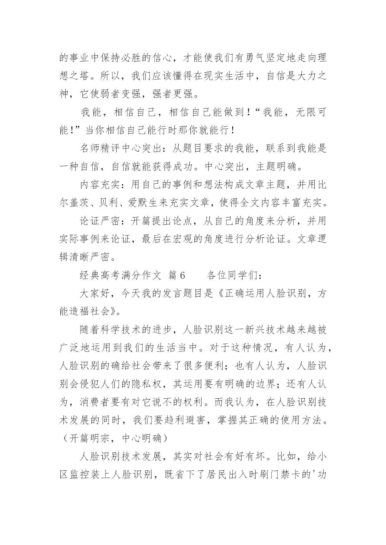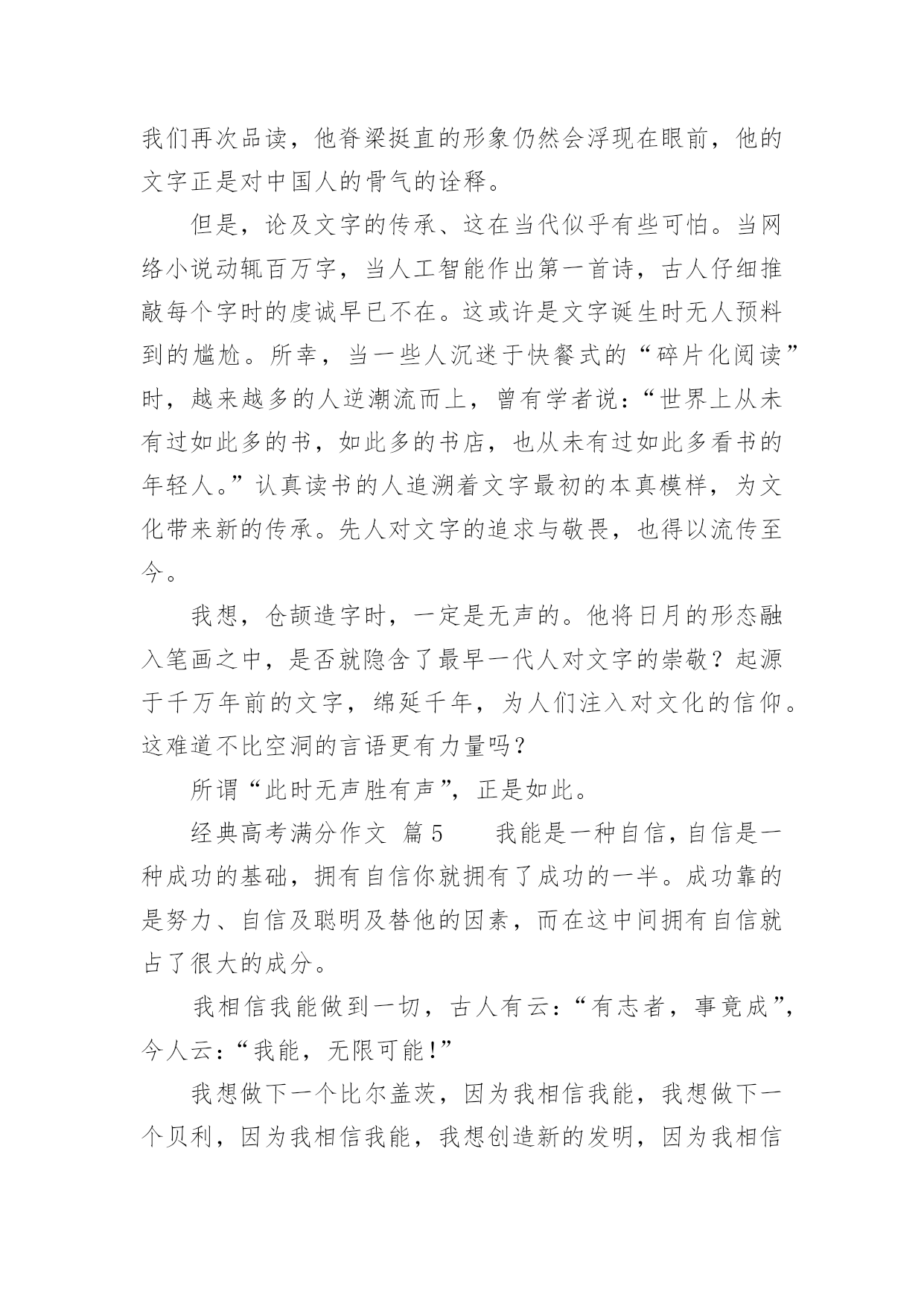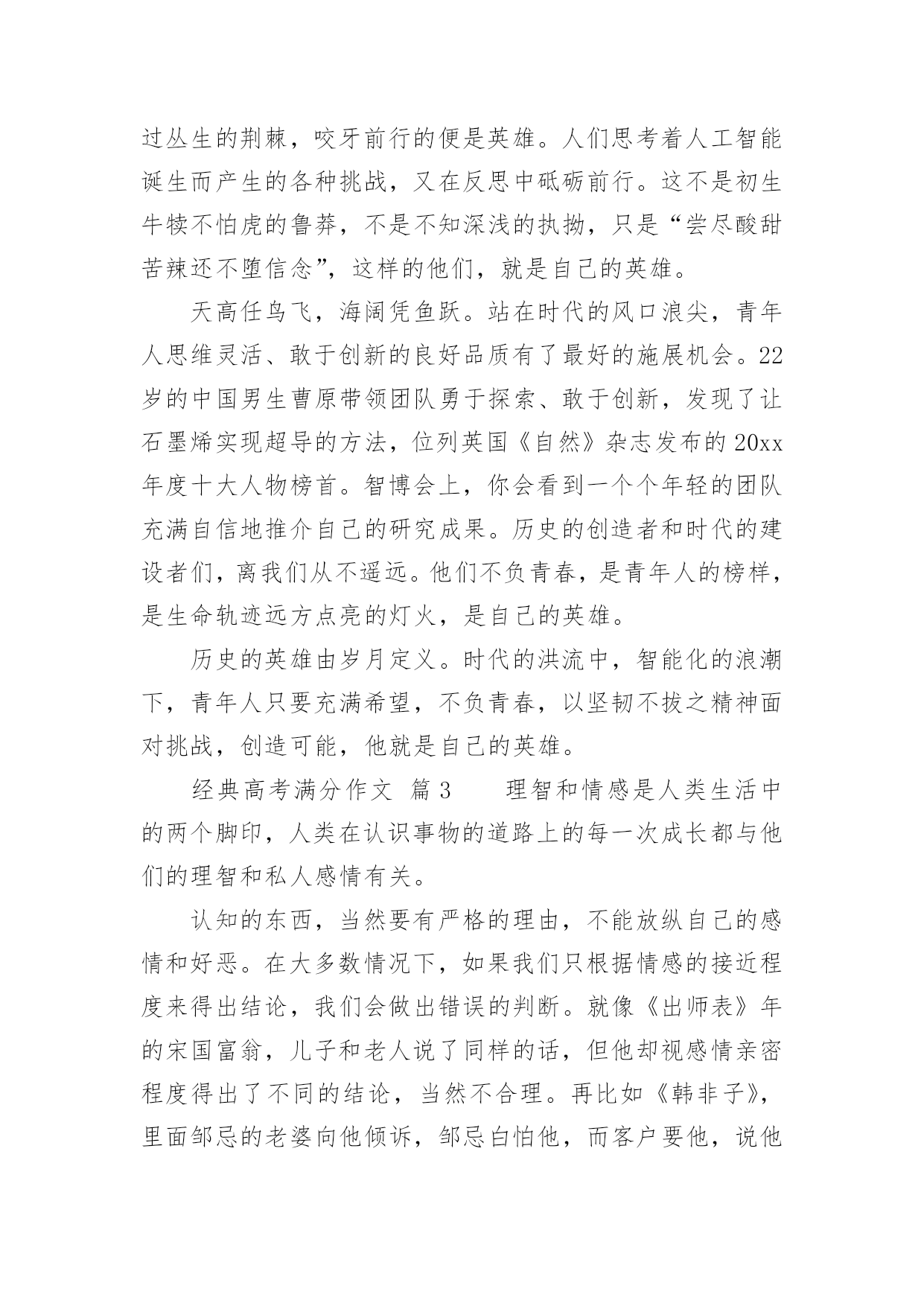 经典高考满分作文经典高考满分作文在日复一日的学习、工作或生活中,大家都不可避免地要接触到作文吧,作文是从内部言语向外部言语的过渡,即从经过压缩的简要的、自己能明白的语言,向开展的、具有规范语法结构的、能为他人所理解的外部语言形式的转化。写起作文来就毫无头绪?以下是小编收集整理的经典高考满分作文,仅供参考,希望能够帮助到大家。经典高考满分作文篇1每一个有着纯粹情感的人,心里都有一首情歌,美好的,悲伤的,激动人心的,让人着迷的。一个带着淡淡的烟和愁的女人,注定比别人有更细腻的忧伤,比别人有淡淡的忧伤。总是很容易被一些伤心的事感动,突然感动到最低的眼泪。一颗温柔的心变得如此敏感脆弱。在爱情的世界里,每个人都有自己致命的弱点。爱情是人生的插曲,也是悲伤的浪漫。昨天你那么爱我,今天你在哪里?一开始笑得最好,最后哭得最真实。这才是最真实的爱情。多少真爱被现实打败了,回忆只能证明他们爱过,却不能说明爱情可以白头偕老,不能挽回失去的.一切。时间没有留给任何人一张可以回头的票,我们只好一路走下去,连回头哀叹的时间都没有。我静静的活在世界的角落里,疏远世界上的一切,那些擦肩而过的人在突然想起的瞬间。艰难的一段时间后,我被一种低落的情绪入侵和淹没。我的世界,你的世界,快乐和悲伤不再交换,挥手就是永远…谁是谁的风景,谁是谁的过客是注定的。如果你握了他的手呢?你拥抱他的一切呢?最后,是指尖的灰尘.一个人在痛苦的时候,总是想办法麻痹自己,麻木自己所有的神经,让自己瞬间忘记痛苦和毁灭。暮色中,眼底突然流淌着一股酸楚的感觉。有些东西,在遥远的时候,注定会在心里留下不可磨灭的伤痕。在心底的角落里给自己找一个美好的地方,再美好的话语也唤不回温暖的怀抱。心里的美好不舍得走远,该存放在哪里?一段爱情分开了,就散了,沸腾的心变成了一滩死水。缓解痛苦的唯一方法就是安静悲伤。爱是美丽的悲伤,爱是甜蜜的心碎。看着一个熟悉的身影,我终于消失在我的视线里,嘴唇颤抖,心里却无言。我爱忘记自己,有一天从那个疯狂的爱情梦里醒来,发现身心伤痕累累。曾经祈祷自己永远不要输,现在已经输了。无法改变的结局,无法持久的燃烧,深深的情意,都是早已拟定的结局。斑驳的情话褪入旧记忆,贴在胸口找不到当时跳动的感觉。相反,它们是微弱的痉挛。经典高考满分作文篇2科技的发展日新月异,21世纪,智能化发展大势所趋。如今的青年,站在更高的起点,所见的是更辽阔的远方。就应在这风起云涌之时,做时代的弄潮儿,直面挑战,做自己的英雄。互联网、大数据、物联网和人工智能等技术的发展,为人们追求更高效、更便捷的生产生活方式提供了技术支持。智能化的发展成果已广泛应用于各个领域。“会看”“会听”“会说”“能思维”的智能武器装备日夜保卫着国家安全。汽车生产车间内,有“人”举起一吨重的车身,有“人”为车身打孔,还有“人”负责焊接。新型的智能家居系统已经能为人们提供便捷舒适的'生活,主人到家,房子已经替你开好了空调,调好了光线,甚至做好了晚餐。还有智能教育产品、通讯产品等等,不胜枚举。智能发展方兴未艾,20xx年,全国多地举办了不同层次、不同领域的智博会,以交流智慧成果。相比其他领域,智能化领域对思维能力和创新能力有着更高的要求。而这两点,在青年人的身上体现的尤为明显。因此,青年人是这个风起云涌的智能时代的弄潮儿。智能化给人们带来诸多欣喜的同时,也给人类自身带来了艰巨的甚至无法跨越的挑战。青年人要认清一点,那就是,人类某些机能的极限或许无法超越智能产品,但是智能产品本身就是人类智慧的结晶。当我们无法超越的时候,就要调整心态,与智能化共同进步,相互促进。柯洁两度败给人工智能,中盘落泪离席,调整心态后又回到棋局,直面失败。那稚嫩却刚毅的背影诠释了英雄的概念:不以成败定义,穿过丛生的荆棘,咬牙前行的便是英雄。人们思考着人工智能诞生而产生的各种挑战,又在反思中砥砺前行。这不是初生牛犊不怕虎的鲁莽,不是不知深浅的执拗,只是“尝尽酸甜苦辣还不堕信念”,这样的他们,就是自己的英雄。天高任鸟飞,海阔凭鱼跃。站在时代的风口浪尖,青年人思维灵活、敢于创新的良好品质有了最好的施展机会。22岁的中国男生曹原带领团队勇于探索、敢于创新,发现了让石墨烯实现超导的方法,位列英国《自然》杂志发布的20xx年度十大人物榜首。智博会上,你会看到一个个年轻的团队充满自信地推介自己的研究成果。历史的创造者和时代的建设者们,离我们从不遥远。他们不负青春,是青年人的榜样,是生命轨迹远方点亮的灯火,是自己的英雄。历史的英雄由岁月定义。时代的洪流中,智能化的浪潮下,青年人只要充满希望,不负青春,以坚韧不拔之精神面对挑战,创造可能,他就是自己的英雄。经典高考满分作文篇3理智和情感是人类生活中的两个脚印,人类在认识事物的道路上的每一次成长都与他们的理智和私人感情有关。认知的东西,当
