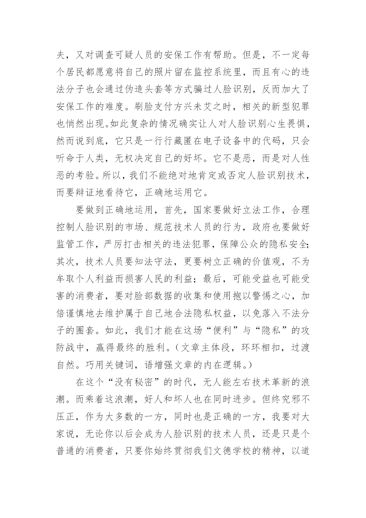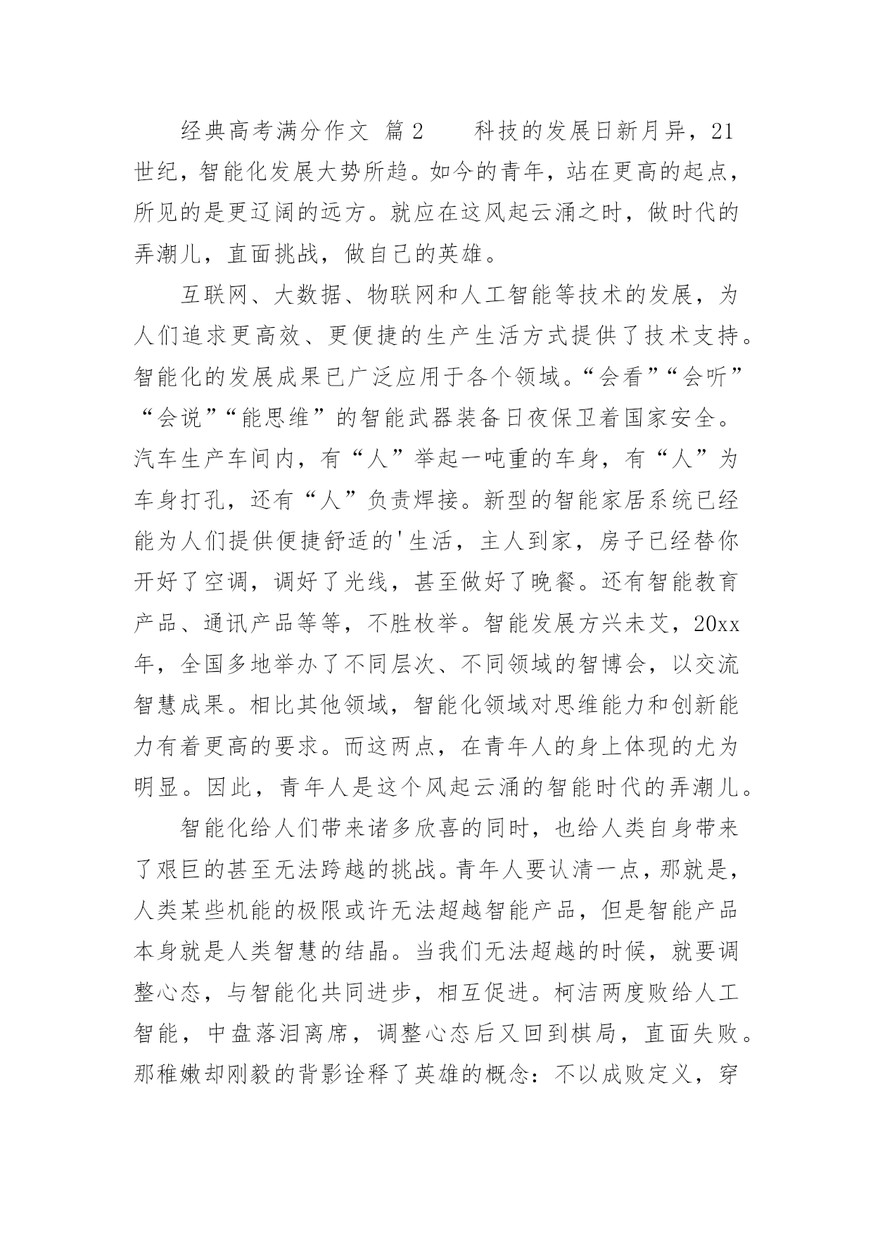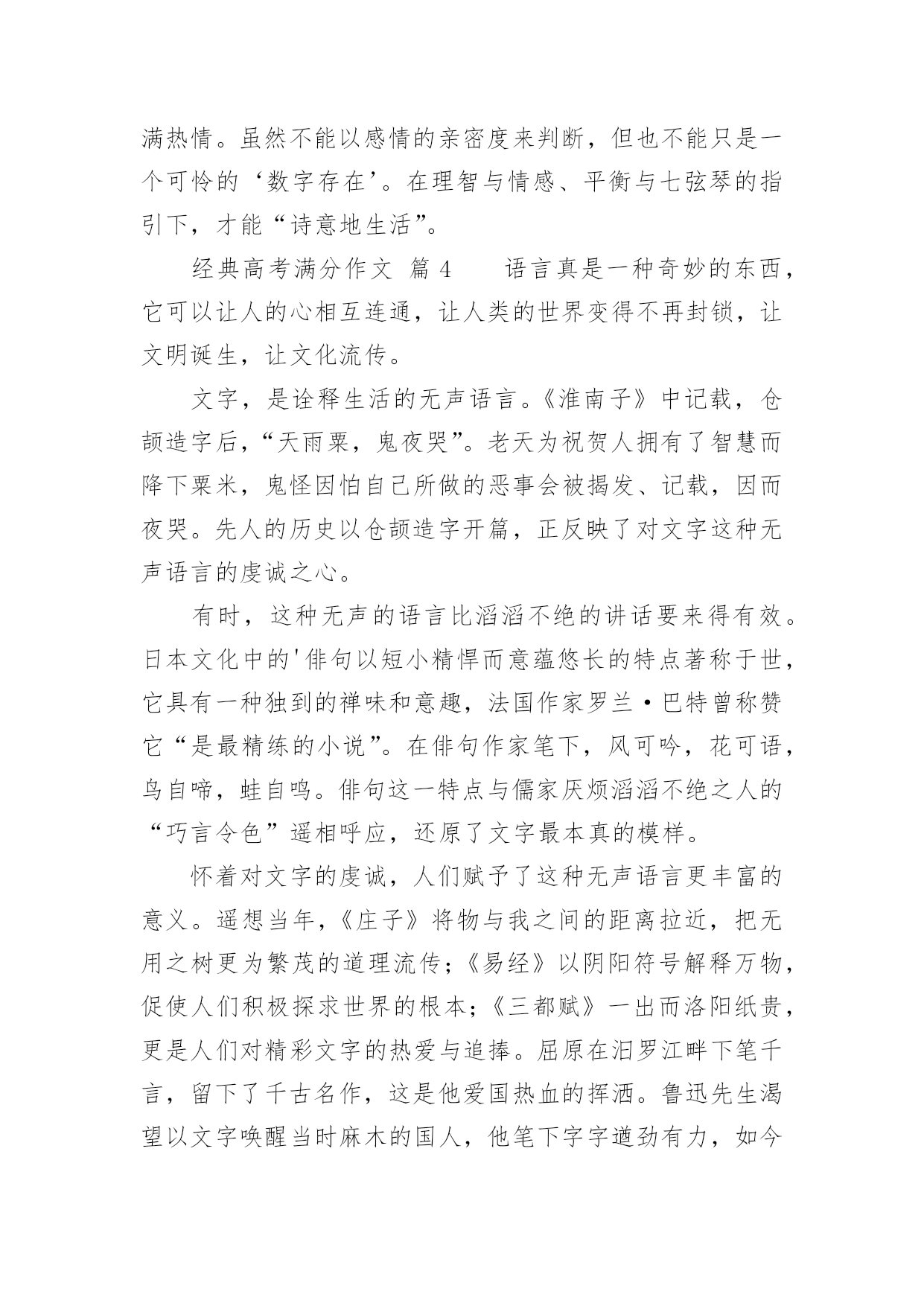 经典高考满分作文经典高考满分作文在日复一日的学习、工作或生活中,大家都不可避免地要接触到作文吧,作文是从内部言语向外部言语的过渡,即从经过压缩的简要的、自己能明白的语言,向开展的、具有规范语法结构的、能为他人所理解的外部语言形式的转化。写起作文来就毫无头绪?以下是小编收集整理的经典高考满分作文,仅供参考,希望能够帮助到大家。经典高考满分作文篇1每一个有着纯粹情感的人,心里都有一首情歌,美好的,悲伤的,激动人心的,让人着迷的。一个带着淡淡的烟和愁的女人,注定比别人有更细腻的忧伤,比别人有淡淡的忧伤。总是很容易被一些伤心的事感动,突然感动到最低的眼泪。一颗温柔的心变得如此敏感脆弱。在爱情的世界里,每个人都有自己致命的弱点。爱情是人生的插曲,也是悲伤的浪漫。昨天你那么爱我,今天你在哪里?一开始笑得最好,最后哭得最真实。这才是最真实的爱情。多少真爱被现实打败了,回忆只能证明他们爱过,却不能说明爱情可以白头偕老,不能挽回失去的.一切。时间没有留给任何人一张可以回头的票,我们只好一路走下去,连回头哀叹的时间都没有。我静静的活在世界的角落里,疏远世界上的一切,那些擦肩而过的人在突然想起的瞬间。艰难的一段时间后,我被一种低落的情绪入侵和淹没。我的世界,你的世界,快乐和悲伤不再交换,挥手就是永远…谁是谁的风景,谁是谁的过客是注定的。如果你握了他的手呢?你拥抱他的一切呢?最后,是指尖的灰尘.一个人在痛苦的时候,总是想办法麻痹自己,麻木自己所有的神经,让自己瞬间忘记痛苦和毁灭。暮色中,眼底突然流淌着一股酸楚的感觉。有些东西,在遥远的时候,注定会在心里留下不可磨灭的伤痕。在心底的角落里给自己找一个美好的地方,再美好的话语也唤不回温暖的怀抱。心里的美好不舍得走远,该存放在哪里?一段爱情分开了,就散了,沸腾的心变成了一滩死水。缓解痛苦的唯一方法就是安静悲伤。爱是美丽的悲伤,爱是甜蜜的心碎。看着一个熟悉的身影,我终于消失在我的视线里,嘴唇颤抖,心里却无言。我爱忘记自己,有一天从那个疯狂的爱情梦里醒来,发现身心伤痕累累。曾经祈祷自己永远不要输,现在已经输了。无法改变的结局,无法持久的燃烧,深深的情意,都是早已拟定的结局。斑驳的情话褪入旧记忆,贴在胸口找不到当时跳动的感觉。相反,它们是微弱的痉挛。经典高考满分作文篇2科技的发展日新月异,21世纪,智能化发展大势所趋。如今的青年,站在更高的起点,所见的是更辽阔的远方。就应在这风起云涌之时,做时代的弄潮儿,直面挑战,做自己的英雄。互联网、大数据、物联网和人工智能等技术的发展,为人们追求更高效、更便捷的生产生活方式提供了技术支持。智能化的发展成果已广泛应用于各个领域。“会看”“会听”“会说”“能思维”的智能武器装备日夜保卫着国家安全。汽车生产车间内,有“人”举起一吨重的车身,有“人”为车身打孔,还有“人”负责焊接。新型的智能家居系统已经能为人们提供便捷舒适的'生活,主人到家,房子已经替你开好了空调,调好了光线,甚至做好了晚餐。还有智能教育产品、通讯产品等等,不胜枚举。智能发展方兴未艾,20xx年,全国多地举办了不同层次、不同领域的智博会,以交流智慧成果。相比其他领域,智能化领域对思维能力和创新能力有着更高的要求。而这两点,在青年人的身上体现的尤为明显。因此,青年人是这个风起云涌的智能时代的弄潮儿。智能化给人们带来诸多欣喜的同时,也给人类自身带来了艰巨的甚至无法跨越的挑战。青年人要认清一点,那就是,人类某些机能的极限或许无法超越智能产品,但是智能产品本身就是人类智慧的结晶。当我们无法超越的时候,就要调整心态,与智能化共同进步,相互促进。柯洁两度败给人工智能,中盘落泪离席,调整心态后又回到棋局,直面失败。那稚嫩却刚毅的背影诠释了英雄的概念:不以成败定义,穿过丛生的荆棘,咬牙前行的便是英雄。人们思考着人工智能诞生而产生的各种挑战,又在反思中砥砺前行。这不是初生牛犊不怕虎的鲁莽,不是不知深浅的执拗,只是“尝尽酸甜苦辣还不堕信念”,这样的他们,就是自己的英雄。天高任鸟飞,海阔凭鱼跃。站在时代的风口浪尖,青年人思维灵活、敢于创新的良好品质有了最好的施展机会。22岁的中国男生曹原带领团队勇于探索、敢于创新,发现了让石墨烯实现超导的方法,位列英国《自然》杂志发布的20xx年度十大人物榜首。智博会上,你会看到一个个年轻的团队充满自信地推介自己的研究成果。历史的创造者和时代的建设者们,离我们从不遥远。他们不负青春,是青年人的榜样,是生命轨迹远方点亮的灯火,是自己的英雄。历史的英雄由岁月定义。时代的洪流中,智能化的浪潮下,青年人只要充满希望,不负青春,以坚韧不拔之精神面对挑战,创造可能,他就是自己的英雄。经典高考满分作文篇3理智和情感是人类生活中的两个脚印,人类在认识事物的道路上的每一次成长都与他们的理智和私人感情有关。认知的东西,当