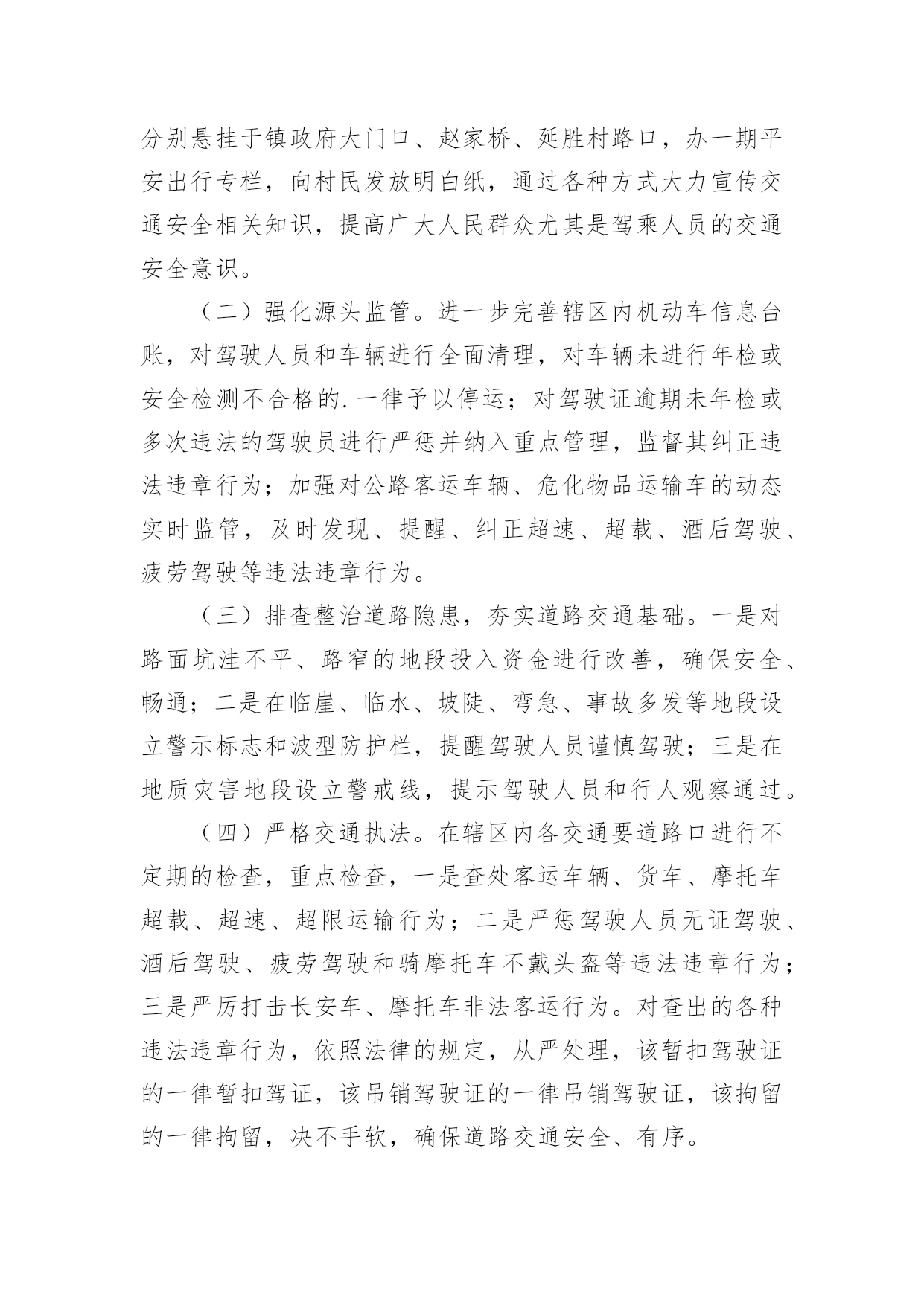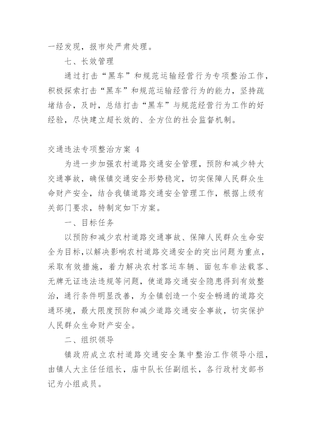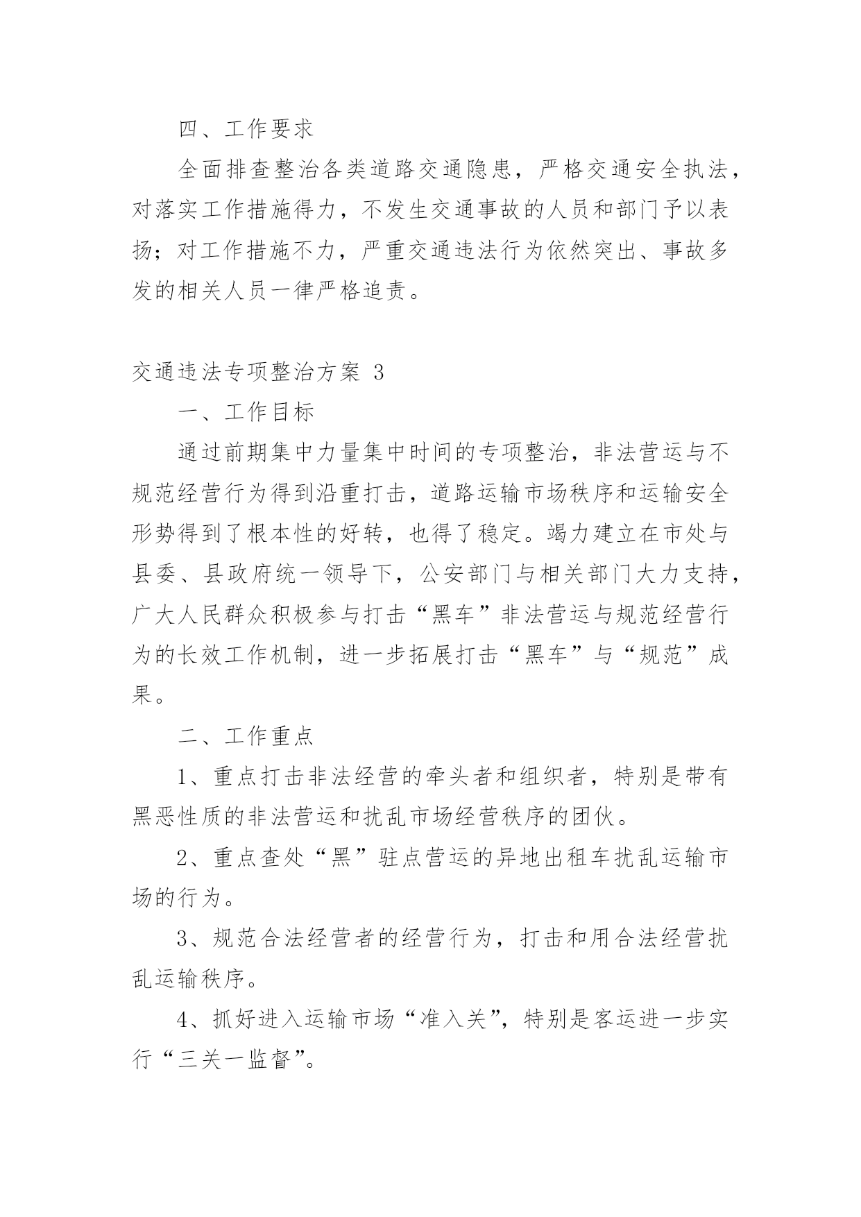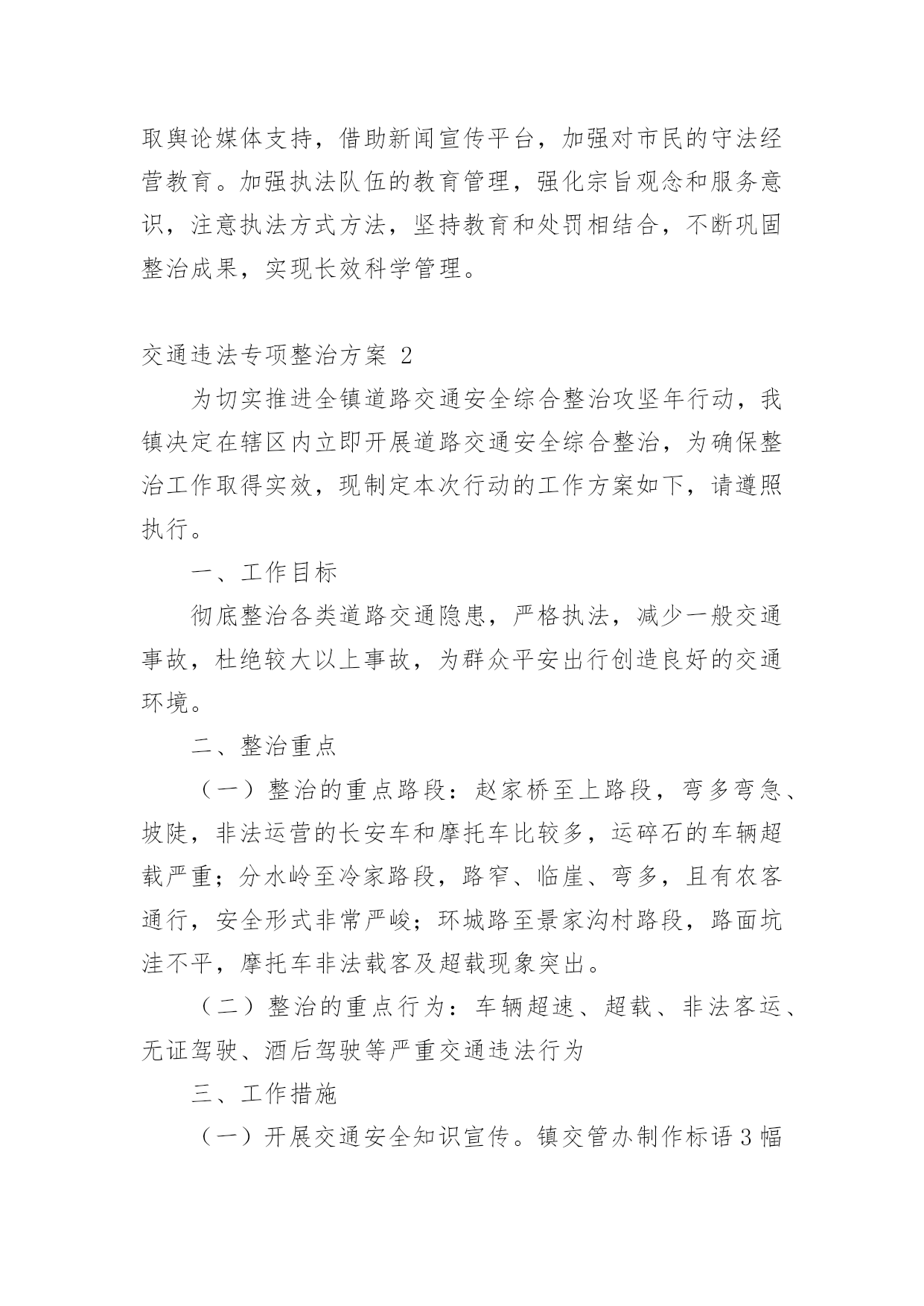 交通违法专项整治方案交通违法专项整治方案(精选22篇)为了保障事情或工作顺利、圆满进行,常常需要提前制定一份优秀的方案,方案是书面计划,具有内容条理清楚、步骤清晰的特点。那么应当如何制定方案呢?以下是小编帮大家整理的交通违法专项整治方案,仅供参考,希望能够帮助到大家。交通违法专项整治方案1为进一步做好道路交通安全隐患排查工作,为广大市民出行提供安全有序的市容环境,现根据市政府要求,制定整治方案如下。一、整治内容1、实验中学路口早市占道问题;2、民政局路口集市占道问题;3、县东街集市占道问题;4、文化东街与教育路南门集市占道问题。二、整治标准1、对于按照《市区摊点设置导则》审批设置的摊位,一律规范到路边石以上进行经营,占道集市实行划线定位、越界处罚。对不按规定地点、时限、面积经营的业户,依法取消其经营资格。2、对于未经审批,擅自摆摊的行为进行严肃查处取缔,引导流动摊进入附近市场经营。三、工作措施一是严格考核,强化工作责任落实。局市容中队按照辖区范围进行工作分工,使责任落实到组、到人,严格工作考核制度,局督查考核小组定期将市容管理工作中存在的问题进行通报、复查,确保各项问题整改落实到位。二是严把死守,加大执法工作力度。对存在道路交通安全隐患的重点路段、重点部位派专人进行督导管理,严把死守,使占道经营现象不出现反弹、回潮。三是严管重罚,严厉查处非法占道行为。对影响道路交通安全的`占道经营和违规设摊现象,我局将严格按照《城市容貌和环境卫生管理条例》的相关规定,依法实施行政处罚,以确保市区环境规范有序,城市道路安全畅通。四、相关要求(一)加强组织领导。为加强对整治活动的组织领导,局党委成立由主要领导任组长、各副局长为副组长、各中队长、科室负责人为成员的领导小组,具体负责整治活动的组织协调,强化工作措施,确保整治活动取得预期成效。(二)确保完成时限。集中整治领导小组每周召开一次会议,及时发现和解决实际问题,研究对策和措施。督查科要根据阶段性工作重点,加大考核力度,同时将阶段性工作成果及时汇总分析,通报工作进展情况,保证各项问题的整治工作于6月底前落实到位。(三)加强长效管理。不断加大城市管理宣传力度,争取舆论媒体支持,借助新闻宣传平台,加强对市民的守法经营教育。加强执法队伍的教育管理,强化宗旨观念和服务意识,注意执法方式方法,坚持教育和处罚相结合,不断巩固整治成果,实现长效科学管理。交通违法专项整治方案2为切实推进全镇道路交通安全综合整治攻坚年行动,我镇决定在辖区内立即开展道路交通安全综合整治,为确保整治工作取得实效,现制定本次行动的工作方案如下,请遵照执行。一、工作目标彻底整治各类道路交通隐患,严格执法,减少一般交通事故,杜绝较大以上事故,为群众平安出行创造良好的交通环境。二、整治重点(一)整治的重点路段:赵家桥至上路段,弯多弯急、坡陡,非法运营的长安车和摩托车比较多,运碎石的车辆超载严重;分水岭至冷家路段,路窄、临崖、弯多,且有农客通行,安全形式非常严峻;环城路至景家沟村路段,路面坑洼不平,摩托车非法载客及超载现象突出。(二)整治的重点行为:车辆超速、超载、非法客运、无证驾驶、酒后驾驶等严重交通违法行为三、工作措施(一)开展交通安全知识宣传。镇交管办制作标语3幅分别悬挂于镇政府大门口、赵家桥、延胜村路口,办一期平安出行专栏,向村民发放明白纸,通过各种方式大力宣传交通安全相关知识,提高广大人民群众尤其是驾乘人员的交通安全意识。(二)强化源头监管。进一步完善辖区内机动车信息台账,对驾驶人员和车辆进行全面清理,对车辆未进行年检或安全检测不合格的.一律予以停运;对驾驶证逾期未年检或多次违法的驾驶员进行严惩并纳入重点管理,监督其纠正违法违章行为;加强对公路客运车辆、危化物品运输车的动态实时监管,及时发现、提醒、纠正超速、超载、酒后驾驶、疲劳驾驶等违法违章行为。(三)排查整治道路隐患,夯实道路交通基础。一是对路面坑洼不平、路窄的地段投入资金进行改善,确保安全、畅通;二是在临崖、临水、坡陡、弯急、事故多发等地段设立警示标志和波型防护栏,提醒驾驶人员谨慎驾驶;三是在地质灾害地段设立警戒线,提示驾驶人员和行人观察通过。(四)严格交通执法。在辖区内各交通要道路口进行不定期的检查,重点检查,一是查处客运车辆、货车、摩托车超载、超速、超限运输行为;二是严惩驾驶人员无证驾驶、酒后驾驶、疲劳驾驶和骑摩托车不戴头盔等违法违章行为;三是严厉打击长安车、摩托车非法客运行为。对查出的各种违法违章行为,依照法律的规定,从严处理,该暂扣驾驶证的一律暂扣驾证,该吊销驾驶证的一律吊销驾驶证,该拘留的一律拘留,决不手软,确保道路交通安全、有序。四、工作要求全面排查整治各类道路交通隐患,严格交通安全执法,对落实工作措施得力,不发生交通事故的人员和部门予以表扬;对工作措施不力,严