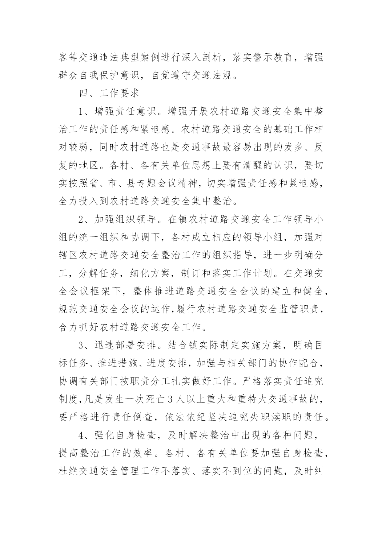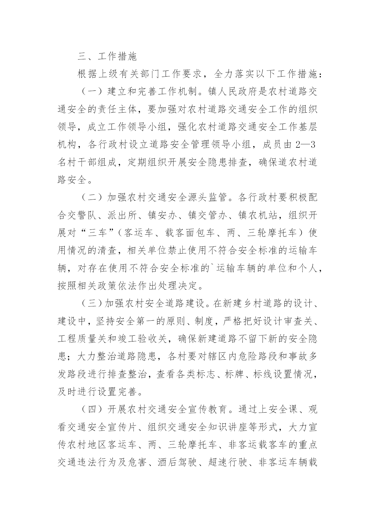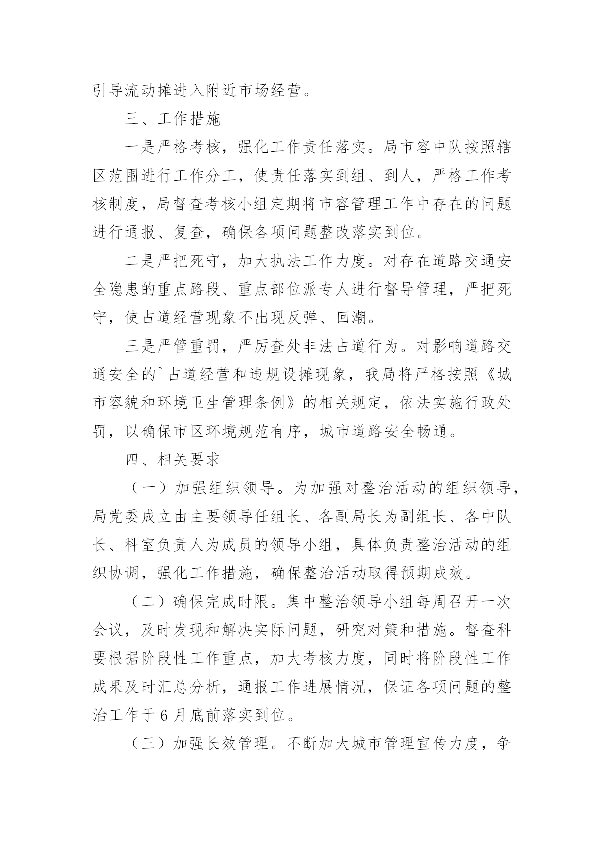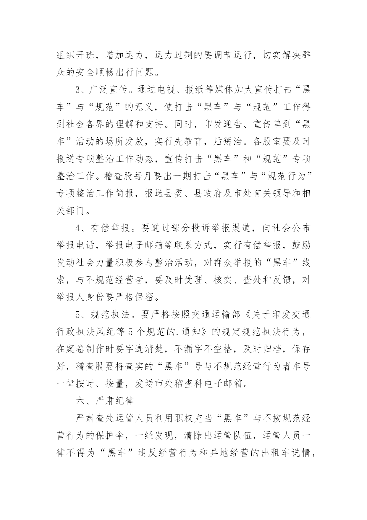 交通违法专项整治方案交通违法专项整治方案(精选22篇)为了保障事情或工作顺利、圆满进行,常常需要提前制定一份优秀的方案,方案是书面计划,具有内容条理清楚、步骤清晰的特点。那么应当如何制定方案呢?以下是小编帮大家整理的交通违法专项整治方案,仅供参考,希望能够帮助到大家。交通违法专项整治方案1为进一步做好道路交通安全隐患排查工作,为广大市民出行提供安全有序的市容环境,现根据市政府要求,制定整治方案如下。一、整治内容1、实验中学路口早市占道问题;2、民政局路口集市占道问题;3、县东街集市占道问题;4、文化东街与教育路南门集市占道问题。二、整治标准1、对于按照《市区摊点设置导则》审批设置的摊位,一律规范到路边石以上进行经营,占道集市实行划线定位、越界处罚。对不按规定地点、时限、面积经营的业户,依法取消其经营资格。2、对于未经审批,擅自摆摊的行为进行严肃查处取缔,引导流动摊进入附近市场经营。三、工作措施一是严格考核,强化工作责任落实。局市容中队按照辖区范围进行工作分工,使责任落实到组、到人,严格工作考核制度,局督查考核小组定期将市容管理工作中存在的问题进行通报、复查,确保各项问题整改落实到位。二是严把死守,加大执法工作力度。对存在道路交通安全隐患的重点路段、重点部位派专人进行督导管理,严把死守,使占道经营现象不出现反弹、回潮。三是严管重罚,严厉查处非法占道行为。对影响道路交通安全的`占道经营和违规设摊现象,我局将严格按照《城市容貌和环境卫生管理条例》的相关规定,依法实施行政处罚,以确保市区环境规范有序,城市道路安全畅通。四、相关要求(一)加强组织领导。为加强对整治活动的组织领导,局党委成立由主要领导任组长、各副局长为副组长、各中队长、科室负责人为成员的领导小组,具体负责整治活动的组织协调,强化工作措施,确保整治活动取得预期成效。(二)确保完成时限。集中整治领导小组每周召开一次会议,及时发现和解决实际问题,研究对策和措施。督查科要根据阶段性工作重点,加大考核力度,同时将阶段性工作成果及时汇总分析,通报工作进展情况,保证各项问题的整治工作于6月底前落实到位。(三)加强长效管理。不断加大城市管理宣传力度,争取舆论媒体支持,借助新闻宣传平台,加强对市民的守法经营教育。加强执法队伍的教育管理,强化宗旨观念和服务意识,注意执法方式方法,坚持教育和处罚相结合,不断巩固整治成果,实现长效科学管理。交通违法专项整治方案2为切实推进全镇道路交通安全综合整治攻坚年行动,我镇决定在辖区内立即开展道路交通安全综合整治,为确保整治工作取得实效,现制定本次行动的工作方案如下,请遵照执行。一、工作目标彻底整治各类道路交通隐患,严格执法,减少一般交通事故,杜绝较大以上事故,为群众平安出行创造良好的交通环境。二、整治重点(一)整治的重点路段:赵家桥至上路段,弯多弯急、坡陡,非法运营的长安车和摩托车比较多,运碎石的车辆超载严重;分水岭至冷家路段,路窄、临崖、弯多,且有农客通行,安全形式非常严峻;环城路至景家沟村路段,路面坑洼不平,摩托车非法载客及超载现象突出。(二)整治的重点行为:车辆超速、超载、非法客运、无证驾驶、酒后驾驶等严重交通违法行为三、工作措施(一)开展交通安全知识宣传。镇交管办制作标语3幅分别悬挂于镇政府大门口、赵家桥、延胜村路口,办一期平安出行专栏,向村民发放明白纸,通过各种方式大力宣传交通安全相关知识,提高广大人民群众尤其是驾乘人员的交通安全意识。(二)强化源头监管。进一步完善辖区内机动车信息台账,对驾驶人员和车辆进行全面清理,对车辆未进行年检或安全检测不合格的.一律予以停运;对驾驶证逾期未年检或多次违法的驾驶员进行严惩并纳入重点管理,监督其纠正违法违章行为;加强对公路客运车辆、危化物品运输车的动态实时监管,及时发现、提醒、纠正超速、超载、酒后驾驶、疲劳驾驶等违法违章行为。(三)排查整治道路隐患,夯实道路交通基础。一是对路面坑洼不平、路窄的地段投入资金进行改善,确保安全、畅通;二是在临崖、临水、坡陡、弯急、事故多发等地段设立警示标志和波型防护栏,提醒驾驶人员谨慎驾驶;三是在地质灾害地段设立警戒线,提示驾驶人员和行人观察通过。(四)严格交通执法。在辖区内各交通要道路口进行不定期的检查,重点检查,一是查处客运车辆、货车、摩托车超载、超速、超限运输行为;二是严惩驾驶人员无证驾驶、酒后驾驶、疲劳驾驶和骑摩托车不戴头盔等违法违章行为;三是严厉打击长安车、摩托车非法客运行为。对查出的各种违法违章行为,依照法律的规定,从严处理,该暂扣驾驶证的一律暂扣驾证,该吊销驾驶证的一律吊销驾驶证,该拘留的一律拘留,决不手软,确保道路交通安全、有序。四、工作要求全面排查整治各类道路交通隐患,严格交通安全执法,对落实工作措施得力,不发生交通事故的人员和部门予以表扬;对工作措施不力,严
