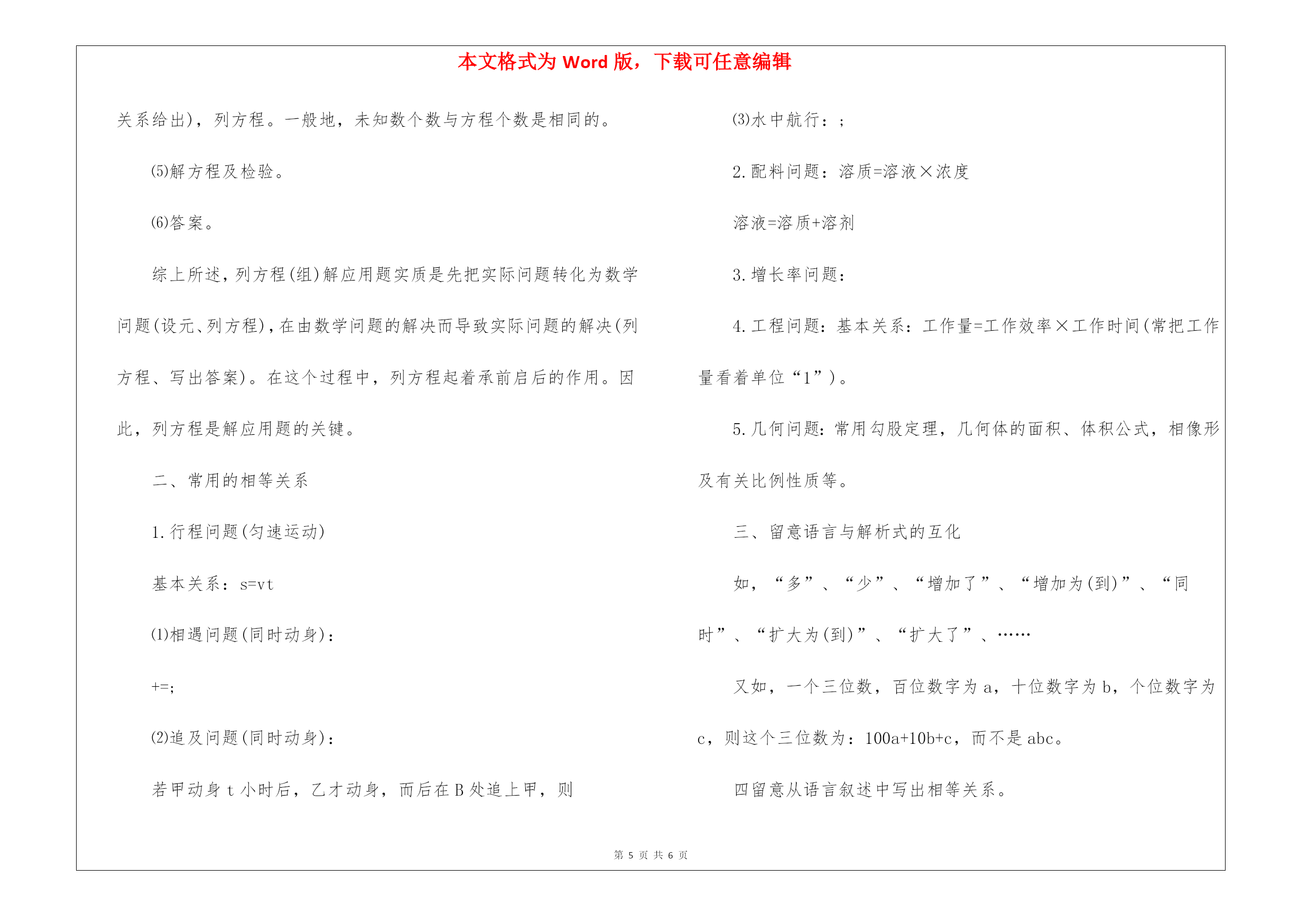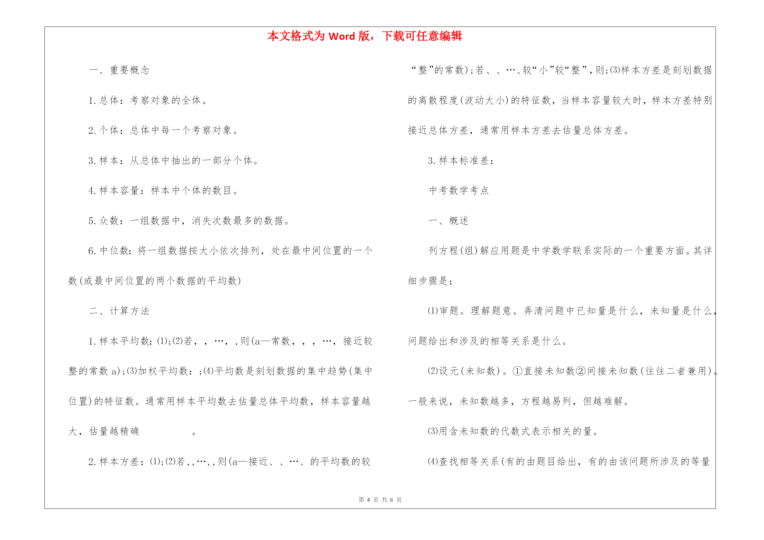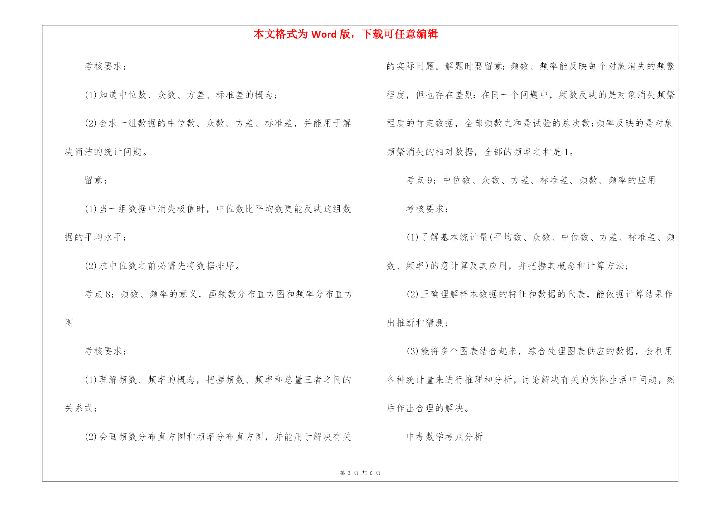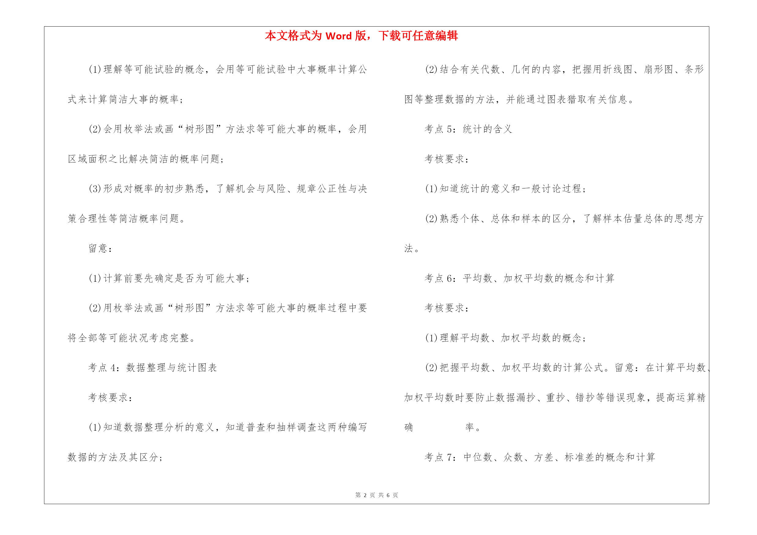 本文格式为Word版,下载可任意编辑第PAGE\*MERGEFORMAT6页共NUMPAGES\*MERGEFORMAT6页2021永州中考数学考点现时数学已包括多个分支.法国的布尔巴基学派则认为:数学,至少纯数学,是讨论抽象结构的理论。结构,就是以初始概念和公理动身的演绎系统。今日在这给大家整理了一些永州中考数学考点,我们一起来看看吧!永州中考数学考点考点1:确定大事和随机大事考核要求:(1)理解必定大事、不行能大事、随机大事的概念,知道确定大事与必定大事、不行能大事的关系;(2)能区分简洁生活大事中的必定大事、不行能大事、随机大事。考点2:大事发生的可能性大小,大事的概率考核要求:(1)知道各种大事发生的可能性大小不同,能推断一些随机大事发生的可能大事的大小并排出大小挨次;(2)知道概率的含义和表示符号,了解必定大事、不行能大事的概率和随机大事概率的取值范围;(3)理解随机大事发生的频率之间的区分和联系,会依据大数次试验所得频率估量大事的概率。留意:(1)在给可能性的大小排序前可先用“肯定发生”、“很有可能发生”、“可能发生”、“不太可能发生”、“肯定不会发生”等词语来表述大事发生的可能性的大小;(2)大事的概率是确定的常数,而概率是不确定的,可是近似值,与试验的次数的多少有关,只有当试验次数足够大时才能更精确。考点3:等可能试验中大事的概率问题及概率计算考核要求(1)理解等可能试验的概念,会用等可能试验中大事概率计算公式来计算简洁大事的概率;(2)会用枚举法或画“树形图”方法求等可能大事的概率,会用区域面积之比解决简洁的概率问题;(3)形成对概率的初步熟悉,了解机会与风险、规章公正性与决策合理性等简洁概率问题。留意:(1)计算前要先确定是否为可能大事;(2)用枚举法或画“树形图”方法求等可能大事的概率过程中要将全部等可能状况考虑完整。考点4:数据整理与统计图表考核要求:(1)知道数据整理分析的意义,知道普查和抽样调查这两种编写数据的方法及其区分;(2)结合有关代数、几何的内容,把握用折线图、扇形图、条形图等整理数据的方法,并能通过图表猎取有关信息。考点5:统计的含义考核要求:(1)知道统计的意义和一般讨论过程;(2)熟悉个体、总体和样本的区分,了解样本估量总体的思想方法。考点6:平均数、加权平均数的概念和计算考核要求:(1)理解平均数、加权平均数的概念;(2)把握平均数、加权平均数的计算公式。留意:在计算平均数、加权平均数时要防止数据漏抄、重抄、错抄等错误现象,提高运算精确 率。考点7:中位数、众数、方差、标准差的概念和计算考核要求:(1)知道中位数、众数、方差、标准差的概念;(2)会求一组数据的中位数、众数、方差、标准差,并能用于解决简洁的统计问题。留意:(1)当一组数据中消失极值时,中位数比平均数更能反映这组数据的平均水平;(2)求中位数之前必需先将数据排序。考点8:频数、频率的意义,画频数分布直方图和频率分布直方图考核要求:(1)理解频数、频率的概念,把握频数、频率和总量三者之间的关系式;(2)会画频数分布直方图和频率分布直方图,并能用于解决有关的实际问题。解题时要留意:频数、频率能反映每个对象消失的频繁程度,但也存在差别:在同一个问题中,频数反映的是对象消失频繁程度的肯定数据,全部频数之和是试验的总次数;频率反映的是对象频繁消失的相对数据,全部的频率之和是1。考点9:中位数、众数、方差、标准差、频数、频率的应用考核要求:(1)了解基本统计量(平均数、众数、中位数、方差、标准差、频数、频率)的意计算及其应用,并把握其概念和计算方法;(2)正确理解样本数据的特征和数据的代表,能依据计算结果作出推断和猜测;(3)能将多个图表结合起来,综合处理图表供应的数据,会利用各种统计量来进行推理和分析,讨论解决有关的实际生活中问题,然后作出合理的解决。中考数学考点分析一、重要概念1.总体:考察对象的全体。2.个体:总体中每一个考察对象。3.样本:从总体中抽出的一部分个体。4.样本容量:样本中个体的数目。5.众数:一组数据中,消失次数最多的数据。6.中位数:将一组数据按大小依次排列,处在最中间位置的一个数(或最中间位置的两个数据的平均数)二、计算方法1.样本平均数:⑴;⑵若,,…,,则(a—常数,,,…,接近较整的常数a);⑶加权平均数:;⑷平均数是刻划数据的集中趋势(集中位置)的特征数。通常用样本平均数去估量总体平均数,样本容量越大,估量越精确 。2.样本方差:⑴;⑵若,,…,,则(a—接近、、…、的平均数的较“整”的常数);若、、…、较“小”较“整”,则;⑶样本方差是刻划数据的离散程度(波动大小)的特征数,当样本容量较大时,样本方差特别接近总体方差,通常用样本方差去估量总体方差。3.样本标准差