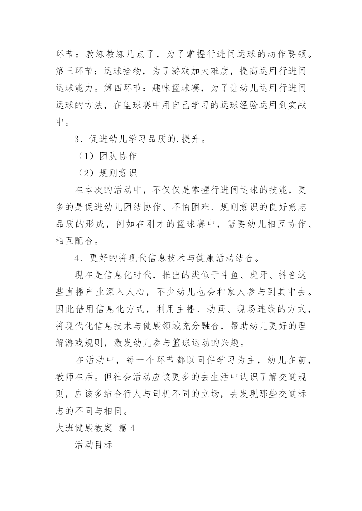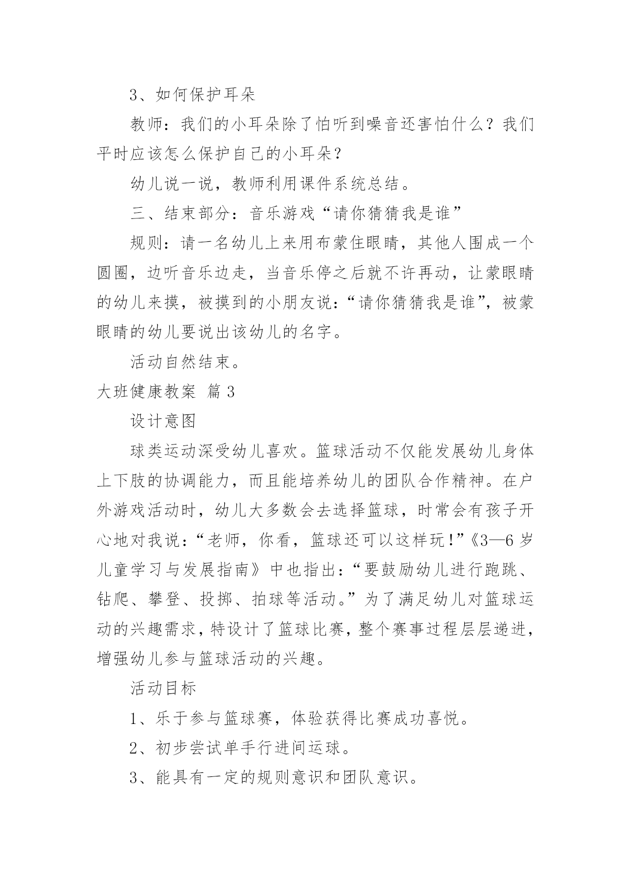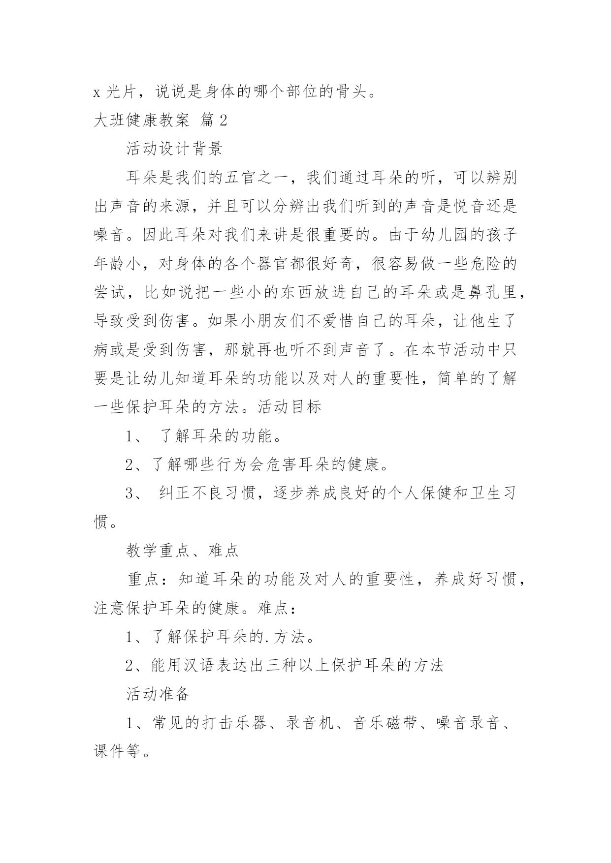大班健康教案【精品】大班健康教案范文合集九篇作为一名优秀的教育工作者,总归要编写教案,教案是教材及大纲与课堂教学的纽带和桥梁。快来参考教案是怎么写的吧!以下是小编收集整理的大班健康教案10篇,仅供参考,希望能够帮助到大家。大班健康教案篇1活动目标:1、乐意参与认识人体骨头的活动,体验探索身体奥秘的兴趣。2、观察骨骼的基本特征,初步了解骨骼的构造。3、掌握人体骨骼的大致特征,提高探索身体奥秘的能力。活动准备:1、人体骨架模型或人体骨架图一份。2、请家长帮忙收集一些医院废弃的x光片。3、大白纸和双面胶若干。4、活动当天请幼儿穿红色运动服。活动过程:1、捏捏自己的骨头,感知骨头的.存在。师:小朋友们,请你们用手捏一捏自己的手指和手臂。有没有摸到硬硬的东西?那是什么?师:你还能在身体的其他部位摸到硬硬的东西吗?(膝盖、头部、胳膊肘、颈部等等)师:原来骨头支撑着我们身体的每一个部位。小朋友们想想如果没有了骨骼,我们会变成什么样子?(变成软软的、像一团泥…)2、认识骨头,说说骨头有哪些。(1)教师出示人体骨架模型(或人体骨架图),对照图边讲述人体骨骼边触摸身体该部位的骨头:"人的身体有两百多块骨头,它们连接在一起。我的头上有头骨,张开嘴巴吃东西靠的是颌骨;还有手骨和腿部,走路、做事情都要靠它们;弯弯腰,那是一节一节的脊椎骨;再摸摸我们的胸口,那一排一排的是肋骨…"(2)引导幼儿再次捏一捏、摸一摸自己的骨头。3、动手做做我们的骨头。(1)师:我们自己动手来做一个骨架吧,瞧!老师把白纸剪成一条一条贴在了胸口,真像一排排肋骨。你们还能不能贴出我们其他什么骨头呢?(2)引导幼儿用剪贴纸条的方法,在自己身体上表现各种骨头。(如胸部、手臂上、腿上…)活动延伸:在表演区玩角色游戏扮演放射科的医生和病人,尝试看x光片,说说是身体的哪个部位的骨头。大班健康教案篇2活动设计背景耳朵是我们的五官之一,我们通过耳朵的听,可以辨别出声音的来源,并且可以分辨出我们听到的声音是悦音还是噪音。因此耳朵对我们来讲是很重要的。由于幼儿园的孩子年龄小,对身体的各个器官都很好奇,很容易做一些危险的尝试,比如说把一些小的东西放进自己的耳朵或是鼻孔里,导致受到伤害。如果小朋友们不爱惜自己的耳朵,让他生了病或是受到伤害,那就再也听不到声音了。在本节活动中只要是让幼儿知道耳朵的功能以及对人的重要性,简单的了解一些保护耳朵的方法。活动目标1、了解耳朵的功能。2、了解哪些行为会危害耳朵的健康。3、纠正不良习惯,逐步养成良好的个人保健和卫生习惯。教学重点、难点重点:知道耳朵的功能及对人的重要性,养成好习惯,注意保护耳朵的健康。难点:1、了解保护耳朵的.方法。2、能用汉语表达出三种以上保护耳朵的方法活动准备1、常见的打击乐器、录音机、音乐磁带、噪音录音、课件等。2、课前幼儿经验准备:和爸爸妈妈一起了解有关耳朵的小知识。活动过程一、开始部分:通过猜谜语引出活动主题教师:小朋友你们好,今天李老师很高兴和你们一起上课,现在我要和你们一起分享一个谜语,看看那个小朋友脑筋转的最快,能第一个猜出来。出示谜面:左一片,右一片,中间隔山看不见。教师引导幼儿说出谜底:耳朵。二、基本部分1、看一看耳朵的样子教师:现在就请小朋友跟我一起说:耳朵、耳朵、我有一对小耳朵。摸一摸你们的耳朵,再看看旁边小朋友的耳朵,说一说小耳朵长的什么样?2、了解耳朵的基本构造(1)你知道我们耳朵的基本构造吗?请说一说。(2)播放ppt了解耳朵的基本构造。(外耳、中耳、内耳)3、发现耳朵的作用教师:小朋友已经知道了耳朵的构造,它并不像以前我们知道的那么简单,那么我们这双不简单的小耳朵有什么用途呢?老师带小朋友做一个“小耳朵真有用”的游戏,等做完了这个游戏小朋友来告诉老师你的小耳朵到底有什么用?(1)游戏:“小耳朵真有用”教师:现在请小朋友把眼睛闭上,看你们能不能猜出来老师在干什么了?教师将准备好的录音机、打击乐器、噪音,使它们发出声音,让幼儿说一说都听到什么声音,初步了解耳朵的用处。教师:·请小朋友把眼睛闭上用手把耳朵捂住,看你们能不能猜出来老师在干什么?·咦,奇怪,你们不是把眼睛都闭上了吗,怎么知道的?(听声)·继续把闭眼睛,你能说出这是什么发出的声音吗?·哇,你们又知道了,你是怎么知道的?(辨声)(2)教师小结:我们的耳朵可以帮助我们听见各种不同的声音,还可以辨别各种不同的声音(耳朵的两大基本作用)。有了小耳朵我们可以听到很多很多的声音。那小朋友想想我们的耳朵喜欢听到什么样的声音?(小朋友自由回答)(3)出示《小耳朵》儿歌,一起说儿歌小耳朵两只小耳朵,最爱听什么。小鸟来唱歌,美妙音乐多。两只小耳朵,最怕听什么?燥音若太多,掩耳躲一躲。教师:小耳朵最爱听什么声音?你的耳朵最爱听什么声音?小耳朵最怕听什么声音?3、如何保护耳朵教师:我