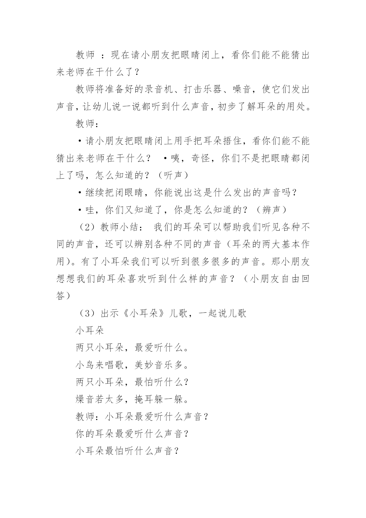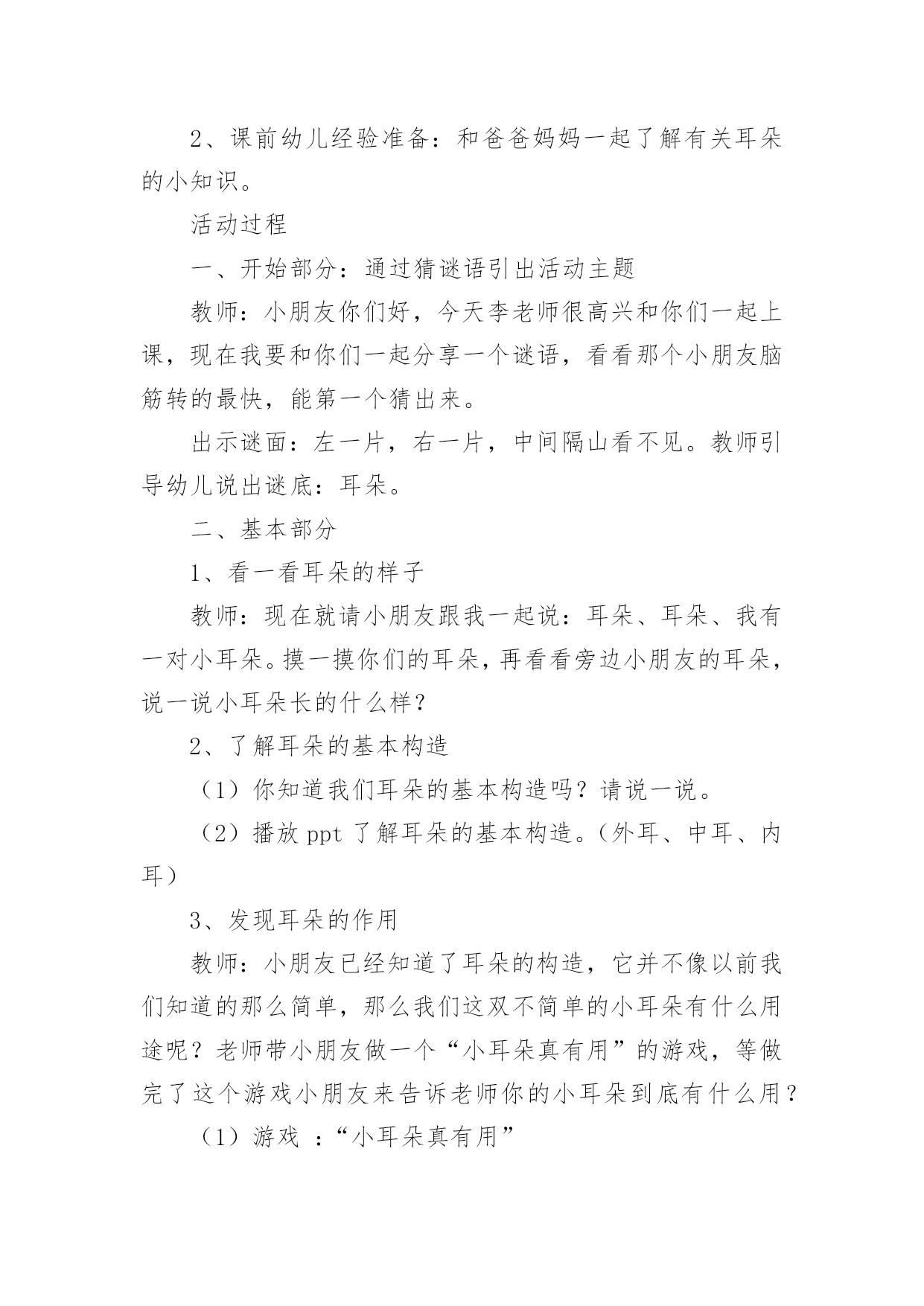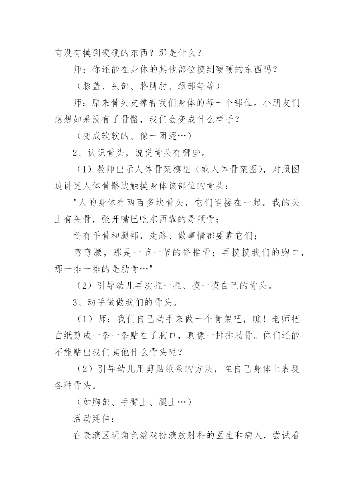 大班健康教案【精品】大班健康教案范文合集九篇作为一名优秀的教育工作者,总归要编写教案,教案是教材及大纲与课堂教学的纽带和桥梁。快来参考教案是怎么写的吧!以下是小编收集整理的大班健康教案10篇,仅供参考,希望能够帮助到大家。大班健康教案篇1活动目标:1、乐意参与认识人体骨头的活动,体验探索身体奥秘的兴趣。2、观察骨骼的基本特征,初步了解骨骼的构造。3、掌握人体骨骼的大致特征,提高探索身体奥秘的能力。活动准备:1、人体骨架模型或人体骨架图一份。2、请家长帮忙收集一些医院废弃的x光片。3、大白纸和双面胶若干。4、活动当天请幼儿穿红色运动服。活动过程:1、捏捏自己的骨头,感知骨头的.存在。师:小朋友们,请你们用手捏一捏自己的手指和手臂。有没有摸到硬硬的东西?那是什么?师:你还能在身体的其他部位摸到硬硬的东西吗?(膝盖、头部、胳膊肘、颈部等等)师:原来骨头支撑着我们身体的每一个部位。小朋友们想想如果没有了骨骼,我们会变成什么样子?(变成软软的、像一团泥…)2、认识骨头,说说骨头有哪些。(1)教师出示人体骨架模型(或人体骨架图),对照图边讲述人体骨骼边触摸身体该部位的骨头:"人的身体有两百多块骨头,它们连接在一起。我的头上有头骨,张开嘴巴吃东西靠的是颌骨;还有手骨和腿部,走路、做事情都要靠它们;弯弯腰,那是一节一节的脊椎骨;再摸摸我们的胸口,那一排一排的是肋骨…"(2)引导幼儿再次捏一捏、摸一摸自己的骨头。3、动手做做我们的骨头。(1)师:我们自己动手来做一个骨架吧,瞧!老师把白纸剪成一条一条贴在了胸口,真像一排排肋骨。你们还能不能贴出我们其他什么骨头呢?(2)引导幼儿用剪贴纸条的方法,在自己身体上表现各种骨头。(如胸部、手臂上、腿上…)活动延伸:在表演区玩角色游戏扮演放射科的医生和病人,尝试看x光片,说说是身体的哪个部位的骨头。大班健康教案篇2活动设计背景耳朵是我们的五官之一,我们通过耳朵的听,可以辨别出声音的来源,并且可以分辨出我们听到的声音是悦音还是噪音。因此耳朵对我们来讲是很重要的。由于幼儿园的孩子年龄小,对身体的各个器官都很好奇,很容易做一些危险的尝试,比如说把一些小的东西放进自己的耳朵或是鼻孔里,导致受到伤害。如果小朋友们不爱惜自己的耳朵,让他生了病或是受到伤害,那就再也听不到声音了。在本节活动中只要是让幼儿知道耳朵的功能以及对人的重要性,简单的了解一些保护耳朵的方法。活动目标1、了解耳朵的功能。2、了解哪些行为会危害耳朵的健康。3、纠正不良习惯,逐步养成良好的个人保健和卫生习惯。教学重点、难点重点:知道耳朵的功能及对人的重要性,养成好习惯,注意保护耳朵的健康。难点:1、了解保护耳朵的.方法。2、能用汉语表达出三种以上保护耳朵的方法活动准备1、常见的打击乐器、录音机、音乐磁带、噪音录音、课件等。2、课前幼儿经验准备:和爸爸妈妈一起了解有关耳朵的小知识。活动过程一、开始部分:通过猜谜语引出活动主题教师:小朋友你们好,今天李老师很高兴和你们一起上课,现在我要和你们一起分享一个谜语,看看那个小朋友脑筋转的最快,能第一个猜出来。出示谜面:左一片,右一片,中间隔山看不见。教师引导幼儿说出谜底:耳朵。二、基本部分1、看一看耳朵的样子教师:现在就请小朋友跟我一起说:耳朵、耳朵、我有一对小耳朵。摸一摸你们的耳朵,再看看旁边小朋友的耳朵,说一说小耳朵长的什么样?2、了解耳朵的基本构造(1)你知道我们耳朵的基本构造吗?请说一说。(2)播放ppt了解耳朵的基本构造。(外耳、中耳、内耳)3、发现耳朵的作用教师:小朋友已经知道了耳朵的构造,它并不像以前我们知道的那么简单,那么我们这双不简单的小耳朵有什么用途呢?老师带小朋友做一个“小耳朵真有用”的游戏,等做完了这个游戏小朋友来告诉老师你的小耳朵到底有什么用?(1)游戏:“小耳朵真有用”教师:现在请小朋友把眼睛闭上,看你们能不能猜出来老师在干什么了?教师将准备好的录音机、打击乐器、噪音,使它们发出声音,让幼儿说一说都听到什么声音,初步了解耳朵的用处。教师:·请小朋友把眼睛闭上用手把耳朵捂住,看你们能不能猜出来老师在干什么?·咦,奇怪,你们不是把眼睛都闭上了吗,怎么知道的?(听声)·继续把闭眼睛,你能说出这是什么发出的声音吗?·哇,你们又知道了,你是怎么知道的?(辨声)(2)教师小结:我们的耳朵可以帮助我们听见各种不同的声音,还可以辨别各种不同的声音(耳朵的两大基本作用)。有了小耳朵我们可以听到很多很多的声音。那小朋友想想我们的耳朵喜欢听到什么样的声音?(小朋友自由回答)(3)出示《小耳朵》儿歌,一起说儿歌小耳朵两只小耳朵,最爱听什么。小鸟来唱歌,美妙音乐多。两只小耳朵,最怕听什么?燥音若太多,掩耳躲一躲。教师:小耳朵最爱听什么声音?你的耳朵最爱听什么声音?小耳朵最怕听什么声音?3、如何保护耳朵教师:我