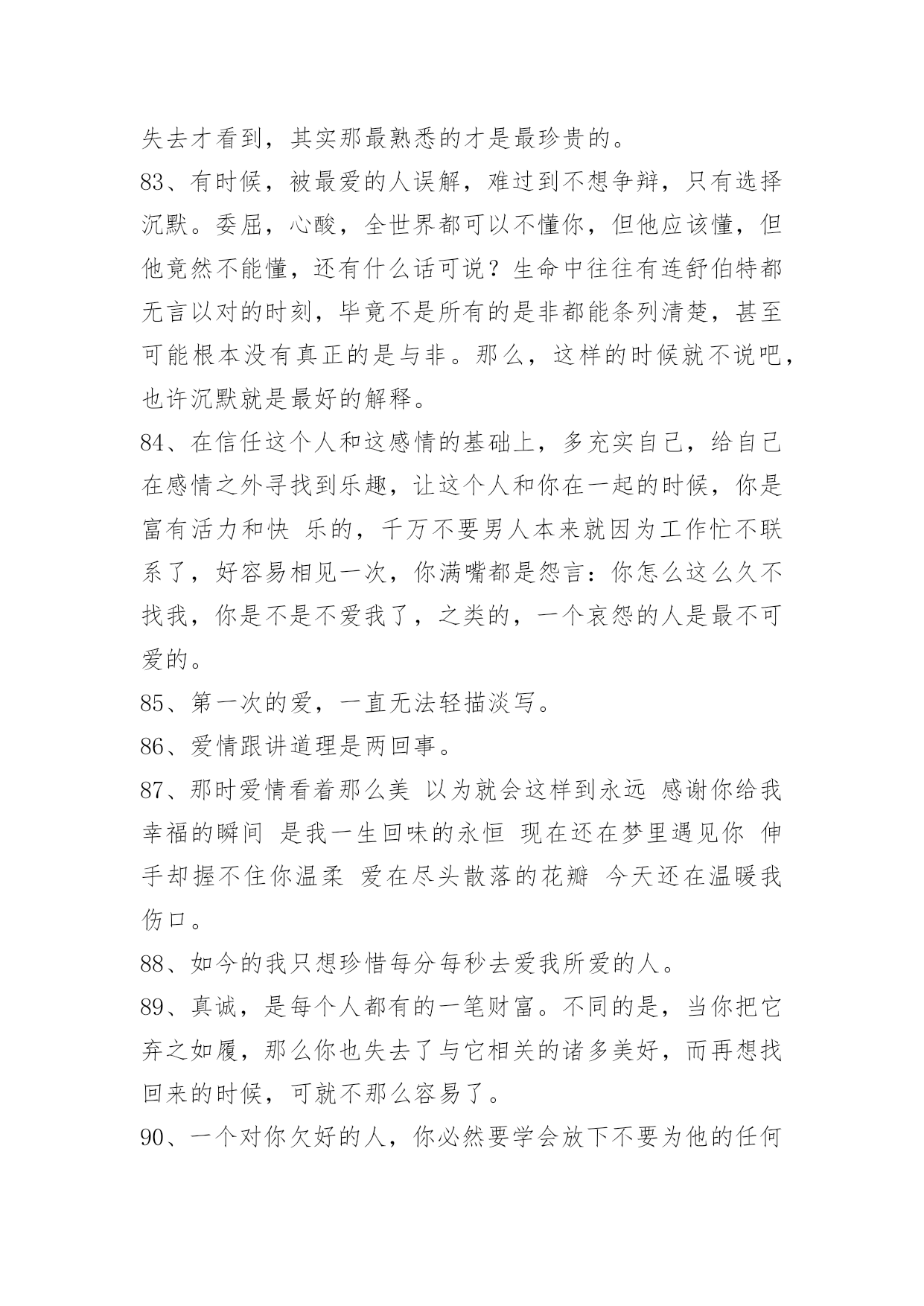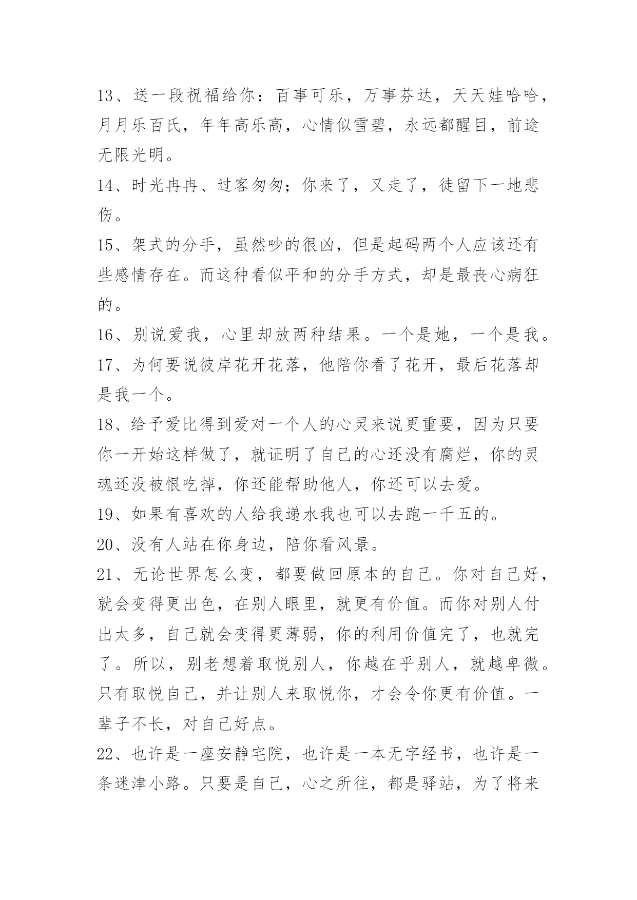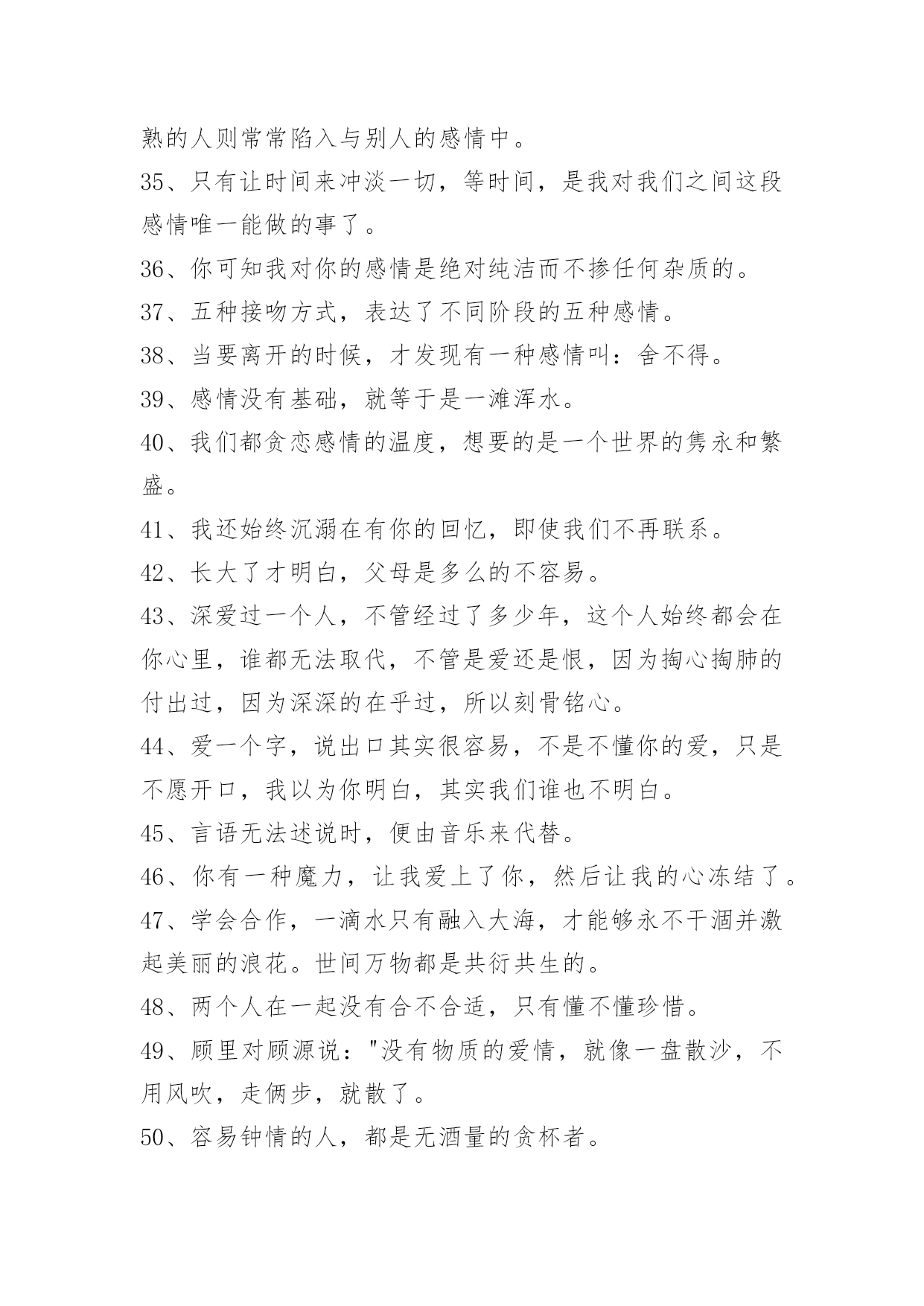 简单的情感语录90条简单的情感语录集锦90条到如今,我想我到底是在心里埋怨你的。可你不懂我,我的确不怪你,因你也有你的选择自由。我理解,只是难解。下面是关于情感语录90条,欢迎阅读与收藏。1、期待明天和好友一起疯,一起闹,一起回忆过去。2、别把心浸泡在回忆的毒汁中,拿一生来祭奠前尘往事。3、曾经我们彼此许下承诺如今变成彼此的束缚。4、没有人可以打倒你,能打倒你的只有你自己。5、命运让我们相遇,让我醉在你的眼睛。我想陪你,为你遮雨的余生。请你相信我对你的感情,我将让你的生活充满了快乐的回忆。6、悲伤的回忆太多,快乐让我止步不前。7、如果爱你是病,那我心甘情愿放弃治疗。8、感情是两个人的事情,当只有你一个人努力就会徒劳无功。或许可以尝试着不要期待它太完美,不要老盯着爱情看,它会不自在的。9、我们相濡以沫,我们同病相怜。我们捂着心口的疼告诉对方:坚强的走下去,执着于我们的执着。10、人的心到底有多孤独,从外表是看不出来的。11、即使你的幸福里没有我,让你死也要记住。12、这世间的真话本就不多,一个女子的脸红,胜过一大段对白。13、送一段祝福给你:百事可乐,万事芬达,天天娃哈哈,月月乐百氏,年年高乐高,心情似雪碧,永远都醒目,前途无限光明。14、时光冉冉、过客匆匆;你来了,又走了,徒留下一地悲伤。15、架式的分手,虽然吵的很凶,但是起码两个人应该还有些感情存在。而这种看似平和的分手方式,却是最丧心病狂的。16、别说爱我,心里却放两种结果。一个是她,一个是我。17、为何要说彼岸花开花落,他陪你看了花开,最后花落却是我一个。18、给予爱比得到爱对一个人的心灵来说更重要,因为只要你一开始这样做了,就证明了自己的心还没有腐烂,你的灵魂还没被恨吃掉,你还能帮助他人,你还可以去爱。19、如果有喜欢的人给我递水我也可以去跑一千五的。20、没有人站在你身边,陪你看风景。21、无论世界怎么变,都要做回原本的自己。你对自己好,就会变得更出色,在别人眼里,就更有价值。而你对别人付出太多,自己就会变得更薄弱,你的利用价值完了,也就完了。所以,别老想着取悦别人,你越在乎别人,就越卑微。只有取悦自己,并让别人来取悦你,才会令你更有价值。一辈子不长,对自己好点。22、也许是一座安静宅院,也许是一本无字经书,也许是一条迷津小路。只要是自己,心之所往,都是驿站,为了将来起程不再那么迷惘。23、有时候,能容下多少他人,就能拥有多少快乐。换一个说法就是,你跟多少人作对,就是跟自己本该拥有的多少快乐作对。24、那满涨的潮汐,是我胸中满涨起来的爱意。怎样美丽而又慌乱的夜晚啊,请原谅我不得不用歌声,向俯视着我的星空轻轻呼唤。25、佛祖说,幸福是心的感觉。幸福与哀愁往往会同时敲响人的心门,你把谁邀请进来,你就将与谁同在。26、如果说睁一只眼闭一只眼会幸福的话。那么我情愿选择双目失明。大概这样会一直幸福吧。27、每个人都是幸福的。只是,你的幸福,常常在别人眼里,只是你自己身在福中不知福。28、沉默相守,寂静欢喜。这就是幸福。29、百度搜索不到的幸福,你也给不起。30、男人如果在情感中被动,女人如果变为主动那么情感问题会变得截然不同,最后导致分手。31、因为寂寞我不再会有以前的热情,因为我认为没有人会对我的热情感冒。32、我不需要再盲目地追求什么,更不需要委屈自己来换取情感上的慰藉。33、我们都为爱情做尽了傻事,最后陪在身边的,却是另外的人……感情的事,向来没有赢家。34、精神成熟的人会更多地对别人表现出友善和关爱,不成熟的人则常常陷入与别人的感情中。35、只有让时间来冲淡一切,等时间,是我对我们之间这段感情唯一能做的事了。36、你可知我对你的感情是绝对纯洁而不掺任何杂质的。37、五种接吻方式,表达了不同阶段的五种感情。38、当要离开的时候,才发现有一种感情叫:舍不得。39、感情没有基础,就等于是一滩浑水。40、我们都贪恋感情的温度,想要的是一个世界的隽永和繁盛。41、我还始终沉溺在有你的回忆,即使我们不再联系。42、长大了才明白,父母是多么的不容易。43、深爱过一个人,不管经过了多少年,这个人始终都会在你心里,谁都无法取代,不管是爱还是恨,因为掏心掏肺的付出过,因为深深的在乎过,所以刻骨铭心。44、爱一个字,说出口其实很容易,不是不懂你的爱,只是不愿开口,我以为你明白,其实我们谁也不明白。45、言语无法述说时,便由音乐来代替。46、你有一种魔力,让我爱上了你,然后让我的心冻结了。47、学会合作,一滴水只有融入大海,才能够永不干涸并激起美丽的浪花。世间万物都是共衍共生的。48、两个人在一起没有合不合适,只有懂不懂珍惜。49、顾里对顾源说:"没有物质的爱情,就像一盘散沙,不用风吹,走俩步,就散了。50、容易钟情的人,都是无酒量的贪杯者。51、一个好人,最希望遇见能让他变得更好的人。