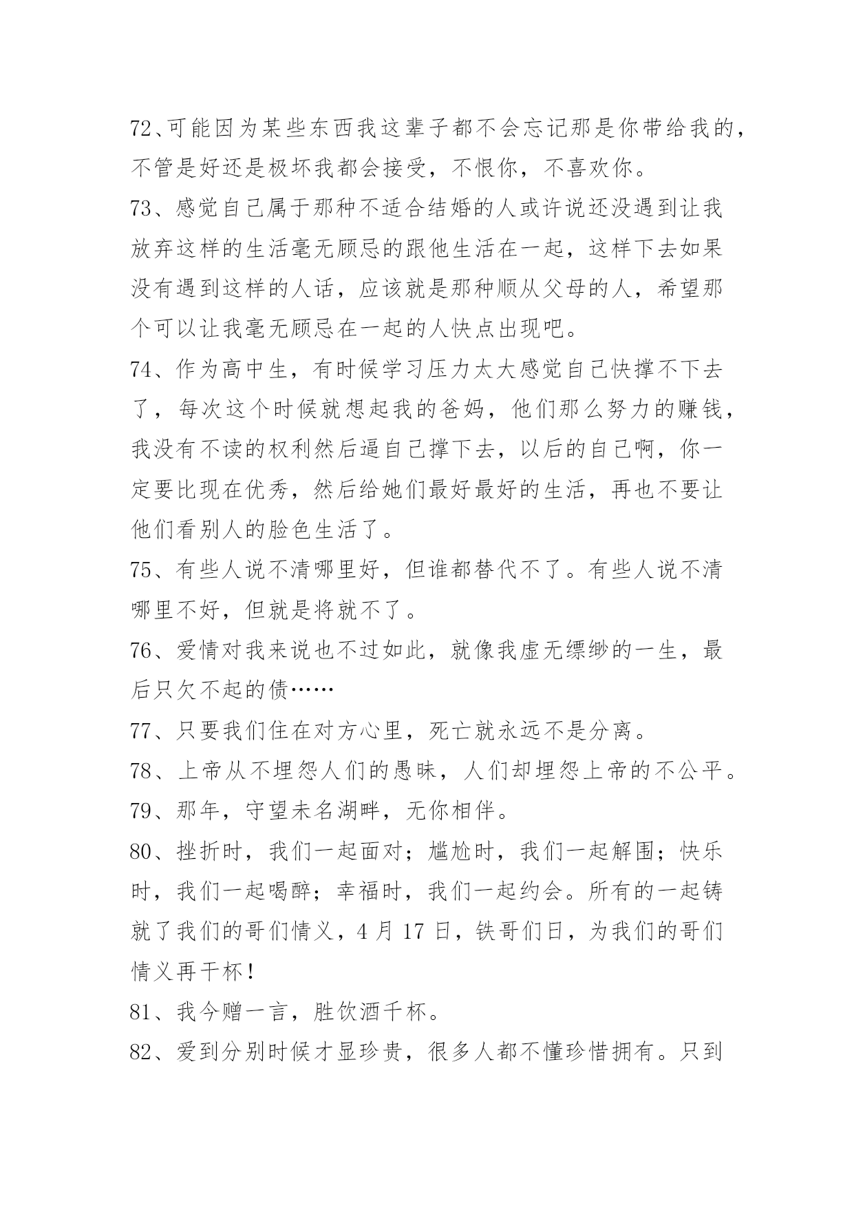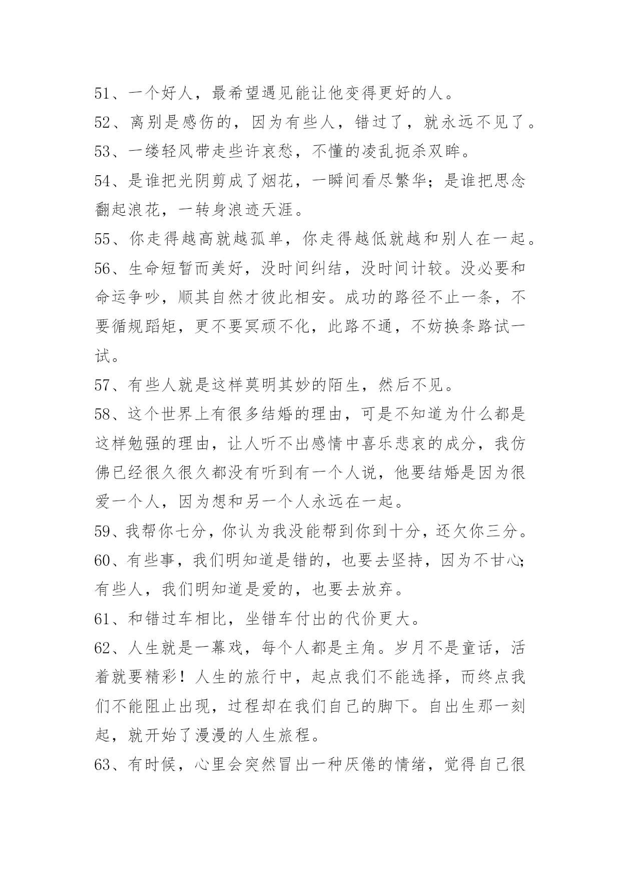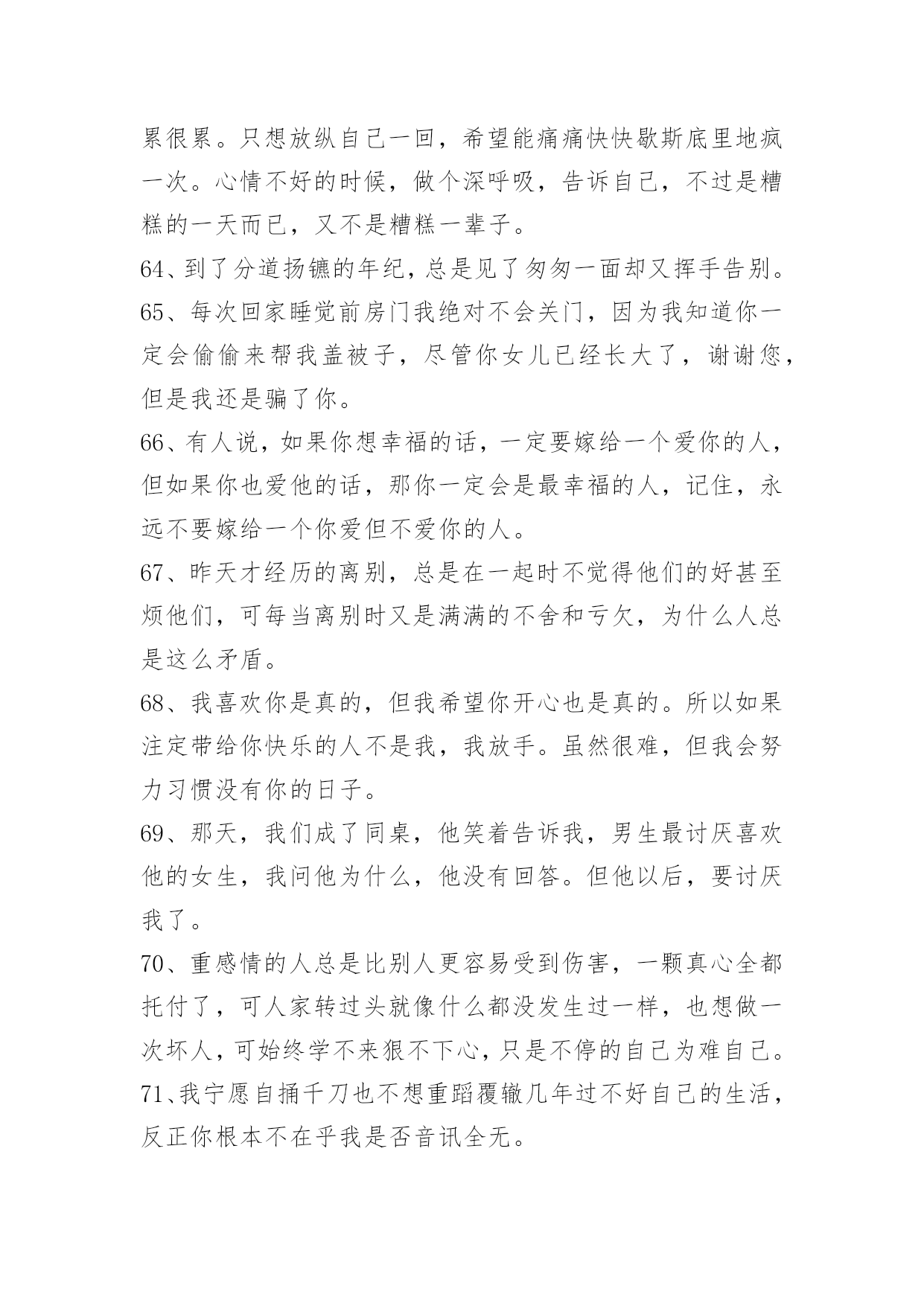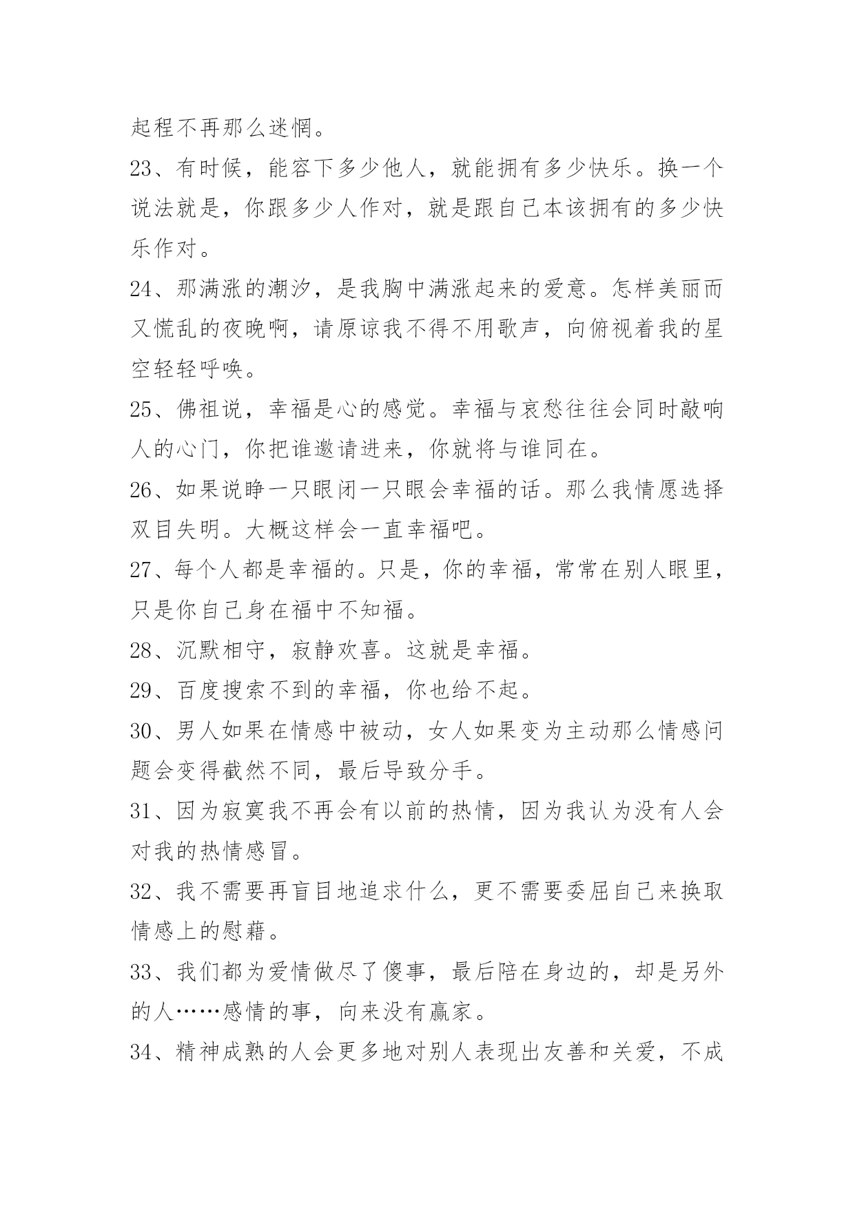 简单的情感语录90条简单的情感语录集锦90条到如今,我想我到底是在心里埋怨你的。可你不懂我,我的确不怪你,因你也有你的选择自由。我理解,只是难解。下面是关于情感语录90条,欢迎阅读与收藏。1、期待明天和好友一起疯,一起闹,一起回忆过去。2、别把心浸泡在回忆的毒汁中,拿一生来祭奠前尘往事。3、曾经我们彼此许下承诺如今变成彼此的束缚。4、没有人可以打倒你,能打倒你的只有你自己。5、命运让我们相遇,让我醉在你的眼睛。我想陪你,为你遮雨的余生。请你相信我对你的感情,我将让你的生活充满了快乐的回忆。6、悲伤的回忆太多,快乐让我止步不前。7、如果爱你是病,那我心甘情愿放弃治疗。8、感情是两个人的事情,当只有你一个人努力就会徒劳无功。或许可以尝试着不要期待它太完美,不要老盯着爱情看,它会不自在的。9、我们相濡以沫,我们同病相怜。我们捂着心口的疼告诉对方:坚强的走下去,执着于我们的执着。10、人的心到底有多孤独,从外表是看不出来的。11、即使你的幸福里没有我,让你死也要记住。12、这世间的真话本就不多,一个女子的脸红,胜过一大段对白。13、送一段祝福给你:百事可乐,万事芬达,天天娃哈哈,月月乐百氏,年年高乐高,心情似雪碧,永远都醒目,前途无限光明。14、时光冉冉、过客匆匆;你来了,又走了,徒留下一地悲伤。15、架式的分手,虽然吵的很凶,但是起码两个人应该还有些感情存在。而这种看似平和的分手方式,却是最丧心病狂的。16、别说爱我,心里却放两种结果。一个是她,一个是我。17、为何要说彼岸花开花落,他陪你看了花开,最后花落却是我一个。18、给予爱比得到爱对一个人的心灵来说更重要,因为只要你一开始这样做了,就证明了自己的心还没有腐烂,你的灵魂还没被恨吃掉,你还能帮助他人,你还可以去爱。19、如果有喜欢的人给我递水我也可以去跑一千五的。20、没有人站在你身边,陪你看风景。21、无论世界怎么变,都要做回原本的自己。你对自己好,就会变得更出色,在别人眼里,就更有价值。而你对别人付出太多,自己就会变得更薄弱,你的利用价值完了,也就完了。所以,别老想着取悦别人,你越在乎别人,就越卑微。只有取悦自己,并让别人来取悦你,才会令你更有价值。一辈子不长,对自己好点。22、也许是一座安静宅院,也许是一本无字经书,也许是一条迷津小路。只要是自己,心之所往,都是驿站,为了将来起程不再那么迷惘。23、有时候,能容下多少他人,就能拥有多少快乐。换一个说法就是,你跟多少人作对,就是跟自己本该拥有的多少快乐作对。24、那满涨的潮汐,是我胸中满涨起来的爱意。怎样美丽而又慌乱的夜晚啊,请原谅我不得不用歌声,向俯视着我的星空轻轻呼唤。25、佛祖说,幸福是心的感觉。幸福与哀愁往往会同时敲响人的心门,你把谁邀请进来,你就将与谁同在。26、如果说睁一只眼闭一只眼会幸福的话。那么我情愿选择双目失明。大概这样会一直幸福吧。27、每个人都是幸福的。只是,你的幸福,常常在别人眼里,只是你自己身在福中不知福。28、沉默相守,寂静欢喜。这就是幸福。29、百度搜索不到的幸福,你也给不起。30、男人如果在情感中被动,女人如果变为主动那么情感问题会变得截然不同,最后导致分手。31、因为寂寞我不再会有以前的热情,因为我认为没有人会对我的热情感冒。32、我不需要再盲目地追求什么,更不需要委屈自己来换取情感上的慰藉。33、我们都为爱情做尽了傻事,最后陪在身边的,却是另外的人……感情的事,向来没有赢家。34、精神成熟的人会更多地对别人表现出友善和关爱,不成熟的人则常常陷入与别人的感情中。35、只有让时间来冲淡一切,等时间,是我对我们之间这段感情唯一能做的事了。36、你可知我对你的感情是绝对纯洁而不掺任何杂质的。37、五种接吻方式,表达了不同阶段的五种感情。38、当要离开的时候,才发现有一种感情叫:舍不得。39、感情没有基础,就等于是一滩浑水。40、我们都贪恋感情的温度,想要的是一个世界的隽永和繁盛。41、我还始终沉溺在有你的回忆,即使我们不再联系。42、长大了才明白,父母是多么的不容易。43、深爱过一个人,不管经过了多少年,这个人始终都会在你心里,谁都无法取代,不管是爱还是恨,因为掏心掏肺的付出过,因为深深的在乎过,所以刻骨铭心。44、爱一个字,说出口其实很容易,不是不懂你的爱,只是不愿开口,我以为你明白,其实我们谁也不明白。45、言语无法述说时,便由音乐来代替。46、你有一种魔力,让我爱上了你,然后让我的心冻结了。47、学会合作,一滴水只有融入大海,才能够永不干涸并激起美丽的浪花。世间万物都是共衍共生的。48、两个人在一起没有合不合适,只有懂不懂珍惜。49、顾里对顾源说:"没有物质的爱情,就像一盘散沙,不用风吹,走俩步,就散了。50、容易钟情的人,都是无酒量的贪杯者。51、一个好人,最希望遇见能让他变得更好的人。