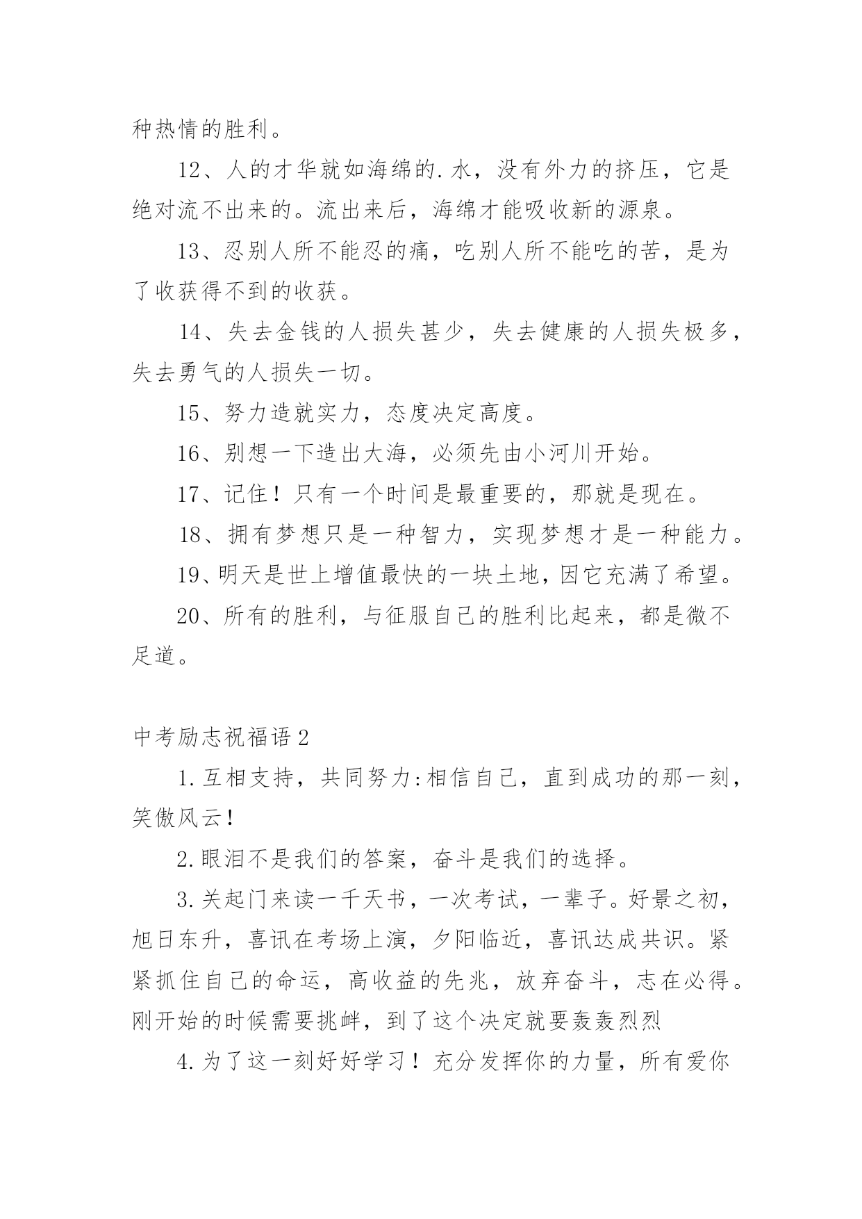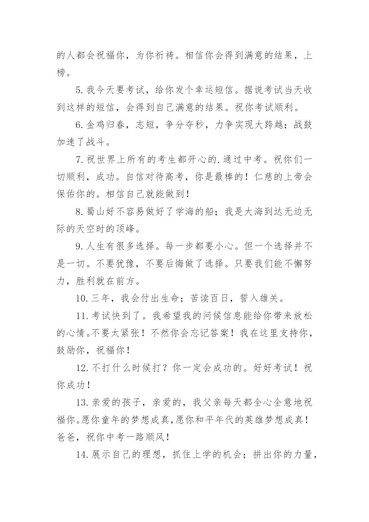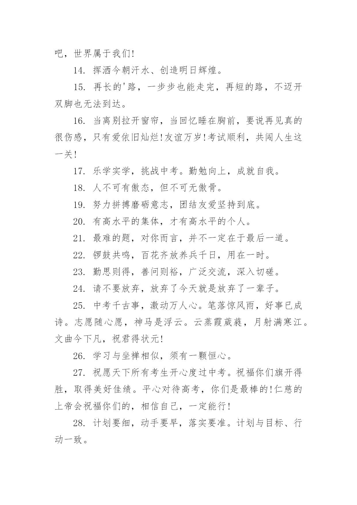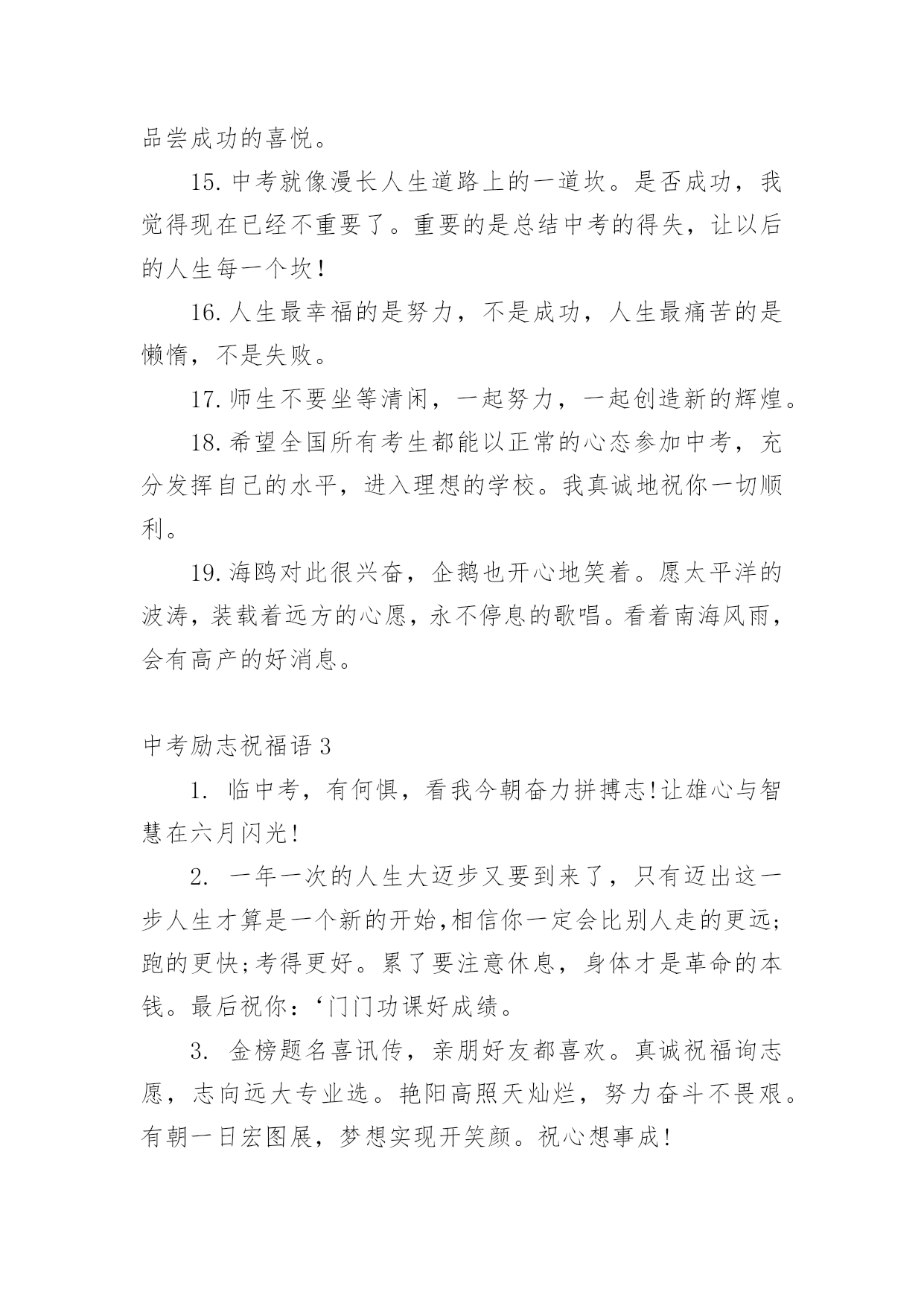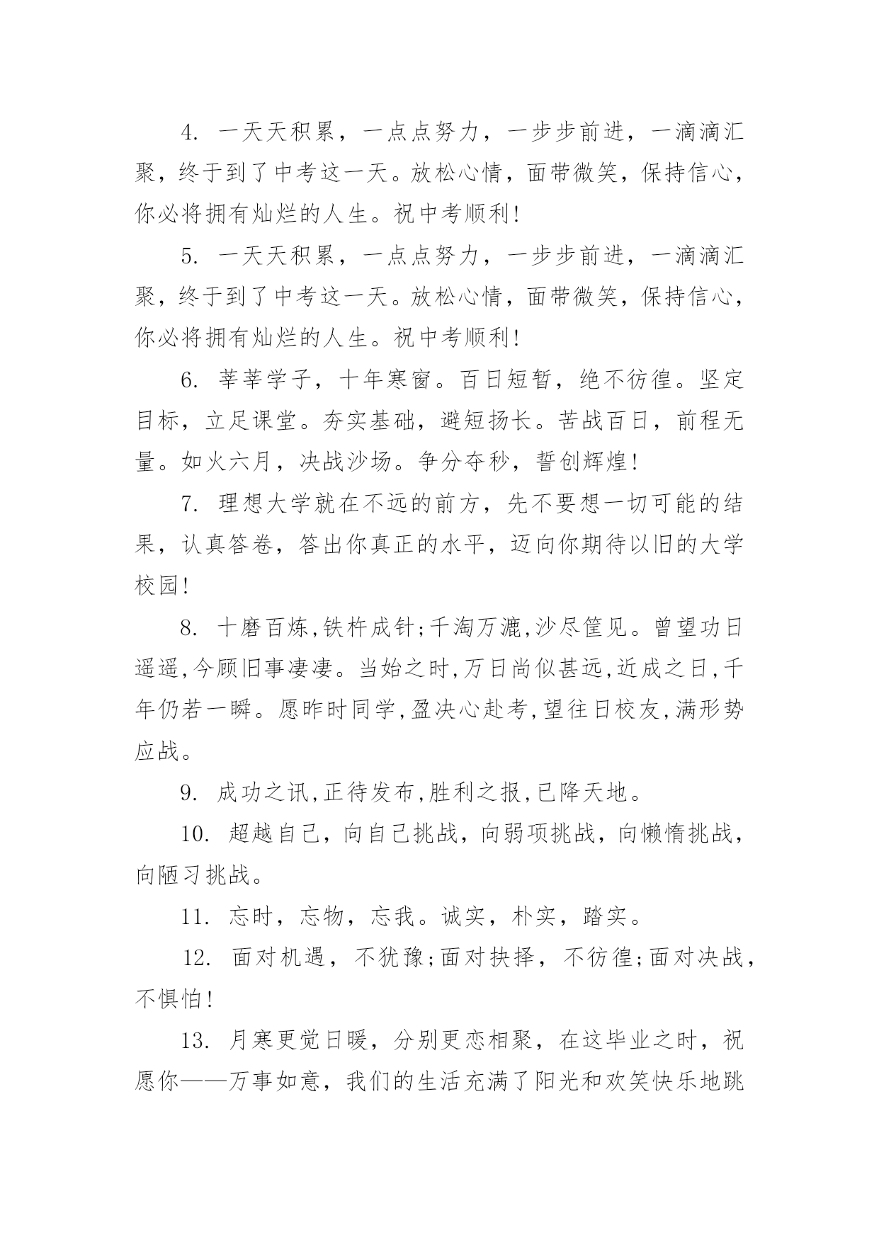 中考励志祝福语在平时的学习、工作或生活中,说到祝福语,大家肯定都不陌生吧,祝福语可以给人们带去温暖和好心情。那么,怎么去写祝福语呢?以下是小编精心整理的中考励志祝福语,仅供参考,大家一起来看看吧。中考励志祝福语11、昆仑纵有千丈雪,我亦誓把昆仑截。2、今天我们继续进步!3、恐惧自己受苦的人,已经因为自己的恐惧在受苦。4、坚韧是成功的一大要素,只要在门上敲得够久够大声,终会把人唤醒的。5、彩虹总在风雨后,阳光总在乌云后,成功总在失败后。6、只有一条路不能选择——那就是放弃之路;只有一条路不能拒绝——那就是成长之路。7、坚持不懈,直到成功!8、强者不一定胜者,胜者一定是强者。9、即使爬到最高的山上,一次也只能脚踏实地地迈一步。10、成功不是只有将来才有,而是从决定做的那一刻起,持续积累而成!11、在世界的历史中,每一位伟大而高贵的时刻都是某种热情的胜利。12、人的才华就如海绵的.水,没有外力的挤压,它是绝对流不出来的。流出来后,海绵才能吸收新的源泉。13、忍别人所不能忍的痛,吃别人所不能吃的苦,是为了收获得不到的收获。14、失去金钱的人损失甚少,失去健康的人损失极多,失去勇气的人损失一切。15、努力造就实力,态度决定高度。16、别想一下造出大海,必须先由小河川开始。17、记住!只有一个时间是最重要的,那就是现在。18、拥有梦想只是一种智力,实现梦想才是一种能力。19、明天是世上增值最快的一块土地,因它充满了希望。20、所有的胜利,与征服自己的胜利比起来,都是微不足道。中考励志祝福语21.互相支持,共同努力:相信自己,直到成功的那一刻,笑傲风云!2.眼泪不是我们的答案,奋斗是我们的选择。3.关起门来读一千天书,一次考试,一辈子。好景之初,旭日东升,喜讯在考场上演,夕阳临近,喜讯达成共识。紧紧抓住自己的命运,高收益的先兆,放弃奋斗,志在必得。刚开始的时候需要挑衅,到了这个决定就要轰轰烈烈4.为了这一刻好好学习!充分发挥你的力量,所有爱你的人都会祝福你,为你祈祷。相信你会得到满意的结果,上榜。5.我今天要考试,给你发个幸运短信。据说考试当天收到这样的短信,会得到自己满意的结果。祝你考试顺利。6.金鸡归春,志短,争分夺秒,力争实现大跨越;战鼓加速了战斗。7.祝世界上所有的考生都开心的.通过中考。祝你们一切顺利,成功。自信对待高考,你是最棒的!仁慈的上帝会保佑你的。相信自己就能做到!8.蜀山好不容易做好了学海的船;我是大海到达无边无际的天空时的顶峰。9.人生有很多选择。每一步都要小心。但一个选择并不是一切。不要犹豫,不要后悔做了选择。只要我们能不懈努力,胜利就在前方。10.三年,我会付出生命;苦读百日,誓入雄关。11.考试快到了。我希望我的问候信息能给你带来放松的心情。不要太紧张!不然你会忘记答案!我在这里支持你,鼓励你,祝福你!12.不打什么时候打?你一定会成功的。好好考试!祝你成功!13.亲爱的孩子,亲爱的,我父亲每天都全心全意地祝福你。愿你童年的梦想成真,愿你和平年代的英雄梦想成真!爸爸,祝你中考一路顺风!14.展示自己的理想,抓住上学的机会;拼出你的力量,品尝成功的喜悦。15.中考就像漫长人生道路上的一道坎。是否成功,我觉得现在已经不重要了。重要的是总结中考的得失,让以后的人生每一个坎!16.人生最幸福的是努力,不是成功,人生最痛苦的是懒惰,不是失败。17.师生不要坐等清闲,一起努力,一起创造新的辉煌。18.希望全国所有考生都能以正常的心态参加中考,充分发挥自己的水平,进入理想的学校。我真诚地祝你一切顺利。19.海鸥对此很兴奋,企鹅也开心地笑着。愿太平洋的波涛,装载着远方的心愿,永不停息的歌唱。看着南海风雨,会有高产的好消息。中考励志祝福语31.临中考,有何惧,看我今朝奋力拼搏志!让雄心与智慧在六月闪光!2.一年一次的人生大迈步又要到来了,只有迈出这一步人生才算是一个新的开始,相信你一定会比别人走的更远;跑的更快;考得更好。累了要注意休息,身体才是革命的本钱。最后祝你:‘门门功课好成绩。3.金榜题名喜讯传,亲朋好友都喜欢。真诚祝福询志愿,志向远大专业选。艳阳高照天灿烂,努力奋斗不畏艰。有朝一日宏图展,梦想实现开笑颜。祝心想事成!4.一天天积累,一点点努力,一步步前进,一滴滴汇聚,终于到了中考这一天。放松心情,面带微笑,保持信心,你必将拥有灿烂的人生。祝中考顺利!5.一天天积累,一点点努力,一步步前进,一滴滴汇聚,终于到了中考这一天。放松心情,面带微笑,保持信心,你必将拥有灿烂的人生。祝中考顺利!6.莘莘学子,十年寒窗。百日短暂,绝不彷徨。坚定目标,立足课堂。夯实基础,避短扬长。苦战百日,前程无量。如火六月,决战沙场。争分夺秒,誓创辉煌!7.理想大学就在不远的前方,先不要想一切可能的结果,认真答卷,答出你真正的水平,迈向你期待以旧