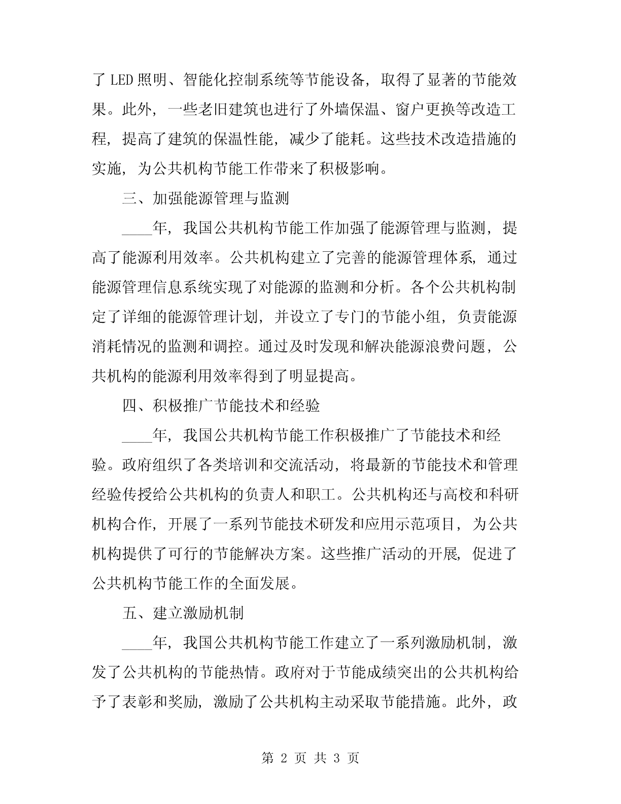 ____年公共机构节能总结范文【引言】近年来,我国能源消耗水平不断攀升,给经济发展和环境保护带来了巨大压力。公共机构作为社会资源的重要使用者,其节能工作显得尤为重要。在____年,为了更好地推动公共机构节能工作,我国采取了一系列有效措施,取得了可喜的成绩。以下是对____年公共机构节能工作的总结与评价。【正文】一、制定科学的节能目标____年,我国公共机构节能工作最大的亮点就是确立了科学的节能目标。根据《政府节能目标管理暂行办法》,政府机关、事业单位和公共机构需要在节能方面发挥示范作用,通过采购节能设备、推广节能技术和改善能源管理等手段,力争年度能源消耗同比下降5%以上,并实现绿色低碳的发展。这一目标的确立,对于公共机构的节能工作起到了明确指导作用。二、加大技术改造力度____年,我国公共机构节能工作不断加大了技术改造的力度。通过更新设备、改善建筑结构和优化管理流程等手段,公共机构的能源利用效率得到了大幅提高。例如,很多公共机构采用了LED照明、智能化控制系统等节能设备,取得了显著的节能效果。此外,一些老旧建筑也进行了外墙保温、窗户更换等改造工程,提高了建筑的保温性能,减少了能耗。这些技术改造措施的实施,为公共机构节能工作带来了积极影响。三、加强能源管理与监测____年,我国公共机构节能工作加强了能源管理与监测,提高了能源利用效率。公共机构建立了完善的能源管理体系,通过能源管理信息系统实现了对能源的监测和分析。各个公共机构制定了详细的能源管理计划,并设立了专门的节能小组,负责能源消耗情况的监测和调控。通过及时发现和解决能源浪费问题,公共机构的能源利用效率得到了明显提高。四、积极推广节能技术和经验____年,我国公共机构节能工作积极推广了节能技术和经验。政府组织了各类培训和交流活动,将最新的节能技术和管理经验传授给公共机构的负责人和职工。公共机构还与高校和科研机构合作,开展了一系列节能技术研发和应用示范项目,为公共机构提供了可行的节能解决方案。这些推广活动的开展,促进了公共机构节能工作的全面发展。五、建立激励机制____年,我国公共机构节能工作建立了一系列激励机制,激发了公共机构的节能热情。政府对于节能成绩突出的公共机构给予了表彰和奖励,激励了公共机构主动采取节能措施。此外,政府还加大了财政支持力度,补贴公共机构节能投资,提供必要的经费保障。这些激励机制的建立,加强了公共机构节能工作的推进力度。【结论】在____年,我国公共机构节能工作取得了显著成效。通过制定科学的节能目标、加大技术改造力度、加强能源管理与监测、积极推广节能技术和经验,以及建立激励机制,公共机构的能源利用效率得以提高,为我国节能减排工作做出了积极贡献。但同时也要看到,仍存在一些问题,如节能措施的推广不够深入、节能管理水平仍有提升空间等。未来,在公共机构节能工作中,我们应进一步加大技术创新和管理创新,推动公共机构朝着更加绿色、低碳和可持续的方向发展,为实现我国节能减排目标做出更大的贡献。【参考译文】