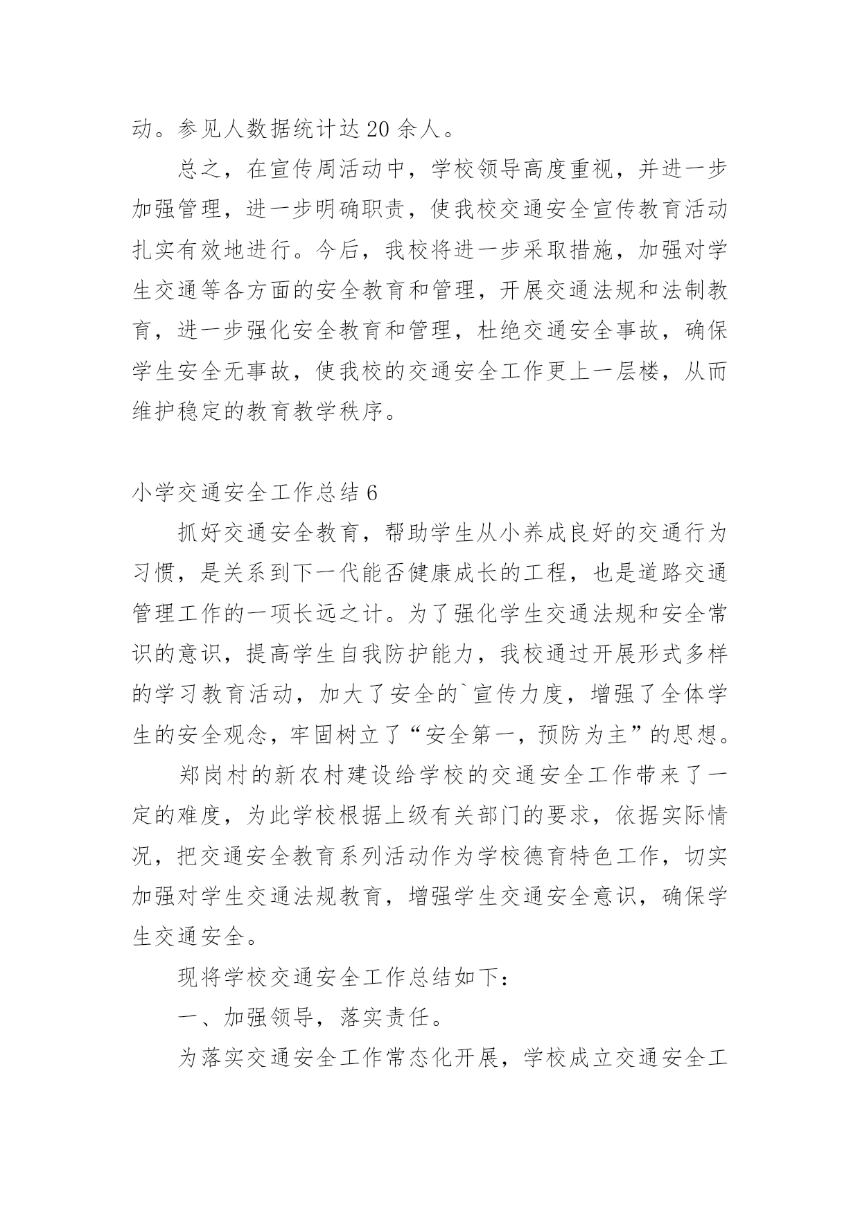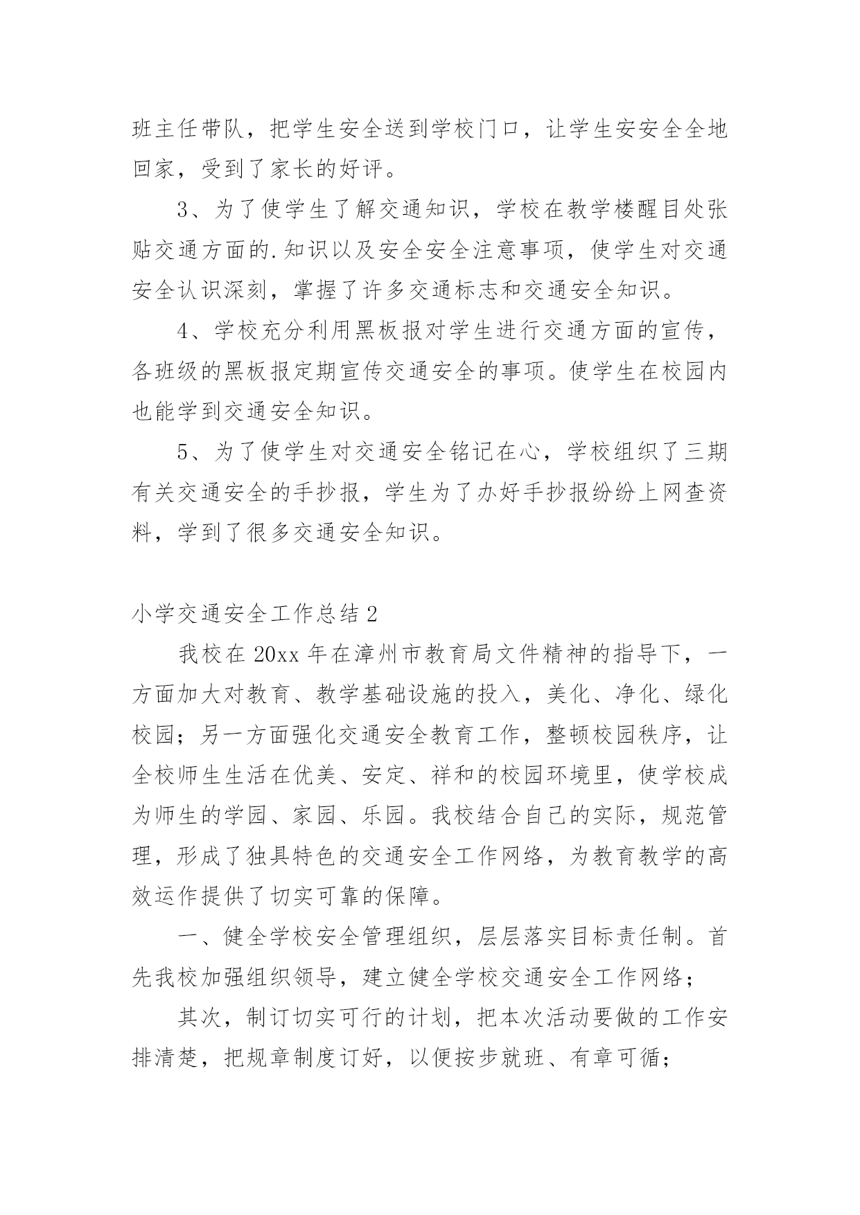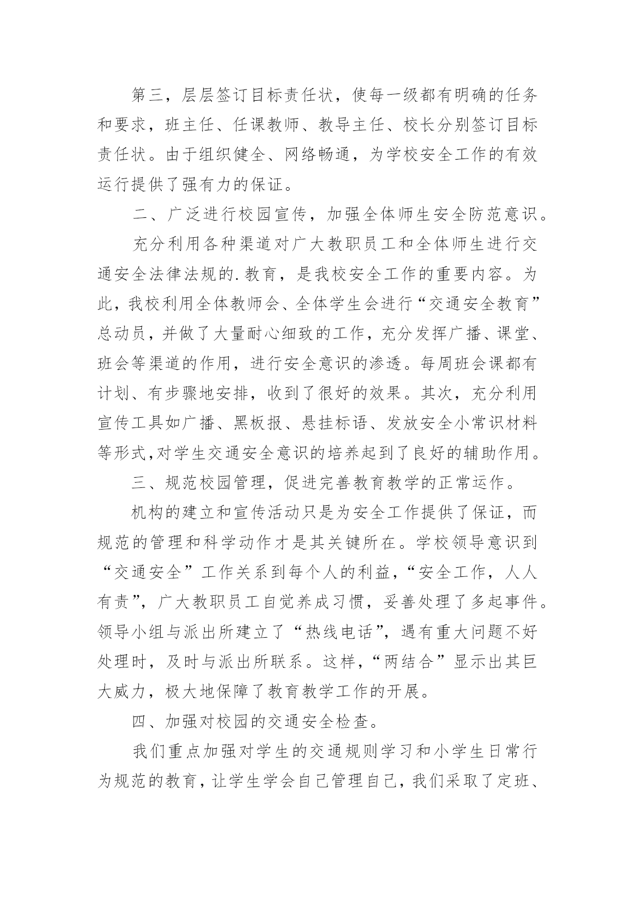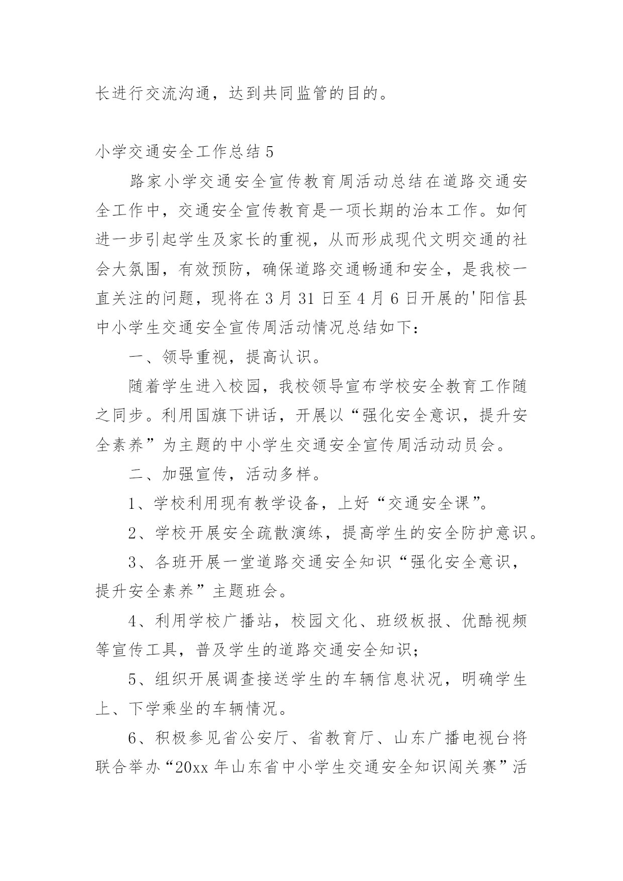 小学交通安全工作总结总结是把一定阶段内的有关情况分析研究,做出有指导性的经验方法以及结论的书面材料,写总结有利于我们学习和工作能力的提高,因此,让我们写一份总结吧。但是总结有什么要求呢?以下是小编为大家整理的小学交通安全工作总结,欢迎阅读,希望大家能够喜欢。小学交通安全工作总结1一年来,我校在创建学校道路交通安全方面做了许多工作,现在我们的做法总结如下:1、设立学校交通安全岗:学生在学校每天都要进行做广播体操,每周一要进行集会举行升旗仪式,每当这些大集会前的时候,是学生统一上、下楼梯的时间。对于小学生来说,自控力较差,为了学生的安全,学校给每位教师分了安全责任区,在学校的楼梯口、拐弯处,学校的每一个存在安全隐患的地方,学校都安排有专职教师进行安全监督,发现学生有什么情况立即处理,这样,教师和学生一起配合,每次学校集会我们都能够安全地进行。少先队大队部也安排了队员进行安全监督,学生、教师双重进行安全检查,保证了学生集会的安全。2、每天上学、放学时,是学生集中出入学校的时间,学校门口人数最多,为了保证学生安全,上学时,安全管理人员坚守在校门口进行安全教育。放学时,学校要求由各班班主任带队,把学生安全送到学校门口,让学生安安全全地回家,受到了家长的好评。3、为了使学生了解交通知识,学校在教学楼醒目处张贴交通方面的.知识以及安全安全注意事项,使学生对交通安全认识深刻,掌握了许多交通标志和交通安全知识。4、学校充分利用黑板报对学生进行交通方面的宣传,各班级的黑板报定期宣传交通安全的事项。使学生在校园内也能学到交通安全知识。5、为了使学生对交通安全铭记在心,学校组织了三期有关交通安全的手抄报,学生为了办好手抄报纷纷上网查资料,学到了很多交通安全知识。小学交通安全工作总结2我校在20xx年在漳州市教育局文件精神的指导下,一方面加大对教育、教学基础设施的投入,美化、净化、绿化校园;另一方面强化交通安全教育工作,整顿校园秩序,让全校师生生活在优美、安定、祥和的校园环境里,使学校成为师生的学园、家园、乐园。我校结合自己的实际,规范管理,形成了独具特色的交通安全工作网络,为教育教学的高效运作提供了切实可靠的保障。一、健全学校安全管理组织,层层落实目标责任制。首先我校加强组织领导,建立健全学校交通安全工作网络;其次,制订切实可行的计划,把本次活动要做的工作安排清楚,把规章制度订好,以便按步就班、有章可循;第三,层层签订目标责任状,使每一级都有明确的任务和要求,班主任、任课教师、教导主任、校长分别签订目标责任状。由于组织健全、网络畅通,为学校安全工作的有效运行提供了强有力的保证。二、广泛进行校园宣传,加强全体师生安全防范意识。充分利用各种渠道对广大教职员工和全体师生进行交通安全法律法规的.教育,是我校安全工作的重要内容。为此,我校利用全体教师会、全体学生会进行“交通安全教育”总动员,并做了大量耐心细致的工作,充分发挥广播、课堂、班会等渠道的作用,进行安全意识的渗透。每周班会课都有计划、有步骤地安排,收到了很好的效果。其次,充分利用宣传工具如广播、黑板报、悬挂标语、发放安全小常识材料等形式,对学生交通安全意识的培养起到了良好的辅助作用。三、规范校园管理,促进完善教育教学的正常运作。机构的建立和宣传活动只是为安全工作提供了保证,而规范的管理和科学动作才是其关键所在。学校领导意识到“交通安全”工作关系到每个人的利益,“安全工作,人人有责”,广大教职员工自觉养成习惯,妥善处理了多起事件。领导小组与派出所建立了“热线电话”,遇有重大问题不好处理时,及时与派出所联系。这样,“两结合”显示出其巨大威力,极大地保障了教育教学工作的开展。四、加强对校园的交通安全检查。我们重点加强对学生的交通规则学习和小学生日常行为规范的教育,让学生学会自己管理自己,我们采取了定班、定员、定岗和择优的方法,让值周人员加强课间检查,并组织人员在上下学时段对校园周边进行巡查,发现学生骑摩托车、电动车上下学的,予以制止,并按校规校纪严肃处理,同时告知学生家长。五、重视和加强学校周边环境管理工作。教育环境的好坏,对教育教学质量的提高起着至关重要的作用,为了治理好学校周边环境,学校成立了治理周边环境工作领导小组,由校长主要负责领导工作,把治理学校周边环境纳入了学校工作议事日程,建立了领导责任制,切实担负起治理周边环境的职责。围绕这一主题,我们主要做好了以下几个方面的工作:(1)着重治理了校内小环境,加强校园管理与学生管理工作,对学生进行了思想教育和遵守纪律教育,使他们遵守交通规则,养成良好的知法、守法的习惯;(2)做好宣传工作,使全体师生明确治理周边环境的重要意义,并让学生家长也积极参与到学生的交通安全教育工作中来;(3)制定切实可行的治理措施,净化了校园周边环境,在学生上下学时段,我校校长、