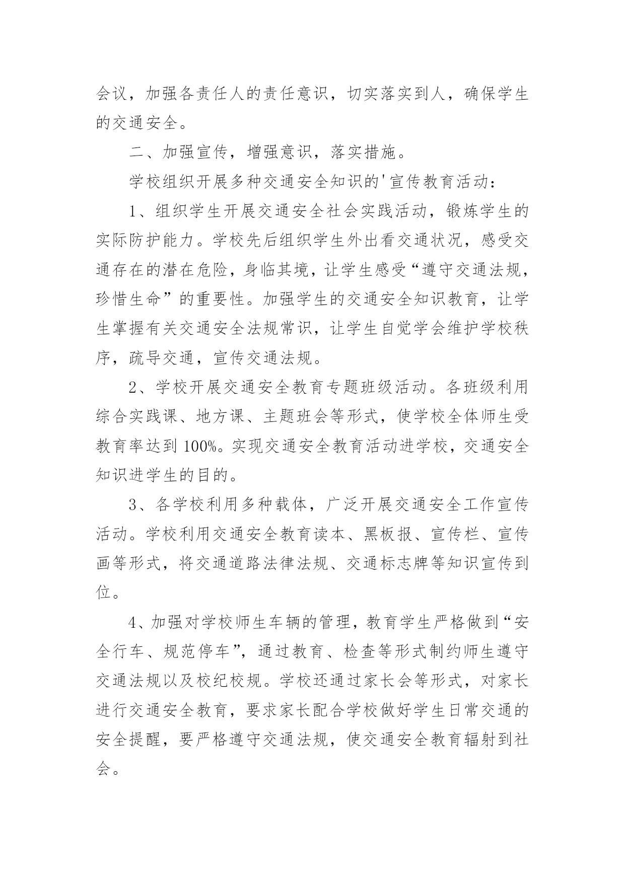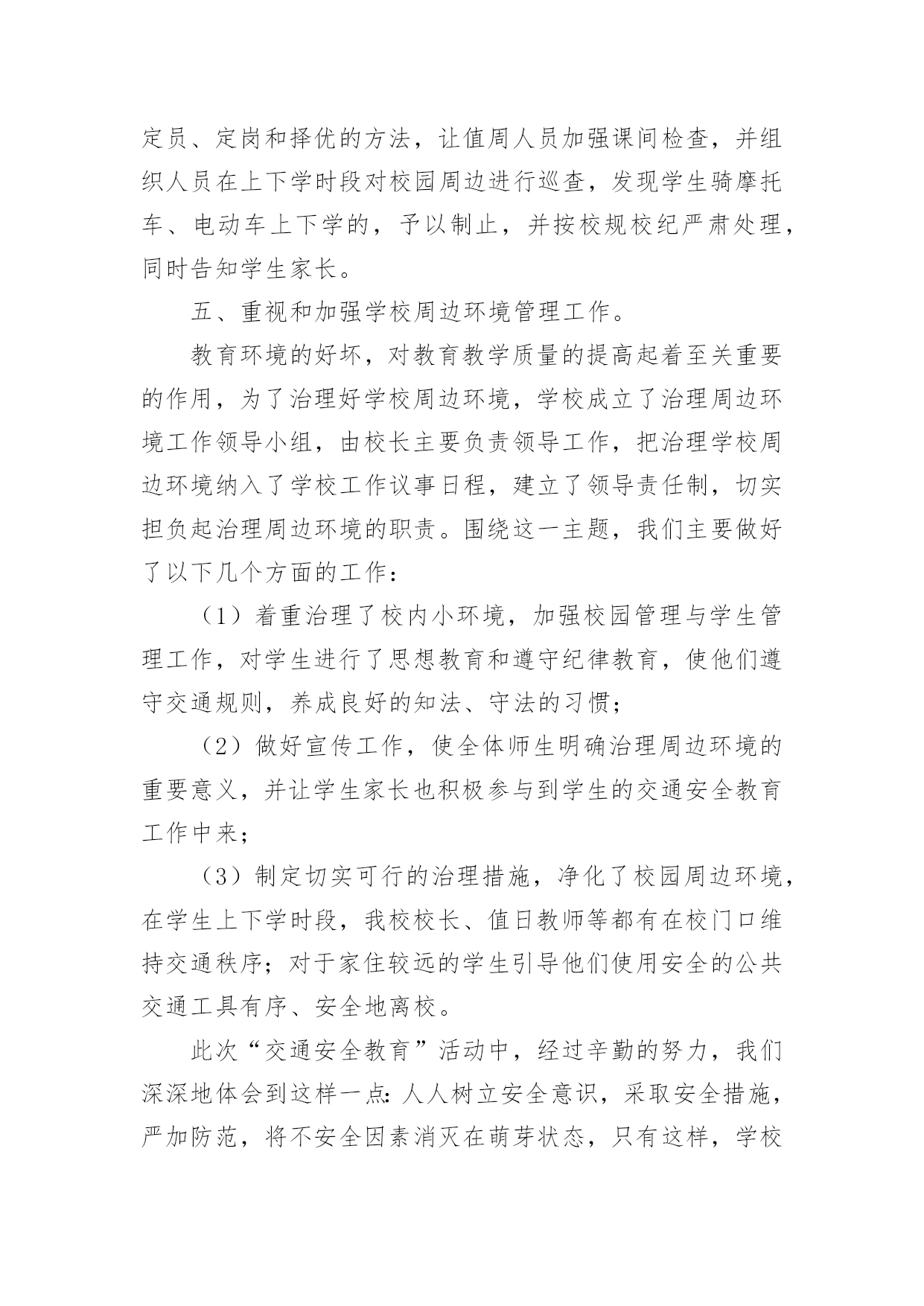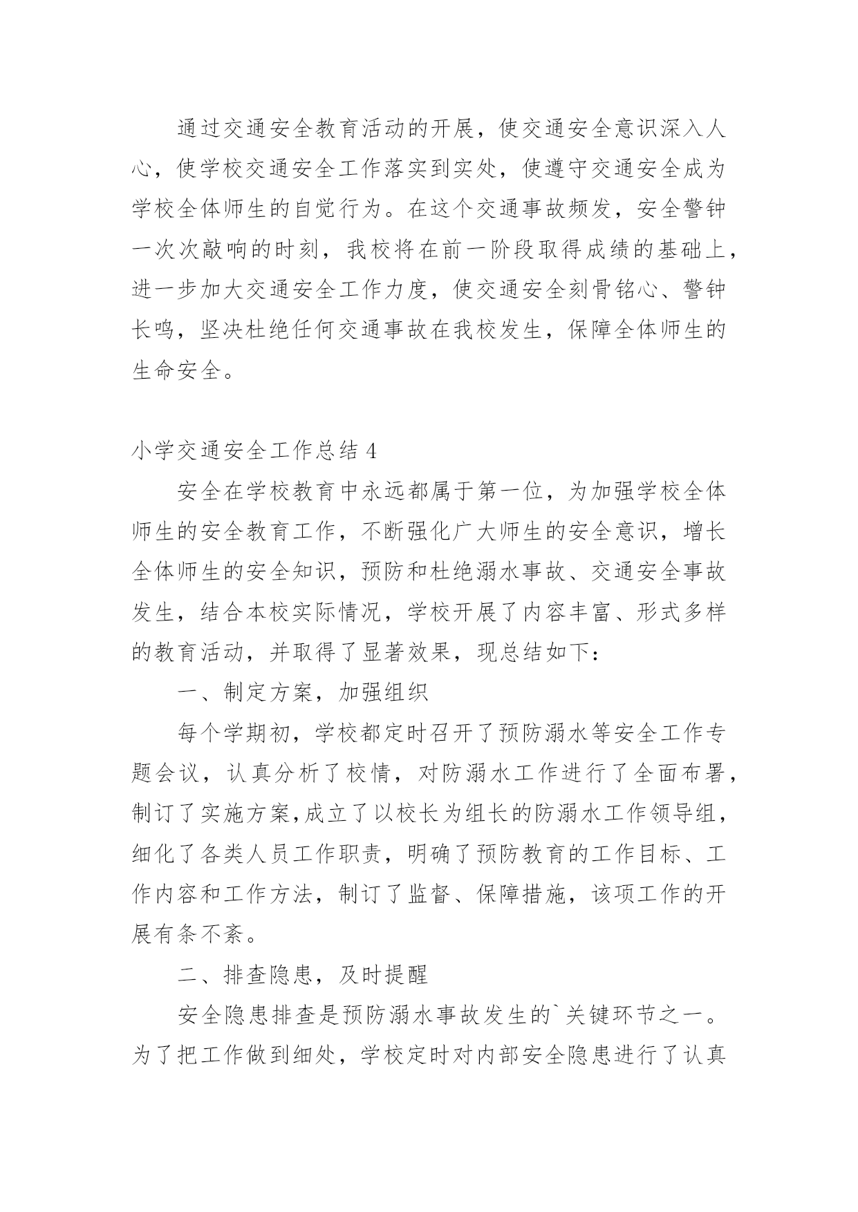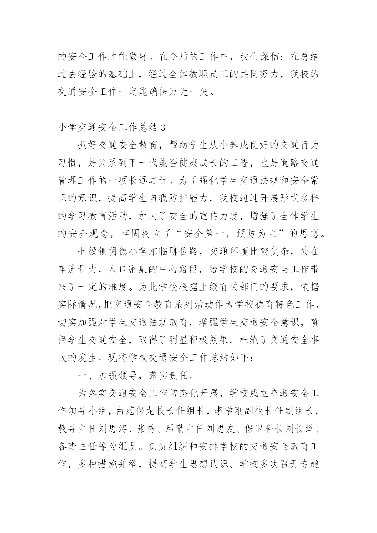 小学交通安全工作总结总结是把一定阶段内的有关情况分析研究,做出有指导性的经验方法以及结论的书面材料,写总结有利于我们学习和工作能力的提高,因此,让我们写一份总结吧。但是总结有什么要求呢?以下是小编为大家整理的小学交通安全工作总结,欢迎阅读,希望大家能够喜欢。小学交通安全工作总结1一年来,我校在创建学校道路交通安全方面做了许多工作,现在我们的做法总结如下:1、设立学校交通安全岗:学生在学校每天都要进行做广播体操,每周一要进行集会举行升旗仪式,每当这些大集会前的时候,是学生统一上、下楼梯的时间。对于小学生来说,自控力较差,为了学生的安全,学校给每位教师分了安全责任区,在学校的楼梯口、拐弯处,学校的每一个存在安全隐患的地方,学校都安排有专职教师进行安全监督,发现学生有什么情况立即处理,这样,教师和学生一起配合,每次学校集会我们都能够安全地进行。少先队大队部也安排了队员进行安全监督,学生、教师双重进行安全检查,保证了学生集会的安全。2、每天上学、放学时,是学生集中出入学校的时间,学校门口人数最多,为了保证学生安全,上学时,安全管理人员坚守在校门口进行安全教育。放学时,学校要求由各班班主任带队,把学生安全送到学校门口,让学生安安全全地回家,受到了家长的好评。3、为了使学生了解交通知识,学校在教学楼醒目处张贴交通方面的.知识以及安全安全注意事项,使学生对交通安全认识深刻,掌握了许多交通标志和交通安全知识。4、学校充分利用黑板报对学生进行交通方面的宣传,各班级的黑板报定期宣传交通安全的事项。使学生在校园内也能学到交通安全知识。5、为了使学生对交通安全铭记在心,学校组织了三期有关交通安全的手抄报,学生为了办好手抄报纷纷上网查资料,学到了很多交通安全知识。小学交通安全工作总结2我校在20xx年在漳州市教育局文件精神的指导下,一方面加大对教育、教学基础设施的投入,美化、净化、绿化校园;另一方面强化交通安全教育工作,整顿校园秩序,让全校师生生活在优美、安定、祥和的校园环境里,使学校成为师生的学园、家园、乐园。我校结合自己的实际,规范管理,形成了独具特色的交通安全工作网络,为教育教学的高效运作提供了切实可靠的保障。一、健全学校安全管理组织,层层落实目标责任制。首先我校加强组织领导,建立健全学校交通安全工作网络;其次,制订切实可行的计划,把本次活动要做的工作安排清楚,把规章制度订好,以便按步就班、有章可循;第三,层层签订目标责任状,使每一级都有明确的任务和要求,班主任、任课教师、教导主任、校长分别签订目标责任状。由于组织健全、网络畅通,为学校安全工作的有效运行提供了强有力的保证。二、广泛进行校园宣传,加强全体师生安全防范意识。充分利用各种渠道对广大教职员工和全体师生进行交通安全法律法规的.教育,是我校安全工作的重要内容。为此,我校利用全体教师会、全体学生会进行“交通安全教育”总动员,并做了大量耐心细致的工作,充分发挥广播、课堂、班会等渠道的作用,进行安全意识的渗透。每周班会课都有计划、有步骤地安排,收到了很好的效果。其次,充分利用宣传工具如广播、黑板报、悬挂标语、发放安全小常识材料等形式,对学生交通安全意识的培养起到了良好的辅助作用。三、规范校园管理,促进完善教育教学的正常运作。机构的建立和宣传活动只是为安全工作提供了保证,而规范的管理和科学动作才是其关键所在。学校领导意识到“交通安全”工作关系到每个人的利益,“安全工作,人人有责”,广大教职员工自觉养成习惯,妥善处理了多起事件。领导小组与派出所建立了“热线电话”,遇有重大问题不好处理时,及时与派出所联系。这样,“两结合”显示出其巨大威力,极大地保障了教育教学工作的开展。四、加强对校园的交通安全检查。我们重点加强对学生的交通规则学习和小学生日常行为规范的教育,让学生学会自己管理自己,我们采取了定班、定员、定岗和择优的方法,让值周人员加强课间检查,并组织人员在上下学时段对校园周边进行巡查,发现学生骑摩托车、电动车上下学的,予以制止,并按校规校纪严肃处理,同时告知学生家长。五、重视和加强学校周边环境管理工作。教育环境的好坏,对教育教学质量的提高起着至关重要的作用,为了治理好学校周边环境,学校成立了治理周边环境工作领导小组,由校长主要负责领导工作,把治理学校周边环境纳入了学校工作议事日程,建立了领导责任制,切实担负起治理周边环境的职责。围绕这一主题,我们主要做好了以下几个方面的工作:(1)着重治理了校内小环境,加强校园管理与学生管理工作,对学生进行了思想教育和遵守纪律教育,使他们遵守交通规则,养成良好的知法、守法的习惯;(2)做好宣传工作,使全体师生明确治理周边环境的重要意义,并让学生家长也积极参与到学生的交通安全教育工作中来;(3)制定切实可行的治理措施,净化了校园周边环境,在学生上下学时段,我校校长、