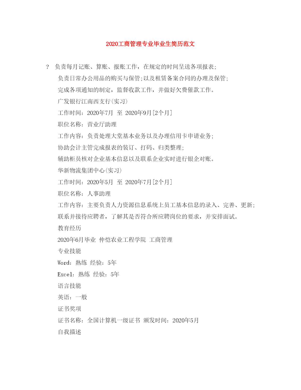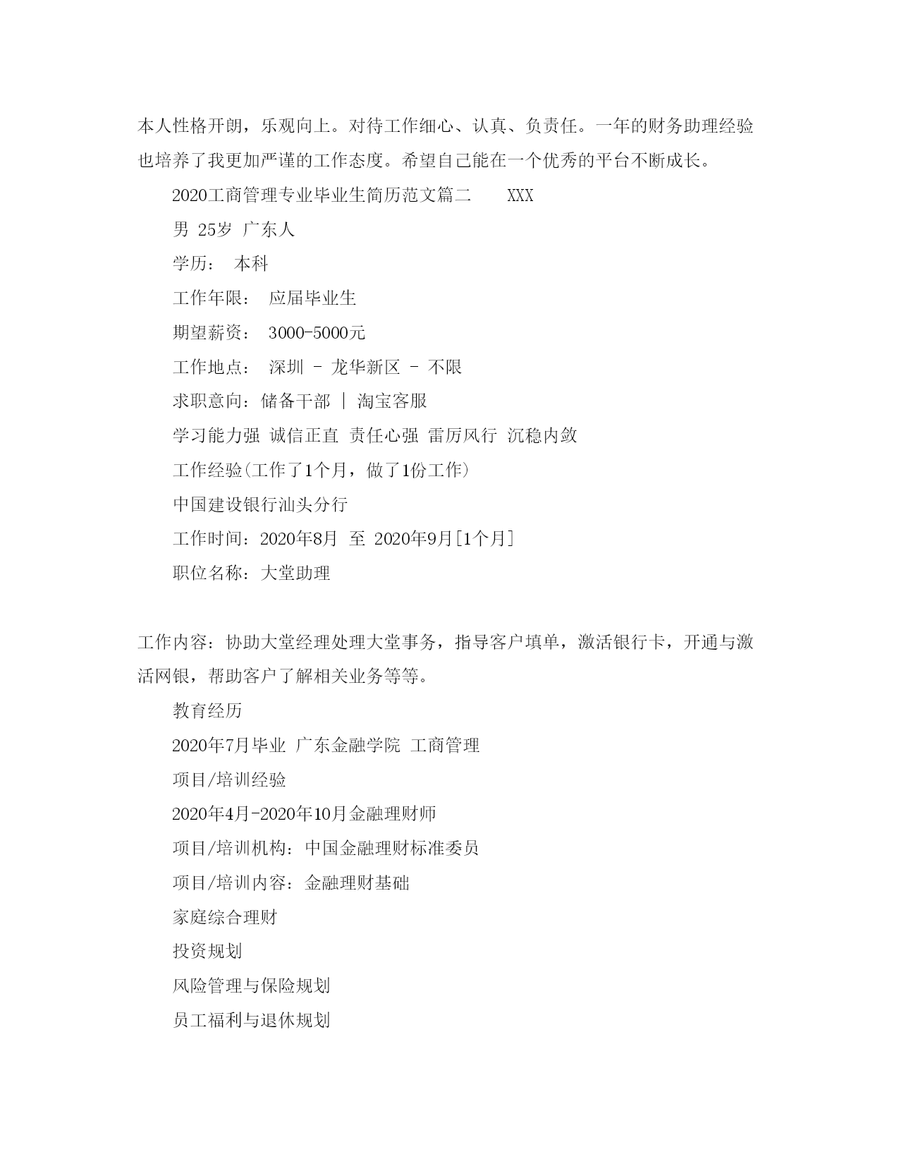 此资料由网络收集而来,如有侵权请告知上传者立即删除。资料共分享,我们负责传递知识。2020工商管理专业毕业生简历范文?负责每月记账、算账、报账工作,在规定的时间呈送各项报表;负责日常办公用品的购买与保管;以及租赁备案合同的办理及保管;完成各项通知的制定,监督收款工作,并做好欠费催款工作。广发银行江南西支行(实习)工作时间:2020年7月至2020年9月[2个月]职位名称:营业厅助理工作内容:负责处理大堂基本业务以及办理信用卡申请业务;协助会计主管完成报表的装订、打码、归类整理;辅助柜员核对企业基本信息以及联系企业实时进行银企对账。华新物流集团中心(实习)工作时间:2020年5月至2020年7月[2个月]职位名称:人事助理工作内容:主要负责人力资源信息系统上员工基本信息的录入、完善、更新;联系并接待应聘者,了解其是否符合所应聘岗位的要求,并安排面试。教育经历2020年6月毕业仲恺农业工程学院工商管理专业技能Word:熟练经验:5年Excel:熟练经验:5年语言技能英语:一般证书奖项证书名称:全国计算机一级证书颁发时间:2020年5月自我描述本人性格开朗,乐观向上。对待工作细心、认真、负责任。一年的财务助理经验也培养了我更加严谨的工作态度。希望自己能在一个优秀的平台不断成长。2020工商管理专业毕业生简历范文篇二XXX男25岁广东人学历:本科工作年限:应届毕业生期望薪资:3000-5000元工作地点:深圳-龙华新区-不限求职意向:储备干部|淘宝客服学习能力强诚信正直责任心强雷厉风行沉稳内敛工作经验(工作了1个月,做了1份工作)中国建设银行汕头分行工作时间:2020年8月至2020年9月[1个月]职位名称:大堂助理工作内容:协助大堂经理处理大堂事务,指导客户填单,激活银行卡,开通与激活网银,帮助客户了解相关业务等等。教育经历2020年7月毕业广东金融学院工商管理项目/培训经验2020年4月-2020年10月金融理财师项目/培训机构:中国金融理财标准委员项目/培训内容:金融理财基础家庭综合理财投资规划风险管理与保险规划员工福利与退休规划税务筹划金融理财综合案例证书奖项证书名称:大学英语四级颁发时间:2020年9月颁发机构:全国大学英语四六级考试委员会证书名称:全国计算机二级证书颁发时间:2020年9月颁发机构:教育部考试中心证书名称:证券从业资格证基础交易颁发时间:2020年9月颁发机构:中国证券业协会自我描述本人做事认真负责,待人真诚,热爱学习,热爱生活,希望找一份有前景和稳定的工作,能够在工作中不断学习与进步。对数字敏感。有会计基础,学过《基础会计》与《中级财务会计》。使用计算机10年,打字速度65字/分钟,熟练使用各种网络工具,熟练使用MSoffice。通过金融理财师培训及考试。学习面十分广泛,希望学有所用。
