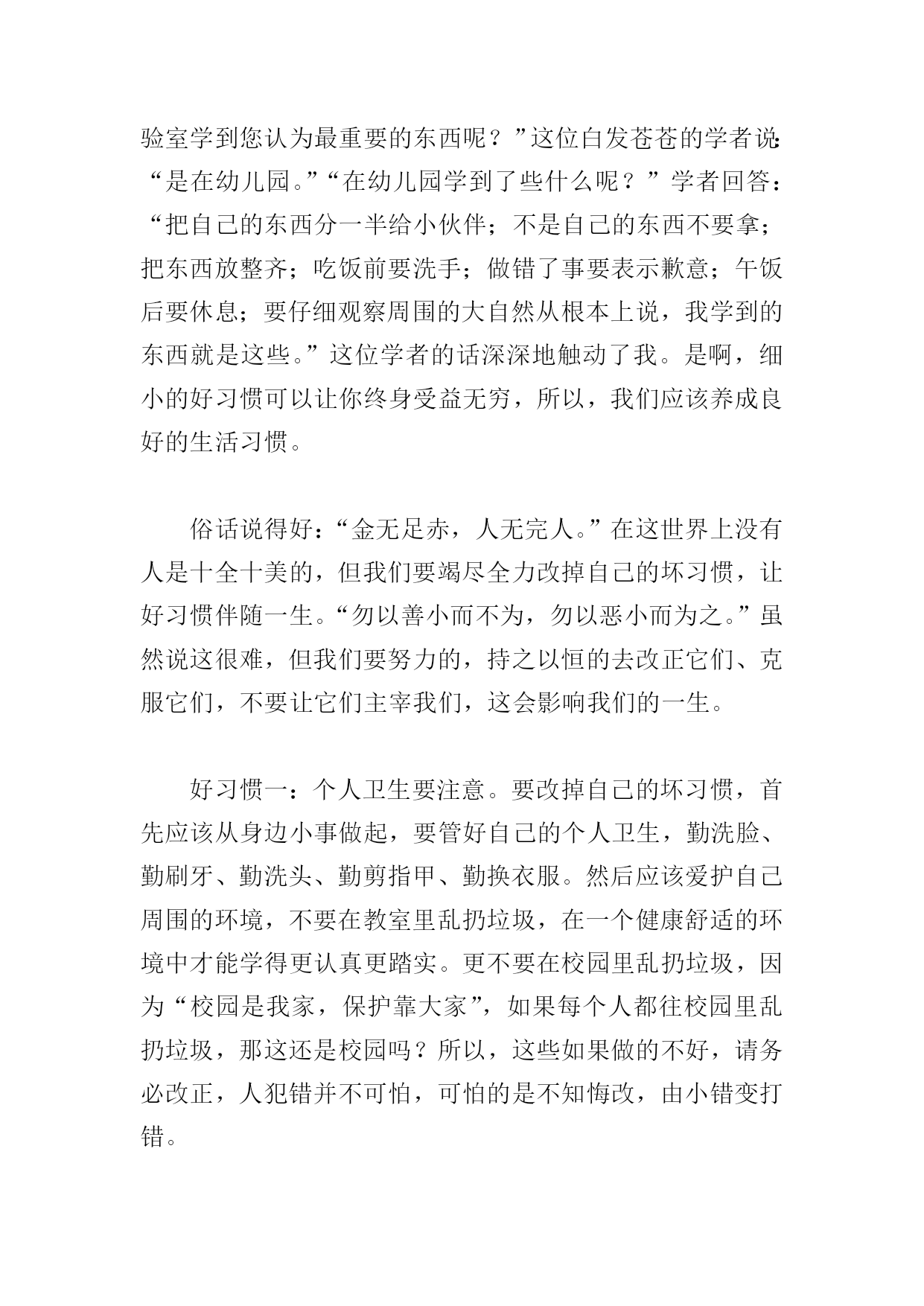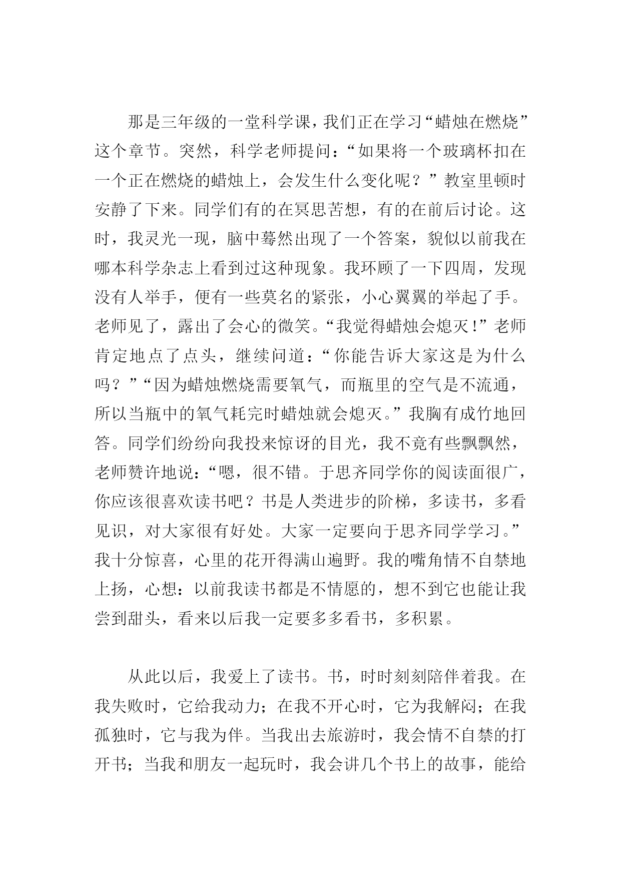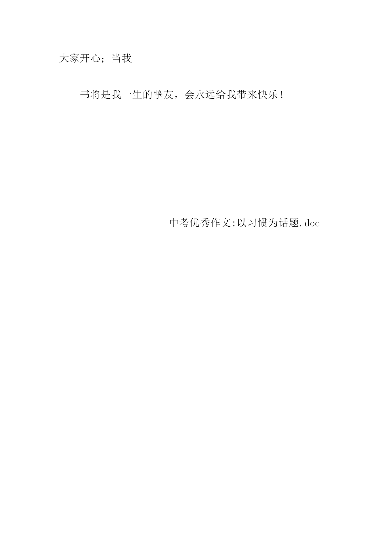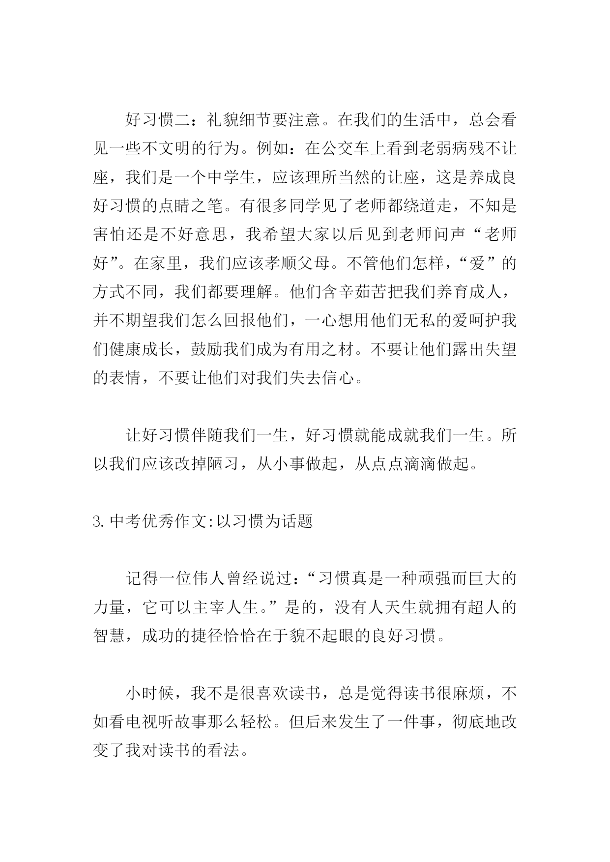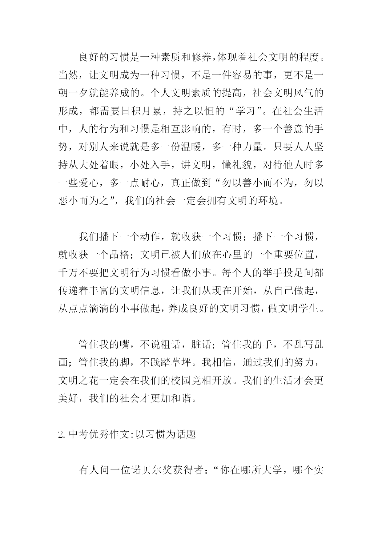 中考优秀作文:以习惯为话题1.中考优秀作文:以习惯为话题社会当中,总有人让不文明的行为成了自己的一种习惯,比如随地吐痰、随手乱扔垃圾;比如在公共场所吸烟、高声喧哗这些虽然是个人行为,但在一定意义上却折射出一座城市的文明形象。每人进步一小步,社会就会进步一大步。文明是一种持久的魅力,文明是一种自觉的行为,是一种美好的习惯。曾经有一位记者在采访一位诺贝尔获奖者时问道:“您是从哪所大学获得重要知识的?”出人意料的是,这位白发苍苍的老者回答道:“我是在幼儿园。”这个人一下子惊呆了,疑问道:“您在幼儿园学到了哪些知识呢?”这位科学家回答说:“我学会了把自己的东西分一半给伙伴;不是自己的东西不能拿;学习用具摆放整齐;午饭后不奔跑;饭前要洗手,做错了事情要表示自己的歉意,仔细观察身边的事物”谁也没想到在我们平时看起来最平常的行为习惯,却成就了这光辉的事业,这位获奖者的话多么的耐人寻味啊!良好的习惯是一种素质和修养,体现着社会文明的程度。当然,让文明成为一种习惯,不是一件容易的事,更不是一朝一夕就能养成的。个人文明素质的提高,社会文明风气的形成,都需要日积月累,持之以恒的“学习”。在社会生活中,人的行为和习惯是相互影响的,有时,多一个善意的手势,对别人来说就是多一份温暖,多一种力量。只要人人坚持从大处着眼,小处入手,讲文明,懂礼貌,对待他人时多一些爱心,多一点耐心,真正做到“勿以善小而不为,勿以恶小而为之”,我们的社会一定会拥有文明的环境。我们播下一个动作,就收获一个习惯;播下一个习惯,就收获一个品格;文明已被人们放在心里的一个重要位置,千万不要把文明行为习惯看做小事。每个人的举手投足间都传递着丰富的文明信息,让我们从现在开始,从自己做起,从点点滴滴的小事做起,养成良好的文明习惯,做文明学生。管住我的嘴,不说粗话,脏话;管住我的手,不乱写乱画;管住我的脚,不践踏草坪。我相信,通过我们的努力,文明之花一定会在我们的校园竞相开放。我们的生活才会更美好,我们的社会才更加和谐。2.中考优秀作文:以习惯为话题有人问一位诺贝尔奖获得者:“你在哪所大学,哪个实验室学到您认为最重要的东西呢?”这位白发苍苍的学者说:“是在幼儿园。”“在幼儿园学到了些什么呢?”学者回答:“把自己的东西分一半给小伙伴;不是自己的东西不要拿;把东西放整齐;吃饭前要洗手;做错了事要表示歉意;午饭后要休息;要仔细观察周围的大自然从根本上说,我学到的东西就是这些。”这位学者的话深深地触动了我。是啊,细小的好习惯可以让你终身受益无穷,所以,我们应该养成良好的生活习惯。俗话说得好:“金无足赤,人无完人。”在这世界上没有人是十全十美的,但我们要竭尽全力改掉自己的坏习惯,让好习惯伴随一生。“勿以善小而不为,勿以恶小而为之。”虽然说这很难,但我们要努力的,持之以恒的去改正它们、克服它们,不要让它们主宰我们,这会影响我们的一生。好习惯一:个人卫生要注意。要改掉自己的坏习惯,首先应该从身边小事做起,要管好自己的个人卫生,勤洗脸、勤刷牙、勤洗头、勤剪指甲、勤换衣服。然后应该爱护自己周围的环境,不要在教室里乱扔垃圾,在一个健康舒适的环境中才能学得更认真更踏实。更不要在校园里乱扔垃圾,因为“校园是我家,保护靠大家”,如果每个人都往校园里乱扔垃圾,那这还是校园吗?所以,这些如果做的不好,请务必改正,人犯错并不可怕,可怕的是不知悔改,由小错变打错。好习惯二:礼貌细节要注意。在我们的生活中,总会看见一些不文明的行为。例如:在公交车上看到老弱病残不让座,我们是一个中学生,应该理所当然的让座,这是养成良好习惯的点睛之笔。有很多同学见了老师都绕道走,不知是害怕还是不好意思,我希望大家以后见到老师问声“老师好”。在家里,我们应该孝顺父母。不管他们怎样,“爱”的方式不同,我们都要理解。他们含辛茹苦把我们养育成人,并不期望我们怎么回报他们,一心想用他们无私的爱呵护我们健康成长,鼓励我们成为有用之材。不要让他们露出失望的表情,不要让他们对我们失去信心。让好习惯伴随我们一生,好习惯就能成就我们一生。所以我们应该改掉陋习,从小事做起,从点点滴滴做起。3.中考优秀作文:以习惯为话题记得一位伟人曾经说过:“习惯真是一种顽强而巨大的力量,它可以主宰人生。”是的,没有人天生就拥有超人的智慧,成功的捷径恰恰在于貌不起眼的良好习惯。小时候,我不是很喜欢读书,总是觉得读书很麻烦,不如看电视听故事那么轻松。但后来发生了一件事,彻底地改变了我对读书的看法。那是三年级的一堂科学课,我们正在学习“蜡烛在燃烧”这个章节。突然,科学老师提问:“如果将一个玻璃杯扣在一个正在燃烧的蜡烛上,会发生什么变化呢?”教室里顿时安静了下来。同学们有的在冥思苦想,有的在前后讨论。这时,我灵光一现,脑中