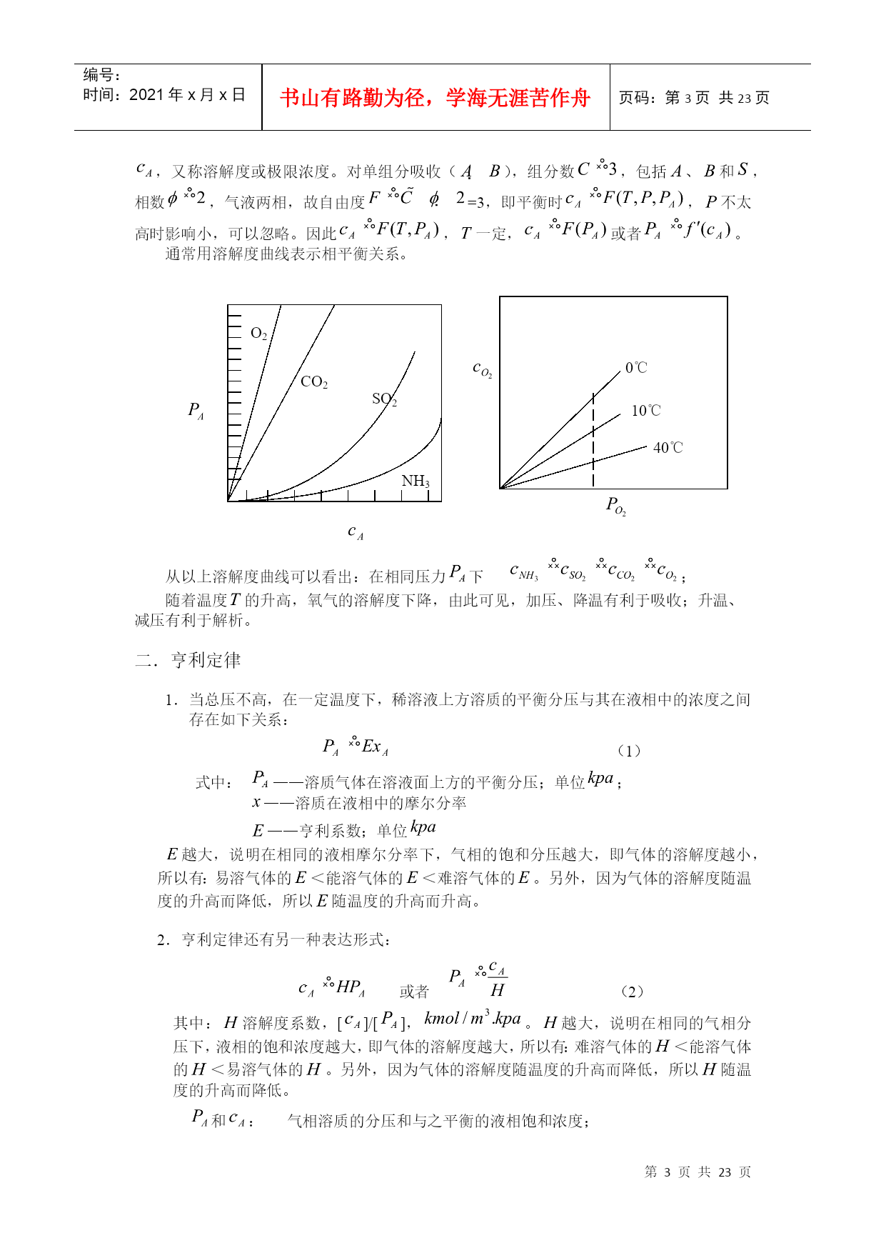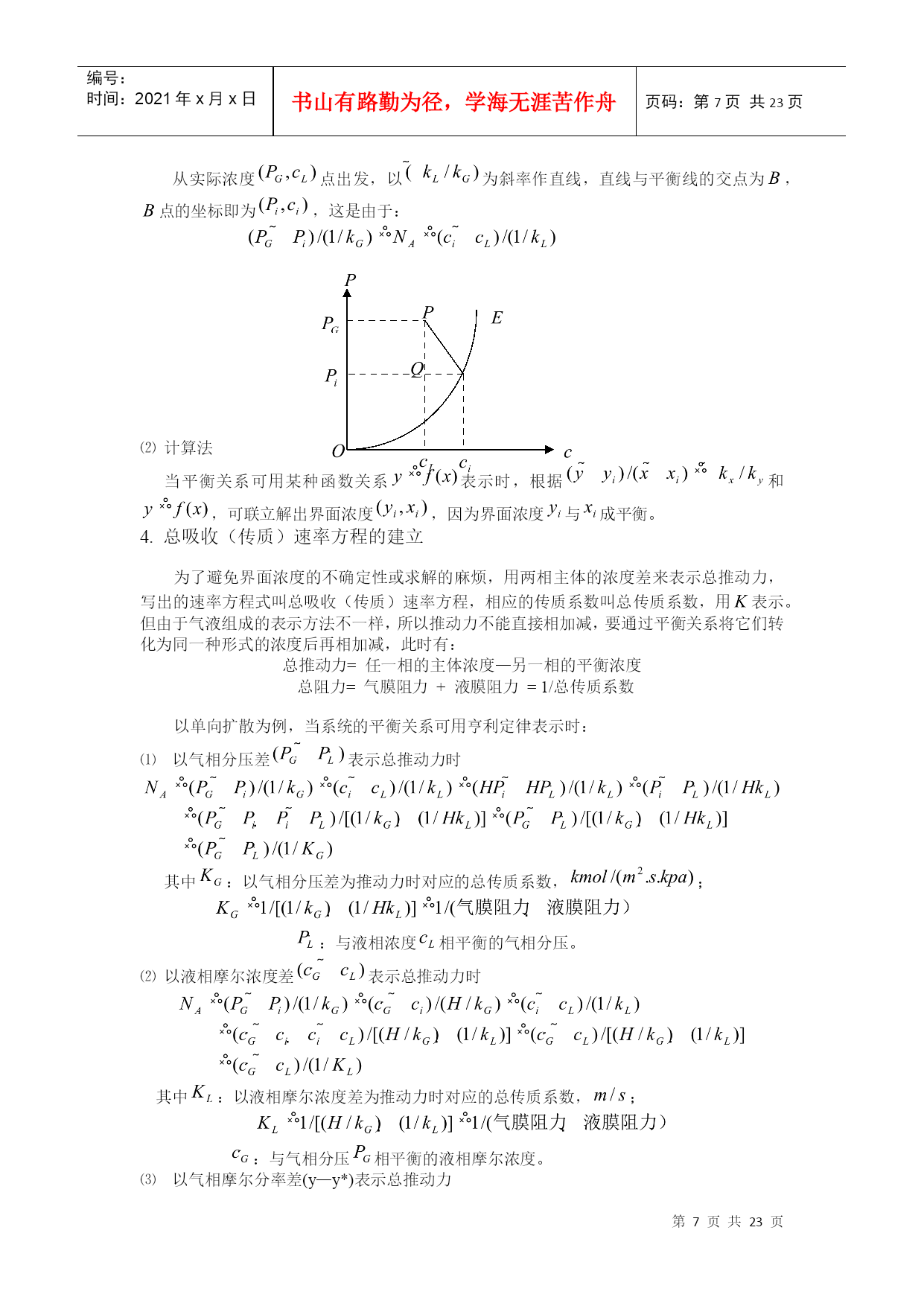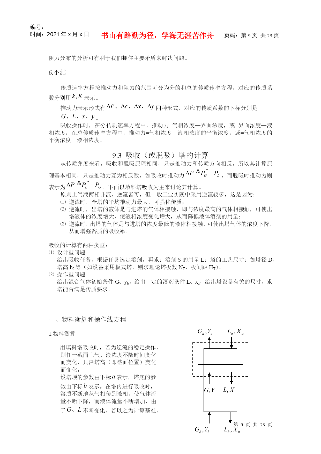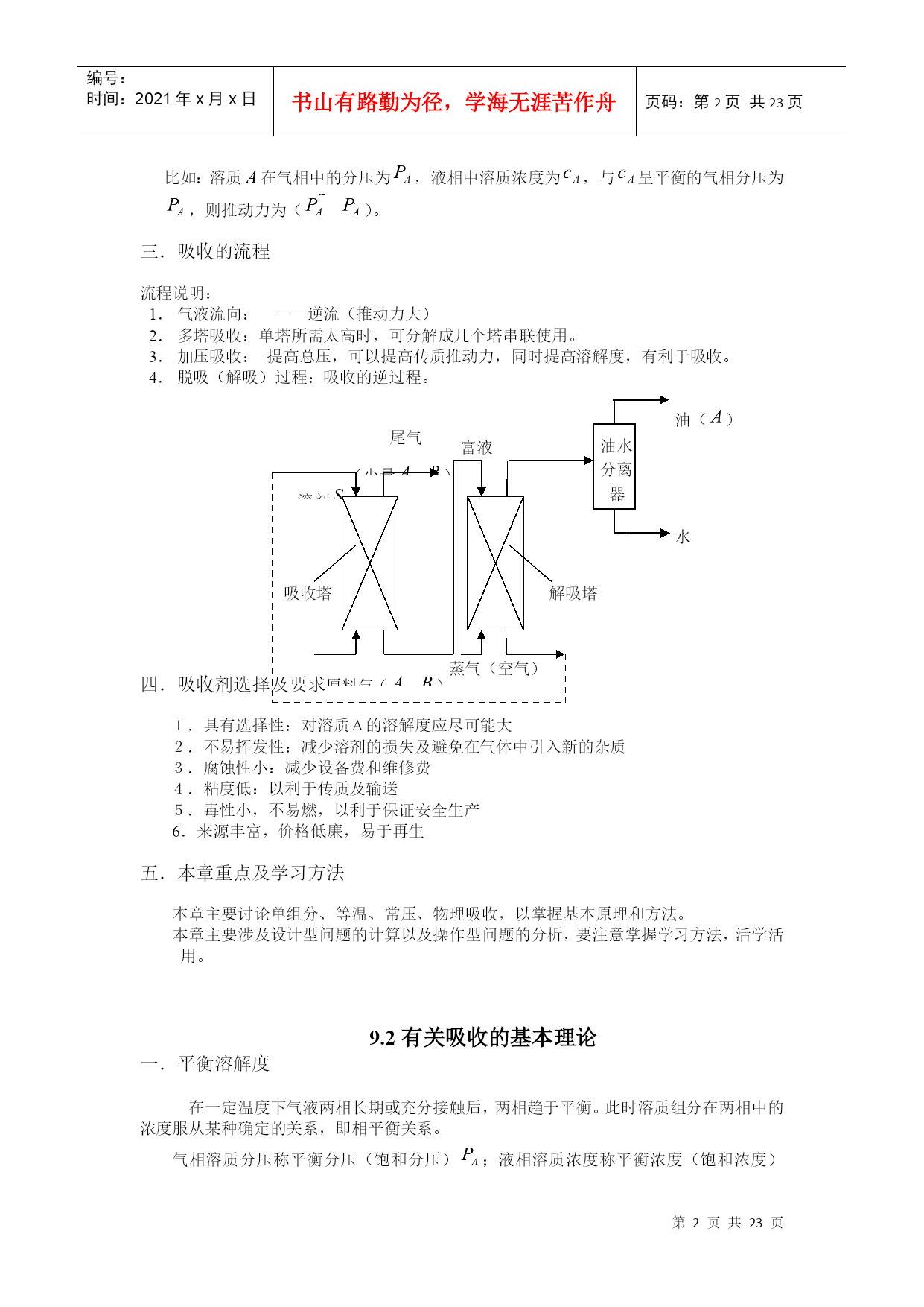 编号:时间:2021年x月x日书山有路勤为径,学海无涯苦作舟页码:第PAGE23页共NUMPAGES23页第PAGE\*MERGEFORMAT23页共NUMPAGES\*MERGEFORMAT23页HYPERLINK""HYPERLINK"nshu.cn/"9.吸收9.1概述利用不同组分在溶剂中溶解度的差异,分离气体混合物的过程,称为吸收;能被溶解的组分——溶质;不能被溶解的组分——惰性组分(载体);所用溶剂——吸收剂。吸收液。一.工业生产中的吸收过程1.工业上的应用(1)原料气的净化:如煤气中的H2S除去。(2)有用组分的回收:如合成氨厂的放空气中用水回收氨。(3)某些产品的制取:将气体中需要的成份以指定的溶剂吸收出来,成为液态的产品或半成品,如:从含HCl气体中盐酸(4)废气的治理:如含SO2,NO,NO2等废气中,要除去这些有害成份。2.吸收的分类(1)按性质划分物理吸收:溶质不发生明显的化学反应,如水吸收CO2,SO2等。化学吸收:溶质与溶剂或溶液中其它物质进行化学反应。(如用NaOH吸收CO2)(2)温度是否变化等温吸收:当溶剂用量很大,温升不明显时非等温吸收:(3)被吸收组分数目分单组分吸收:只吸收一种组分多组分吸收二.吸收过程的极限及方向极限:气液两相呈平衡状态;方向或推动力:一相浓度与同另一相浓度呈平衡的该相浓度之差;比如:溶质在气相中的分压为,液相中溶质浓度为,与呈平衡的气相分压为,则推动力为()。三.吸收的流程流程说明:气液流向:——逆流(推动力大)多塔吸收:单塔所需太高时,可分解成几个塔串联使用。加压吸收:提高总压,可以提高传质推动力,同时提高溶解度,有利于吸收。脱吸(解吸)过程:吸收的逆过程。原料气()尾气(少量)溶剂吸收塔解吸塔油水分离器油()水富液蒸气(空气)四.吸收剂选择及要求1.具有选择性:对溶质A的溶解度应尽可能大2.不易挥发性:减少溶剂的损失及避免在气体中引入新的杂质3.腐蚀性小:减少设备费和维修费4.粘度低:以利于传质及输送5.毒性小,不易燃,以利于保证安全生产6.来源丰富,价格低廉,易于再生五.本章重点及学习方法本章主要讨论单组分、等温、常压、物理吸收,以掌握基本原理和方法。本章主要涉及设计型问题的计算以及操作型问题的分析,要注意掌握学习方法,活学活用。9.2有关吸收的基本理论一.平衡溶解度在一定温度下气液两相长期或充分接触后,两相趋于平衡。此时溶质组分在两相中的浓度服从某种确定的关系,即相平衡关系。气相溶质分压称平衡分压(饱和分压);液相溶质浓度称平衡浓度(饱和浓度),又称溶解度或极限浓度。对单组分吸收(),组分数,包括、和,相数,气液两相,故自由度=3,即平衡时,不太高时影响小,可以忽略。因此,一定,或者。通常用溶解度曲线表示相平衡关系。NH3SO2CO2O210℃40℃0℃从以上溶解度曲线可以看出:在相同压力下;随着温度的升高,氧气的溶解度下降,由此可见,加压、降温有利于吸收;升温、减压有利于解析。二.亨利定律1.当总压不高,在一定温度下,稀溶液上方溶质的平衡分压与其在液相中的浓度之间存在如下关系:(1)式中:——溶质气体在溶液面上方的平衡分压;单位;——溶质在液相中的摩尔分率——亨利系数;单位越大,说明在相同的液相摩尔分率下,气相的饱和分压越大,即气体的溶解度越小,所以有:易溶气体的<能溶气体的<难溶气体的。另外,因为气体的溶解度随温度的升高而降低,所以随温度的升高而升高。2.亨利定律还有另一种表达形式:或者(2)其中:溶解度系数,[]/[],。越大,说明在相同的气相分压下,液相的饱和浓度越大,即气体的溶解度越大,所以有:难溶气体的<能溶气体的<易溶气体的。另外,因为气体的溶解度随温度的升高而降低,所以随温度的升高而降低。和:气相溶质的分压和与之平衡的液相饱和浓度;和:液相溶质的摩尔浓度和与之平衡的气相饱和分压。因为(1)式中,将其代入(2)可以得到:所以式中对于稀溶液:可以取溶剂的分子量,如对稀NH3溶液,,3.气液浓度均用摩尔分率表示或者—相平衡常数由等式两边同时除以总压,可以得到:即令,则有和:气相溶质的摩尔分率和与之平衡的液相饱和摩尔分率;和:溶质的液相摩尔分率和与之平衡的气相饱和摩尔分率。越大,说明在相同的液相摩尔分率下,气相的饱和摩尔分率越大,即气体的溶解度越小,所以有:易溶气体的<能溶气体的<难溶气体的。另外,因为气体的溶解度随温度的升高而降低,所以随