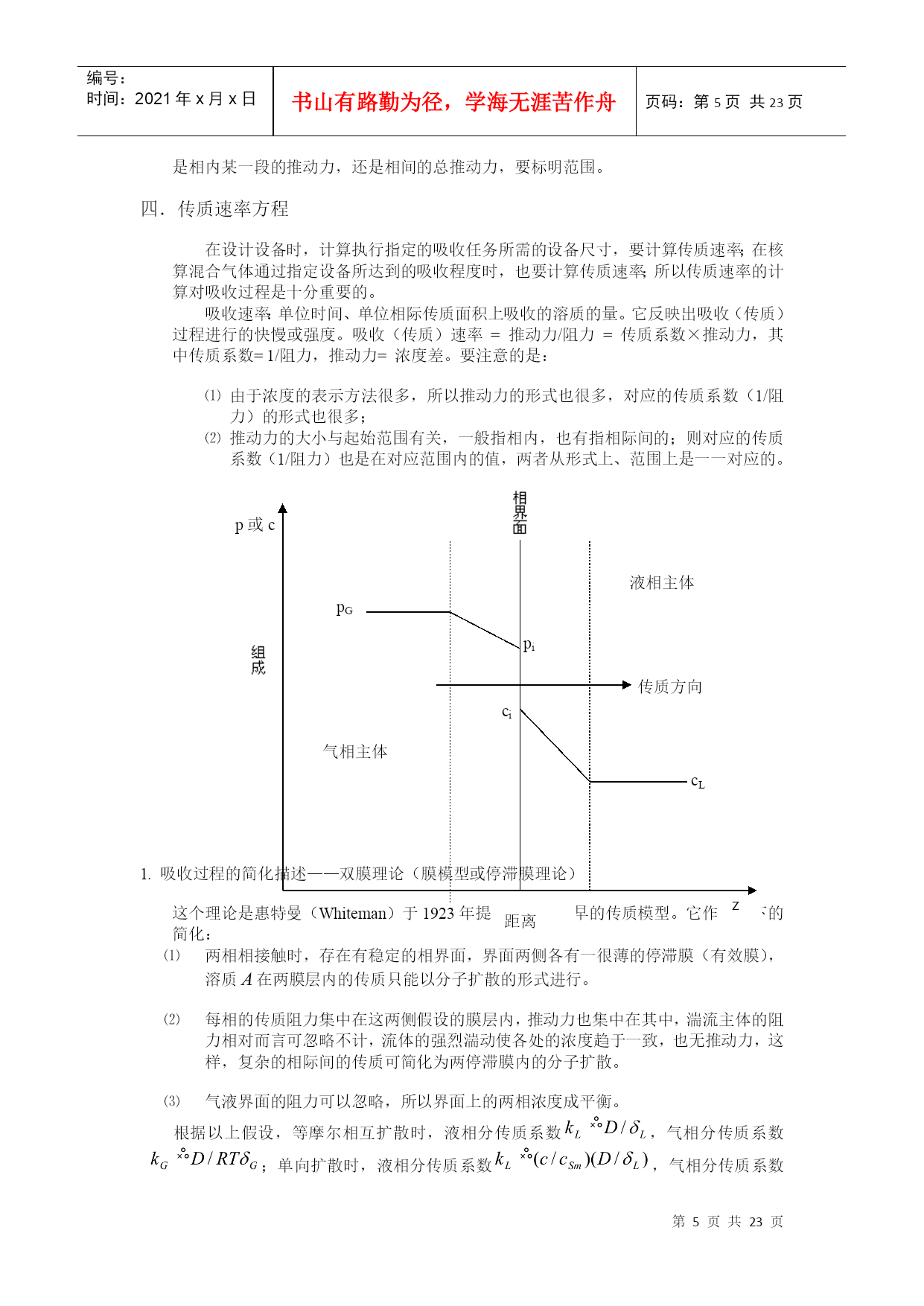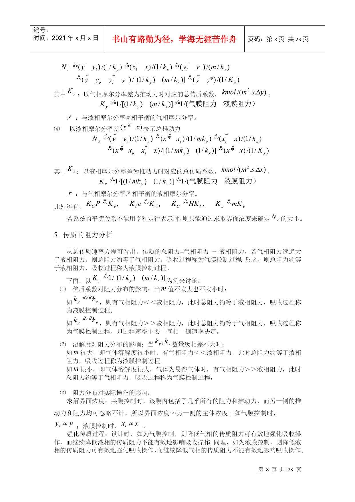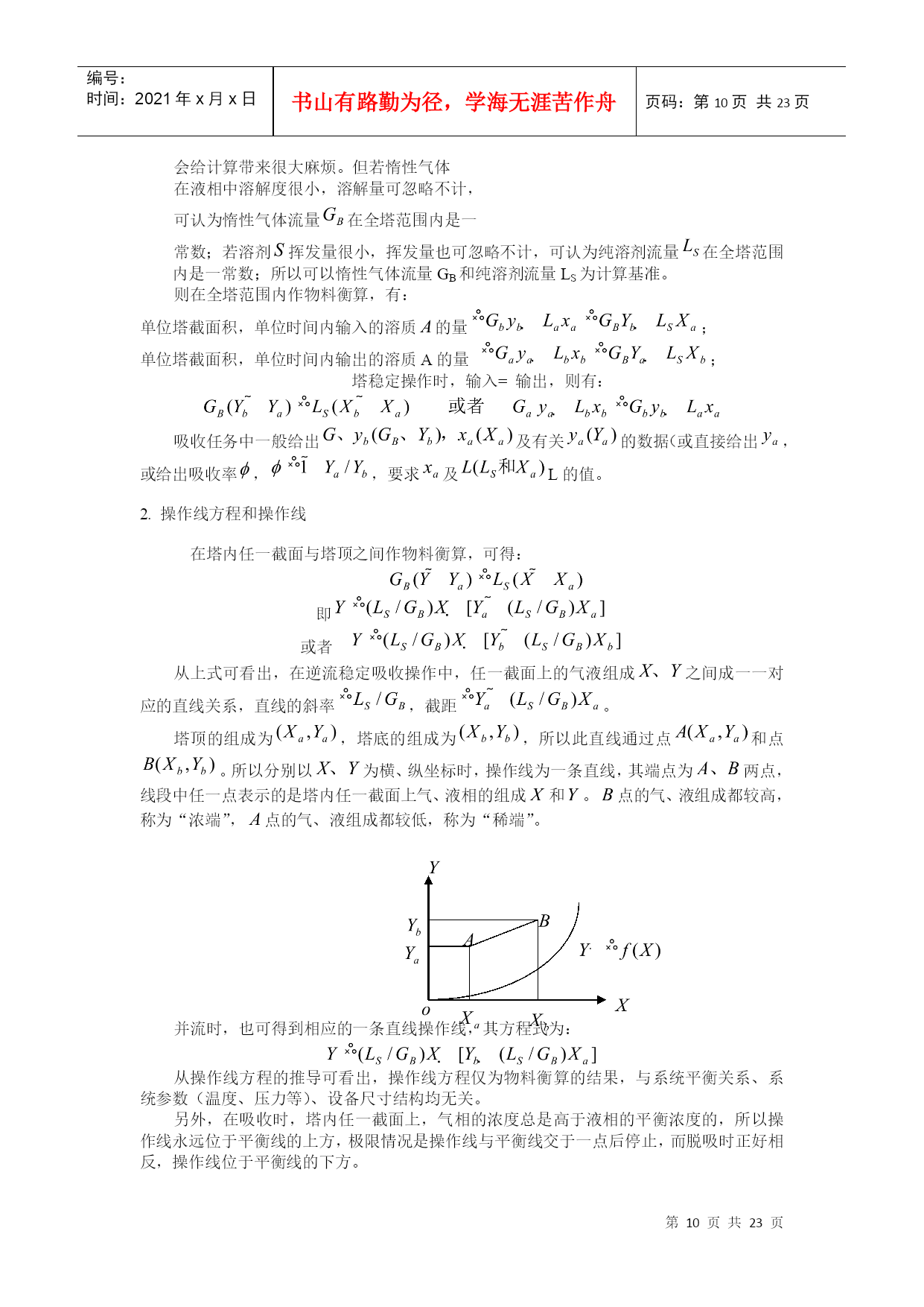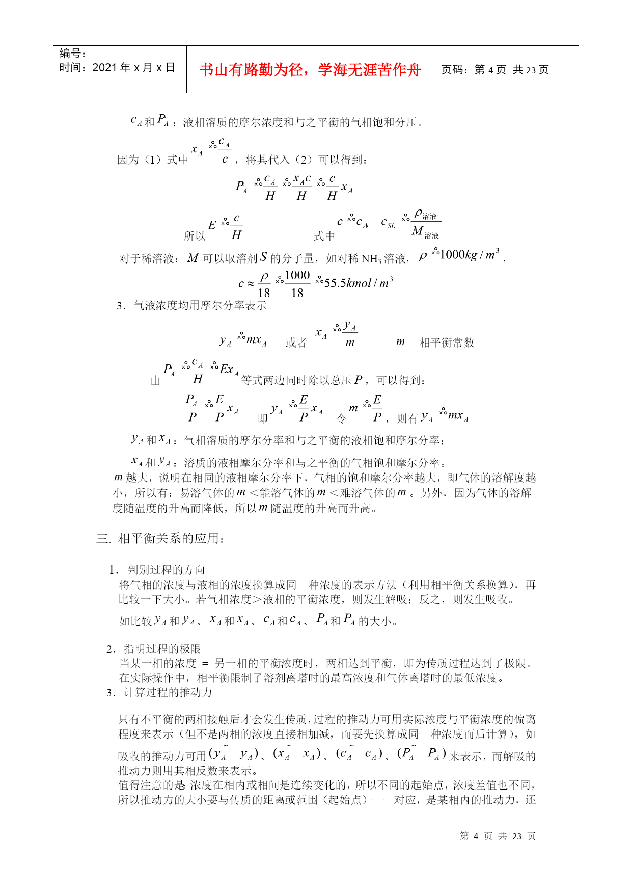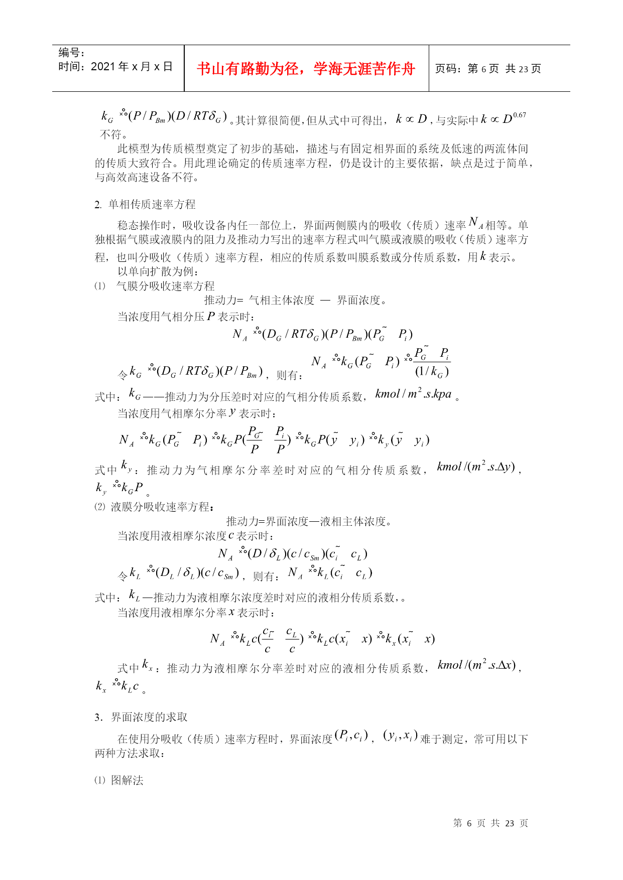 编号:时间:2021年x月x日书山有路勤为径,学海无涯苦作舟页码:第PAGE23页共NUMPAGES23页第PAGE\*MERGEFORMAT23页共NUMPAGES\*MERGEFORMAT23页HYPERLINK""HYPERLINK"nshu.cn/"9.吸收9.1概述利用不同组分在溶剂中溶解度的差异,分离气体混合物的过程,称为吸收;能被溶解的组分——溶质;不能被溶解的组分——惰性组分(载体);所用溶剂——吸收剂。吸收液。一.工业生产中的吸收过程1.工业上的应用(1)原料气的净化:如煤气中的H2S除去。(2)有用组分的回收:如合成氨厂的放空气中用水回收氨。(3)某些产品的制取:将气体中需要的成份以指定的溶剂吸收出来,成为液态的产品或半成品,如:从含HCl气体中盐酸(4)废气的治理:如含SO2,NO,NO2等废气中,要除去这些有害成份。2.吸收的分类(1)按性质划分物理吸收:溶质不发生明显的化学反应,如水吸收CO2,SO2等。化学吸收:溶质与溶剂或溶液中其它物质进行化学反应。(如用NaOH吸收CO2)(2)温度是否变化等温吸收:当溶剂用量很大,温升不明显时非等温吸收:(3)被吸收组分数目分单组分吸收:只吸收一种组分多组分吸收二.吸收过程的极限及方向极限:气液两相呈平衡状态;方向或推动力:一相浓度与同另一相浓度呈平衡的该相浓度之差;比如:溶质在气相中的分压为,液相中溶质浓度为,与呈平衡的气相分压为,则推动力为()。三.吸收的流程流程说明:气液流向:——逆流(推动力大)多塔吸收:单塔所需太高时,可分解成几个塔串联使用。加压吸收:提高总压,可以提高传质推动力,同时提高溶解度,有利于吸收。脱吸(解吸)过程:吸收的逆过程。原料气()尾气(少量)溶剂吸收塔解吸塔油水分离器油()水富液蒸气(空气)四.吸收剂选择及要求1.具有选择性:对溶质A的溶解度应尽可能大2.不易挥发性:减少溶剂的损失及避免在气体中引入新的杂质3.腐蚀性小:减少设备费和维修费4.粘度低:以利于传质及输送5.毒性小,不易燃,以利于保证安全生产6.来源丰富,价格低廉,易于再生五.本章重点及学习方法本章主要讨论单组分、等温、常压、物理吸收,以掌握基本原理和方法。本章主要涉及设计型问题的计算以及操作型问题的分析,要注意掌握学习方法,活学活用。9.2有关吸收的基本理论一.平衡溶解度在一定温度下气液两相长期或充分接触后,两相趋于平衡。此时溶质组分在两相中的浓度服从某种确定的关系,即相平衡关系。气相溶质分压称平衡分压(饱和分压);液相溶质浓度称平衡浓度(饱和浓度),又称溶解度或极限浓度。对单组分吸收(),组分数,包括、和,相数,气液两相,故自由度=3,即平衡时,不太高时影响小,可以忽略。因此,一定,或者。通常用溶解度曲线表示相平衡关系。NH3SO2CO2O210℃40℃0℃从以上溶解度曲线可以看出:在相同压力下;随着温度的升高,氧气的溶解度下降,由此可见,加压、降温有利于吸收;升温、减压有利于解析。二.亨利定律1.当总压不高,在一定温度下,稀溶液上方溶质的平衡分压与其在液相中的浓度之间存在如下关系:(1)式中:——溶质气体在溶液面上方的平衡分压;单位;——溶质在液相中的摩尔分率——亨利系数;单位越大,说明在相同的液相摩尔分率下,气相的饱和分压越大,即气体的溶解度越小,所以有:易溶气体的<能溶气体的<难溶气体的。另外,因为气体的溶解度随温度的升高而降低,所以随温度的升高而升高。2.亨利定律还有另一种表达形式:或者(2)其中:溶解度系数,[]/[],。越大,说明在相同的气相分压下,液相的饱和浓度越大,即气体的溶解度越大,所以有:难溶气体的<能溶气体的<易溶气体的。另外,因为气体的溶解度随温度的升高而降低,所以随温度的升高而降低。和:气相溶质的分压和与之平衡的液相饱和浓度;和:液相溶质的摩尔浓度和与之平衡的气相饱和分压。因为(1)式中,将其代入(2)可以得到:所以式中对于稀溶液:可以取溶剂的分子量,如对稀NH3溶液,,3.气液浓度均用摩尔分率表示或者—相平衡常数由等式两边同时除以总压,可以得到:即令,则有和:气相溶质的摩尔分率和与之平衡的液相饱和摩尔分率;和:溶质的液相摩尔分率和与之平衡的气相饱和摩尔分率。越大,说明在相同的液相摩尔分率下,气相的饱和摩尔分率越大,即气体的溶解度越小,所以有:易溶气体的<能溶气体的<难溶气体的。另外,因为气体的溶解度随温度的升高而降低,所以随