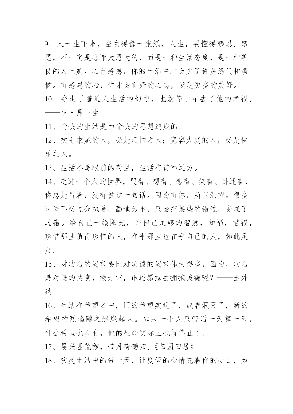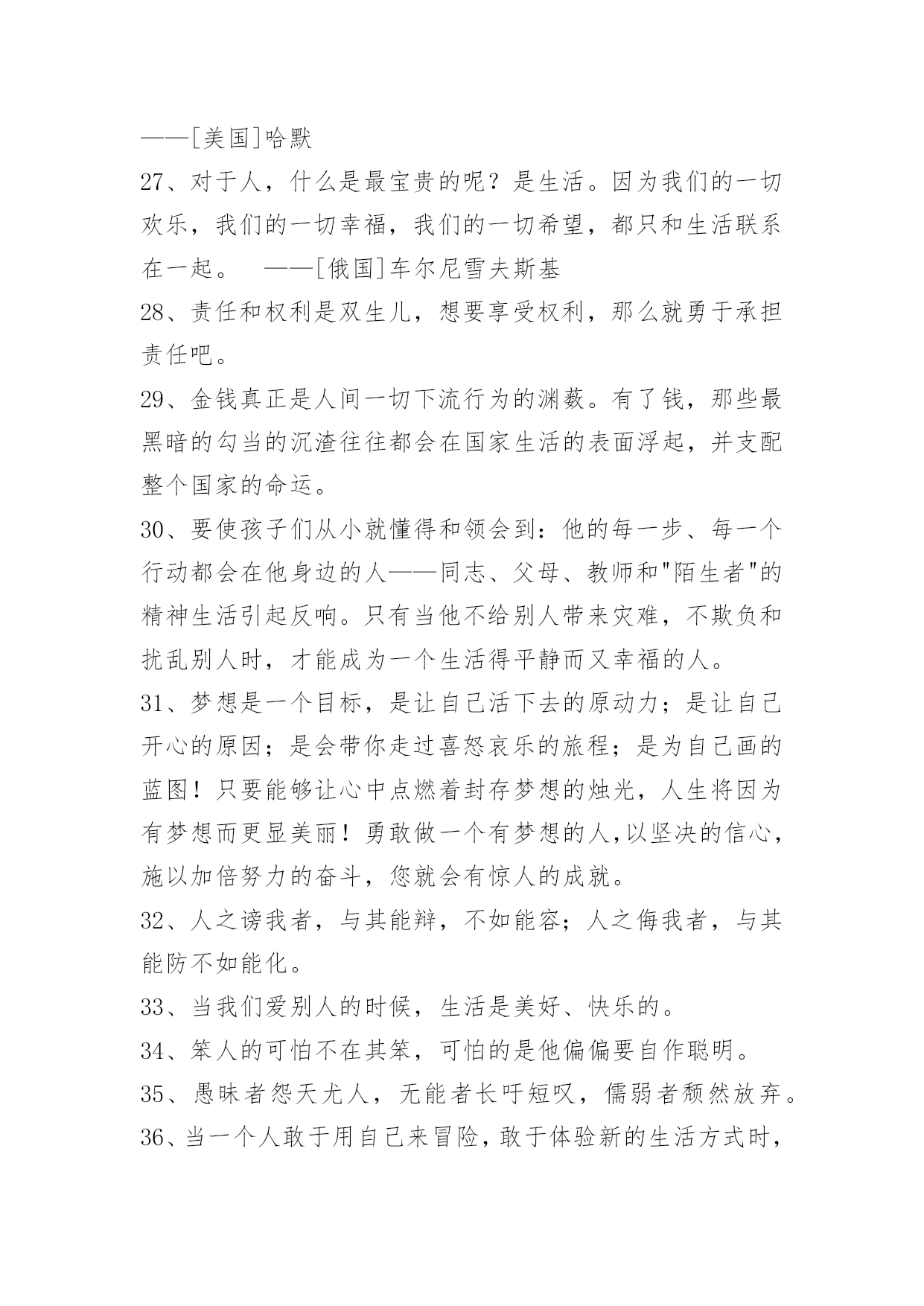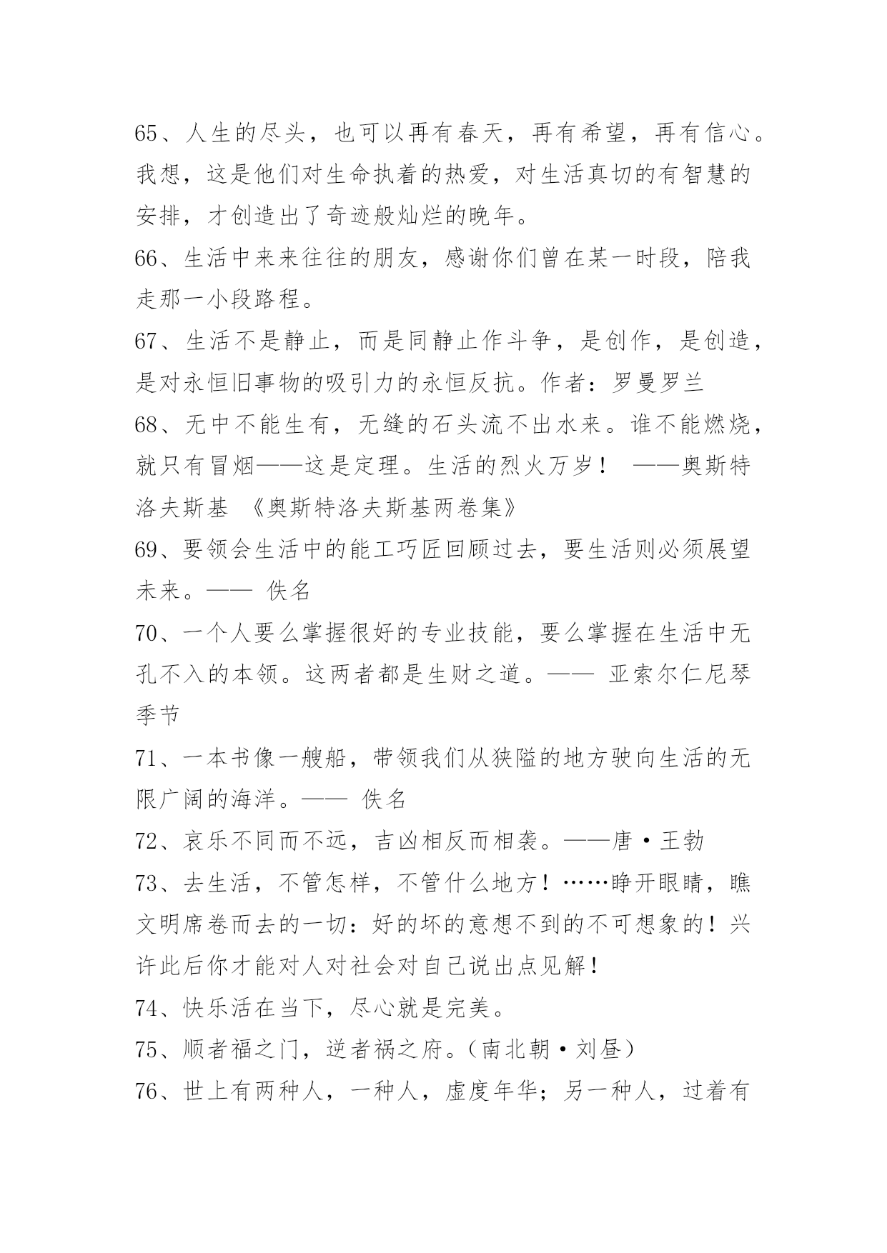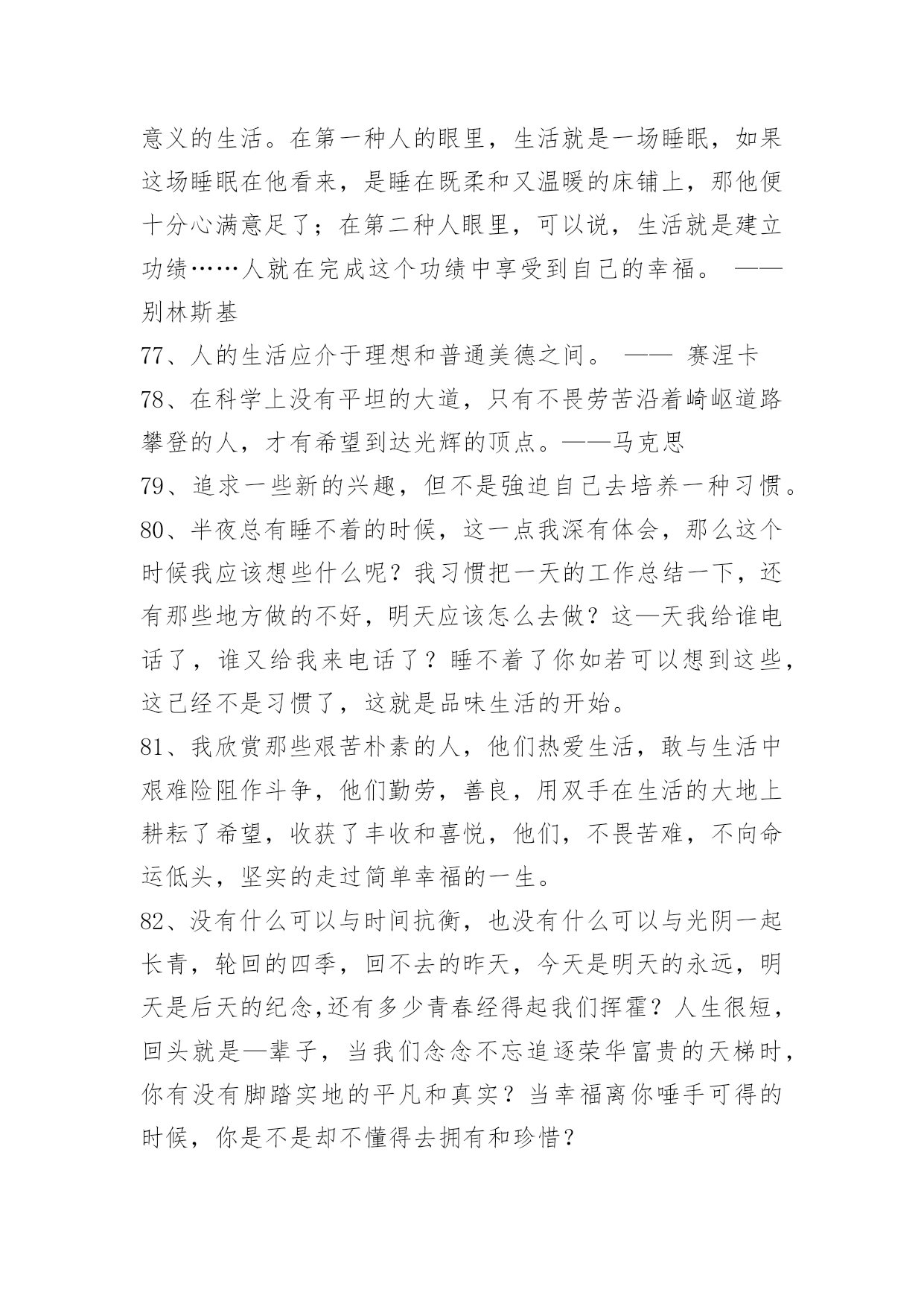 生活名言名句精选生活名言名句集锦87句没有牺牲,不作努力,不经艰难困苦便不能在世上生存:生活不是一个只生长鲜花的花园。——(俄国作家)冈察洛夫下面是小编为大家准备的生活名言名句87句,希望能够帮助到大家。1、一个人应当好好地安排生活,要使每一刻的时光都有意义。2、生活得最有意义的人,并不就是年岁活得最长的人,而是对生活最有感受的人。——卢梭3、感伤者,自己给自己制造悲剧,盲目者,自己骗自己演着闹剧,而真正的生活,应当是有悲剧喜剧还有闹剧!4、今天做的一切挣扎都是在为明天积蓄力量,所以别放弃。青春,注定了要颠簸,要有眼泪和汗水,有委屈、不甘和失败。小时候画在手上的表没有动,却带走了我们最好的时光。5、热爱生活的人,生活也爱他。——佚名6、生活中如果只有幸福、快乐,没有苦难、悲伤,这样的生活至少不是人的生活。企图只去选择享乐和满足的生活,只能带来愚昧和野蛮。7、俭朴的生活,不但可使精神愉快,而且可以培养革命品质。8、永远不要浪费您的一分一秒,去想任何您不喜欢的人。9、人一生下来,空白得像一张纸,人生,要懂得感恩。感恩,不一定是感谢大恩大德,而是一种生活态度,是一种善良的人性美。心存感恩,你的生活中才会少了许多怨气和烦恼。有感恩的心,你才会有好的心态,发现更多的美好。10、夺走了普通人生活的幻想,也就等于夺去了他的幸福。——亨·易卜生11、愉快的生活是由愉快的思想造成的。12、吹毛求疵的人,必是烦恼之人;宽容大度的人,必是快乐之人。13、生活不是眼前的苟且,生活有诗和远方。14、走进一个人的世界,哭着、想着、恋着、笑着、讲述着,你总是看着,没有说过一句话。因为有你,所以渴望。很多时候不必过分执着,画地为牢,只会把某些的错过,变成了过错。给自己一缕阳光,许自己足够的智慧,知福,惜福,珍惜那些值得珍惜的人,在乎那些也在乎自己的人,如此足矣。15、对功名的渴求要比对美德的渴求伟大得多,因为,功名是对美的奖赏,撇开它,谁还愿意去拥抱美德呢?——玉外纳16、生活在希望之中,旧的希望实现了,或者泯灭了,新的希望的烈焰随之燃烧起来。如果一个人只管活一天算一天,什么希望也没有,他的生命实际上也就停止了。17、晨兴理荒秽,带月荷锄归。《归园田居》18、欢度生活中的每一天,让度假的心情充满你的心田,为什么不呢?朝着最美满的生活,朝着你的梦想迈进!19、只有我们这些看透了和认识了全部生活的全部意义的人,才不能随便死去,哪怕只有一点机会就不能放弃生活。——[前苏联]奥斯特洛夫斯基20、生活是一辆永无终点的公共汽车,当你买票上车后,很难说你会遇见什么样的旅伴。——[美国]爱默生21、生活除了梦幻之外,也充满了现实,一个人不能靠回忆过活。——[美国]欧·亨利22、有的人,生活得就像拉大车似的,哼哧哧,愁眉苦脸。对什么都不满意,什么事儿都不能让他高兴,对什么都嫉妒,对所有的人都挺凶,对自己就更厉害。这哪儿是什么生活,简直是活受罪。——[前苏联]安德列耶夫23、对于大多数人来说,生活就是一场跟贫困所作的漫长斗争。——[英国]罗·特雷塞尔24、生活的美妙就在它的丰富多彩,要使生活变得有趣,就要不断地充实它。25、生活比任何教条都复杂,都多样化,而一个人的命运也远不是按算术规则组成的。——[前苏联]格里戈里·麦登斯基26、对于每个人生活道路上必然出现的普通的不愉快的事情,我们必须常常提醒自己,我们并不是弱者,我们有能力战胜它:我们要对自己的生活负责,通过行动、通过努力、通过汇集自己所有的勇气和毅力,我们能够创造一个完全不同的机会,能摆脱苦恼的纠缠,而且每次努力都会有成效。——[美国]哈默27、对于人,什么是最宝贵的呢?是生活。因为我们的一切欢乐,我们的一切幸福,我们的一切希望,都只和生活联系在一起。——[俄国]车尔尼雪夫斯基28、责任和权利是双生儿,想要享受权利,那么就勇于承担责任吧。29、金钱真正是人间一切下流行为的渊薮。有了钱,那些最黑暗的勾当的沉渣往往都会在国家生活的表面浮起,并支配整个国家的命运。30、要使孩子们从小就懂得和领会到:他的每一步、每一个行动都会在他身边的人——同志、父母、教师和"陌生者"的精神生活引起反响。只有当他不给别人带来灾难,不欺负和扰乱别人时,才能成为一个生活得平静而又幸福的人。31、梦想是一个目标,是让自己活下去的原动力;是让自己开心的原因;是会带你走过喜怒哀乐的旅程;是为自己画的蓝图!只要能够让心中点燃着封存梦想的烛光,人生将因为有梦想而更显美丽!勇敢做一个有梦想的人,以坚决的信心,施以加倍努力的奋斗,您就会有惊人的成就。32、人之谤我者,与其能辩,不如能容;人之侮我者,与其能防不如能化。33、当我们爱别人的时候,生活是美好、快乐的。34、笨人的可怕不在其笨,可怕的是他偏偏要自作聪明。35、愚昧者怨天尤人,无能者长吁短叹,儒弱者颓