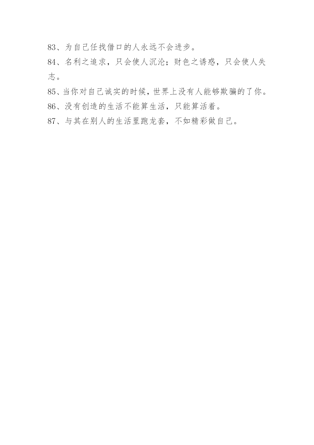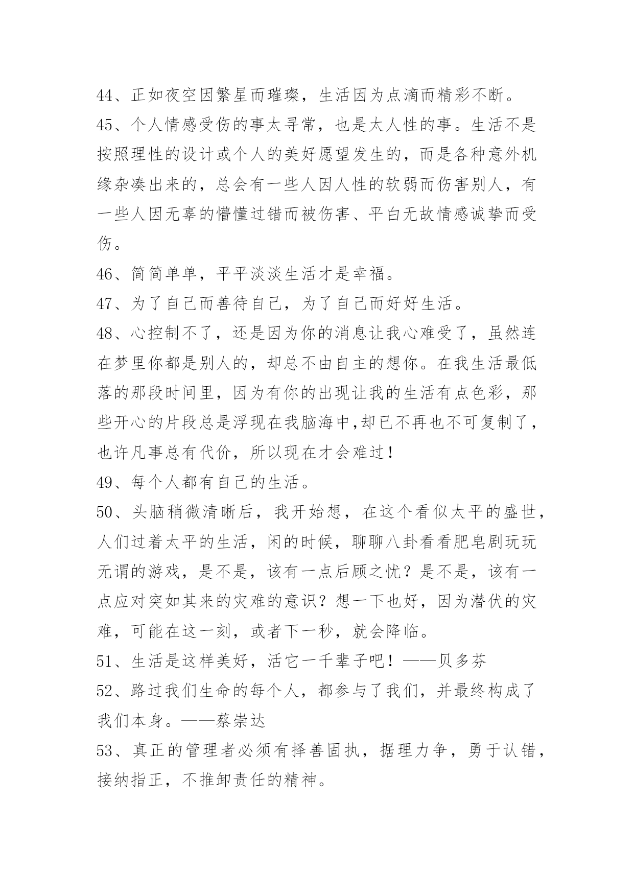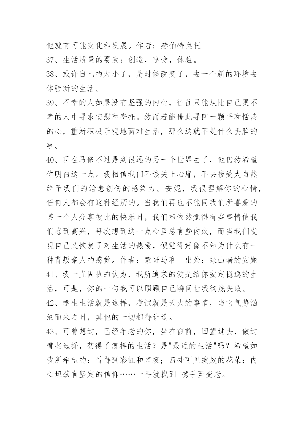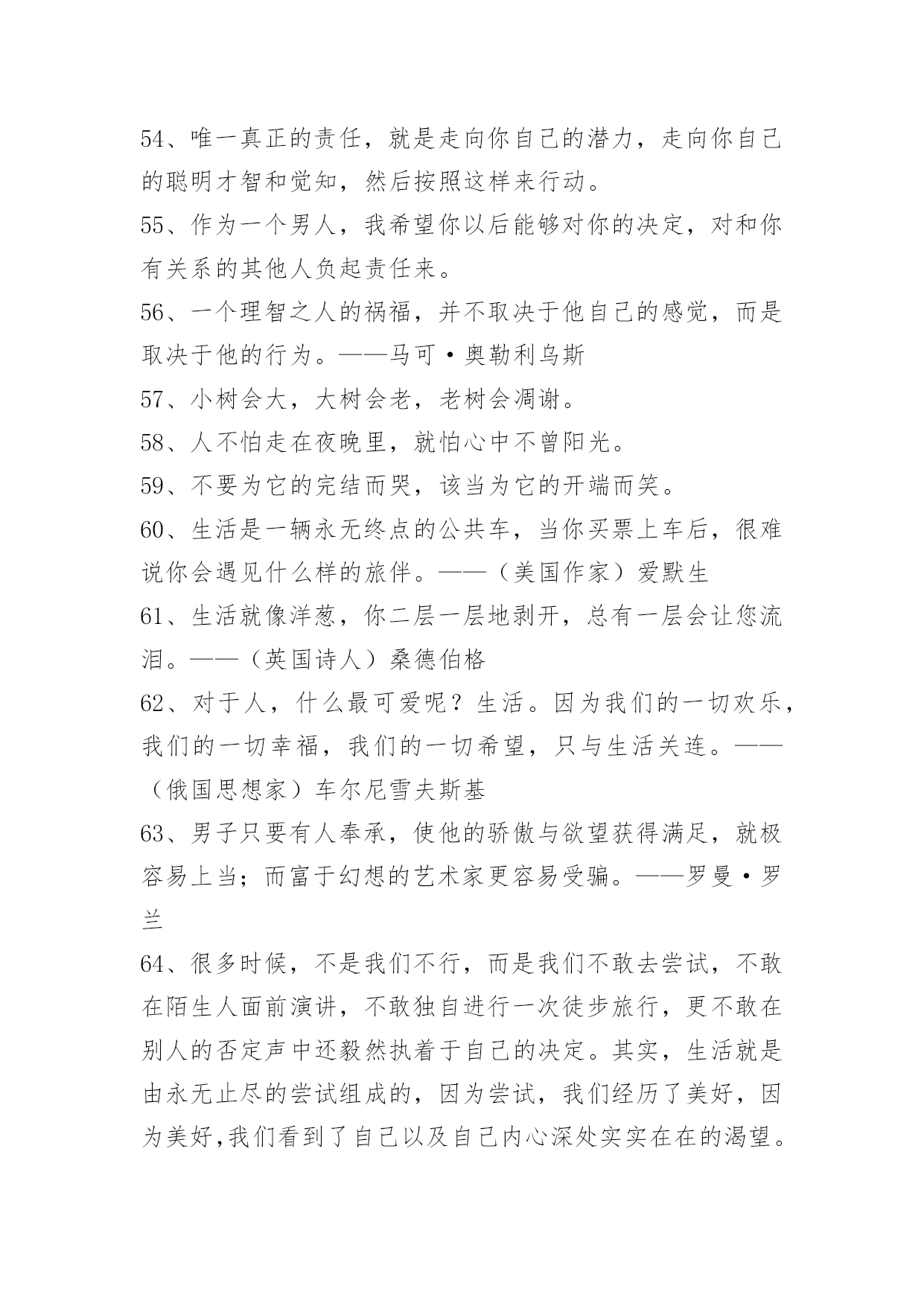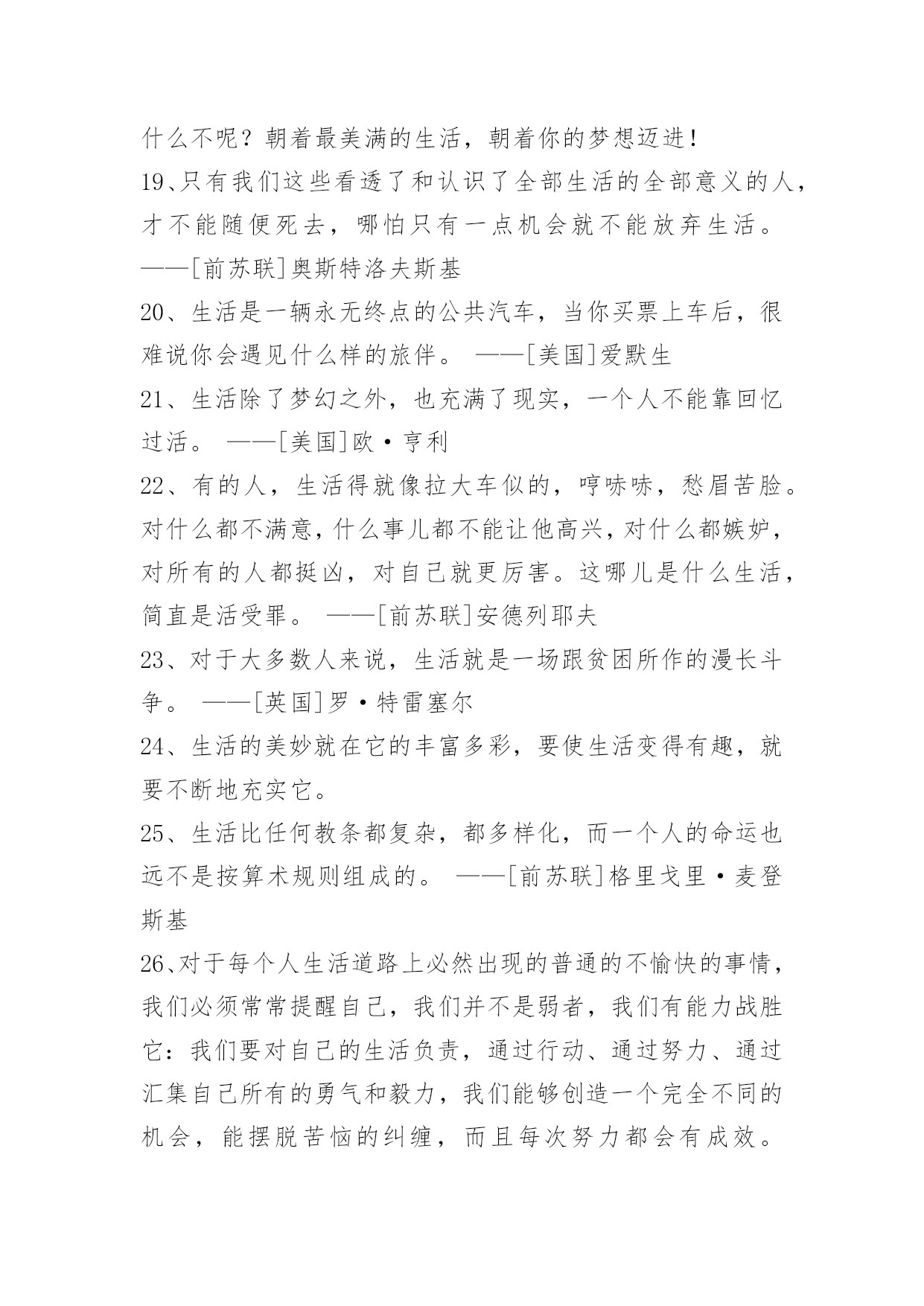 生活名言名句精选生活名言名句集锦87句没有牺牲,不作努力,不经艰难困苦便不能在世上生存:生活不是一个只生长鲜花的花园。——(俄国作家)冈察洛夫下面是小编为大家准备的生活名言名句87句,希望能够帮助到大家。1、一个人应当好好地安排生活,要使每一刻的时光都有意义。2、生活得最有意义的人,并不就是年岁活得最长的人,而是对生活最有感受的人。——卢梭3、感伤者,自己给自己制造悲剧,盲目者,自己骗自己演着闹剧,而真正的生活,应当是有悲剧喜剧还有闹剧!4、今天做的一切挣扎都是在为明天积蓄力量,所以别放弃。青春,注定了要颠簸,要有眼泪和汗水,有委屈、不甘和失败。小时候画在手上的表没有动,却带走了我们最好的时光。5、热爱生活的人,生活也爱他。——佚名6、生活中如果只有幸福、快乐,没有苦难、悲伤,这样的生活至少不是人的生活。企图只去选择享乐和满足的生活,只能带来愚昧和野蛮。7、俭朴的生活,不但可使精神愉快,而且可以培养革命品质。8、永远不要浪费您的一分一秒,去想任何您不喜欢的人。9、人一生下来,空白得像一张纸,人生,要懂得感恩。感恩,不一定是感谢大恩大德,而是一种生活态度,是一种善良的人性美。心存感恩,你的生活中才会少了许多怨气和烦恼。有感恩的心,你才会有好的心态,发现更多的美好。10、夺走了普通人生活的幻想,也就等于夺去了他的幸福。——亨·易卜生11、愉快的生活是由愉快的思想造成的。12、吹毛求疵的人,必是烦恼之人;宽容大度的人,必是快乐之人。13、生活不是眼前的苟且,生活有诗和远方。14、走进一个人的世界,哭着、想着、恋着、笑着、讲述着,你总是看着,没有说过一句话。因为有你,所以渴望。很多时候不必过分执着,画地为牢,只会把某些的错过,变成了过错。给自己一缕阳光,许自己足够的智慧,知福,惜福,珍惜那些值得珍惜的人,在乎那些也在乎自己的人,如此足矣。15、对功名的渴求要比对美德的渴求伟大得多,因为,功名是对美的奖赏,撇开它,谁还愿意去拥抱美德呢?——玉外纳16、生活在希望之中,旧的希望实现了,或者泯灭了,新的希望的烈焰随之燃烧起来。如果一个人只管活一天算一天,什么希望也没有,他的生命实际上也就停止了。17、晨兴理荒秽,带月荷锄归。《归园田居》18、欢度生活中的每一天,让度假的心情充满你的心田,为什么不呢?朝着最美满的生活,朝着你的梦想迈进!19、只有我们这些看透了和认识了全部生活的全部意义的人,才不能随便死去,哪怕只有一点机会就不能放弃生活。——[前苏联]奥斯特洛夫斯基20、生活是一辆永无终点的公共汽车,当你买票上车后,很难说你会遇见什么样的旅伴。——[美国]爱默生21、生活除了梦幻之外,也充满了现实,一个人不能靠回忆过活。——[美国]欧·亨利22、有的人,生活得就像拉大车似的,哼哧哧,愁眉苦脸。对什么都不满意,什么事儿都不能让他高兴,对什么都嫉妒,对所有的人都挺凶,对自己就更厉害。这哪儿是什么生活,简直是活受罪。——[前苏联]安德列耶夫23、对于大多数人来说,生活就是一场跟贫困所作的漫长斗争。——[英国]罗·特雷塞尔24、生活的美妙就在它的丰富多彩,要使生活变得有趣,就要不断地充实它。25、生活比任何教条都复杂,都多样化,而一个人的命运也远不是按算术规则组成的。——[前苏联]格里戈里·麦登斯基26、对于每个人生活道路上必然出现的普通的不愉快的事情,我们必须常常提醒自己,我们并不是弱者,我们有能力战胜它:我们要对自己的生活负责,通过行动、通过努力、通过汇集自己所有的勇气和毅力,我们能够创造一个完全不同的机会,能摆脱苦恼的纠缠,而且每次努力都会有成效。——[美国]哈默27、对于人,什么是最宝贵的呢?是生活。因为我们的一切欢乐,我们的一切幸福,我们的一切希望,都只和生活联系在一起。——[俄国]车尔尼雪夫斯基28、责任和权利是双生儿,想要享受权利,那么就勇于承担责任吧。29、金钱真正是人间一切下流行为的渊薮。有了钱,那些最黑暗的勾当的沉渣往往都会在国家生活的表面浮起,并支配整个国家的命运。30、要使孩子们从小就懂得和领会到:他的每一步、每一个行动都会在他身边的人——同志、父母、教师和"陌生者"的精神生活引起反响。只有当他不给别人带来灾难,不欺负和扰乱别人时,才能成为一个生活得平静而又幸福的人。31、梦想是一个目标,是让自己活下去的原动力;是让自己开心的原因;是会带你走过喜怒哀乐的旅程;是为自己画的蓝图!只要能够让心中点燃着封存梦想的烛光,人生将因为有梦想而更显美丽!勇敢做一个有梦想的人,以坚决的信心,施以加倍努力的奋斗,您就会有惊人的成就。32、人之谤我者,与其能辩,不如能容;人之侮我者,与其能防不如能化。33、当我们爱别人的时候,生活是美好、快乐的。34、笨人的可怕不在其笨,可怕的是他偏偏要自作聪明。35、愚昧者怨天尤人,无能者长吁短叹,儒弱者颓