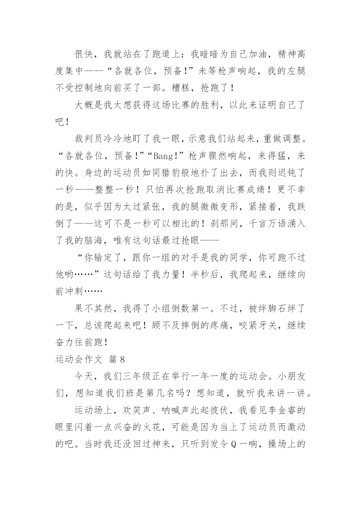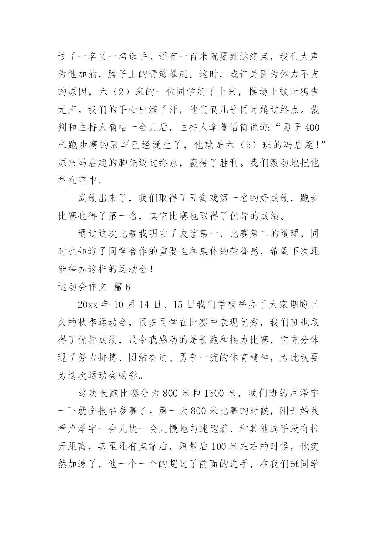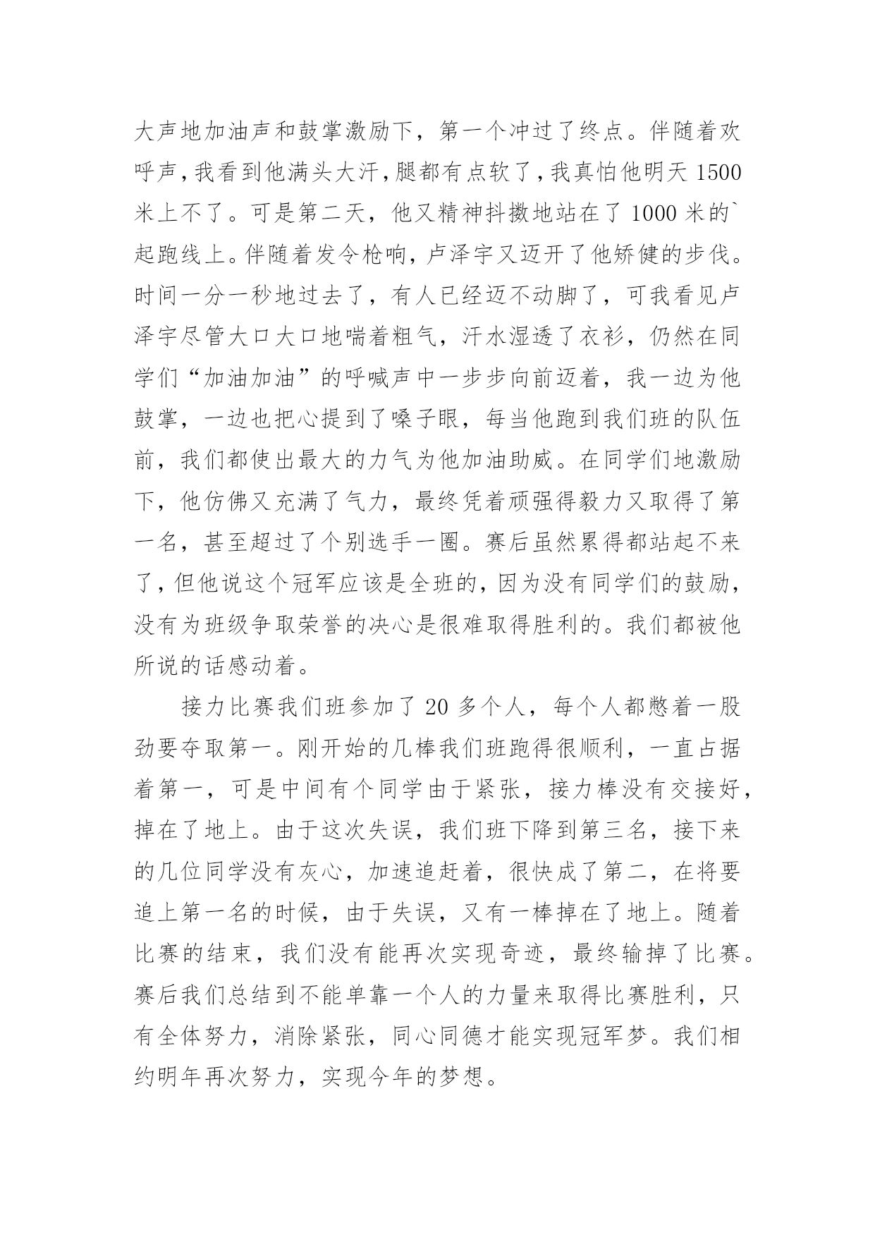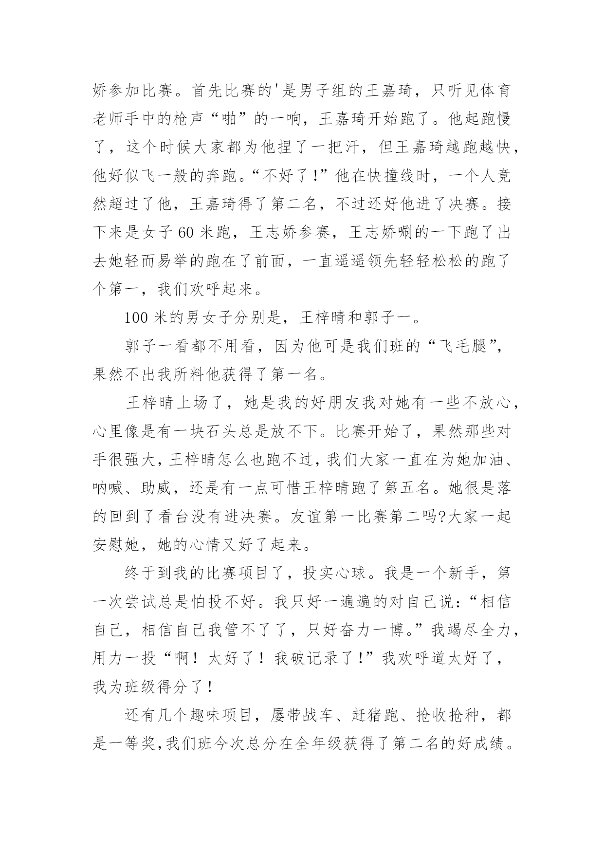 运动会作文运动会作文8篇[优]在学习、工作乃至生活中,大家都接触过作文吧,作文是由文字组成,经过人的思想考虑,通过语言组织来表达一个主题意义的文体。那么,怎么去写作文呢?下面是小编为大家收集的运动会作文8篇,欢迎阅读,希望大家能够喜欢。运动会作文篇1几天前,老师说最近几天要举行春季运动会。大家都很兴奋,总觉得每一天都过得太慢了。老师选好运动员后他们每天都努力训练,当然我也是其中之一,大家都在为班级取的好成绩而努力。我们终于等到运动会开幕的那一天,观看的同学在看台上,运动员们准备着开幕仪式。首先走过主席台的是国旗方阵,各队的运动员穿着同样的校服,喊着响亮的口号,迈着矫健的步伐走过主席台。总于轮到我们班了,我们迈着整齐的步子,喊着自己准备好的口号从主席台经过,我感觉千万双眼睛盯着我。我们的腰板挺的更直了,个个精神抖擞。我们着绕跑道走了半圈,到达了班级指定位置。接下来是升国旗奏国歌,我们每周一次既严肃又庄严的升旗仪式开始了,全体师生起立,向国旗敬礼,那响起的国歌声在校园上空回荡。开幕式完成了,各班的运动员纷纷退场准备比赛。首先的是男子、女子60米跑,我们班是王嘉琦和王志娇参加比赛。首先比赛的'是男子组的王嘉琦,只听见体育老师手中的枪声“啪”的一响,王嘉琦开始跑了。他起跑慢了,这个时候大家都为他捏了一把汗,但王嘉琦越跑越快,他好似飞一般的奔跑。“不好了!”他在快撞线时,一个人竟然超过了他,王嘉琦得了第二名,不过还好他进了决赛。接下来是女子60米跑,王志娇参赛,王志娇唰的一下跑了出去她轻而易举的跑在了前面,一直遥遥领先轻轻松松的跑了个第一,我们欢呼起来。100米的男女子分别是,王梓晴和郭子一。郭子一看都不用看,因为他可是我们班的“飞毛腿”,果然不出我所料他获得了第一名。王梓晴上场了,她是我的好朋友我对她有一些不放心,心里像是有一块石头总是放不下。比赛开始了,果然那些对手很强大,王梓晴怎么也跑不过,我们大家一直在为她加油、呐喊、助威,还是有一点可惜王梓晴跑了第五名。她很是落的回到了看台没有进决赛。友谊第一比赛第二吗?大家一起安慰她,她的心情又好了起来。终于到我的比赛项目了,投实心球。我是一个新手,第一次尝试总是怕投不好。我只好一遍遍的对自己说:“相信自己,相信自己我管不了了,只好奋力一博。”我竭尽全力,用力一投“啊!太好了!我破记录了!”我欢呼道太好了,我为班级得分了!还有几个趣味项目,屡带战车、赶猪跑、抢收抢种,都是一等奖,我们班今次总分在全年级获得了第二名的好成绩。这一天的运动会结束了,大家都很累但都很快乐!运动会作文篇2鼓声响起来,彩旗飘起来!今天我们学校举行了盛大的第十三届春季运动会。开幕式开始了,一些大哥哥手中拿着一些彩旗,腰杆挺得直直的,迈着整齐的步伐向前走着,后面跟着一些小哥哥、小姐姐,他们有的吹小号,有的敲鼓,有的`打锣,鼓号齐鸣,热闹极了!一些小女孩子也跟上来了,他们手里拿着五颜六色的彩带,上下挥舞着,好像是一只只漂亮的蝴蝶,美丽极了!看,大哥哥们手中的彩旗也飘了起来!升国旗,奏国歌,那场面非常庄严。我仿佛看见祖国解放的那一时刻……比赛开始了,我们班的张志聪参加了第一个项目。我们班的朋友们大声的喊着:“加油,加油!……”张志聪一听到枪声就快速的跑起来,他的手臂使劲摆着,跑得飞快,好像是一团跳动着的火焰。这时,操场上的花儿也好像为运动员加油。张志聪得了第一名,我们全班朋友都高兴极了!你看,杨上峰好像是凶猛的猎豹,刘铭熙好像飞翔的雄鹰……这就是我们今年有趣的运动会。运动会作文篇3日子一天天过去,人在变化,动植物也在变化,一切都在慢慢地变化着。那究竟有什么事物没有在变化的呢?那天下午,风和日丽,天高云淡,大树茂盛地长着,小鸟展开双翼在天空中自由地玩耍着,教室里的窗户也被值日生打扫得一干二净,没有一点儿灰尘。我和好朋友手牵着手,肩并着肩,哼着欢乐的歌曲下去运动了。马上就要到一年一度激动人心的运动会了,我可是令人骄傲的运动员啊!身为运动员的我参加了女子跳高与女子800米的激烈比赛。趁这个时间,我的抓紧时间好好练习一下啊。但懒惰的我并没有这个意思,好朋友拉了我一把,开始了恐怖的800米训练。800米,可是最考验耐力的,前面一定要沉住气,后面再快跑。训练的第一圈,我轻松自如地跑着,并没有惦记周围的人。第二圈了,我略微有点疲惫,但我坚持住了,努力地向前跑着。到了第三圈,我的体力有点透支了,不禁放慢了脚步,就这样跑了一会儿,我猛然发现好朋友竟然全程都在跟着我,于是,没有持之以恒精神的`我用仅剩的精力对好朋友说:“我们休息一下吧,我太累了,跑不动了。”但好朋友用坚定的语气说:“不行,800米比赛是很残酷的,是没有时间给你休息的,现在练习就不能松懈,否则比赛时又该怎么办呢?加油!我相信你!”听完她的话我鼓足勇气向前跑着,带着信心,带着胜利