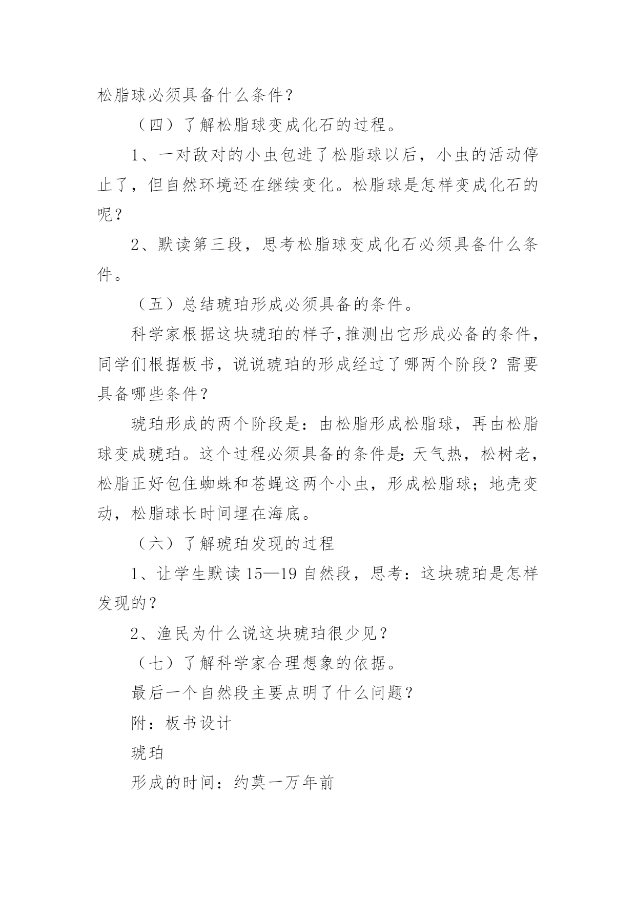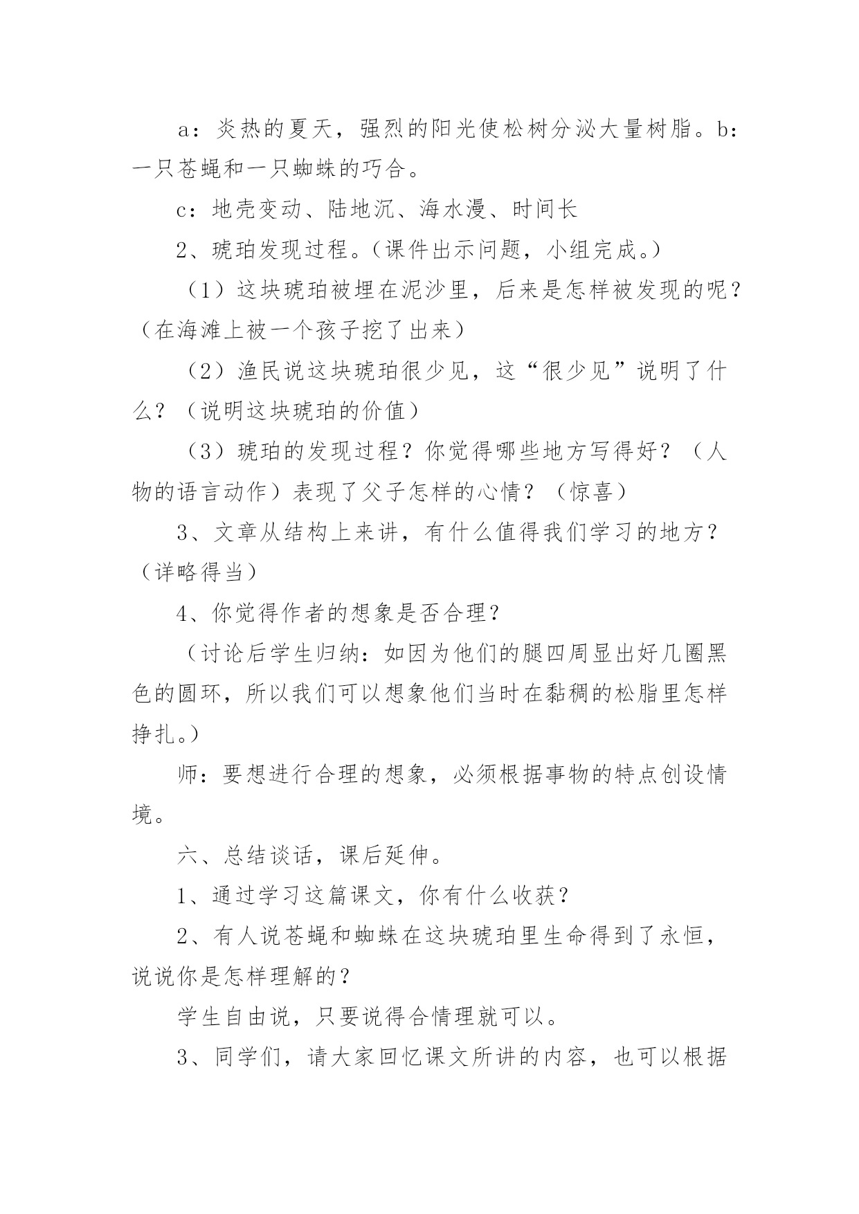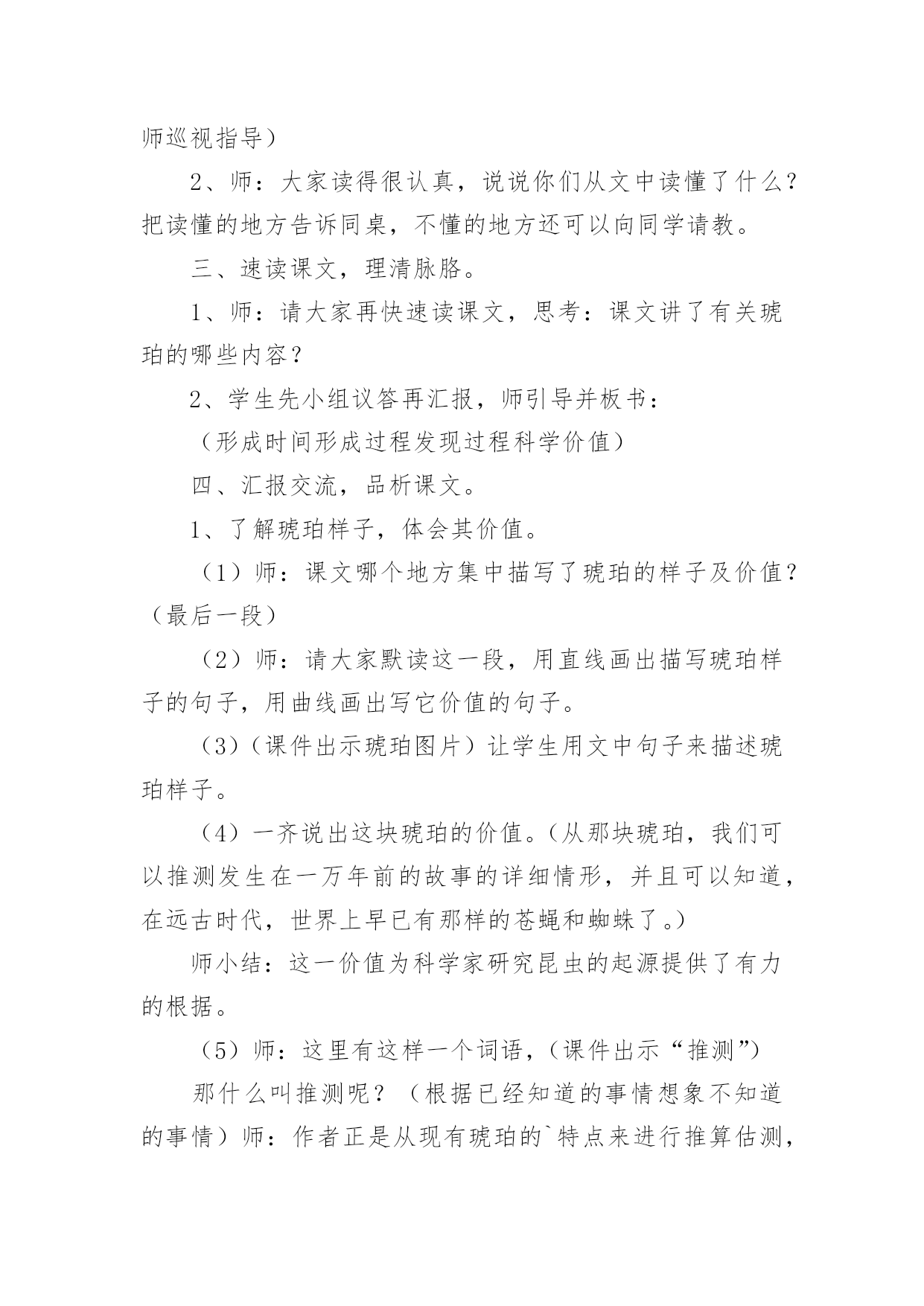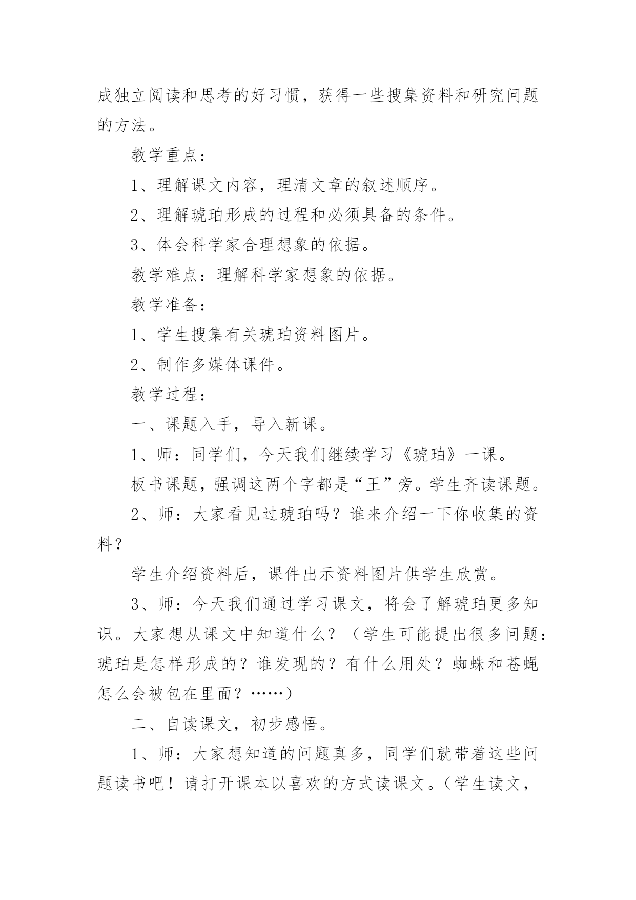 《琥珀》教学设计作为一位杰出的老师,常常需要准备教学设计,教学设计一般包括教学目标、教学重难点、教学方法、教学步骤与时间分配等环节。如何把教学设计做到重点突出呢?下面是小编整理的《琥珀》教学设计,希望对大家有所帮助。《琥珀》教学设计1教材分析:《琥珀》是德国作家柏吉尔写的一篇说明文,也叫科学小品。作者用活泼、通俗易懂的文笔,发挥充分合理的想象,介绍了有关琥珀的科学知识,假想了这块琥珀形成的过程,从而判断了它在科学上的价值。教学时教师要尊重学生的个性化行为,尽可能地引导学生自读自悟,让学生在读、思、画、议、批注、交流等体验过程中感知、感悟课文内容。在突出重点和突破难点上,可以借助多媒体课件演示琥珀的形成过程,帮助学生进一步深入理解课文内容,弄清这块琥珀形成的几个必要条件。另外恰当、充分地运用朗读手段,帮助学生理解课文中描写生动的词句,积累语言,发展思维,陶冶情操。在课外拓展延伸方面,要充分发挥学生的创造潜能,在主动积极的思维和情感活动中,激活学生的想象能力,做到读与写的结合,使课内学习与课外发展相得益彰,全方位提高学生的语文素养。教学目标:知识与能力l、理解课文内容,使学生知道琥珀的形成和发现的过程及在科学上的价值,懂得任何事物的形成和发展都必须具备一定的条件。2、体会作者是怎样想象这块琥珀的形成经过的?说说科学家这样想象的根据。3、发展学生的合作、探究精神,学会有依据地合理地进行想象,培养学生想象能力。4、学习诵读要领,培养学生的语感,提高阅读理解能力和鉴赏能力。过程与方法:1、关注学生的感受和体验,鼓励学生个性化阅读。让学生在进行充分阅读基础上,说出自己对文章的感受,就文章内容发表见解。2、充分发挥学生主体作用,尝试自主、合作、探究的学习方式,积极引导学生讨论、交流、引导学生学会学习,主动学习。3、通过有感情朗读,借助电教媒体帮助学生深入理解文章内容。情感态度与价值观:1、通过本课的学习,激发学生探索大自然奥秘的兴趣,树立热爱科学的情感,培养学生的科学精神和探索精神。2、通过本课的学习,激发学生的阅读兴趣,使学生养成独立阅读和思考的好习惯,获得一些搜集资料和研究问题的方法。教学重点:1、理解课文内容,理清文章的叙述顺序。2、理解琥珀形成的过程和必须具备的条件。3、体会科学家合理想象的依据。教学难点:理解科学家想象的依据。教学准备:1、学生搜集有关琥珀资料图片。2、制作多媒体课件。教学过程:一、课题入手,导入新课。1、师:同学们,今天我们继续学习《琥珀》一课。板书课题,强调这两个字都是“王”旁。学生齐读课题。2、师:大家看见过琥珀吗?谁来介绍一下你收集的资料?学生介绍资料后,课件出示资料图片供学生欣赏。3、师:今天我们通过学习课文,将会了解琥珀更多知识。大家想从课文中知道什么?(学生可能提出很多问题:琥珀是怎样形成的?谁发现的?有什么用处?蜘蛛和苍蝇怎么会被包在里面?……)二、自读课文,初步感悟。1、师:大家想知道的问题真多,同学们就带着这些问题读书吧!请打开课本以喜欢的方式读课文。(学生读文,师巡视指导)2、师:大家读得很认真,说说你们从文中读懂了什么?把读懂的地方告诉同桌,不懂的地方还可以向同学请教。三、速读课文,理清脉胳。1、师:请大家再快速读课文,思考:课文讲了有关琥珀的哪些内容?2、学生先小组议答再汇报,师引导并板书:(形成时间形成过程发现过程科学价值)四、汇报交流,品析课文。1、了解琥珀样子,体会其价值。(1)师:课文哪个地方集中描写了琥珀的样子及价值?(最后一段)(2)师:请大家默读这一段,用直线画出描写琥珀样子的句子,用曲线画出写它价值的句子。(3)(课件出示琥珀图片)让学生用文中句子来描述琥珀样子。(4)一齐说出这块琥珀的价值。(从那块琥珀,我们可以推测发生在一万年前的故事的详细情形,并且可以知道,在远古时代,世界上早已有那样的苍蝇和蜘蛛了。)师小结:这一价值为科学家研究昆虫的起源提供了有力的根据。(5)师:这里有这样一个词语,(课件出示“推测”)那什么叫推测呢?(根据已经知道的事情想象不知道的事情)师:作者正是从现有琥珀的`特点来进行推算估测,进行合理想象。(6)师:那么课文中哪些部分描写了真实的情景,哪些部分描述了想象的情景呢?(形成过程是作者想象的情景,发现过程是作者描写的真实的情景)2、了解故事、欣赏故事。(1)师:我们已经了解这块琥珀的样子了,但琥珀是怎样形成的呢?为了弄清这个问题,我们还是来读读作者想象的这个故事吧。(2)课件出示问题和相关句段,学生读后回答。a、故事发生的时间:这个故事发生在很久很久以前,约莫算来,总有一万年了。师:你怎样理解“约莫”这个词语?(大约,因为不能准确知道琥珀具体形成时间,只是推算出来的数字。)b、故事发生的环境:师:交待这样的环境有什么作用呢?(太阳|、海、树)