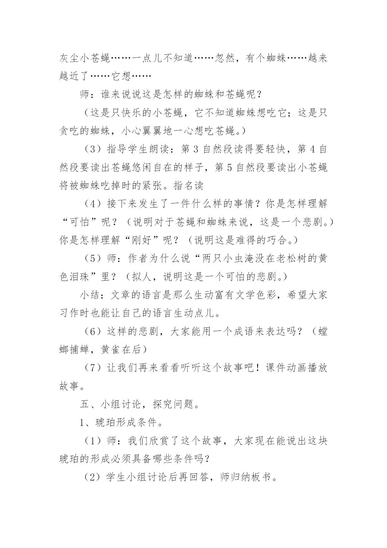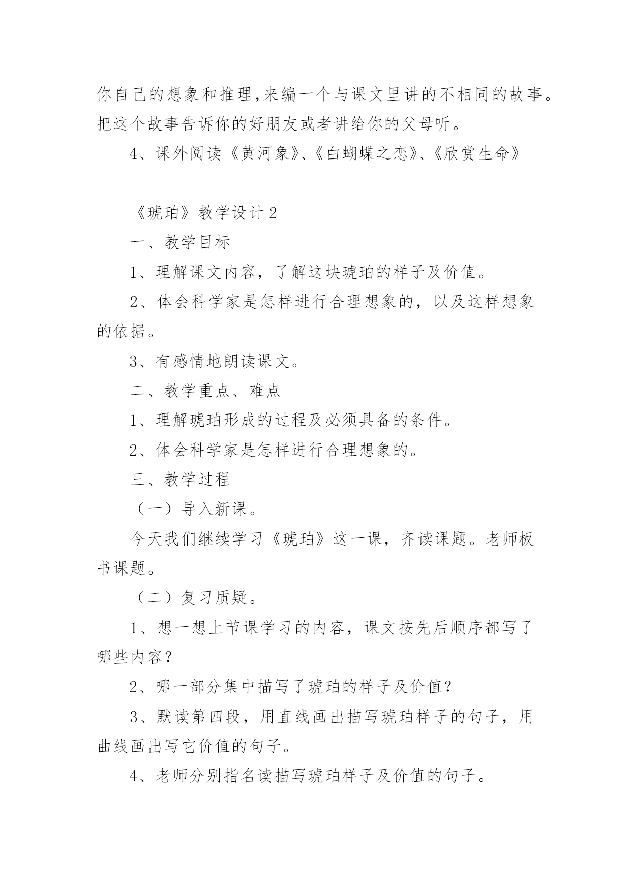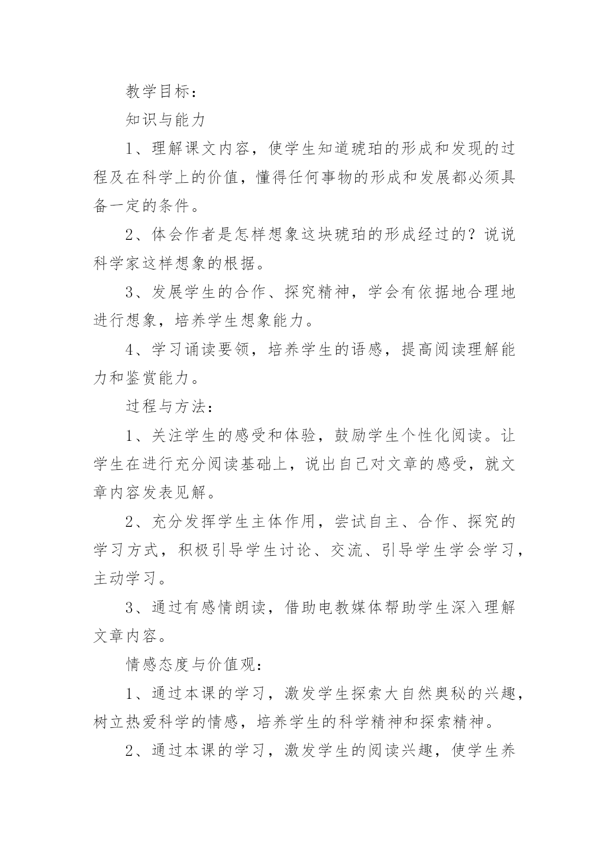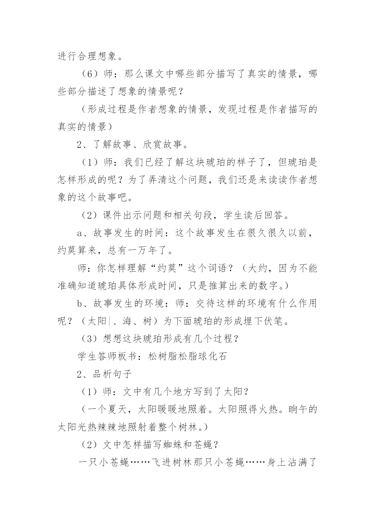 《琥珀》教学设计作为一位杰出的老师,常常需要准备教学设计,教学设计一般包括教学目标、教学重难点、教学方法、教学步骤与时间分配等环节。如何把教学设计做到重点突出呢?下面是小编整理的《琥珀》教学设计,希望对大家有所帮助。《琥珀》教学设计1教材分析:《琥珀》是德国作家柏吉尔写的一篇说明文,也叫科学小品。作者用活泼、通俗易懂的文笔,发挥充分合理的想象,介绍了有关琥珀的科学知识,假想了这块琥珀形成的过程,从而判断了它在科学上的价值。教学时教师要尊重学生的个性化行为,尽可能地引导学生自读自悟,让学生在读、思、画、议、批注、交流等体验过程中感知、感悟课文内容。在突出重点和突破难点上,可以借助多媒体课件演示琥珀的形成过程,帮助学生进一步深入理解课文内容,弄清这块琥珀形成的几个必要条件。另外恰当、充分地运用朗读手段,帮助学生理解课文中描写生动的词句,积累语言,发展思维,陶冶情操。在课外拓展延伸方面,要充分发挥学生的创造潜能,在主动积极的思维和情感活动中,激活学生的想象能力,做到读与写的结合,使课内学习与课外发展相得益彰,全方位提高学生的语文素养。教学目标:知识与能力l、理解课文内容,使学生知道琥珀的形成和发现的过程及在科学上的价值,懂得任何事物的形成和发展都必须具备一定的条件。2、体会作者是怎样想象这块琥珀的形成经过的?说说科学家这样想象的根据。3、发展学生的合作、探究精神,学会有依据地合理地进行想象,培养学生想象能力。4、学习诵读要领,培养学生的语感,提高阅读理解能力和鉴赏能力。过程与方法:1、关注学生的感受和体验,鼓励学生个性化阅读。让学生在进行充分阅读基础上,说出自己对文章的感受,就文章内容发表见解。2、充分发挥学生主体作用,尝试自主、合作、探究的学习方式,积极引导学生讨论、交流、引导学生学会学习,主动学习。3、通过有感情朗读,借助电教媒体帮助学生深入理解文章内容。情感态度与价值观:1、通过本课的学习,激发学生探索大自然奥秘的兴趣,树立热爱科学的情感,培养学生的科学精神和探索精神。2、通过本课的学习,激发学生的阅读兴趣,使学生养成独立阅读和思考的好习惯,获得一些搜集资料和研究问题的方法。教学重点:1、理解课文内容,理清文章的叙述顺序。2、理解琥珀形成的过程和必须具备的条件。3、体会科学家合理想象的依据。教学难点:理解科学家想象的依据。教学准备:1、学生搜集有关琥珀资料图片。2、制作多媒体课件。教学过程:一、课题入手,导入新课。1、师:同学们,今天我们继续学习《琥珀》一课。板书课题,强调这两个字都是“王”旁。学生齐读课题。2、师:大家看见过琥珀吗?谁来介绍一下你收集的资料?学生介绍资料后,课件出示资料图片供学生欣赏。3、师:今天我们通过学习课文,将会了解琥珀更多知识。大家想从课文中知道什么?(学生可能提出很多问题:琥珀是怎样形成的?谁发现的?有什么用处?蜘蛛和苍蝇怎么会被包在里面?……)二、自读课文,初步感悟。1、师:大家想知道的问题真多,同学们就带着这些问题读书吧!请打开课本以喜欢的方式读课文。(学生读文,师巡视指导)2、师:大家读得很认真,说说你们从文中读懂了什么?把读懂的地方告诉同桌,不懂的地方还可以向同学请教。三、速读课文,理清脉胳。1、师:请大家再快速读课文,思考:课文讲了有关琥珀的哪些内容?2、学生先小组议答再汇报,师引导并板书:(形成时间形成过程发现过程科学价值)四、汇报交流,品析课文。1、了解琥珀样子,体会其价值。(1)师:课文哪个地方集中描写了琥珀的样子及价值?(最后一段)(2)师:请大家默读这一段,用直线画出描写琥珀样子的句子,用曲线画出写它价值的句子。(3)(课件出示琥珀图片)让学生用文中句子来描述琥珀样子。(4)一齐说出这块琥珀的价值。(从那块琥珀,我们可以推测发生在一万年前的故事的详细情形,并且可以知道,在远古时代,世界上早已有那样的苍蝇和蜘蛛了。)师小结:这一价值为科学家研究昆虫的起源提供了有力的根据。(5)师:这里有这样一个词语,(课件出示“推测”)那什么叫推测呢?(根据已经知道的事情想象不知道的事情)师:作者正是从现有琥珀的`特点来进行推算估测,进行合理想象。(6)师:那么课文中哪些部分描写了真实的情景,哪些部分描述了想象的情景呢?(形成过程是作者想象的情景,发现过程是作者描写的真实的情景)2、了解故事、欣赏故事。(1)师:我们已经了解这块琥珀的样子了,但琥珀是怎样形成的呢?为了弄清这个问题,我们还是来读读作者想象的这个故事吧。(2)课件出示问题和相关句段,学生读后回答。a、故事发生的时间:这个故事发生在很久很久以前,约莫算来,总有一万年了。师:你怎样理解“约莫”这个词语?(大约,因为不能准确知道琥珀具体形成时间,只是推算出来的数字。)b、故事发生的环境:师:交待这样的环境有什么作用呢?(太阳|、海、树)