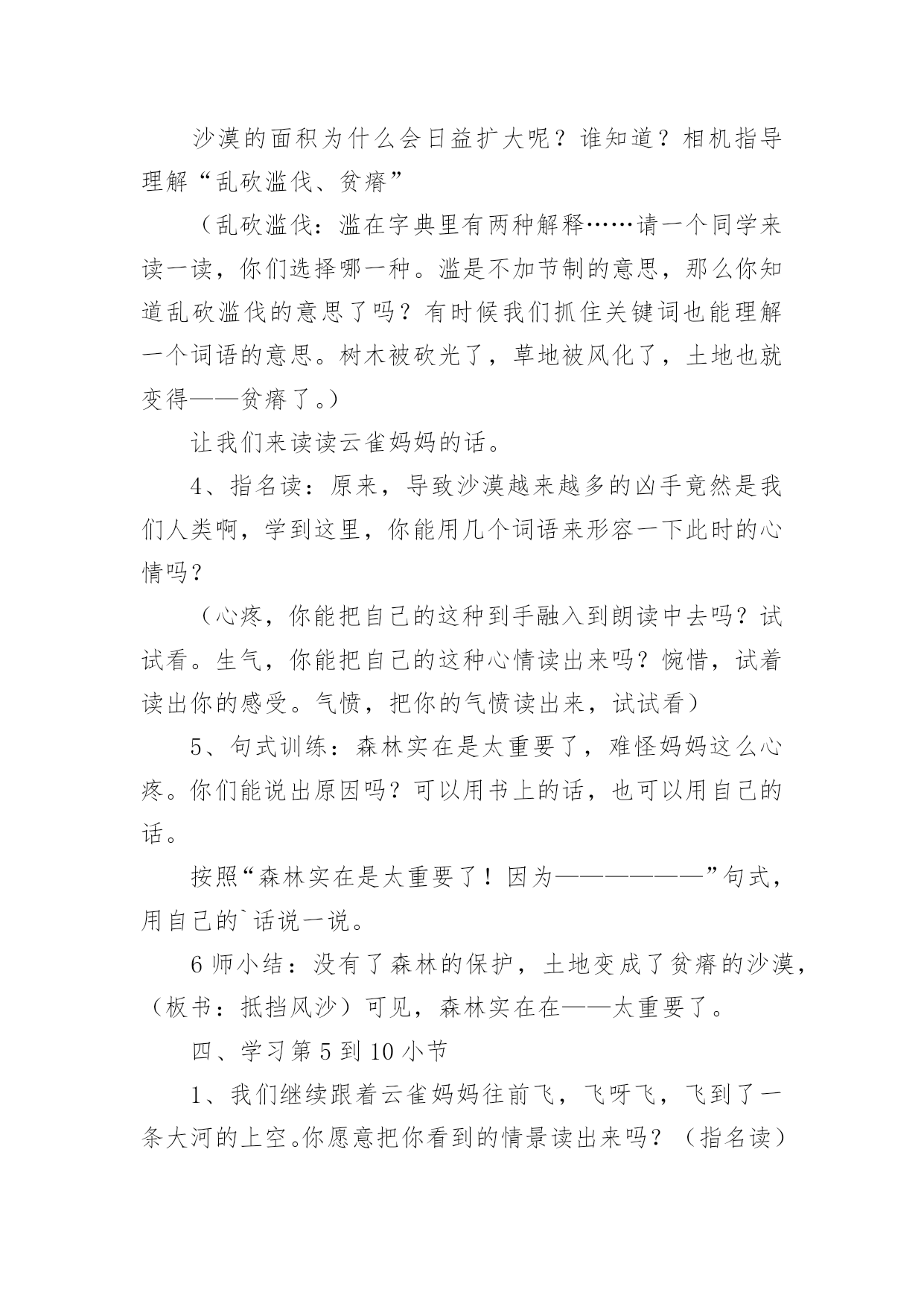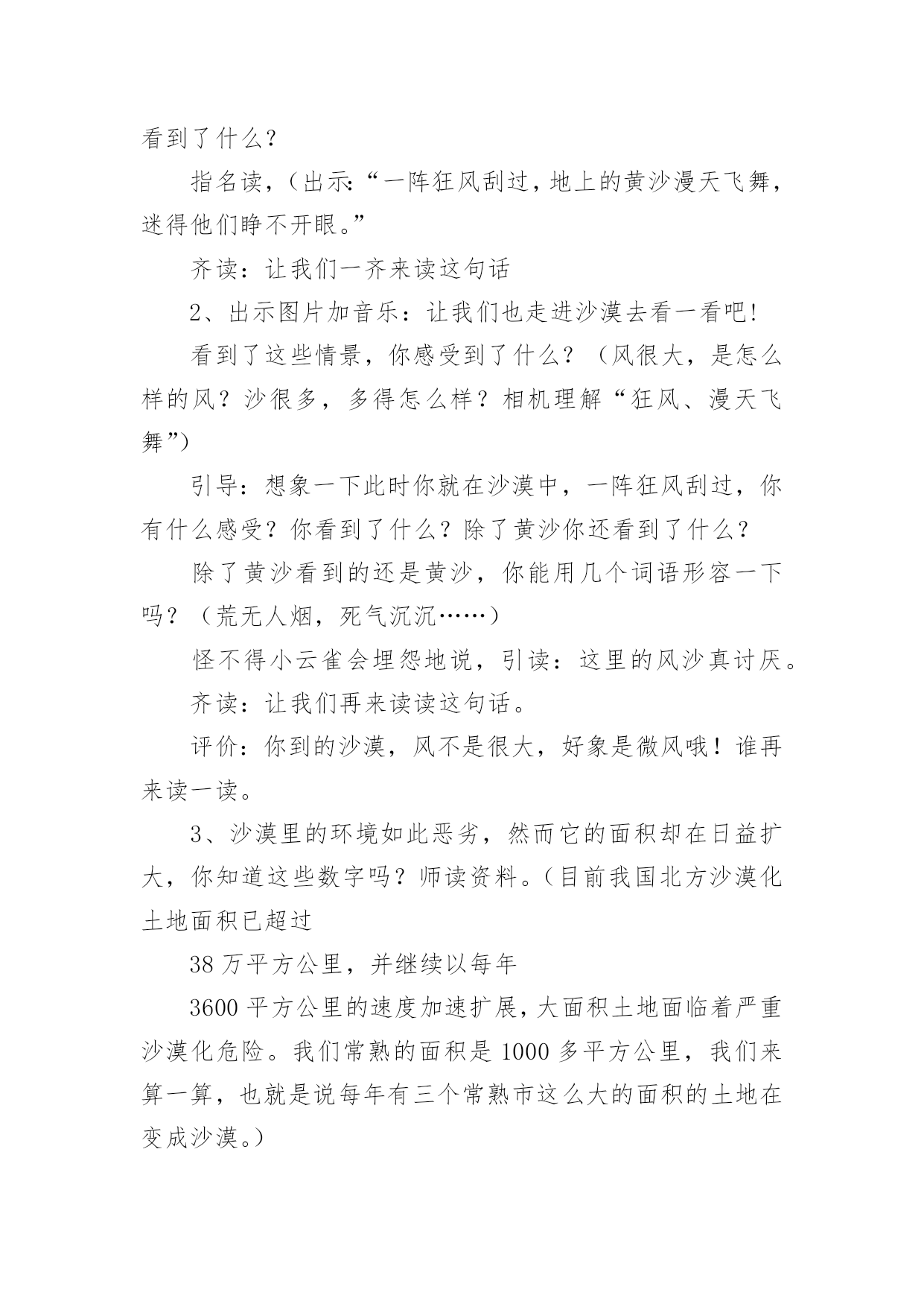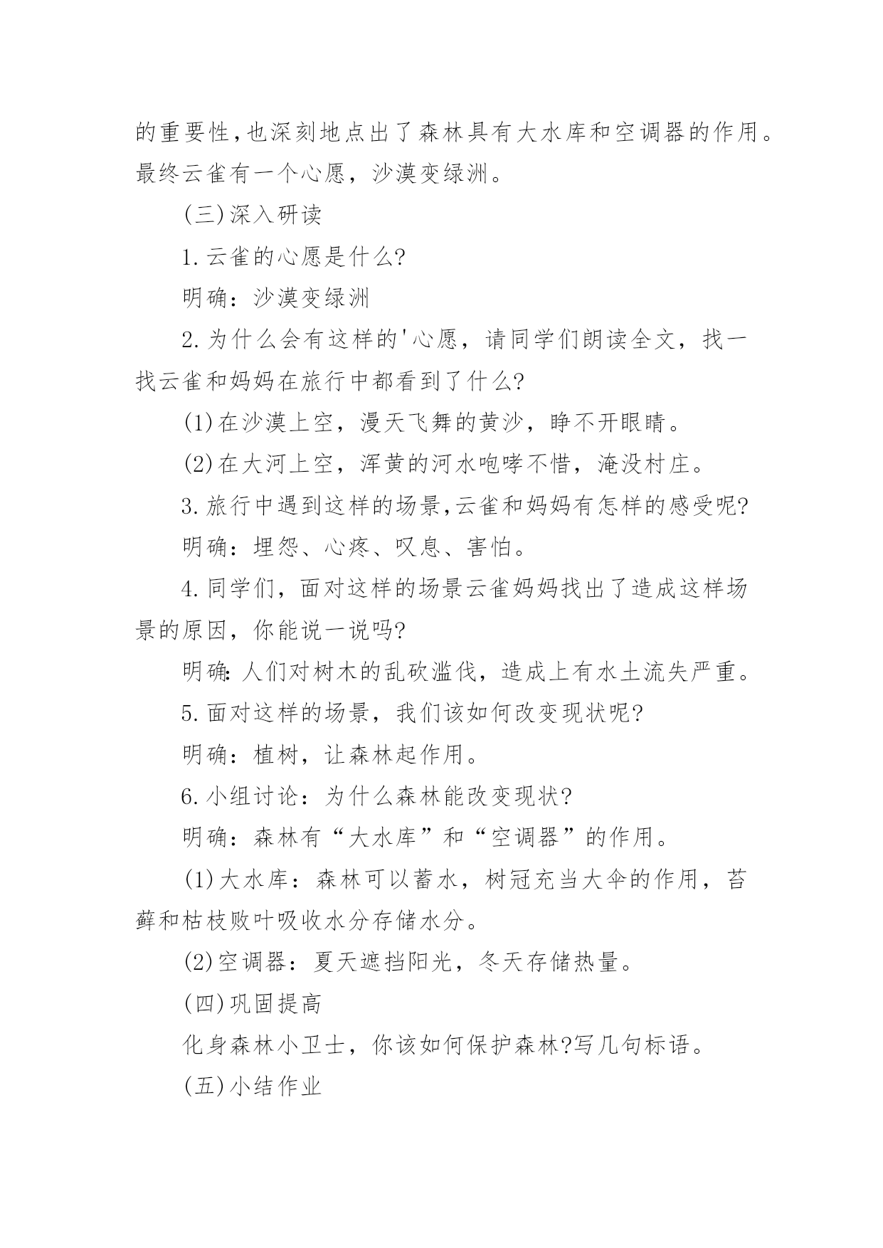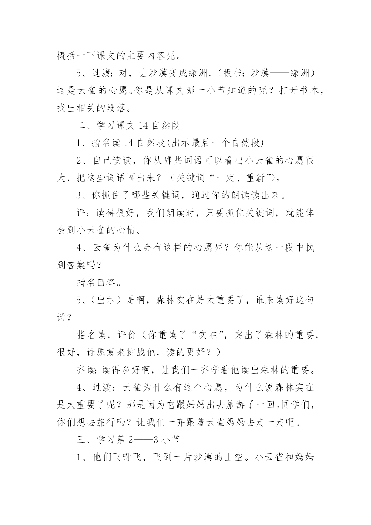 云雀的心愿教学设计作为一名无私奉献的老师,总不可避免地需要编写教学设计,借助教学设计可以更好地组织教学活动。那么你有了解过教学设计吗?以下是小编精心整理的云雀的心愿教学设计,欢迎阅读,希望大家能够喜欢。云雀的心愿教学设计1教学目标:1、理解课文内容,认识森林的作用,初步树立环保意识。2、有感情地朗读课文,练习分角色朗读课文。教学重点:认识到森林的重要性,能有条理地说一说,并写下来。教学过程:一、复习导入。1、今天我们继续学习云雀的心愿,齐读课题。2、老师这里有三组词,谁来读一读(1)乱砍滥伐贫瘠的沙漠泛滥成灾(2)水库空调器(3)心愿绿洲3、你能挑选一组词,根据课文内容说一句话吗。4、谁能在三组词语前分别加上一个词语:看到……知道……产生……,把刚才说的三句话连成一段通顺的话,来概括一下课文的主要内容呢。5、过渡:对,让沙漠变成绿洲,(板书:沙漠——绿洲)这是云雀的心愿。你是从课文哪一小节知道的呢?打开书本,找出相关的段落。二、学习课文14自然段1、指名读14自然段(出示最后一个自然段)2、自己读读,你从哪些词语可以看出小云雀的心愿很大,把这些词语圈出来?(关键词“一定、重新”)。3、你抓住了哪些关键词,通过你的朗读读出来。评:读得很好,我们朗读时,只要抓住关键词,就能体会到小云雀的心情。4、云雀为什么会有这样的心愿呢?你能从这一段中找到答案吗?指名回答。5、(出示)是啊,森林实在是太重要了,谁来读好这句话?指名读,评价(你重读了“实在”,突出了森林的重要,很好,谁愿意来挑战他,读的更好?)齐读:读得多好啊,让我们一齐学着他读出森林的重要。4、过渡:云雀为什么有这个心愿,为什么说森林实在是太重要了呢?那是因为它跟妈妈出去旅游了一回。同学们,你们想去旅行吗?让我们一齐跟着云雀妈妈去走一走吧。三、学习第2——3小节1、他们飞呀飞,飞到一片沙漠的上空。小云雀和妈妈看到了什么?指名读,(出示:“一阵狂风刮过,地上的黄沙漫天飞舞,迷得他们睁不开眼。”齐读:让我们一齐来读这句话2、出示图片加音乐:让我们也走进沙漠去看一看吧!看到了这些情景,你感受到了什么?(风很大,是怎么样的风?沙很多,多得怎么样?相机理解“狂风、漫天飞舞”)引导:想象一下此时你就在沙漠中,一阵狂风刮过,你有什么感受?你看到了什么?除了黄沙你还看到了什么?除了黄沙看到的还是黄沙,你能用几个词语形容一下吗?(荒无人烟,死气沉沉……)怪不得小云雀会埋怨地说,引读:这里的风沙真讨厌。齐读:让我们再来读读这句话。评价:你到的沙漠,风不是很大,好象是微风哦!谁再来读一读。3、沙漠里的环境如此恶劣,然而它的面积却在日益扩大,你知道这些数字吗?师读资料。(目前我国北方沙漠化土地面积已超过38万平方公里,并继续以每年3600平方公里的速度加速扩展,大面积土地面临着严重沙漠化危险。我们常熟的面积是1000多平方公里,我们来算一算,也就是说每年有三个常熟市这么大的面积的土地在变成沙漠。)沙漠的面积为什么会日益扩大呢?谁知道?相机指导理解“乱砍滥伐、贫瘠”(乱砍滥伐:滥在字典里有两种解释……请一个同学来读一读,你们选择哪一种。滥是不加节制的意思,那么你知道乱砍滥伐的意思了吗?有时候我们抓住关键词也能理解一个词语的意思。树木被砍光了,草地被风化了,土地也就变得——贫瘠了。)让我们来读读云雀妈妈的话。4、指名读:原来,导致沙漠越来越多的凶手竟然是我们人类啊,学到这里,你能用几个词语来形容一下此时的心情吗?(心疼,你能把自己的这种到手融入到朗读中去吗?试试看。生气,你能把自己的这种心情读出来吗?惋惜,试着读出你的感受。气愤,把你的气愤读出来,试试看)5、句式训练:森林实在是太重要了,难怪妈妈这么心疼。你们能说出原因吗?可以用书上的话,也可以用自己的话。按照“森林实在是太重要了!因为——————”句式,用自己的`话说一说。6师小结:没有了森林的保护,土地变成了贫瘠的沙漠,(板书:抵挡风沙)可见,森林实在在——太重要了。四、学习第5到10小节1、我们继续跟着云雀妈妈往前飞,飞呀飞,飞到了一条大河的上空。你愿意把你看到的情景读出来吗?(指名读)评价:你的声音啊特别好听,老师想请你再读一读,其他同学可要仔细听了,边听边思考,从这段文字中,你仿佛看到了什么?听到了什么?2、你感受到了什么?从哪里感受到的?相机理解“咆哮”。“咆哮”这个词语使你想到了哪种动物,他们的叫声怎么样?多凶猛啊,你能读好这句话吗?在课文中把浑黄的河水比作了什么?像脱缰的野马,说明河水怎么样?你能来读一读吗?3、听了大家的朗读,我的眼前仿佛就出现了洪水泛滥的情景,让我们一起去亲眼目睹一下。看了录象,相信大家的感受一定更深刻了,一定能把这段文字读的更好,让我们一齐来读好它。“只见……洪水之中”4、是啊,河水怎么这么凶猛啊,谁知道?5、小