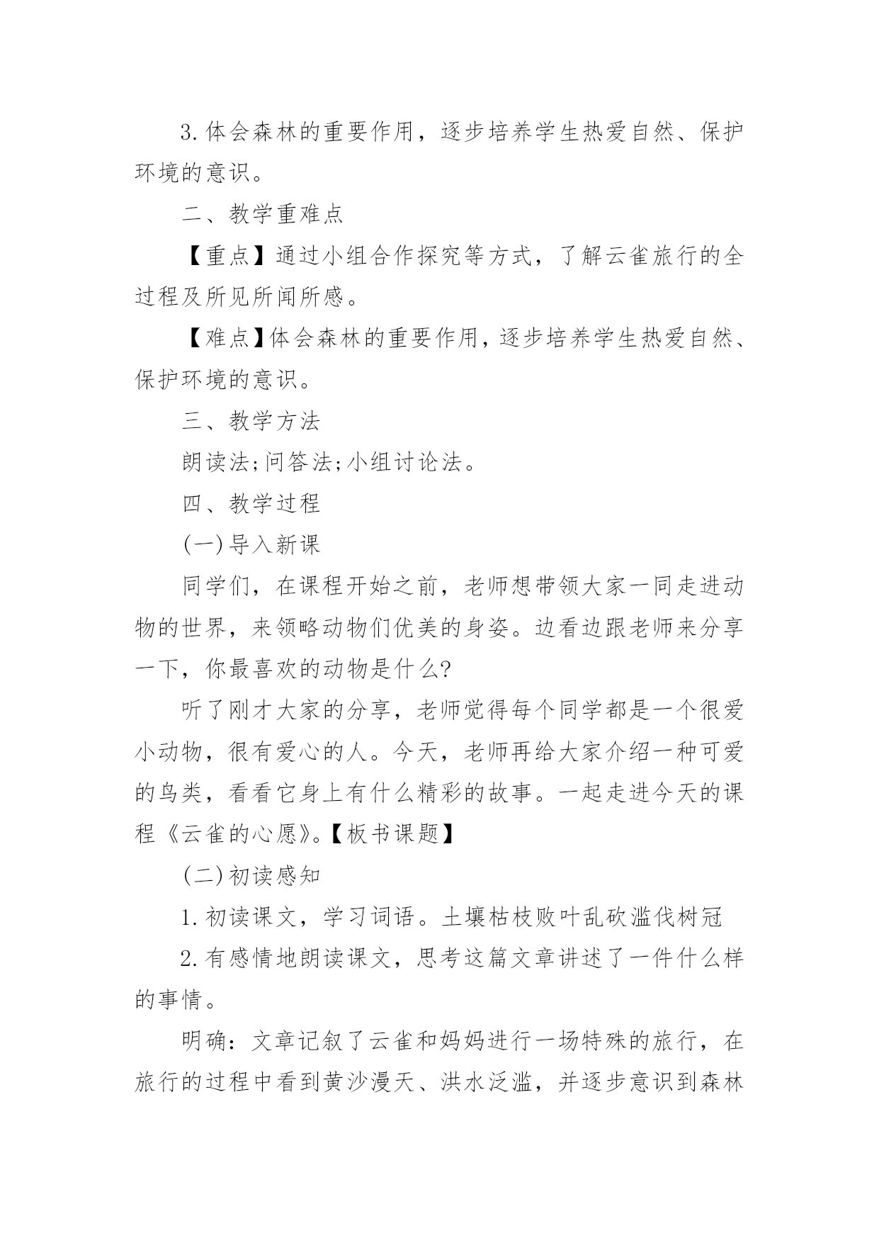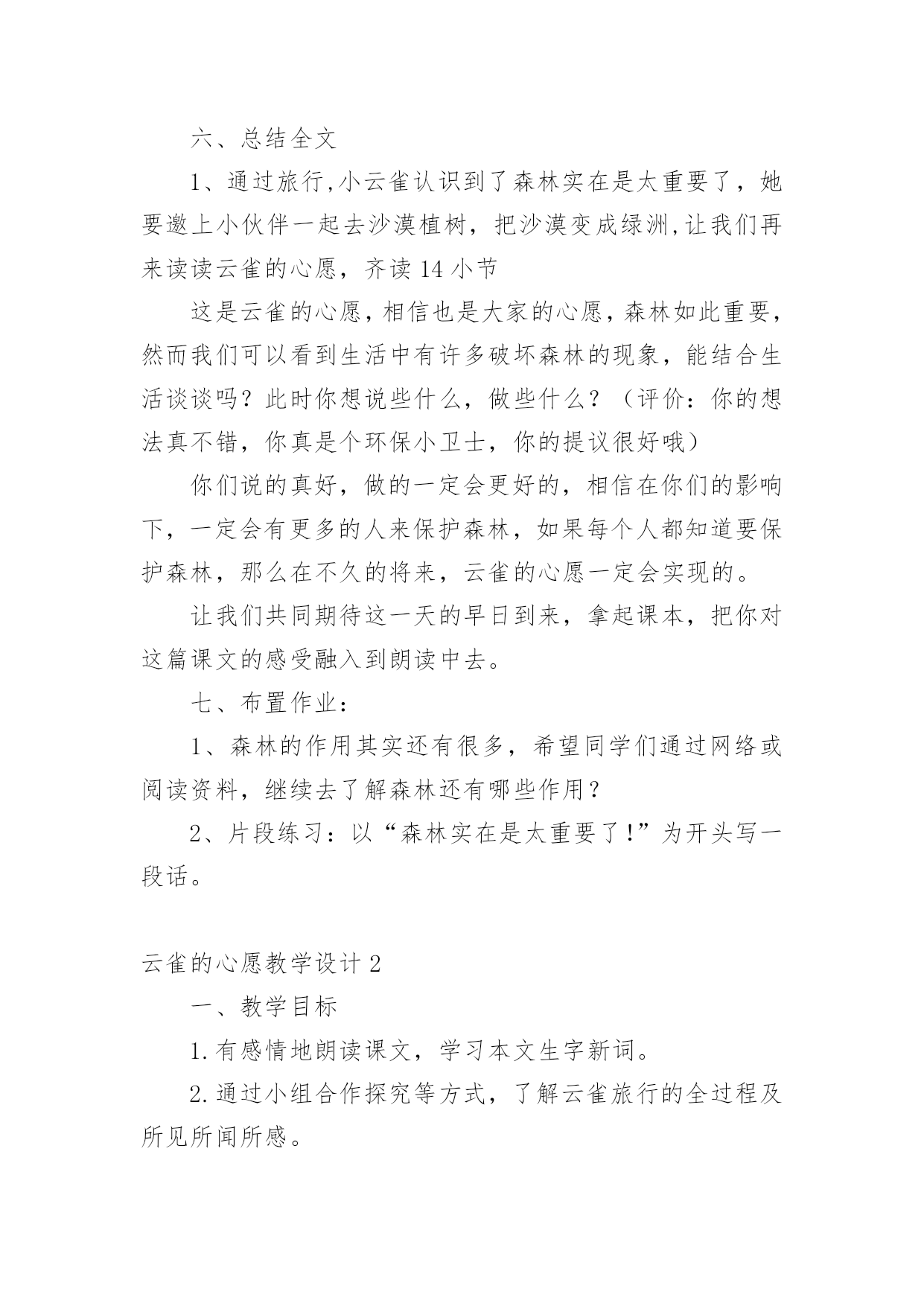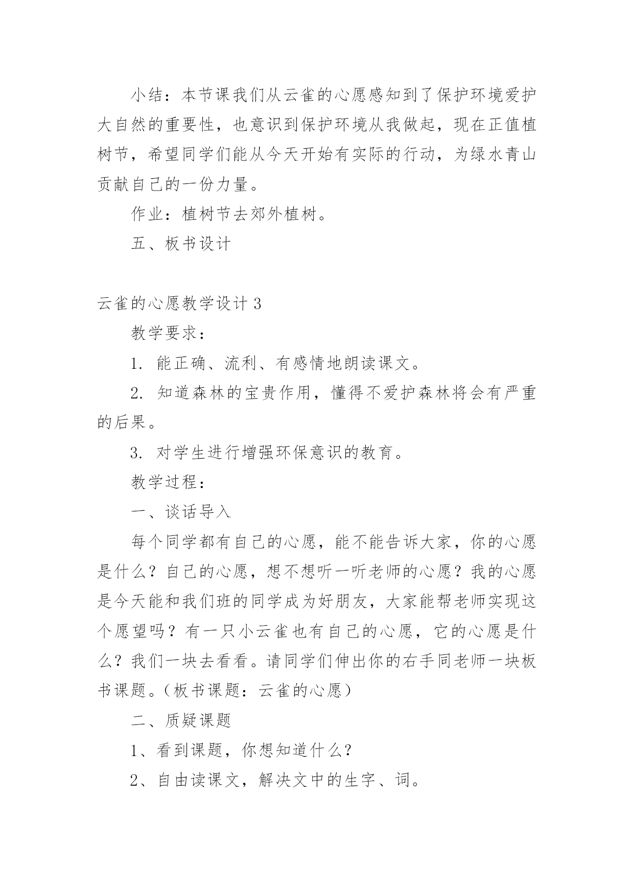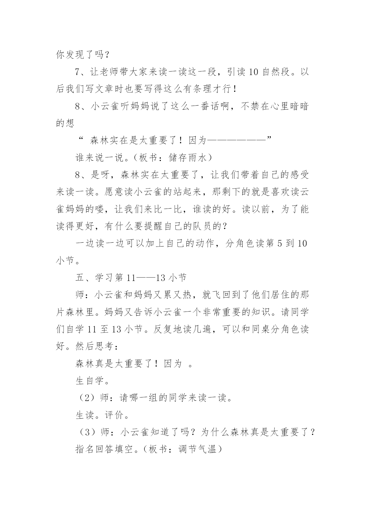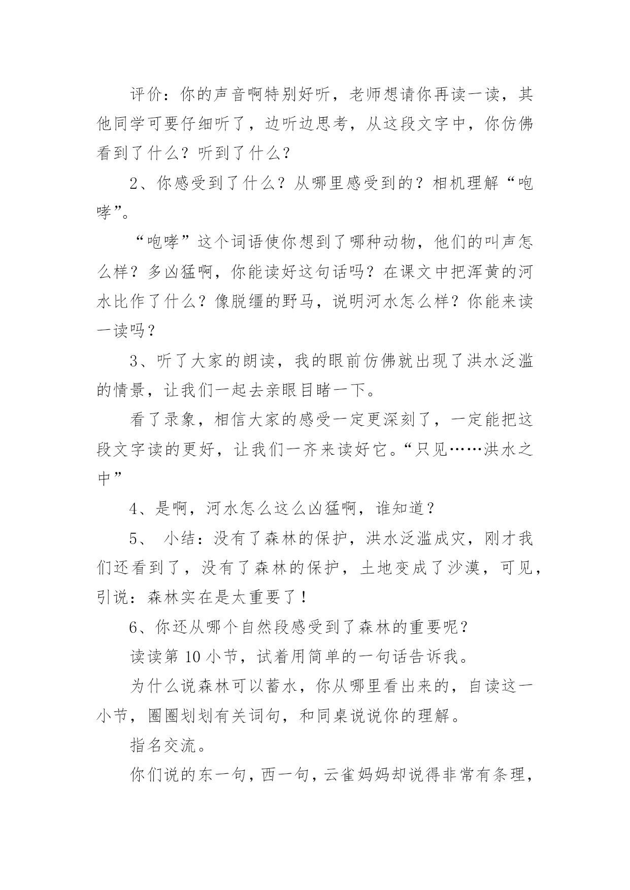 云雀的心愿教学设计作为一名无私奉献的老师,总不可避免地需要编写教学设计,借助教学设计可以更好地组织教学活动。那么你有了解过教学设计吗?以下是小编精心整理的云雀的心愿教学设计,欢迎阅读,希望大家能够喜欢。云雀的心愿教学设计1教学目标:1、理解课文内容,认识森林的作用,初步树立环保意识。2、有感情地朗读课文,练习分角色朗读课文。教学重点:认识到森林的重要性,能有条理地说一说,并写下来。教学过程:一、复习导入。1、今天我们继续学习云雀的心愿,齐读课题。2、老师这里有三组词,谁来读一读(1)乱砍滥伐贫瘠的沙漠泛滥成灾(2)水库空调器(3)心愿绿洲3、你能挑选一组词,根据课文内容说一句话吗。4、谁能在三组词语前分别加上一个词语:看到……知道……产生……,把刚才说的三句话连成一段通顺的话,来概括一下课文的主要内容呢。5、过渡:对,让沙漠变成绿洲,(板书:沙漠——绿洲)这是云雀的心愿。你是从课文哪一小节知道的呢?打开书本,找出相关的段落。二、学习课文14自然段1、指名读14自然段(出示最后一个自然段)2、自己读读,你从哪些词语可以看出小云雀的心愿很大,把这些词语圈出来?(关键词“一定、重新”)。3、你抓住了哪些关键词,通过你的朗读读出来。评:读得很好,我们朗读时,只要抓住关键词,就能体会到小云雀的心情。4、云雀为什么会有这样的心愿呢?你能从这一段中找到答案吗?指名回答。5、(出示)是啊,森林实在是太重要了,谁来读好这句话?指名读,评价(你重读了“实在”,突出了森林的重要,很好,谁愿意来挑战他,读的更好?)齐读:读得多好啊,让我们一齐学着他读出森林的重要。4、过渡:云雀为什么有这个心愿,为什么说森林实在是太重要了呢?那是因为它跟妈妈出去旅游了一回。同学们,你们想去旅行吗?让我们一齐跟着云雀妈妈去走一走吧。三、学习第2——3小节1、他们飞呀飞,飞到一片沙漠的上空。小云雀和妈妈看到了什么?指名读,(出示:“一阵狂风刮过,地上的黄沙漫天飞舞,迷得他们睁不开眼。”齐读:让我们一齐来读这句话2、出示图片加音乐:让我们也走进沙漠去看一看吧!看到了这些情景,你感受到了什么?(风很大,是怎么样的风?沙很多,多得怎么样?相机理解“狂风、漫天飞舞”)引导:想象一下此时你就在沙漠中,一阵狂风刮过,你有什么感受?你看到了什么?除了黄沙你还看到了什么?除了黄沙看到的还是黄沙,你能用几个词语形容一下吗?(荒无人烟,死气沉沉……)怪不得小云雀会埋怨地说,引读:这里的风沙真讨厌。齐读:让我们再来读读这句话。评价:你到的沙漠,风不是很大,好象是微风哦!谁再来读一读。3、沙漠里的环境如此恶劣,然而它的面积却在日益扩大,你知道这些数字吗?师读资料。(目前我国北方沙漠化土地面积已超过38万平方公里,并继续以每年3600平方公里的速度加速扩展,大面积土地面临着严重沙漠化危险。我们常熟的面积是1000多平方公里,我们来算一算,也就是说每年有三个常熟市这么大的面积的土地在变成沙漠。)沙漠的面积为什么会日益扩大呢?谁知道?相机指导理解“乱砍滥伐、贫瘠”(乱砍滥伐:滥在字典里有两种解释……请一个同学来读一读,你们选择哪一种。滥是不加节制的意思,那么你知道乱砍滥伐的意思了吗?有时候我们抓住关键词也能理解一个词语的意思。树木被砍光了,草地被风化了,土地也就变得——贫瘠了。)让我们来读读云雀妈妈的话。4、指名读:原来,导致沙漠越来越多的凶手竟然是我们人类啊,学到这里,你能用几个词语来形容一下此时的心情吗?(心疼,你能把自己的这种到手融入到朗读中去吗?试试看。生气,你能把自己的这种心情读出来吗?惋惜,试着读出你的感受。气愤,把你的气愤读出来,试试看)5、句式训练:森林实在是太重要了,难怪妈妈这么心疼。你们能说出原因吗?可以用书上的话,也可以用自己的话。按照“森林实在是太重要了!因为——————”句式,用自己的`话说一说。6师小结:没有了森林的保护,土地变成了贫瘠的沙漠,(板书:抵挡风沙)可见,森林实在在——太重要了。四、学习第5到10小节1、我们继续跟着云雀妈妈往前飞,飞呀飞,飞到了一条大河的上空。你愿意把你看到的情景读出来吗?(指名读)评价:你的声音啊特别好听,老师想请你再读一读,其他同学可要仔细听了,边听边思考,从这段文字中,你仿佛看到了什么?听到了什么?2、你感受到了什么?从哪里感受到的?相机理解“咆哮”。“咆哮”这个词语使你想到了哪种动物,他们的叫声怎么样?多凶猛啊,你能读好这句话吗?在课文中把浑黄的河水比作了什么?像脱缰的野马,说明河水怎么样?你能来读一读吗?3、听了大家的朗读,我的眼前仿佛就出现了洪水泛滥的情景,让我们一起去亲眼目睹一下。看了录象,相信大家的感受一定更深刻了,一定能把这段文字读的更好,让我们一齐来读好它。“只见……洪水之中”4、是啊,河水怎么这么凶猛啊,谁知道?5、小