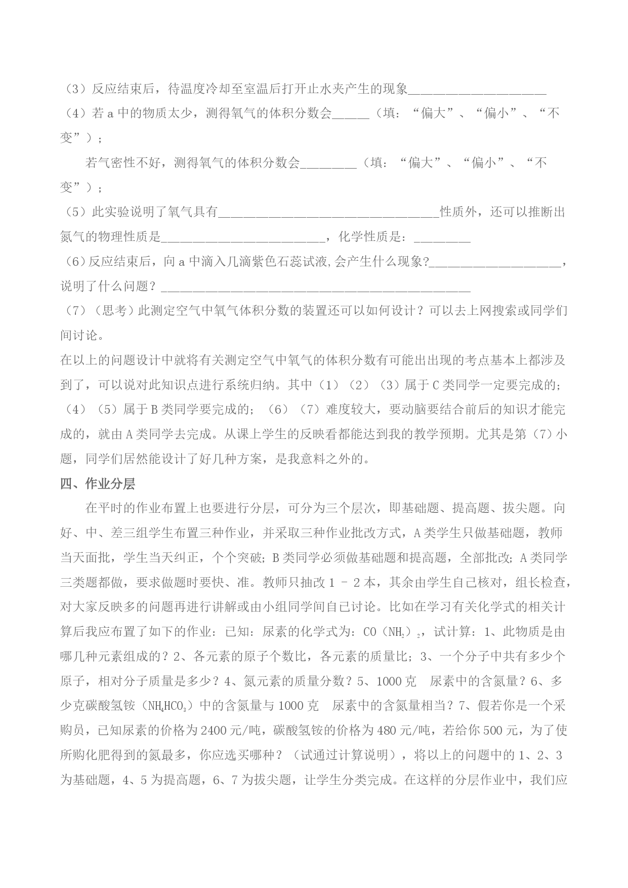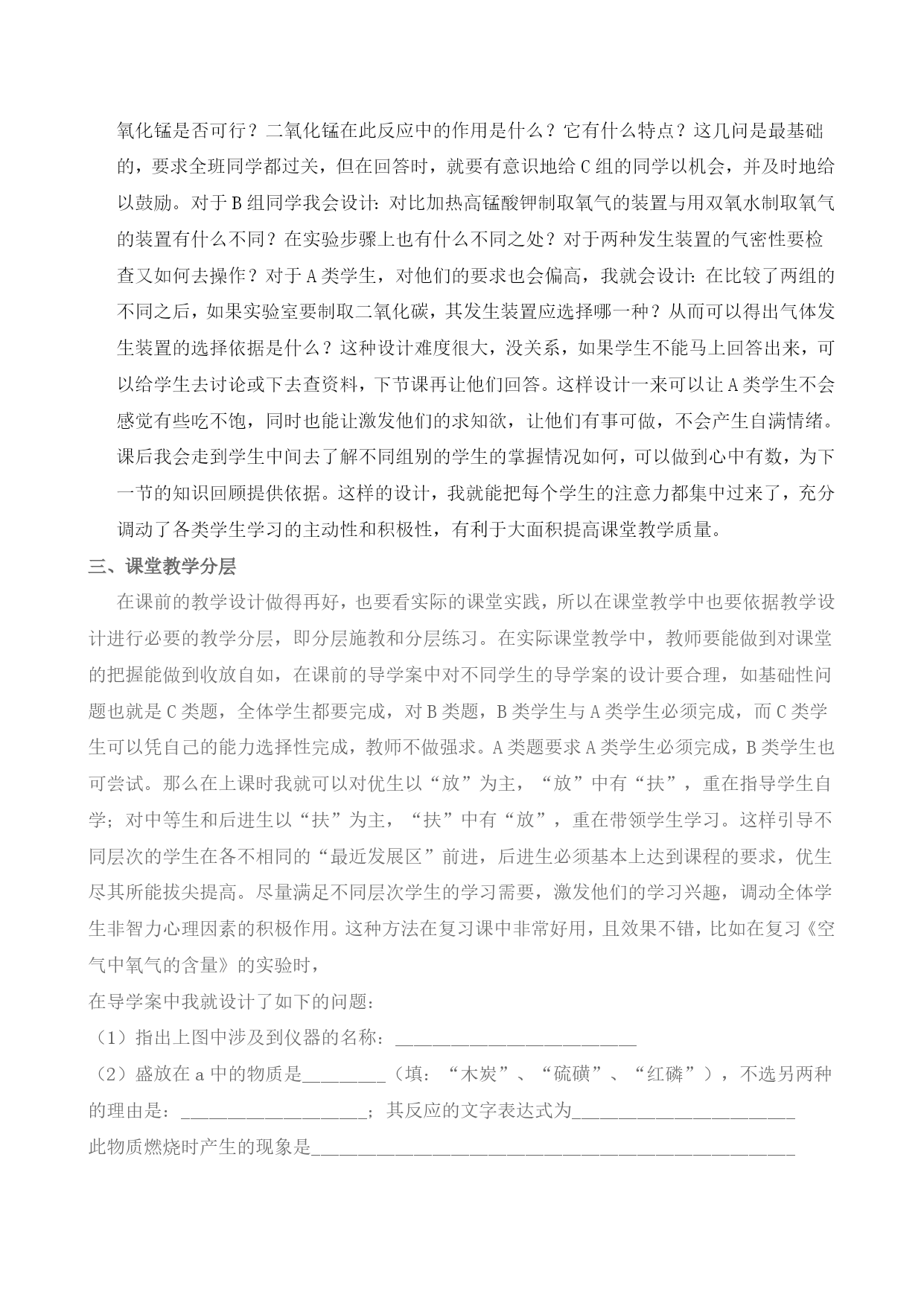 分层教学在初三化学教学中的的尝试晋江市阳溪中学新华362241所谓的“分层教学”说到底就是“因材施教”或“量体裁衣”。也就是针对学生的学习能力和水平的不同、将学生分成不同的学习小组,提出不同的教学要求,采取不同的措施进行教学一种教学模式。分层教学就是对因材施教原则的一种实践。在将近两年来的分层教学中得出以下总结,要真正做好分层教学,达到提高教学效果,教师一定要从以下几点必须做好:一、根据学情对学生做好分层初三年化学对于刚上初三的学生而言是完全陌生的,这时候还不宜对学生进行分层,因为我们并不了解我们的学生,只有在我们进行了一段时间的教学后,通过对学生在课堂上学习的热情与积极性、课堂提问的反应以及知识面、一次阶段性测试等各方面的情况,再结合学生物理、数学等理科知识的基础上加以综合分析而对学生进行恰当的分组,可以把学生分为A、B、C三组,教师在心中有数,A、B、C分别代表着优等生、中等生和暂差生(这当然不能让学生知道,只是教师心中要有数)三个层次的学习小组,让每个小组内的同学既要合用又要竞争,他们每个人均要在组内找到一个竞争对手,要相互竞争,而且每个小组分别选派一名组长,定期反馈本组的情况。而这不同层次小组的学生不是长期固定的,而是可以超越的。将学生组别分完后还要重要的工作要做那就是分别找各组的同学谈心,让学生了解教师这么做的良苦用心,要求得到学生的理解与支持,要帮助每种组别的学生分别树立短期和长期的目标,从而激励学生们之间形成一股你追我赶的学习劲头,让他们懂得学无止境。在班级中形成一种赶、比、超的学习氛围。二、课前做好教学设计分层由于学生彼此在基础知识,基本能力等方面都存在着很大差距,为了达到普遍提高,全面培养的教学效果,我们有必要在教学设计过程中,要做到从教学目标、教学内容、教学时间、教学步骤、教学方式到教具准备都坚持与好、中、差各类学生的实际相适应。强调针对性,既保证"面向全体",又兼顾"提优"、"补差",使教师在教学的各个环节都能抓住三类学生。对A、B、C三类学生作不同的要求。对A类生,设计一些基础题让他们完成,并让他们探索思考拨尖题;对差生,诊断他们学习本课中的疑难,采取有效方法补救,让他们完成基础题;对中等生,要求他们自我复习巩固,完成基础题和提高题。例如:在学习了实验室用双氧水与二氧化锰制取氧气的教学设计了如下的环节:用此方法制取氧气时各仪器的名称、化学反应的文字表达式的书写,其中二氧化锰的作用是什么?若不用二氧化锰是否可行?二氧化锰在此反应中的作用是什么?它有什么特点?这几问是最基础的,要求全班同学都过关,但在回答时,就要有意识地给C组的同学以机会,并及时地给以鼓励。对于B组同学我会设计:对比加热高锰酸钾制取氧气的装置与用双氧水制取氧气的装置有什么不同?在实验步骤上也有什么不同之处?对于两种发生装置的气密性要检查又如何去操作?对于A类学生,对他们的要求也会偏高,我就会设计:在比较了两组的不同之后,如果实验室要制取二氧化碳,其发生装置应选择哪一种?从而可以得出气体发生装置的选择依据是什么?这种设计难度很大,没关系,如果学生不能马上回答出来,可以给学生去讨论或下去查资料,下节课再让他们回答。这样设计一来可以让A类学生不会感觉有些吃不饱,同时也能让激发他们的求知欲,让他们有事可做,不会产生自满情绪。课后我会走到学生中间去了解不同组别的学生的掌握情况如何,可以做到心中有数,为下一节的知识回顾提供依据。这样的设计,我就能把每个学生的注意力都集中过来了,充分调动了各类学生学习的主动性和积极性,有利于大面积提高课堂教学质量。三、课堂教学分层在课前的教学设计做得再好,也要看实际的课堂实践,所以在课堂教学中也要依据教学设计进行必要的教学分层,即分层施教和分层练习。在实际课堂教学中,教师要能做到对课堂的把握能做到收放自如,在课前的导学案中对不同学生的导学案的设计要合理,如基础性问题也就是C类题,全体学生都要完成,对B类题,B类学生与A类学生必须完成,而C类学生可以凭自己的能力选择性完成,教师不做强求。A类题要求A类学生必须完成,B类学生也可尝试。那么在上课时我就可以对优生以“放”为主,“放”中有“扶”,重在指导学生自学;对中等生和后进生以“扶”为主,“扶”中有“放”,重在带领学生学习。这样引导不同层次的学生在各不相同的“最近发展区”前进,后进生必须基本上达到课程的要求,优生尽其所能拔尖提高。尽量满足不同层次学生的学习需要,激发他们的学习兴趣,调动全体学生非智力心理因素的积极作用。这种方法在复习课中非常好用,且效果不错,比如在复习《空气中氧气的含量》的实验时,在导学案中我就设计了如下的问题:(1)指出上图中涉及到仪器的名称:__________________________(2)盛放在a中的物质是_________