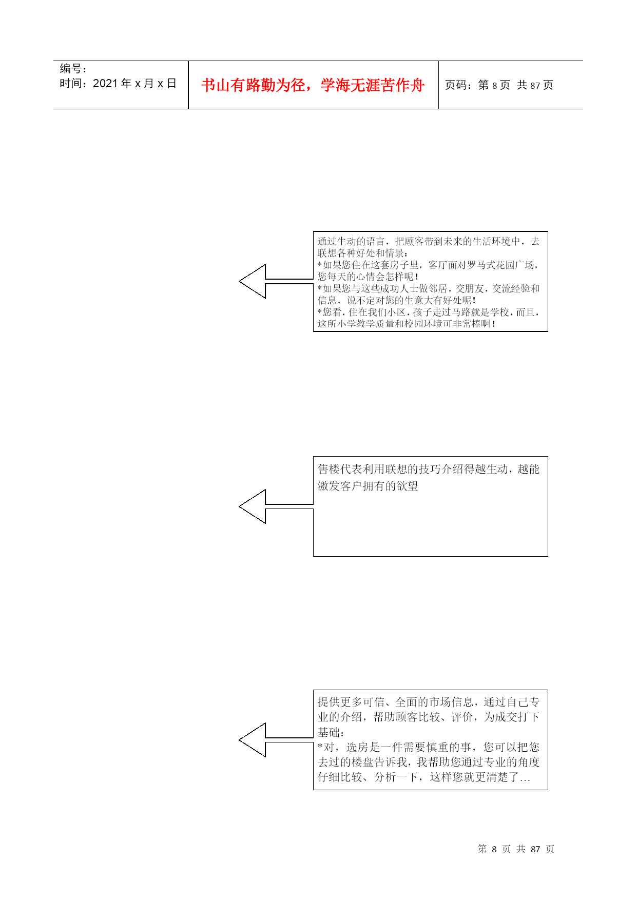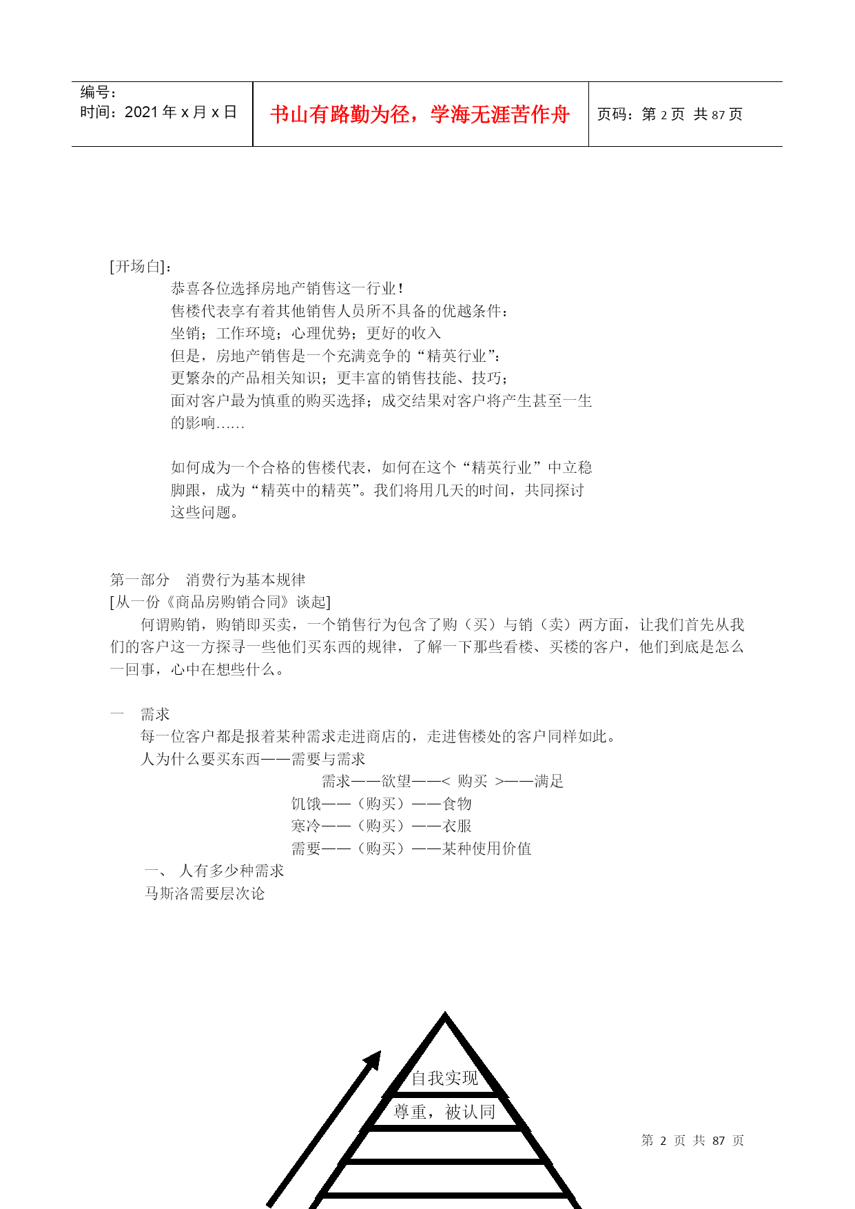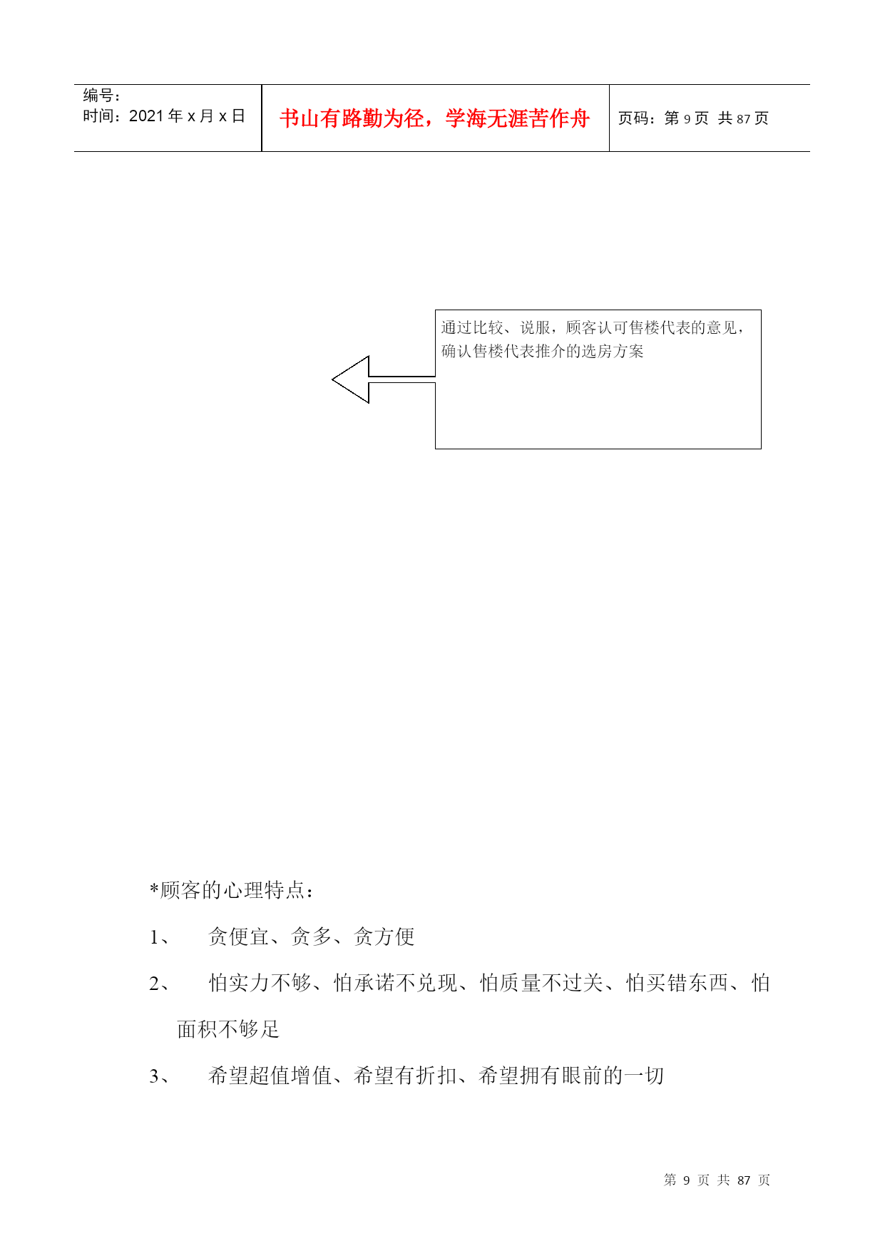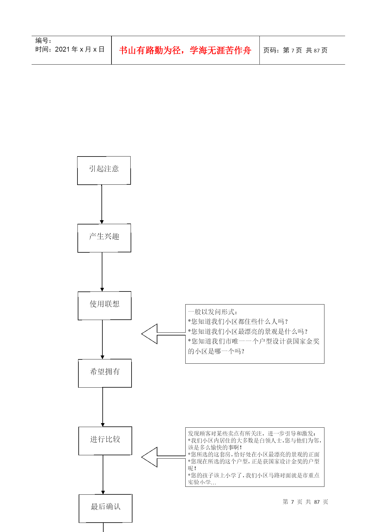 PAGE(讲义)编号:时间:2021年x月x日书山有路勤为径,学海无涯苦作舟页码:第PAGE87页共NUMPAGES87页第PAGE\*MERGEFORMAT87页共NUMPAGES\*MERGEFORMAT87页[开场白]:恭喜各位选择房地产销售这一行业!售楼代表享有着其他销售人员所不具备的优越条件:坐销;工作环境;心理优势;更好的收入但是,房地产销售是一个充满竞争的“精英行业”:更繁杂的产品相关知识;更丰富的销售技能、技巧;面对客户最为慎重的购买选择;成交结果对客户将产生甚至一生的影响……如何成为一个合格的售楼代表,如何在这个“精英行业”中立稳脚跟,成为“精英中的精英”。我们将用几天的时间,共同探讨这些问题。第一部分消费行为基本规律[从一份《商品房购销合同》谈起]何谓购销,购销即买卖,一个销售行为包含了购(买)与销(卖)两方面,让我们首先从我们的客户这一方探寻一些他们买东西的规律,了解一下那些看楼、买楼的客户,他们到底是怎么一回事,心中在想些什么。一需求每一位客户都是报着某种需求走进商店的,走进售楼处的客户同样如此。人为什么要买东西——需要与需求需求——欲望——<购买>——满足饥饿——(购买)——食物寒冷——(购买)——衣服需要——(购买)——某种使用价值人有多少种需求马斯洛需要层次论自我实现尊重,被认同归属,人际交往安全,保障生存(基本需求)(后面在销售技巧部分我们还要谈到需要层次论在售楼工作中的具体应用。)(住宅)针对不同层次需要的销售切入点:从住宅的基本层面介绍:居住,健康面积,户型楼层,朝向社区设施等从品质、安全、增值方面介绍:质量,装修标准小区保安系统公司品牌、信誉楼宇升值潜力和前景从社区大环境以及便利性方面介绍:交通,通讯区内环境配套,会所,公共区域生活、待客及商务活动的设施与外界交往从心理感受方面介绍:置业是对家庭的保障值得炫耀的方面,如区内有名人居住等从成就感方面介绍:个人事业成功的表现身份、地位体现核心是“需要得到满足”顾客总是为了满足某一种需要才来购买,如果你销售的产品不能满足顾客的需要的话,你就不可能推销出去。*没有需求的顾客是没有的;为什么强调探询顾客第二部分购买行为一、购买行为分为:1、消费需求2、购买动机3、购买行动4、使用感受事先期望>实际获得——感觉不满——抱怨,发表不良信息事先期望=实际获得——维持一般关系事先期望<实际获得——非常满意——忠诚,口碑,再次投资或推介客户二、购买行为类型:习惯型理智型经济型冲动型想象型不定型第三部分购买过程购买决策的5个阶段:认识需要评估备选商品决定购买购后行为搜集信息1、认识需要隐性的、不自觉的——刺激——欲望2、搜集信息A自身知识、经验B外部信息*对外部信息选择性吸收:半信半疑——资料的权威性——售楼资料的应用3、评估备选商品就选它了!所有商品消费者已知的商品考虑的商品4、购买决策产生形成偏好——影响购买意愿,2个影响因素A风险——不确定因素B他人意见——意见领袖第四部分购买心理顾客的购买过程一般分为7个心理过程:引起注意产生兴趣使用联想希望拥有进行比较最后确认决定购买一般以发问形式:*您知道我们小区都住些什么人吗?*您知道我们小区最漂亮的景观是什么吗?*您知道我们市唯一一个户型设计获国家金奖的小区是哪一个吗?发现顾客对某些卖点有所关注,进一步引导和激发:*我们小区内居住的大多数是白领人士,您与他们为邻,该是多么愉快的事啊!*您所选的这套房,恰好处在小区最漂亮的景观的正面*您现在所选的这个户型,正是获国家设计金奖的户型呢!*您的孩子该上小学了,我们小区马路对面就是市重点实验小学…通过生动的语言,把顾客带到未来的生活环境中,去联想各种好处和情景:*如果您住在这套房子里,客厅面对罗马式花园广场,您每天的心情会怎样呢!*如果您与这些成功人士做邻居,交朋友,交流经验和信息,说不定对您的生意大有好处呢!*您看,住在我们小区,孩子走过马路就是学校,而且,这所小学教学质量和校园环境可非常棒啊!售楼代表利用联想的技巧介绍得越生动,越能激发客户拥有的欲望提供更多可信、全面的市场信息,通过自己专业的介绍,帮