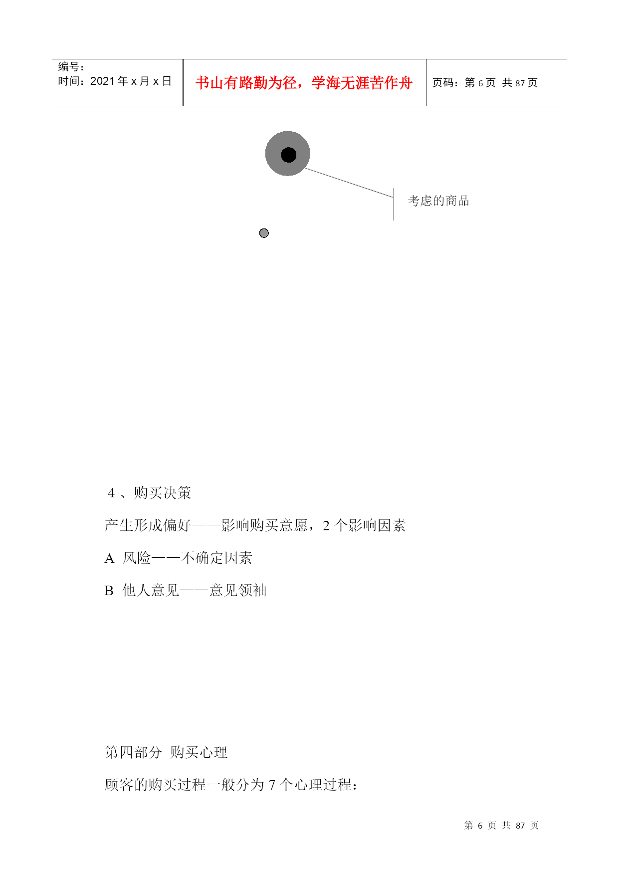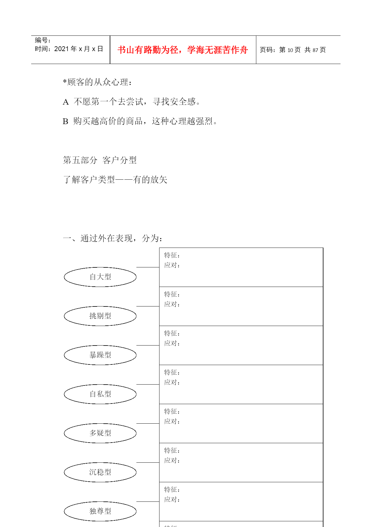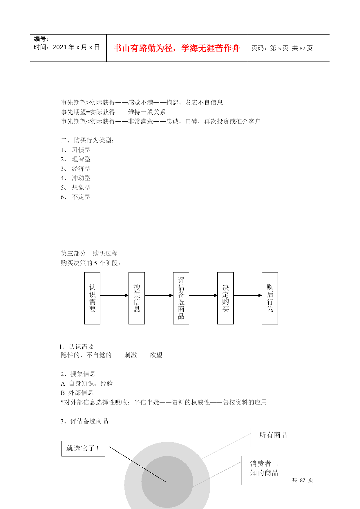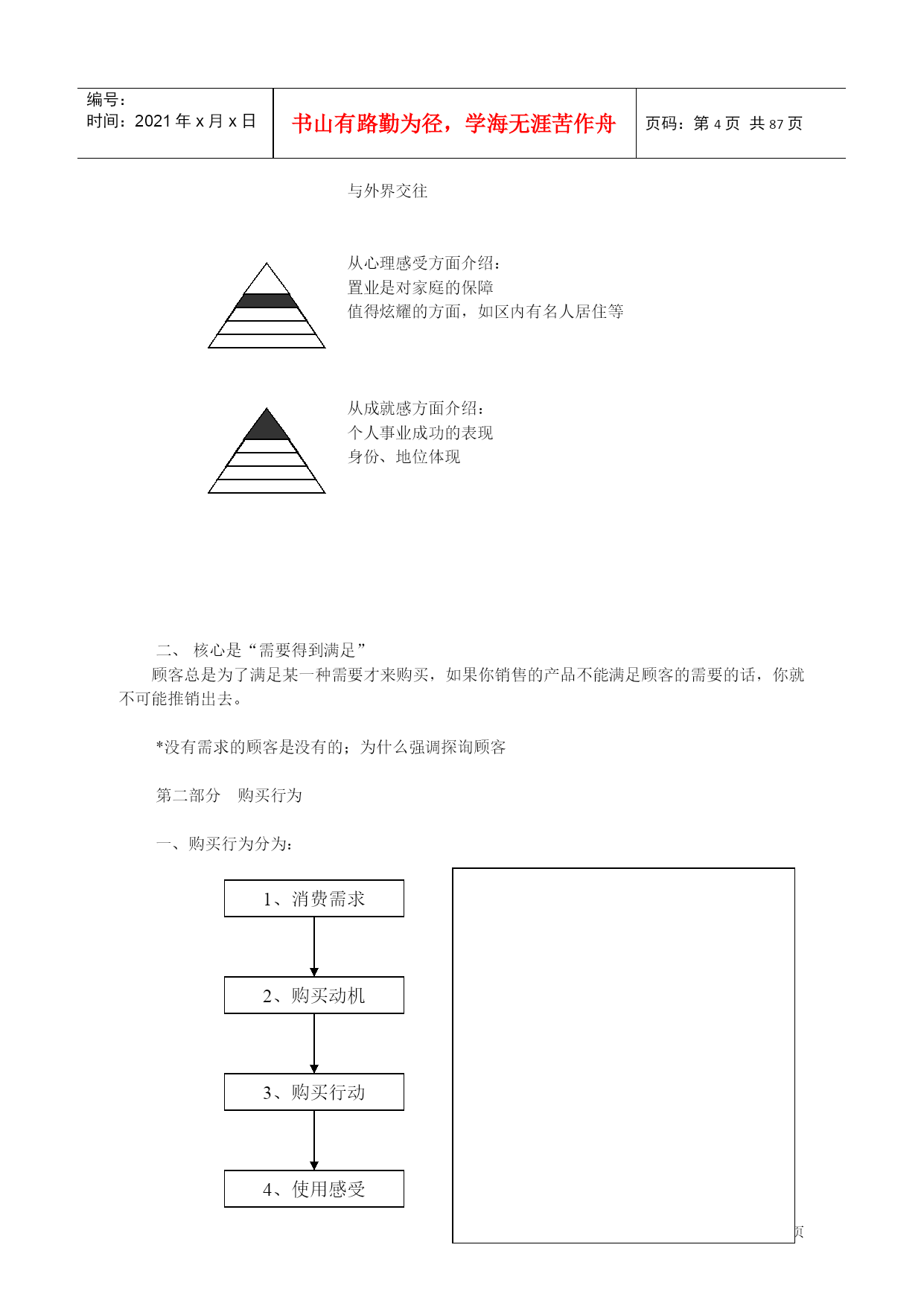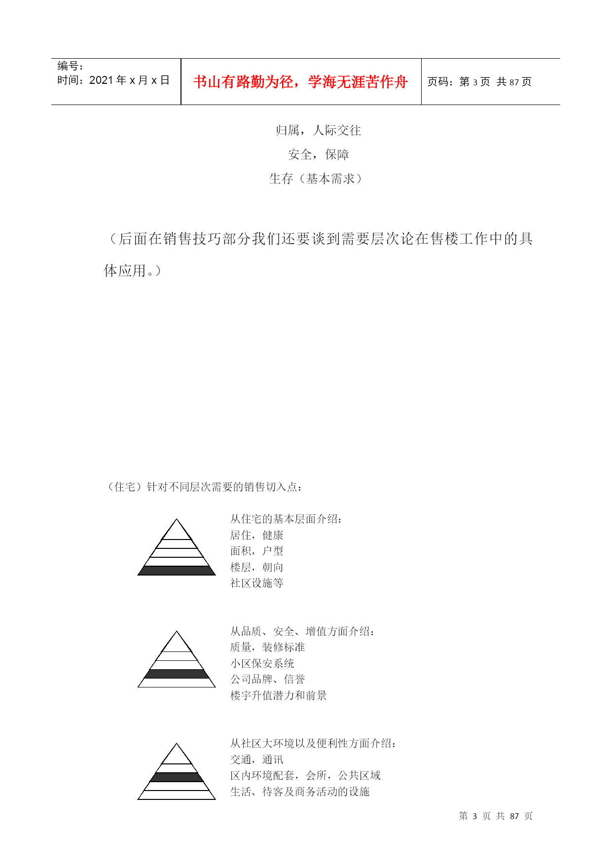 PAGE(讲义)编号:时间:2021年x月x日书山有路勤为径,学海无涯苦作舟页码:第PAGE87页共NUMPAGES87页第PAGE\*MERGEFORMAT87页共NUMPAGES\*MERGEFORMAT87页[开场白]:恭喜各位选择房地产销售这一行业!售楼代表享有着其他销售人员所不具备的优越条件:坐销;工作环境;心理优势;更好的收入但是,房地产销售是一个充满竞争的“精英行业”:更繁杂的产品相关知识;更丰富的销售技能、技巧;面对客户最为慎重的购买选择;成交结果对客户将产生甚至一生的影响……如何成为一个合格的售楼代表,如何在这个“精英行业”中立稳脚跟,成为“精英中的精英”。我们将用几天的时间,共同探讨这些问题。第一部分消费行为基本规律[从一份《商品房购销合同》谈起]何谓购销,购销即买卖,一个销售行为包含了购(买)与销(卖)两方面,让我们首先从我们的客户这一方探寻一些他们买东西的规律,了解一下那些看楼、买楼的客户,他们到底是怎么一回事,心中在想些什么。一需求每一位客户都是报着某种需求走进商店的,走进售楼处的客户同样如此。人为什么要买东西——需要与需求需求——欲望——<购买>——满足饥饿——(购买)——食物寒冷——(购买)——衣服需要——(购买)——某种使用价值人有多少种需求马斯洛需要层次论自我实现尊重,被认同归属,人际交往安全,保障生存(基本需求)(后面在销售技巧部分我们还要谈到需要层次论在售楼工作中的具体应用。)(住宅)针对不同层次需要的销售切入点:从住宅的基本层面介绍:居住,健康面积,户型楼层,朝向社区设施等从品质、安全、增值方面介绍:质量,装修标准小区保安系统公司品牌、信誉楼宇升值潜力和前景从社区大环境以及便利性方面介绍:交通,通讯区内环境配套,会所,公共区域生活、待客及商务活动的设施与外界交往从心理感受方面介绍:置业是对家庭的保障值得炫耀的方面,如区内有名人居住等从成就感方面介绍:个人事业成功的表现身份、地位体现核心是“需要得到满足”顾客总是为了满足某一种需要才来购买,如果你销售的产品不能满足顾客的需要的话,你就不可能推销出去。*没有需求的顾客是没有的;为什么强调探询顾客第二部分购买行为一、购买行为分为:1、消费需求2、购买动机3、购买行动4、使用感受事先期望>实际获得——感觉不满——抱怨,发表不良信息事先期望=实际获得——维持一般关系事先期望<实际获得——非常满意——忠诚,口碑,再次投资或推介客户二、购买行为类型:习惯型理智型经济型冲动型想象型不定型第三部分购买过程购买决策的5个阶段:认识需要评估备选商品决定购买购后行为搜集信息1、认识需要隐性的、不自觉的——刺激——欲望2、搜集信息A自身知识、经验B外部信息*对外部信息选择性吸收:半信半疑——资料的权威性——售楼资料的应用3、评估备选商品就选它了!所有商品消费者已知的商品考虑的商品4、购买决策产生形成偏好——影响购买意愿,2个影响因素A风险——不确定因素B他人意见——意见领袖第四部分购买心理顾客的购买过程一般分为7个心理过程:引起注意产生兴趣使用联想希望拥有进行比较最后确认决定购买一般以发问形式:*您知道我们小区都住些什么人吗?*您知道我们小区最漂亮的景观是什么吗?*您知道我们市唯一一个户型设计获国家金奖的小区是哪一个吗?发现顾客对某些卖点有所关注,进一步引导和激发:*我们小区内居住的大多数是白领人士,您与他们为邻,该是多么愉快的事啊!*您所选的这套房,恰好处在小区最漂亮的景观的正面*您现在所选的这个户型,正是获国家设计金奖的户型呢!*您的孩子该上小学了,我们小区马路对面就是市重点实验小学…通过生动的语言,把顾客带到未来的生活环境中,去联想各种好处和情景:*如果您住在这套房子里,客厅面对罗马式花园广场,您每天的心情会怎样呢!*如果您与这些成功人士做邻居,交朋友,交流经验和信息,说不定对您的生意大有好处呢!*您看,住在我们小区,孩子走过马路就是学校,而且,这所小学教学质量和校园环境可非常棒啊!售楼代表利用联想的技巧介绍得越生动,越能激发客户拥有的欲望提供更多可信、全面的市场信息,通过自己专业的介绍,帮
