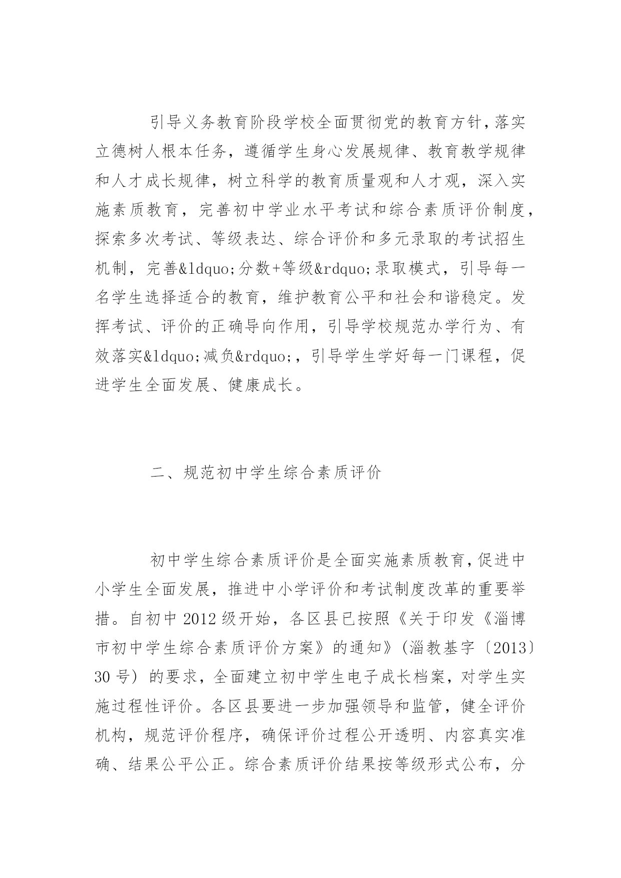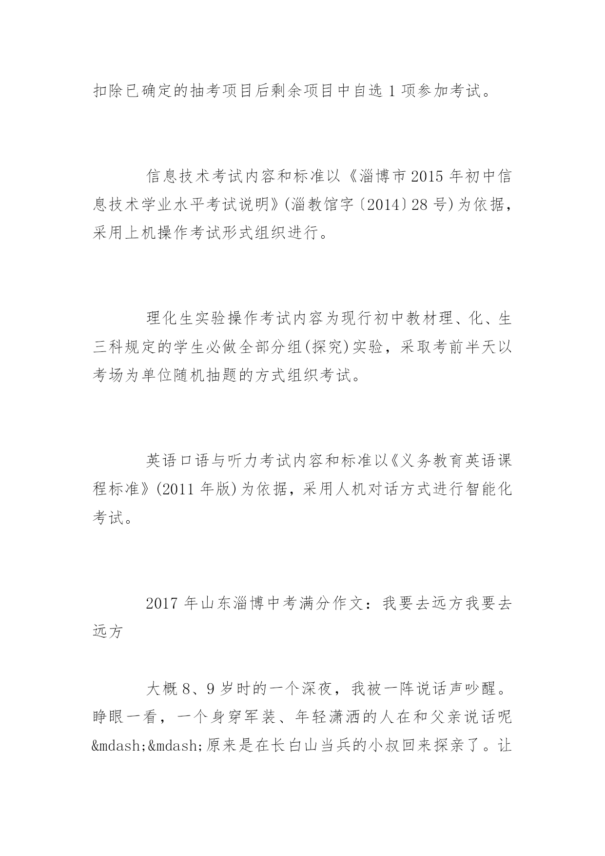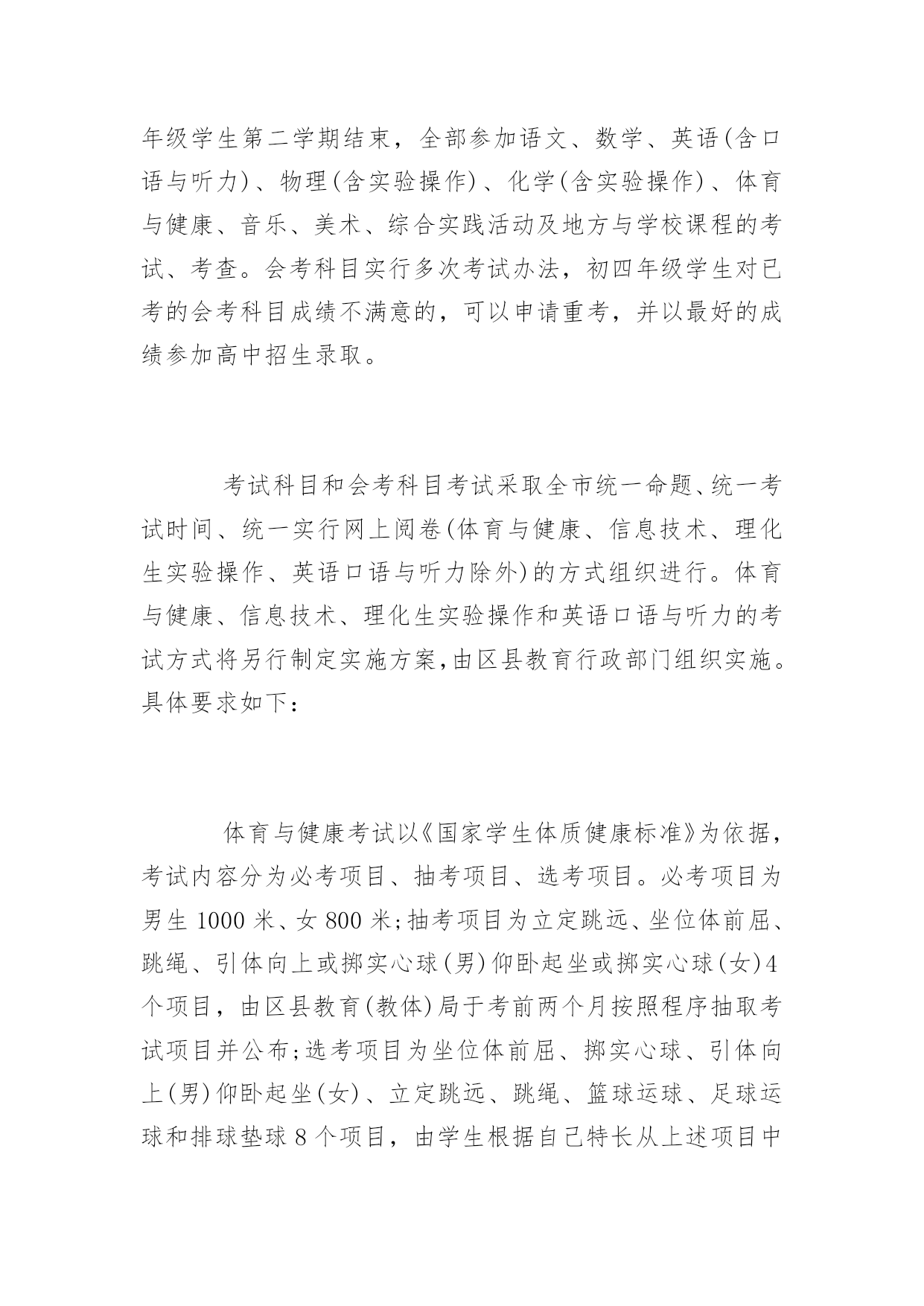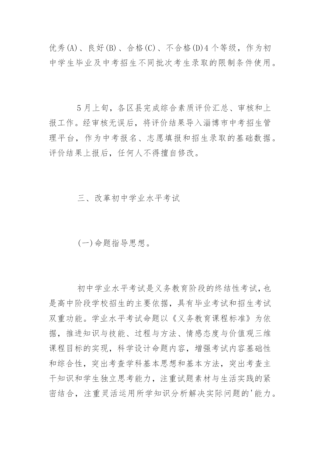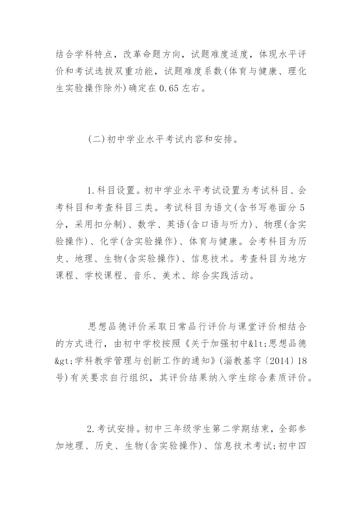 淄博中考时间安排公布淄博2017年中考时间安排公布中考关于每一位初中生来说,想要取得好成绩就要付出汗水,下面是百分网小编整理的淄博2017年中考时间安排公布,欢迎阅读借鉴!淄博2017年中考时间安排公布2016山东淄博中考时间:6月10日-12日根据《山东教育厅关于普通中小学招生入学工作的指导意见》(鲁教基发〔2015〕4号)、《关于完善初中学业水平考试和综合素质评价制度的指导意见》(鲁教基发〔2015〕5号)、和《淄博市中考招生制度改革意见》(淄教发〔2014〕5号)的要求,结合我市实际制定本意见。一、指导思想引导义务教育阶段学校全面贯彻党的教育方针,落实立德树人根本任务,遵循学生身心发展规律、教育教学规律和人才成长规律,树立科学的教育质量观和人才观,深入实施素质教育,完善初中学业水平考试和综合素质评价制度,探索多次考试、等级表达、综合评价和多元录取的考试招生机制,完善“分数+等级”录取模式,引导每一名学生选择适合的教育,维护教育公平和社会和谐稳定。发挥考试、评价的正确导向作用,引导学校规范办学行为、有效落实“减负”,引导学生学好每一门课程,促进学生全面发展、健康成长。二、规范初中学生综合素质评价初中学生综合素质评价是全面实施素质教育,促进中小学生全面发展,推进中小学评价和考试制度改革的重要举措。自初中2012级开始,各区县已按照《关于印发《淄博市初中学生综合素质评价方案》的通知》(淄教基字〔2013〕30号)的要求,全面建立初中学生电子成长档案,对学生实施过程性评价。各区县要进一步加强领导和监管,健全评价机构,规范评价程序,确保评价过程公开透明、内容真实准确、结果公平公正。综合素质评价结果按等级形式公布,分优秀(A)、良好(B)、合格(C)、不合格(D)4个等级,作为初中学生毕业及中考招生不同批次考生录取的限制条件使用。5月上旬,各区县完成综合素质评价汇总、审核和上报工作。经审核无误后,将评价结果导入淄博市中考招生管理平台,作为中考报名、志愿填报和招生录取的基础数据。评价结果上报后,任何人不得擅自修改。三、改革初中学业水平考试(一)命题指导思想。初中学业水平考试是义务教育阶段的终结性考试,也是高中阶段学校招生的主要依据,具有毕业考试和招生考试双重功能。学业水平考试命题以《义务教育课程标准》为依据,推进知识与技能、过程与方法、情感态度与价值观三维课程目标的实现,科学设计命题内容,增强考试内容基础性和综合性,突出考查学科基本思想和基本方法,突出考查主干知识和学生独立思考能力,注重试题素材与生活实践的紧密结合,注重灵活运用所学知识分析解决实际问题的'能力。结合学科特点,改革命题方向,试题难度适度,体现水平评价和考试选拔双重功能,试题难度系数(体育与健康、理化生实验操作除外)确定在0.65左右。(二)初中学业水平考试内容和安排。1.科目设置。初中学业水平考试设置为考试科目、会考科目和考查科目三类。考试科目为语文(含书写卷面分5分,采用扣分制)、数学、英语(含口语与听力)、物理(含实验操作)、化学(含实验操作)、体育与健康。会考科目为历史、地理、生物(含实验操作)、信息技术。考查科目为地方课程、学校课程、音乐、美术、综合实践活动。思想品德评价采取日常品行评价与课堂评价相结合的方式进行,由初中学校按照《关于加强初中<思想品德>学科教学管理与创新工作的通知》(淄教基字〔2014〕18号)有关要求自行组织,其评价结果纳入学生综合素质评价。2.考试安排。初中三年级学生第二学期结束,全部参加地理、历史、生物(含实验操作)、信息技术考试;初中四年级学生第二学期结束,全部参加语文、数学、英语(含口语与听力)、物理(含实验操作)、化学(含实验操作)、体育与健康、音乐、美术、综合实践活动及地方与学校课程的考试、考查。会考科目实行多次考试办法,初四年级学生对已考的会考科目成绩不满意的,可以申请重考,并以最好的成绩参加高中招生录取。考试科目和会考科目考试采取全市统一命题、统一考试时间、统一实行网上阅卷(体育与健康、信息技术、理化生实验操作、英语口语与听力除外)的方式组织进行。体育与健康、信息技术、理化生实验操作和英语口语与听力的考试方式将另行制定实施方案,由区县教育行政部门组织实施。具体要求如下:体育与健康考试以《国家学生体质健康标准》为依据,考试内容分为必考项目、抽考项目、选考项目。必考项目为男生1000米、女800米;抽考项目为立定跳远、坐位体前屈、跳绳、引体向上或掷实心球(男)仰卧起坐或掷实心球(女)4个项目,由区县教育(教体)局于考前两个月按照程序抽取考试项目并公布;选考项目为坐位体前屈、掷实心球、引体向上(男)仰卧起坐(女)、立定跳远、跳绳、篮